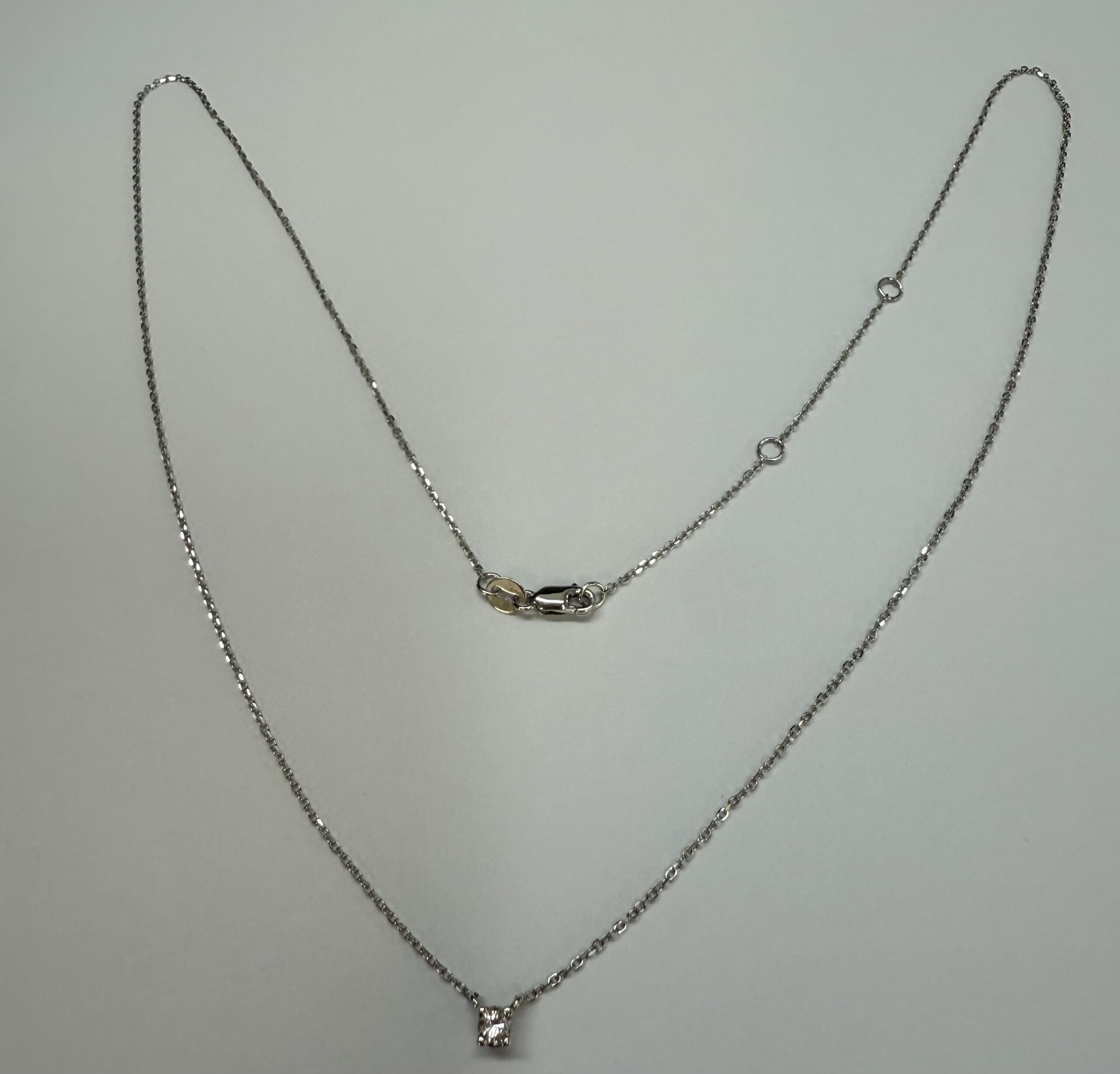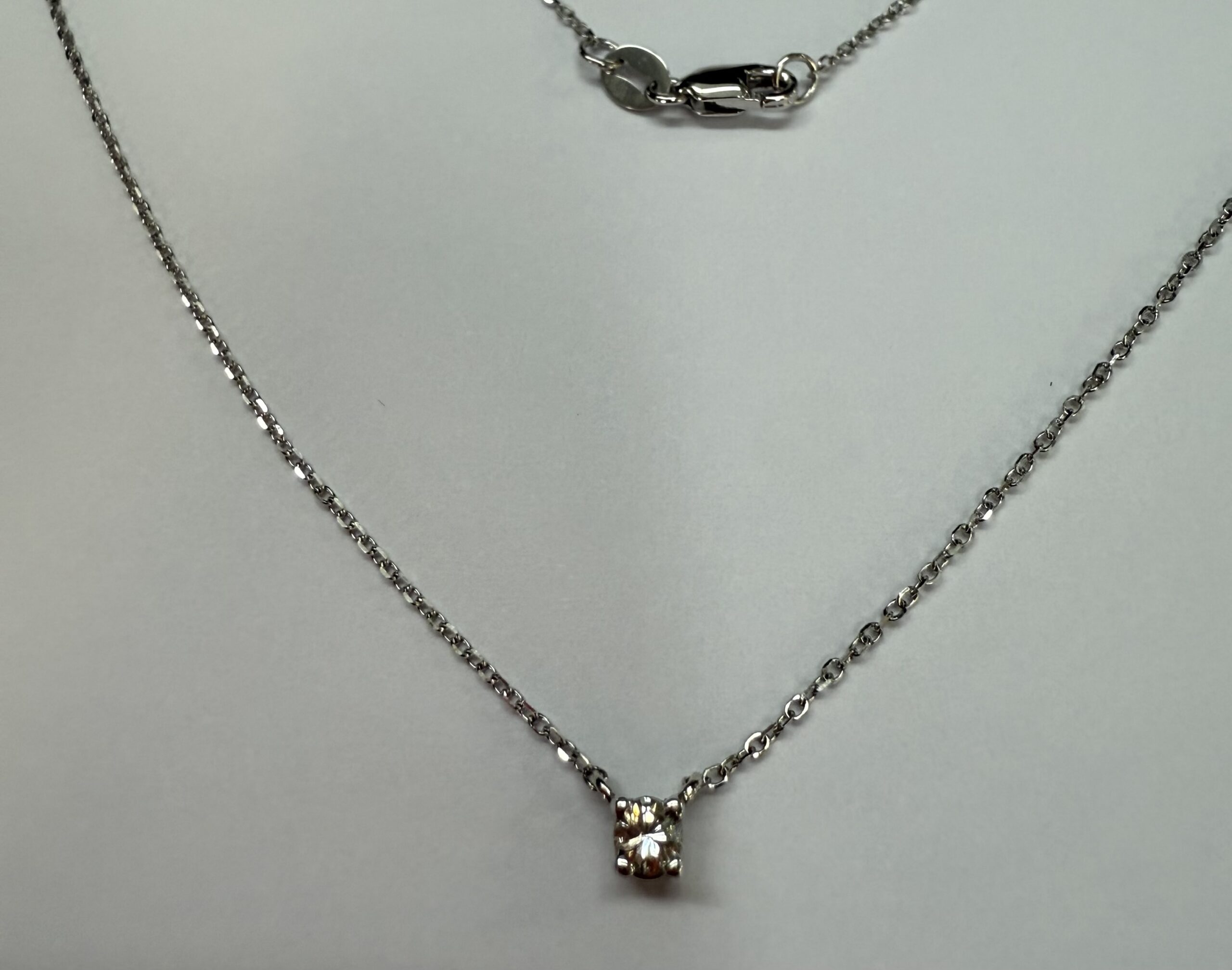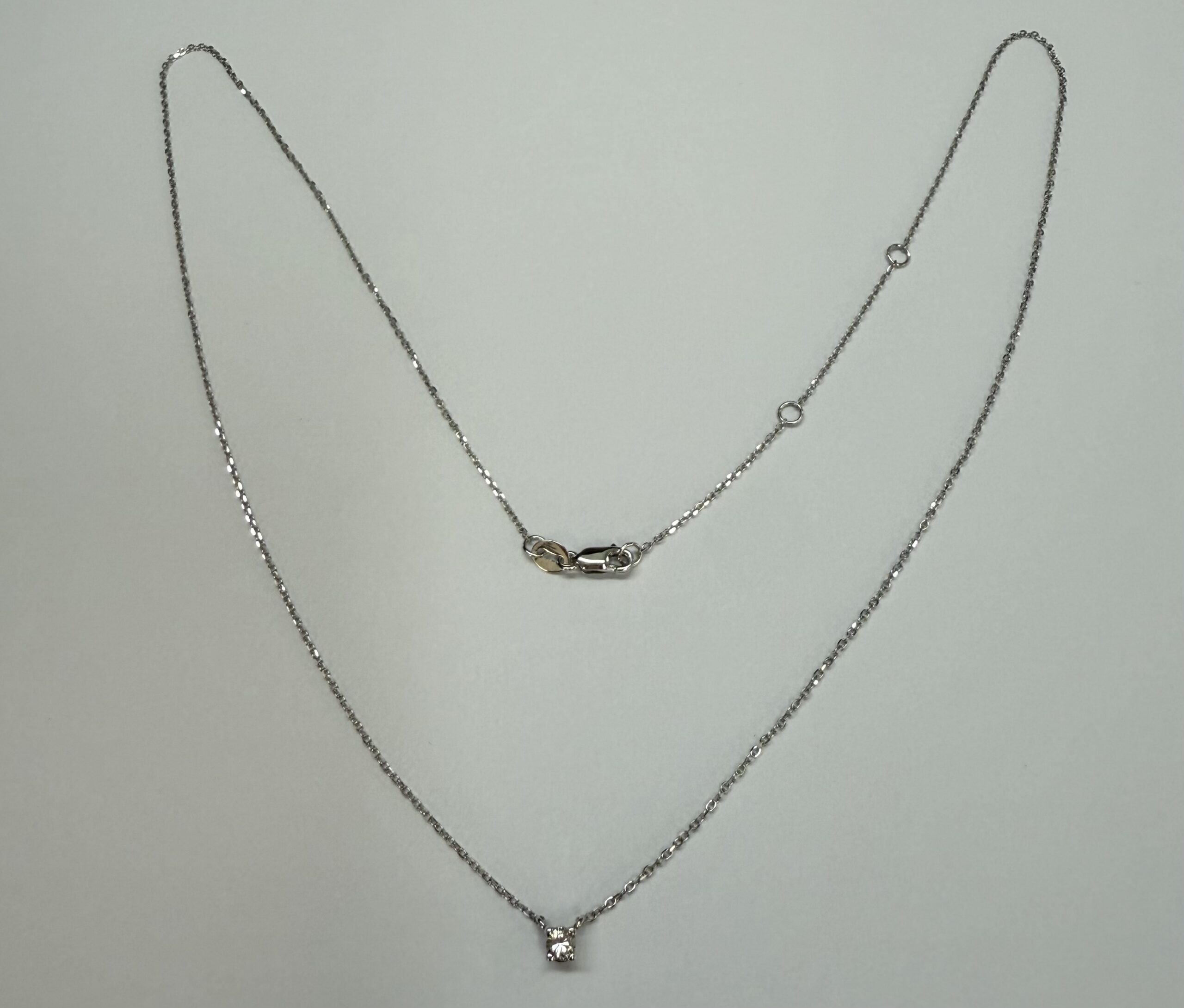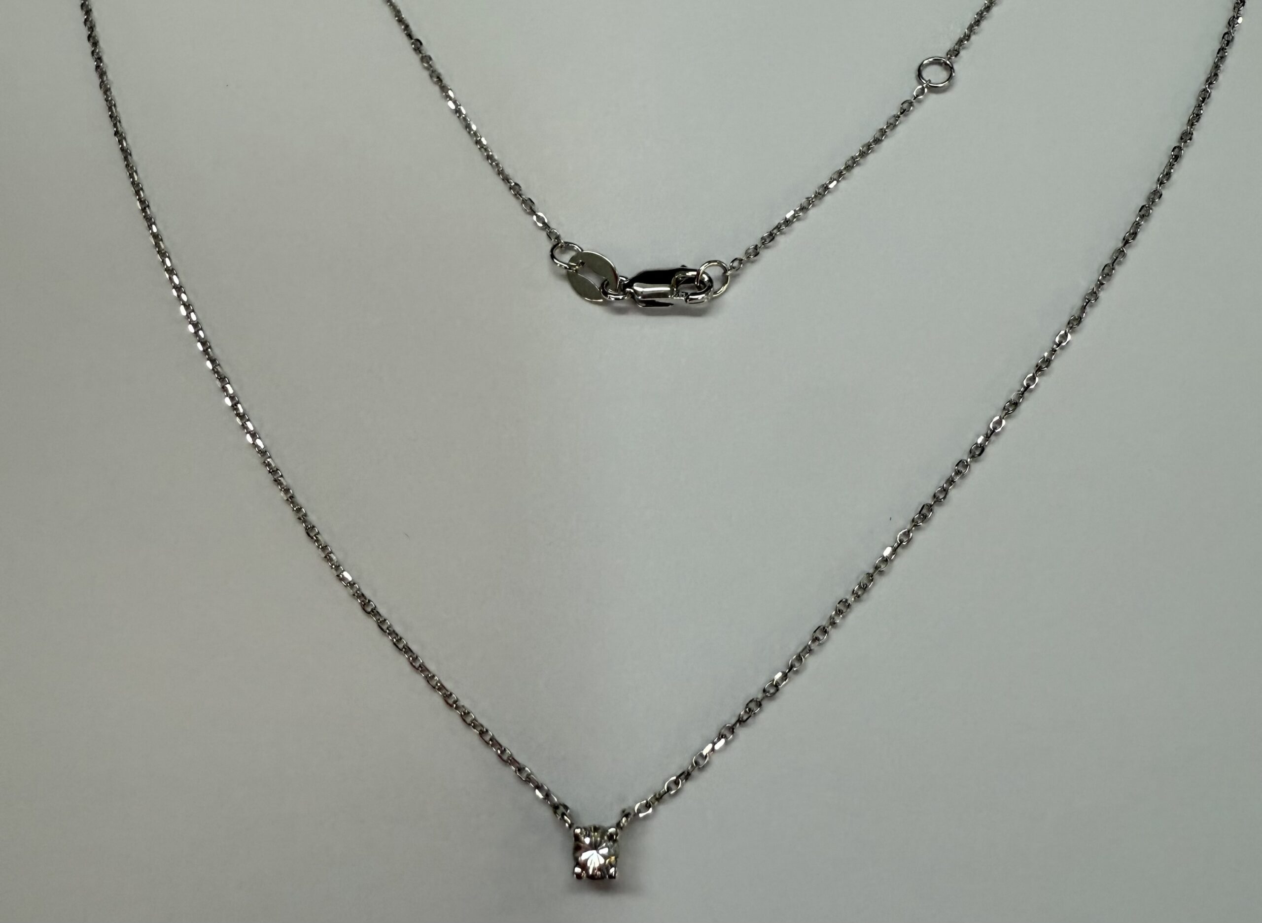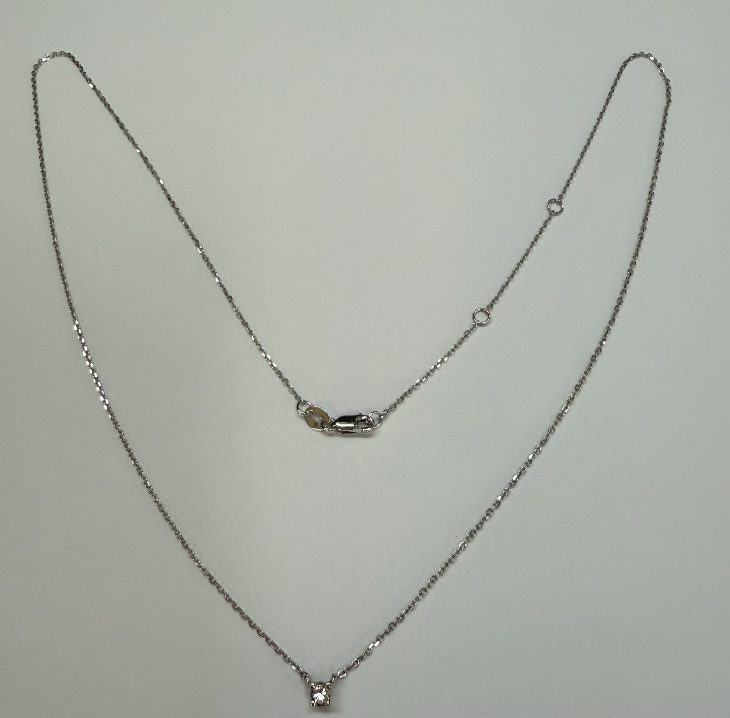14k white gold genuine .10 cttw Round Brilliant Cut diamond fixed basket set pendant. This diamond has a color grade of G, and a clarity grade of SI1. This pendant is adjustable 16-18″, and it has an entire weight of 1.2 grams.
