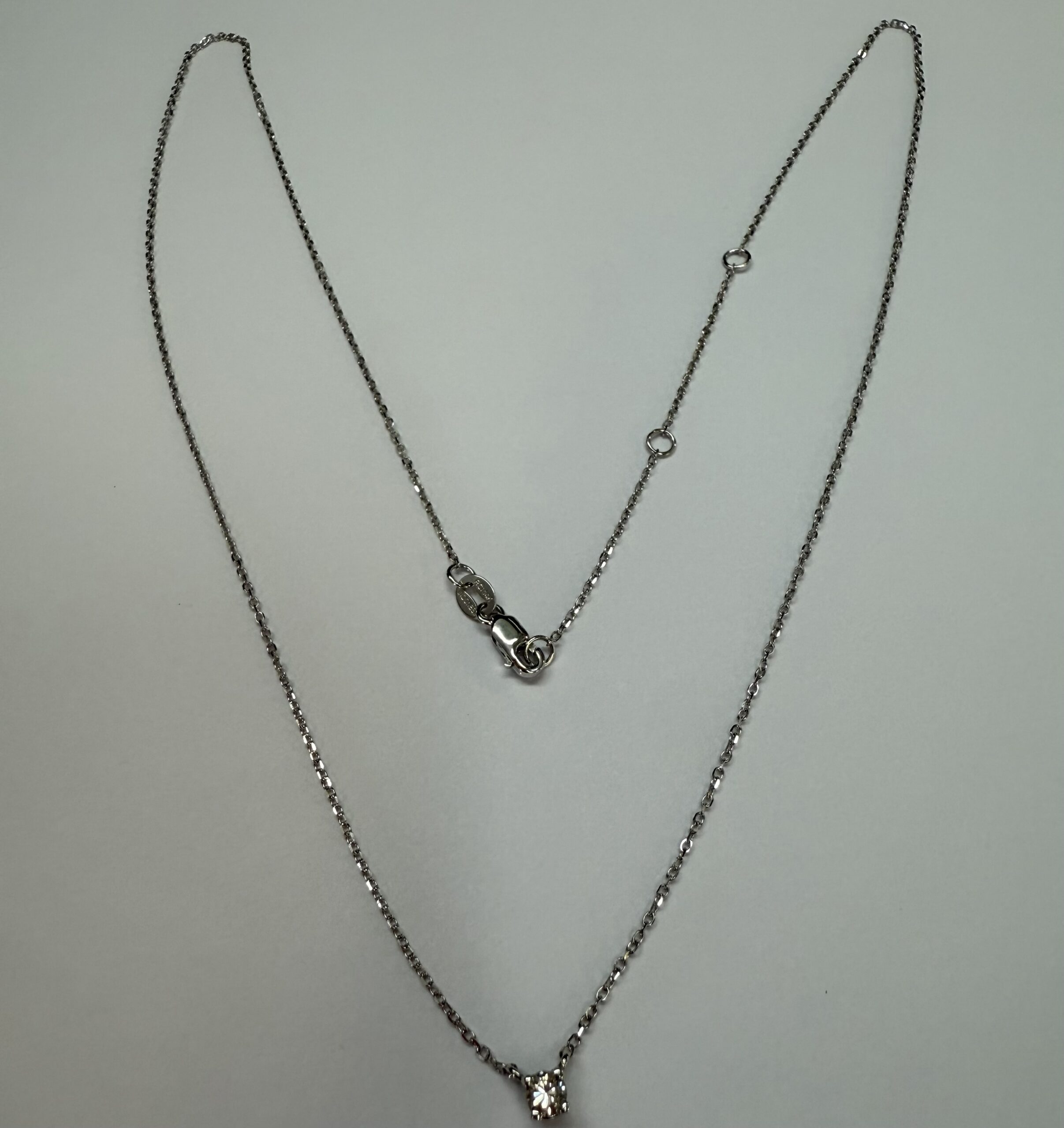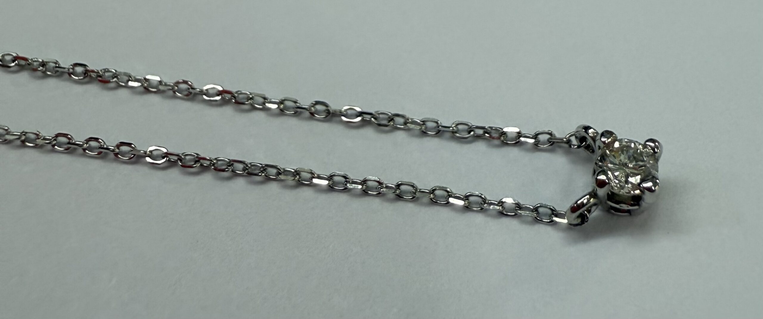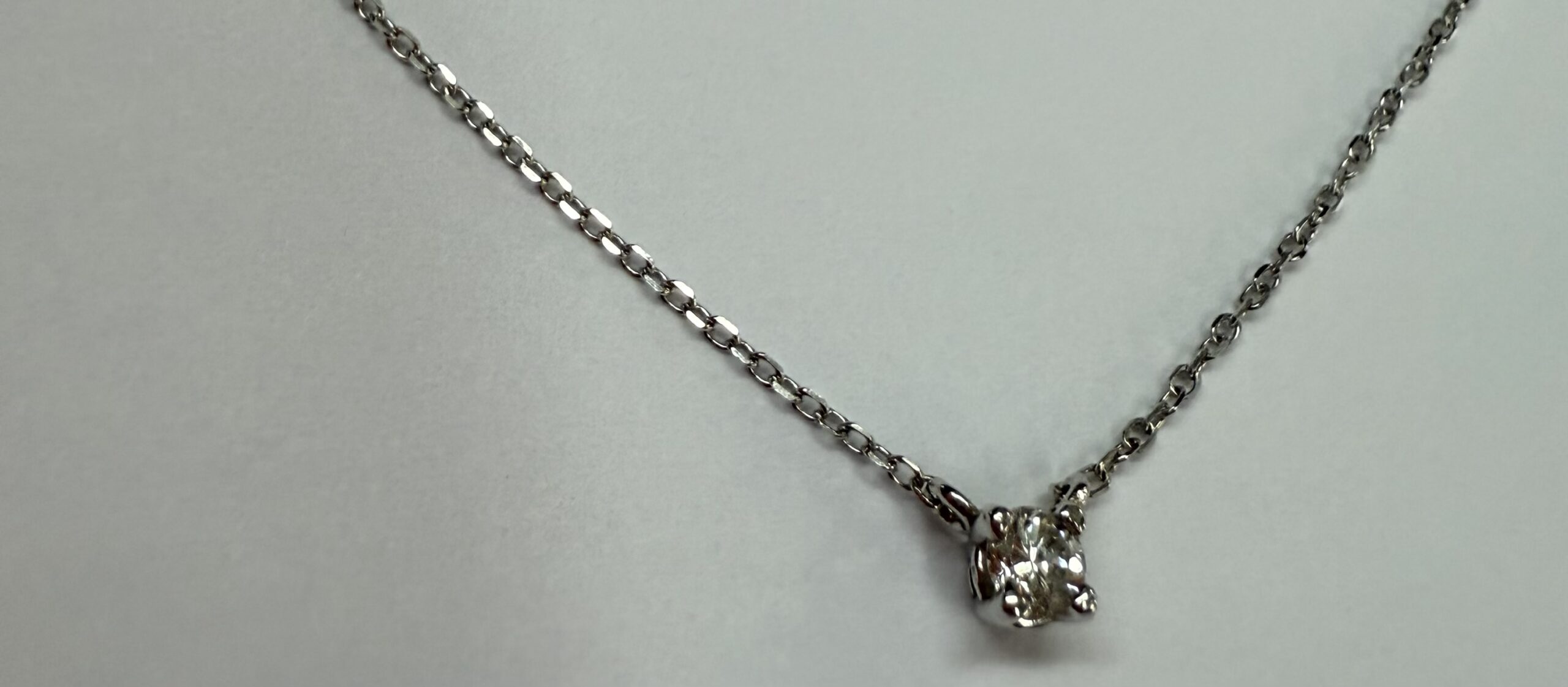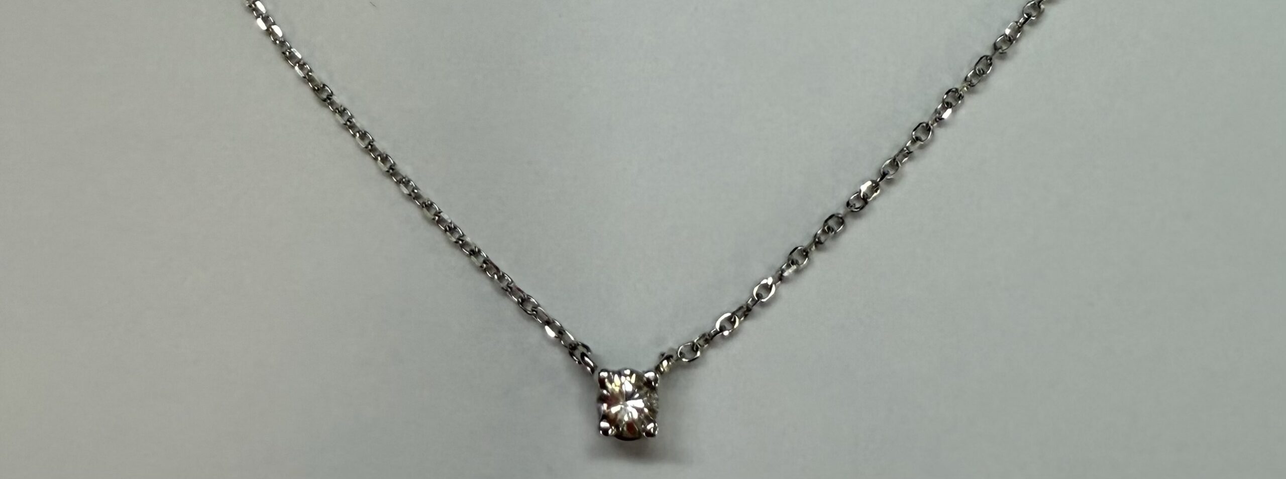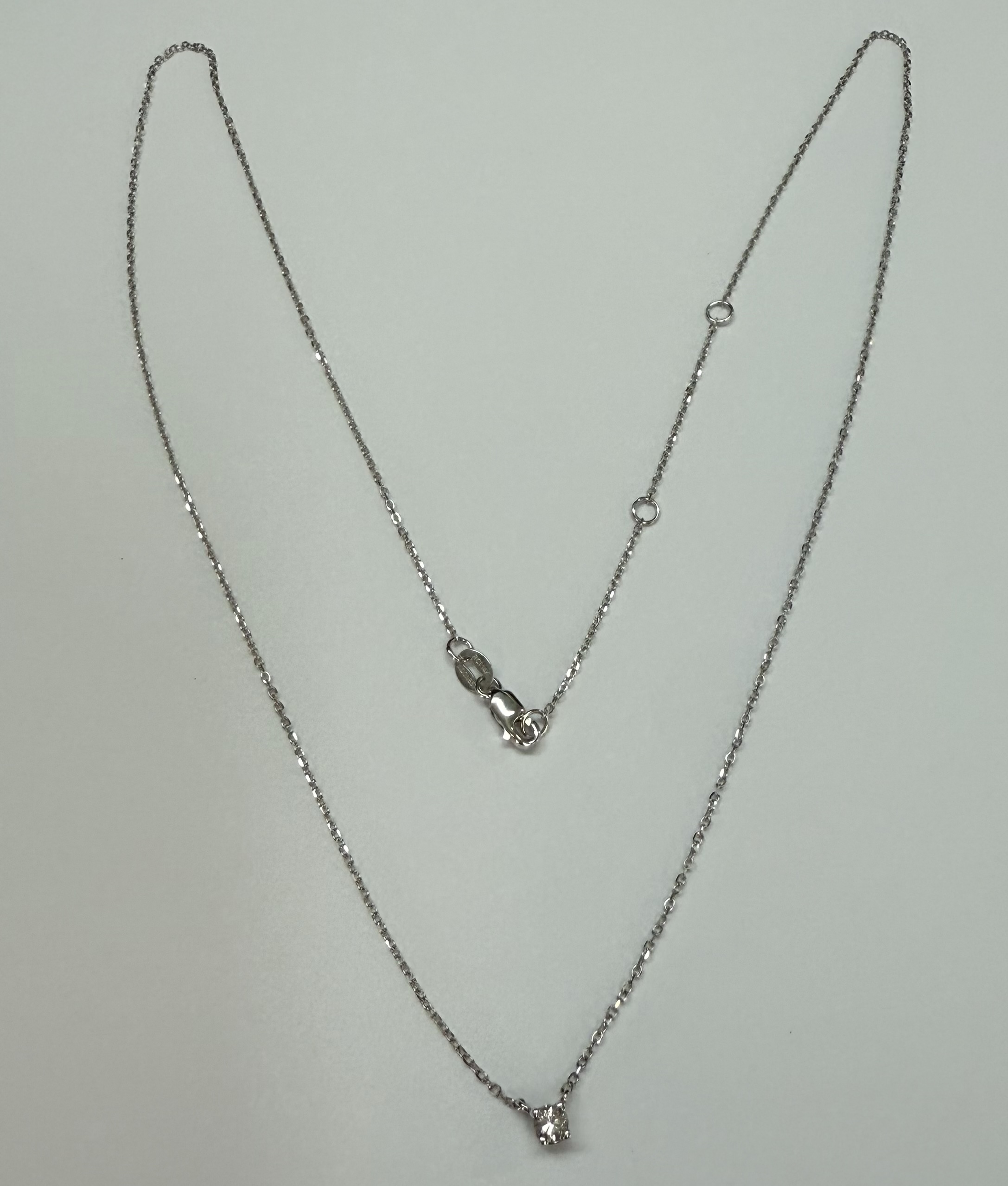 14k white gold genuine .10 cttw Round Brilliant Cut diamond fixed basket set pendant. This diamond has a color grade of G, and a clarity grade of SI1. This pendant is adjustable 16-18″, and it has an entire weight of 1.2 grams.