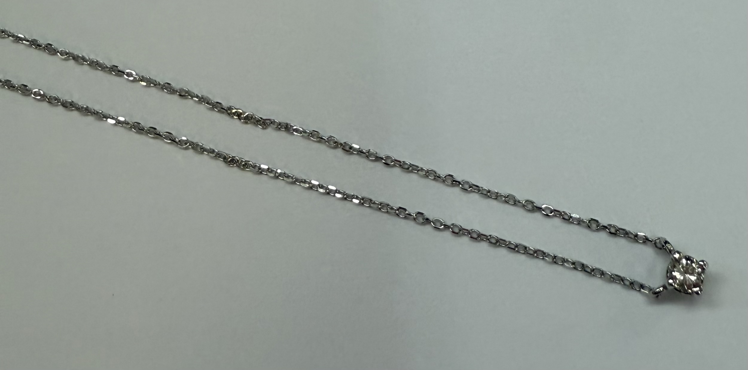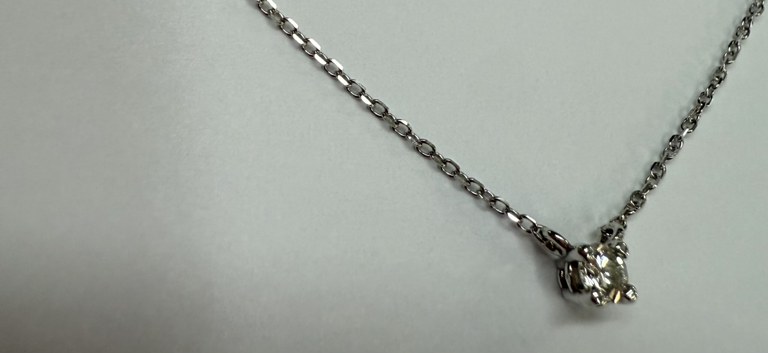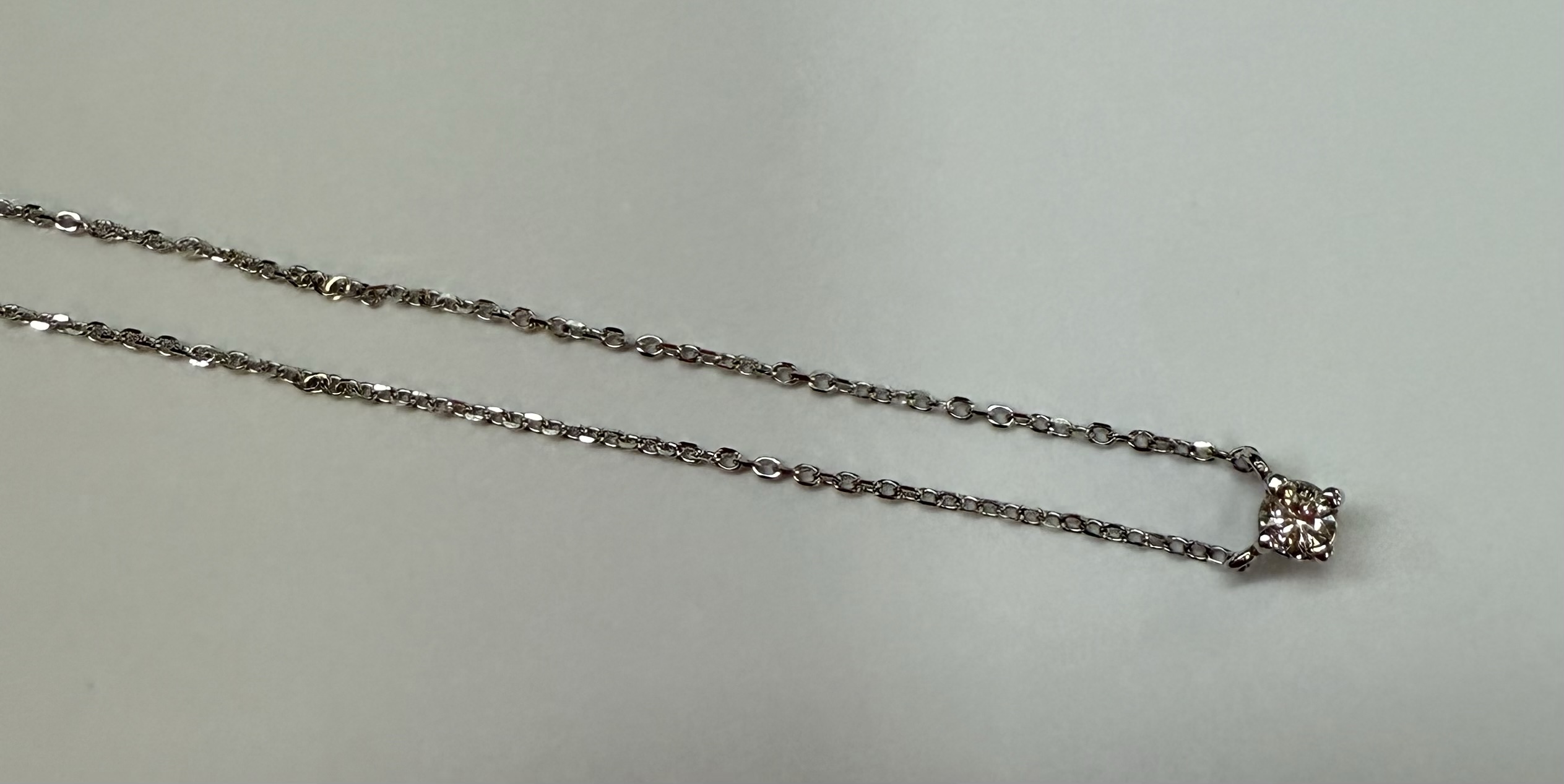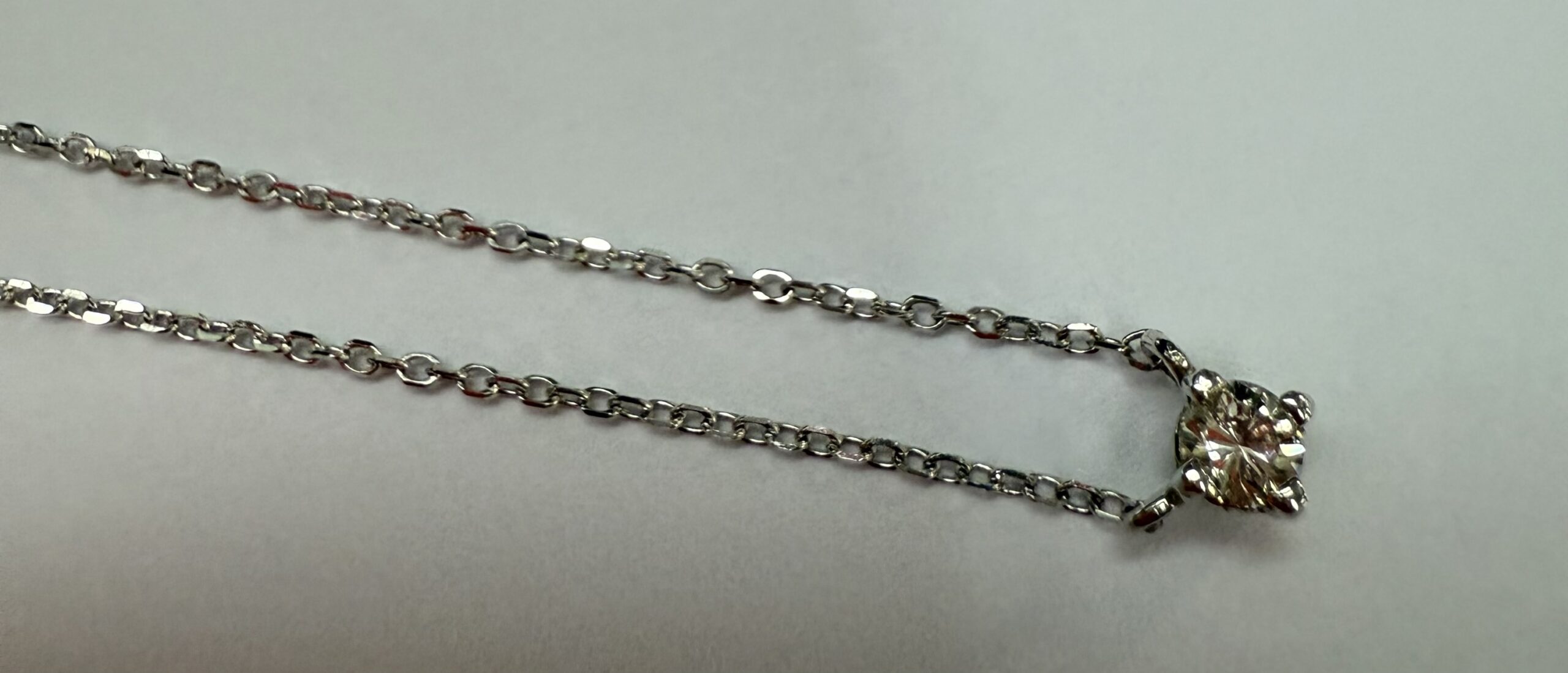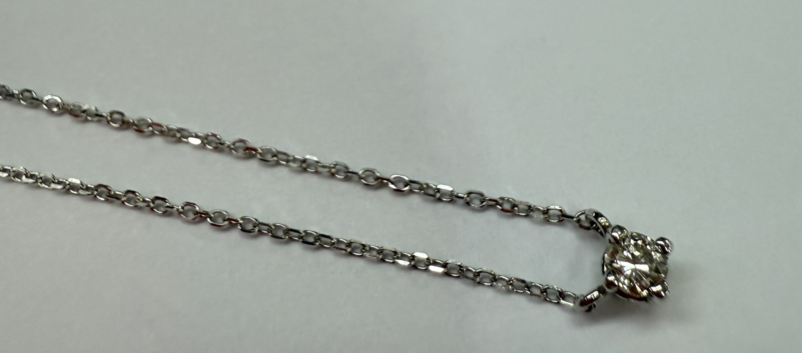 14k white gold genuine .10 cttw Round Brilliant Cut diamond fixed basket set pendant. This diamond has a color grade of G, and a clarity grade of SI1. This pendant is adjustable 16-18″, and it has an entire weight of 1.2 grams.