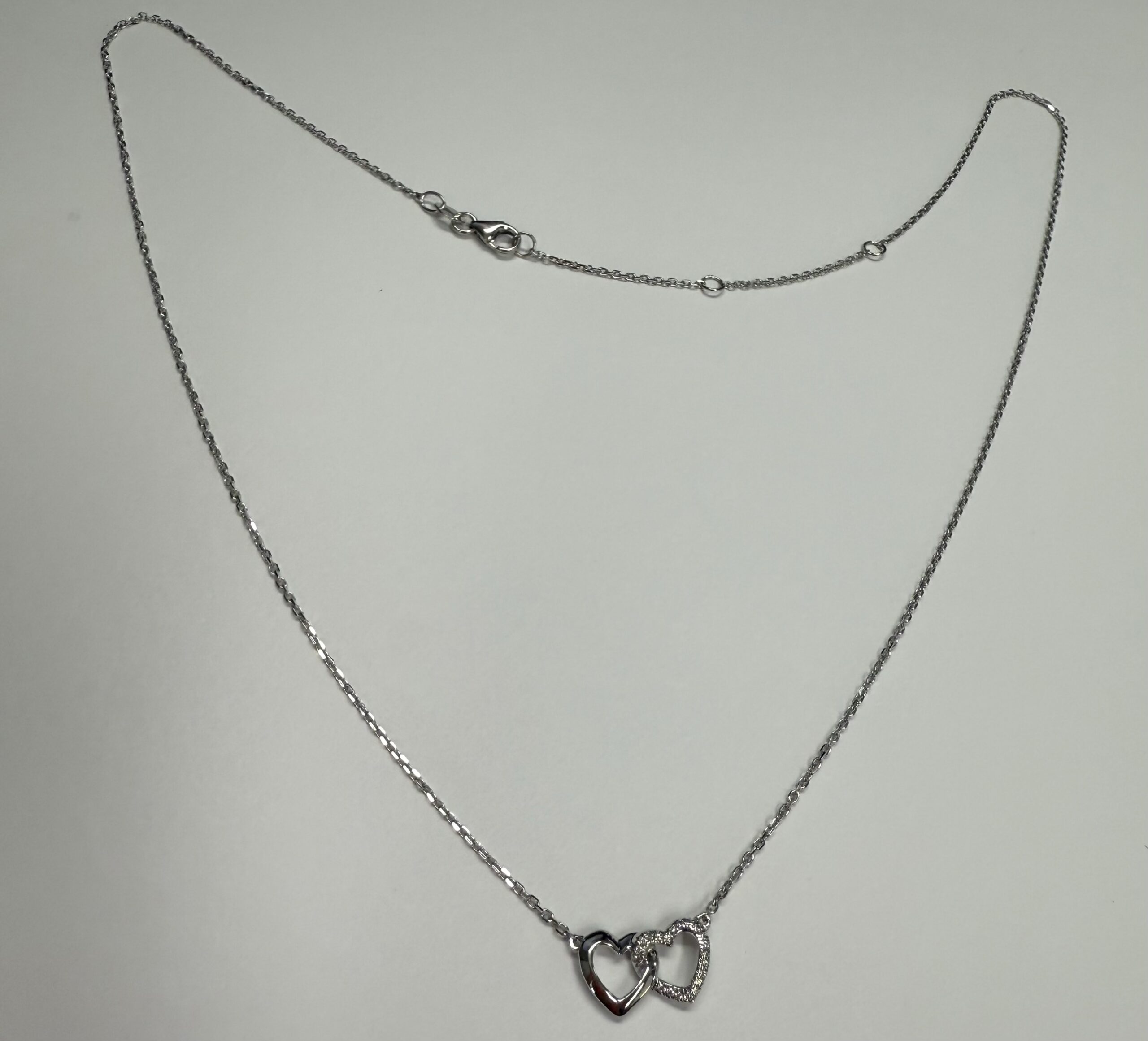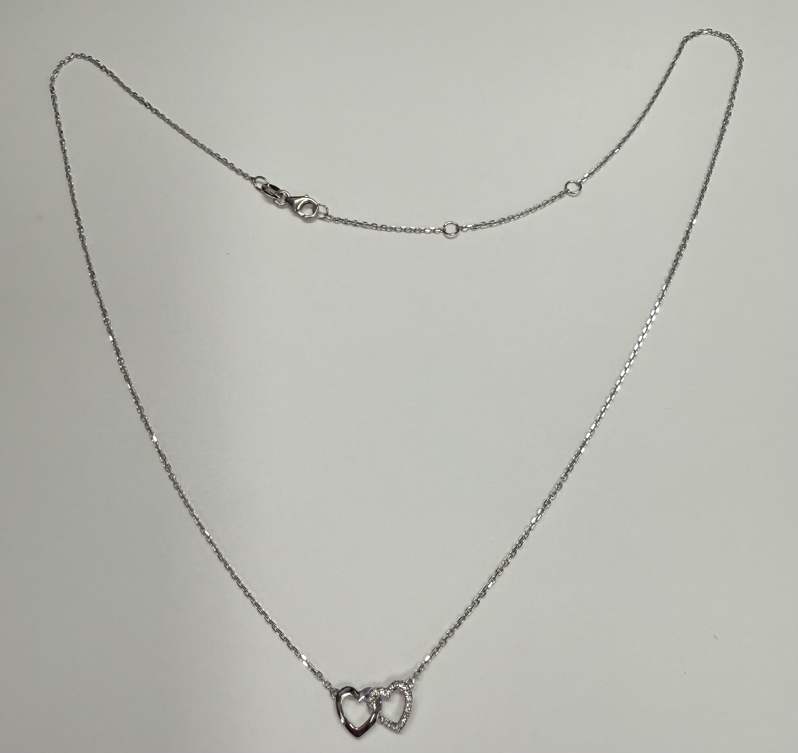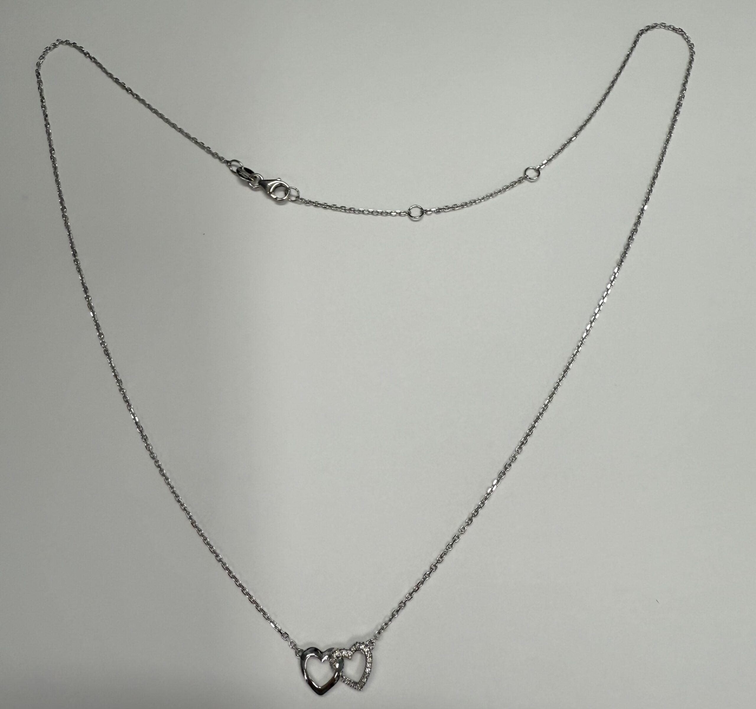 14k white gold interlocking double open heart genuine .13 cttw Round Brilliant Cut Diamond pendant. These diamonds average G-H on color, and SI1-SI2 in clarity. This pendant is adjustable 16-18″, and it has an entire weight of 2.1 grams.