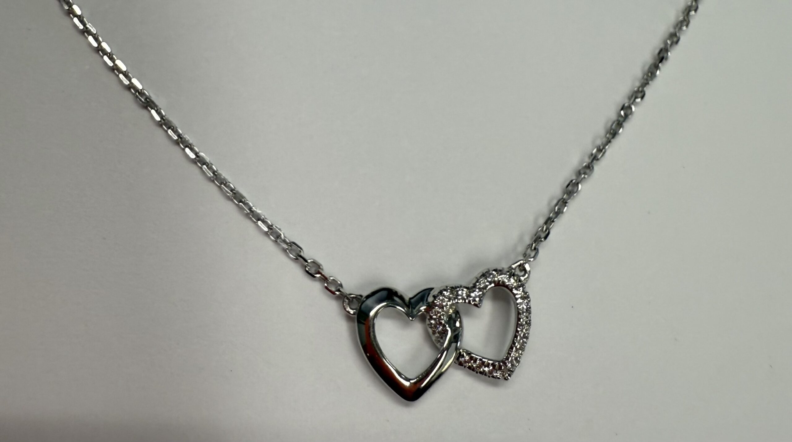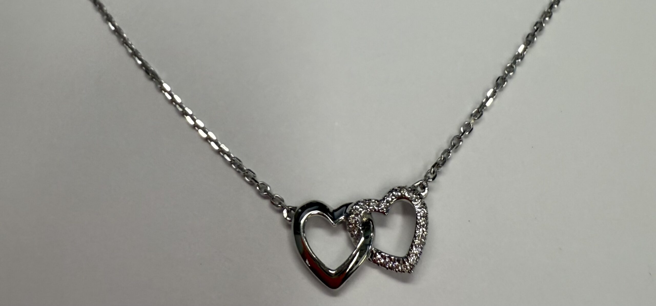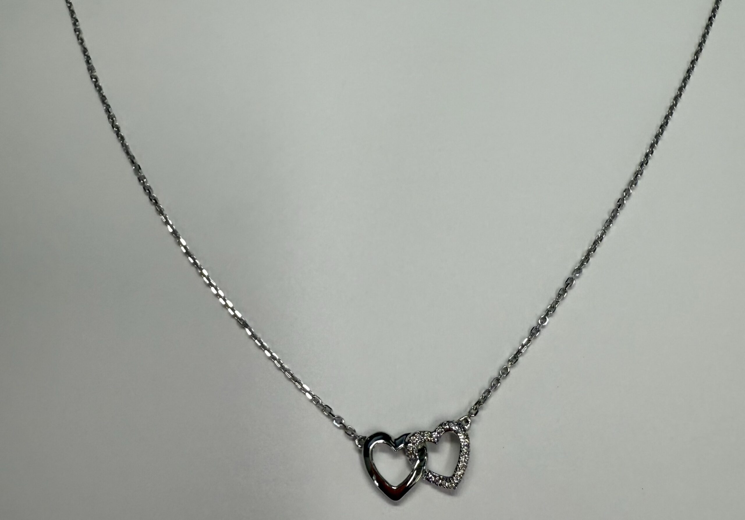 14k white gold interlocking double open heart genuine .13 cttw Round Brilliant Cut Diamond pendant. These diamonds average G-H on color, and SI1-SI2 in clarity. This pendant is adjustable 16-18″, and it has an entire weight of 2.1 grams.
