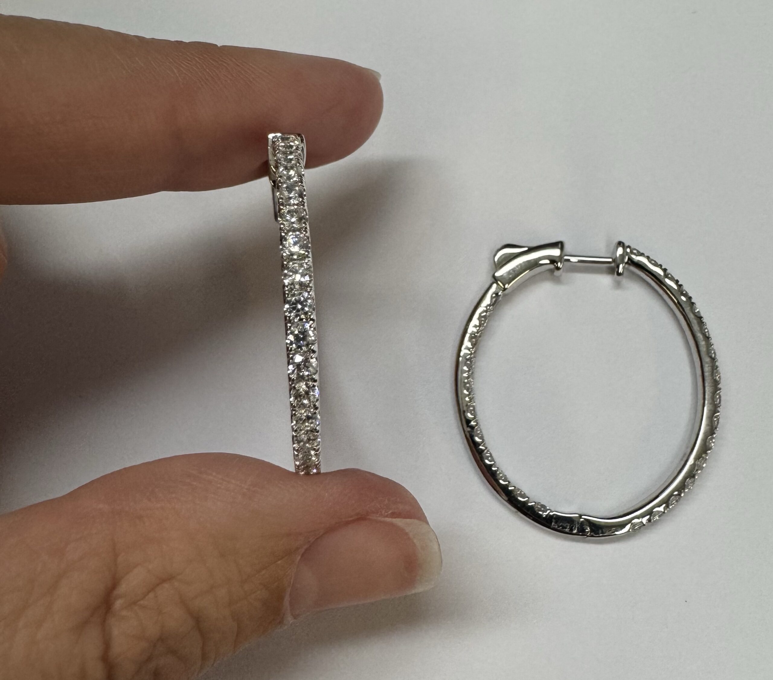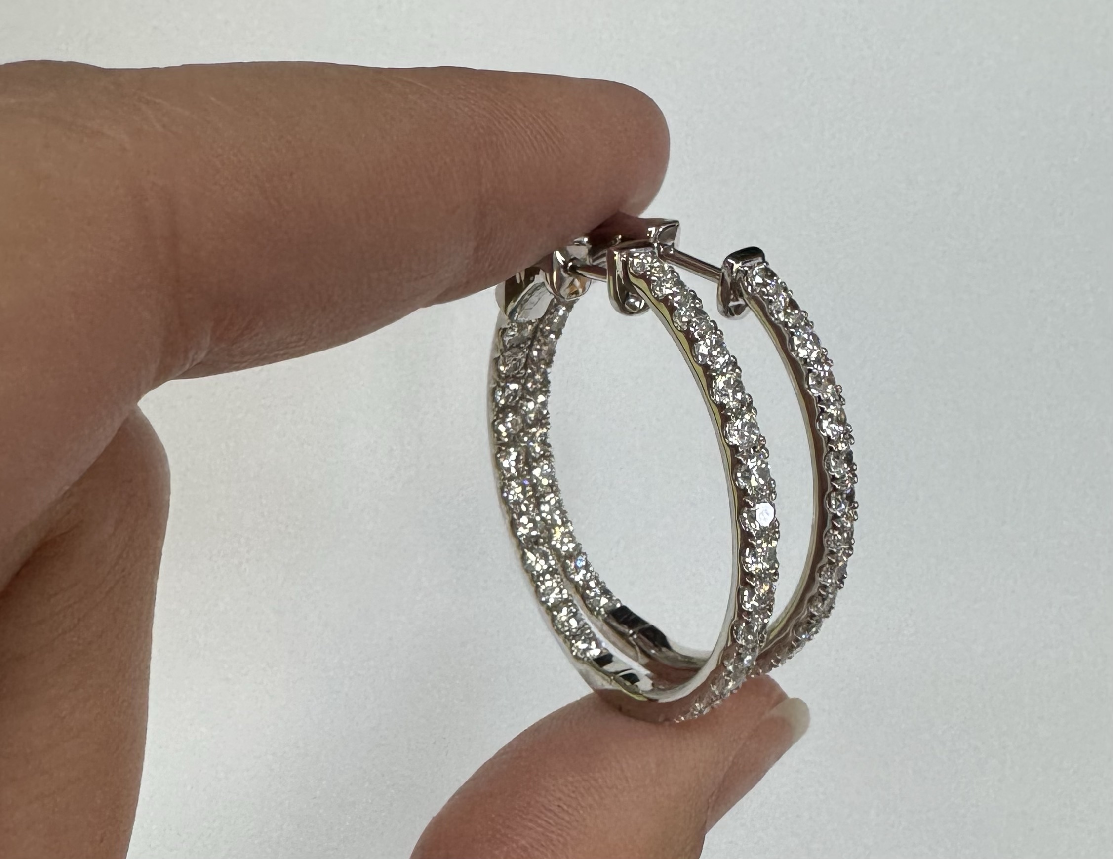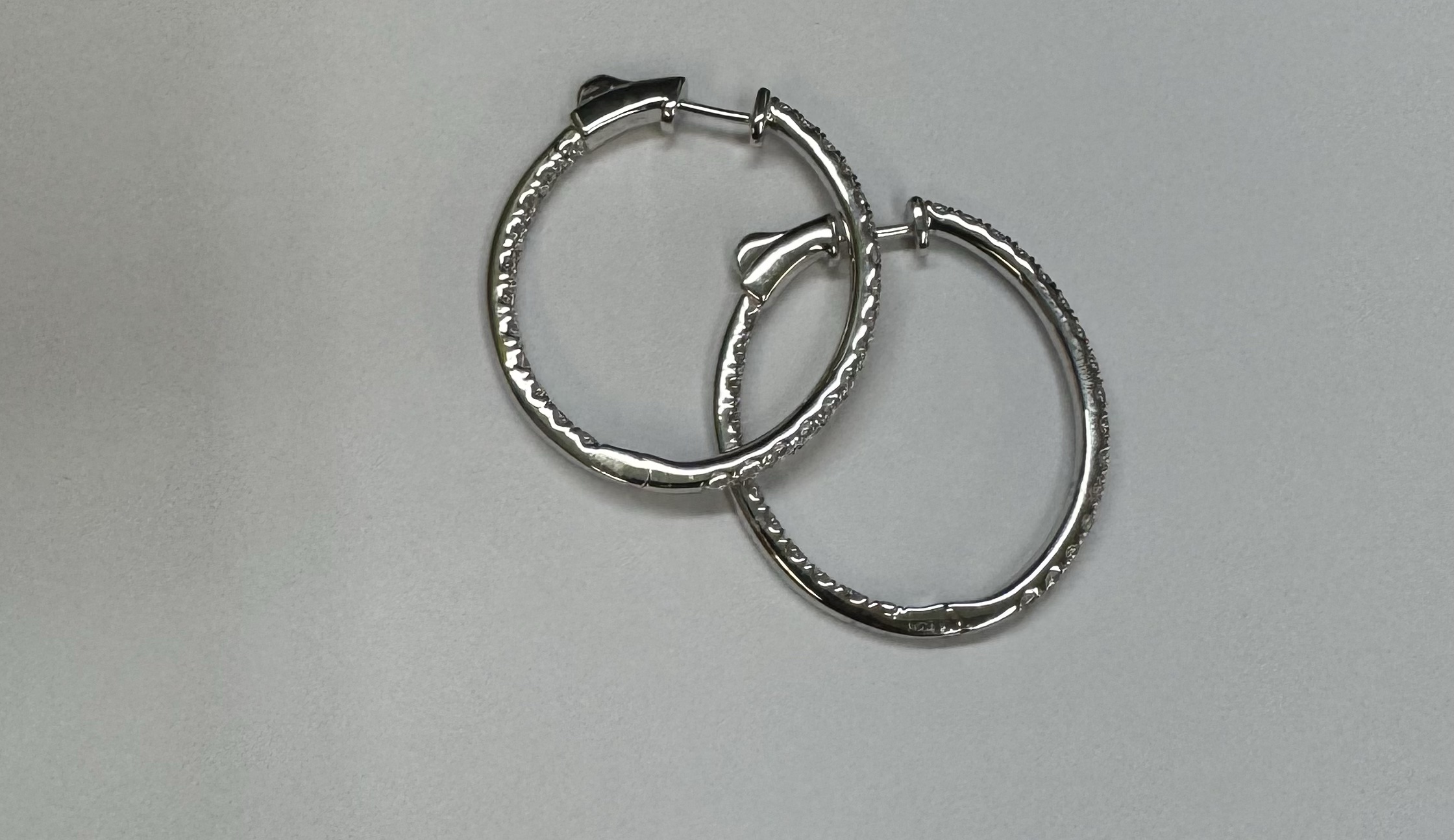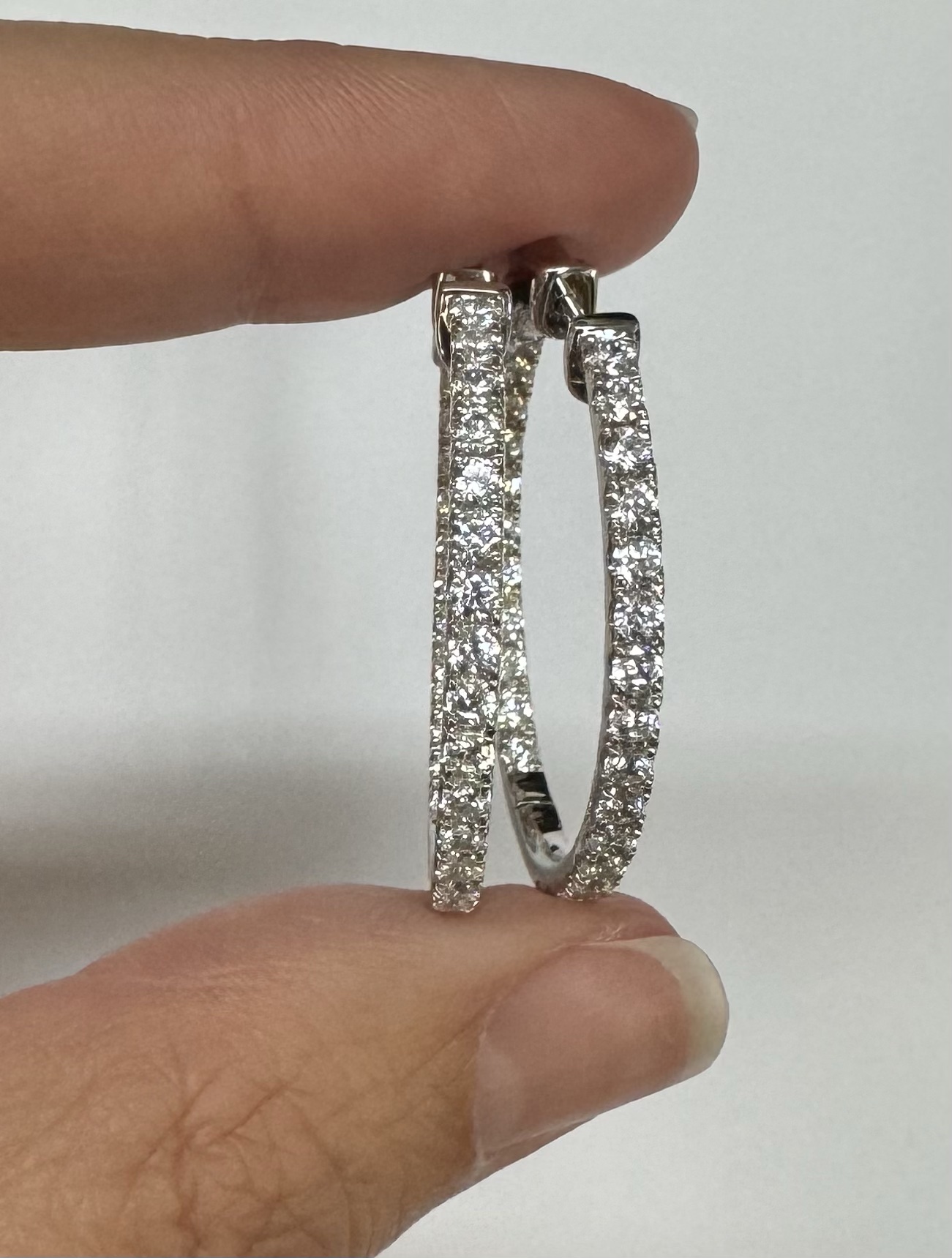 14k white gold genuine 2.02 cttw Round Brilliant Cut diamond “inside out” oval-shaped, prong set, hinged hoop earrings. These diamonds average G-H in color and SI1-SI2 in clarity. These diamonds are nicely proportioned and well finished. These earrings measure approximately 2.3 x 28 mm in size, and they have an entire weight of 6.0 grams.