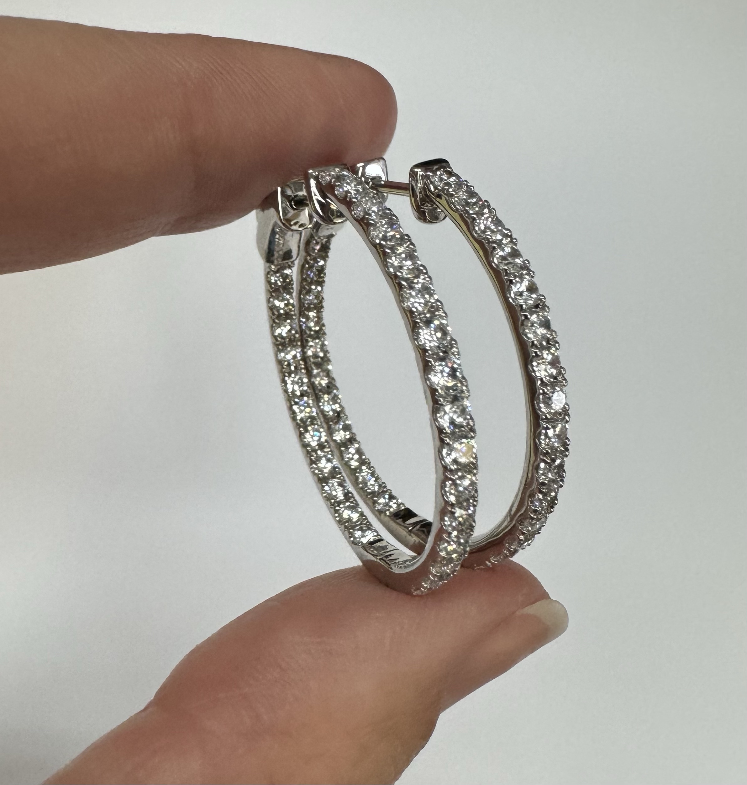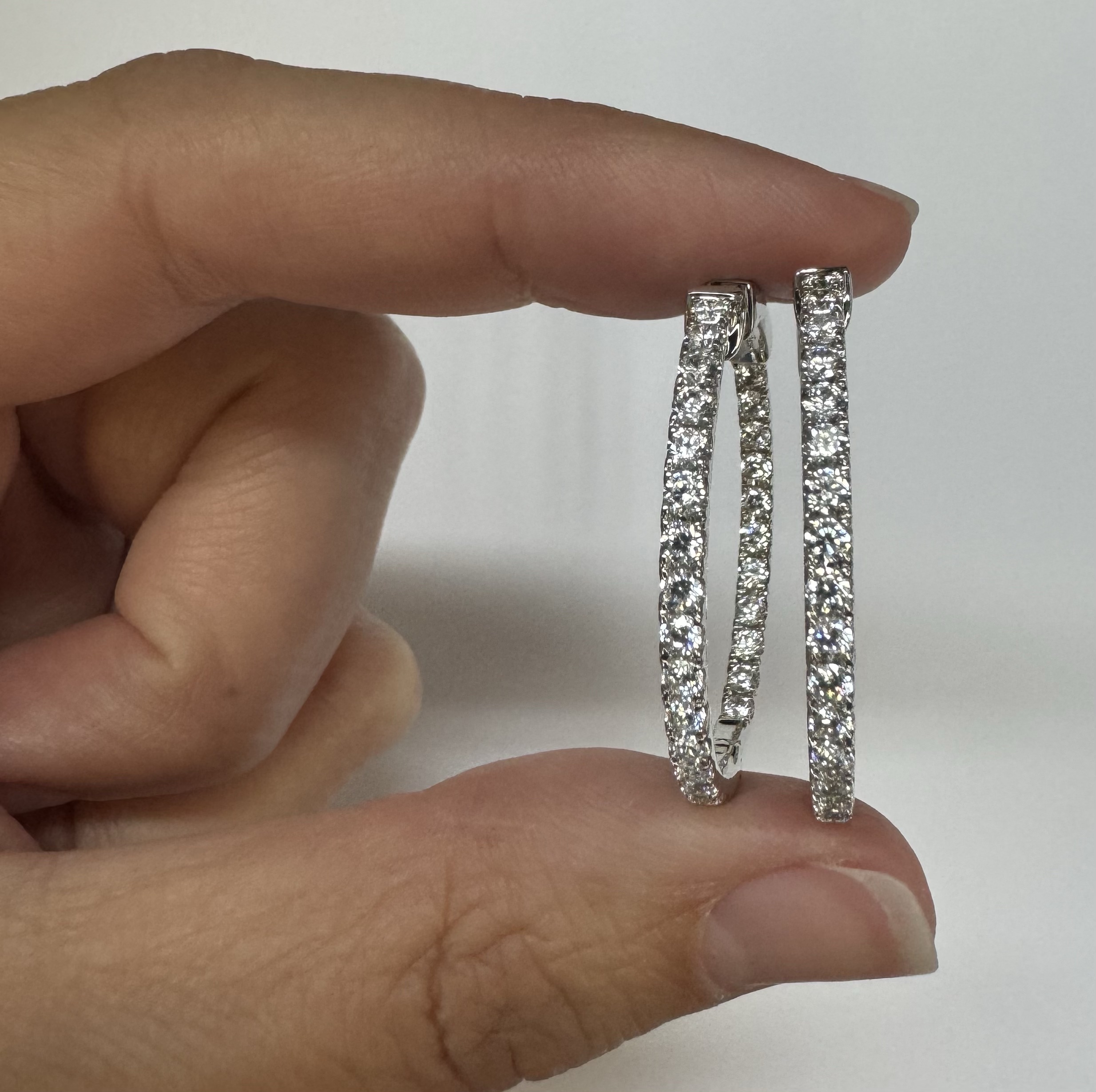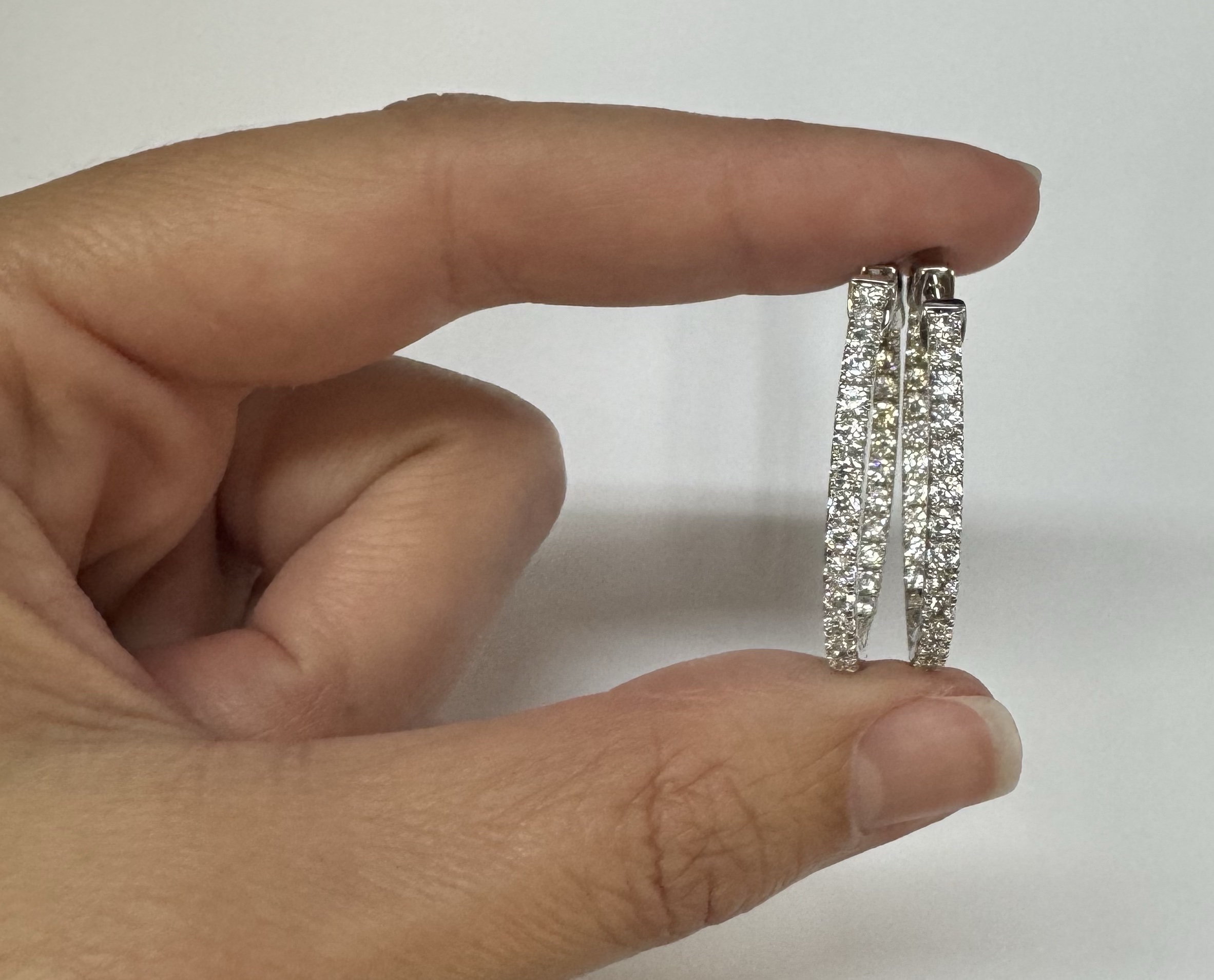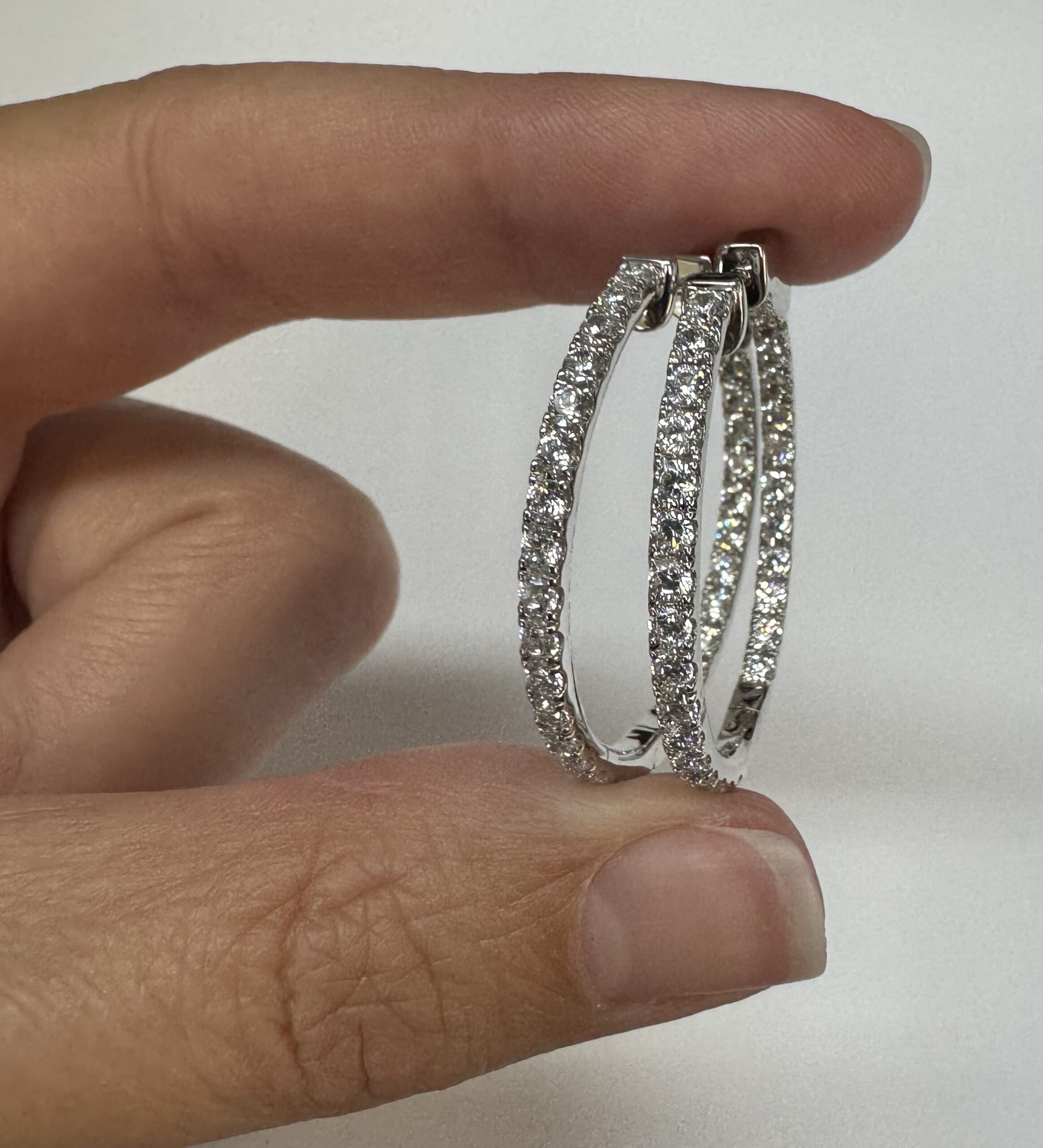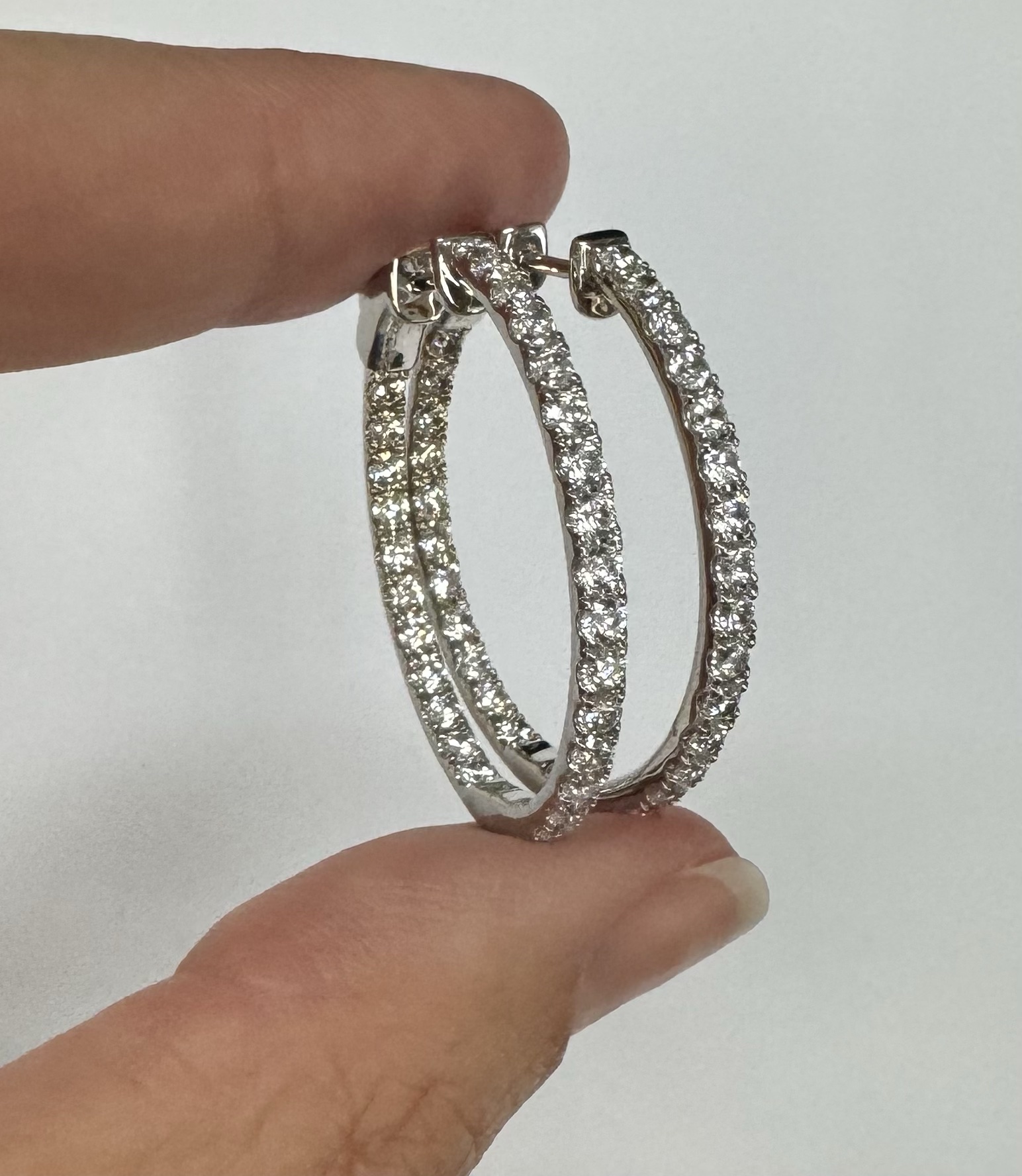 14k white gold genuine 2.02 cttw Round Brilliant Cut diamond “inside out” oval-shaped, prong set, hinged hoop earrings. These diamonds average G-H in color and SI1-SI2 in clarity. These diamonds are nicely proportioned and well finished. These earrings measure approximately 2.3 x 28 mm in size, and they have an entire weight of 6.0 grams.