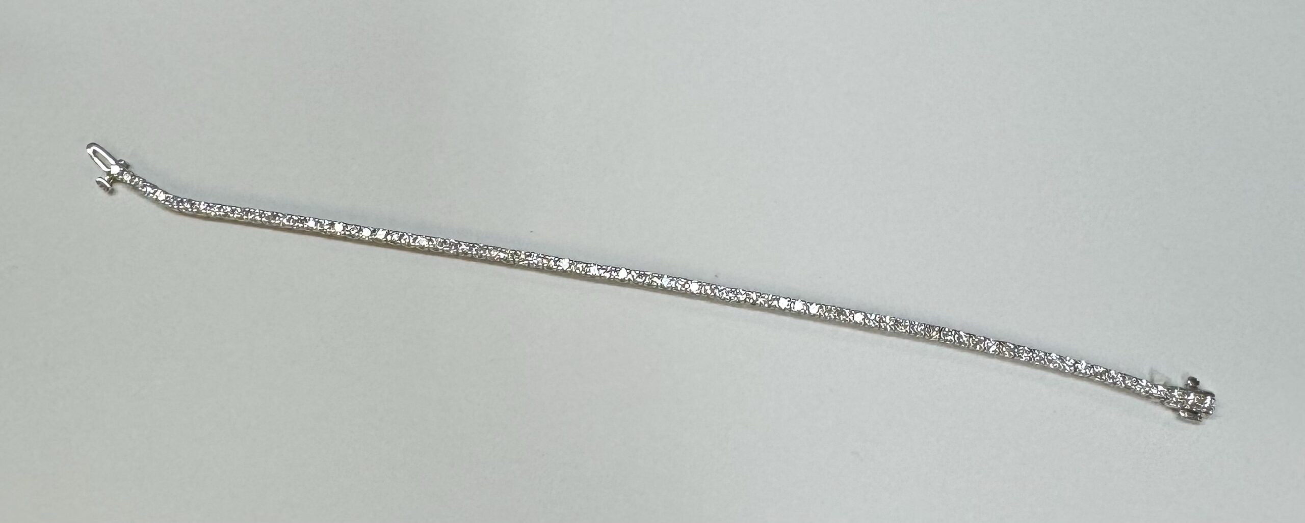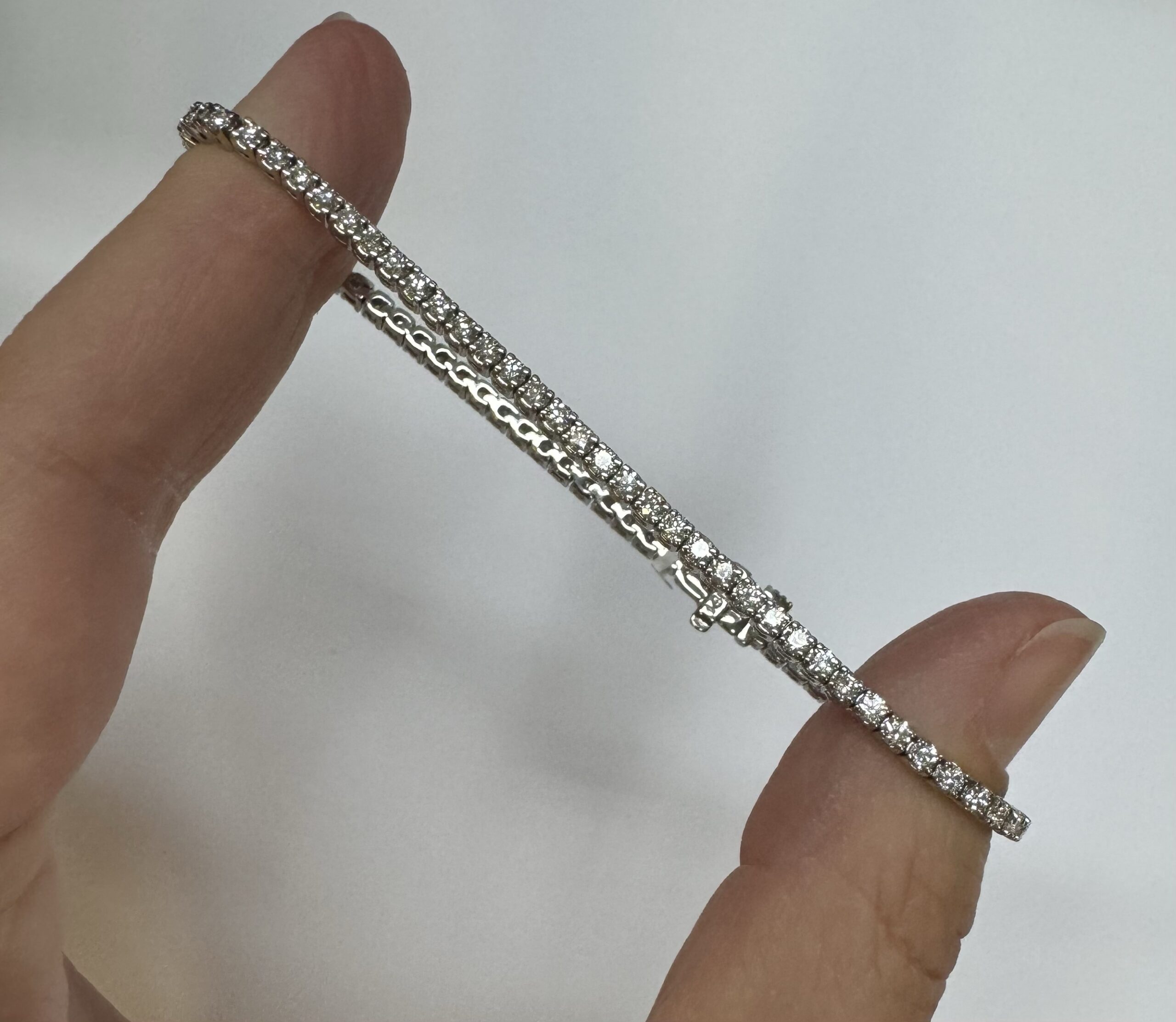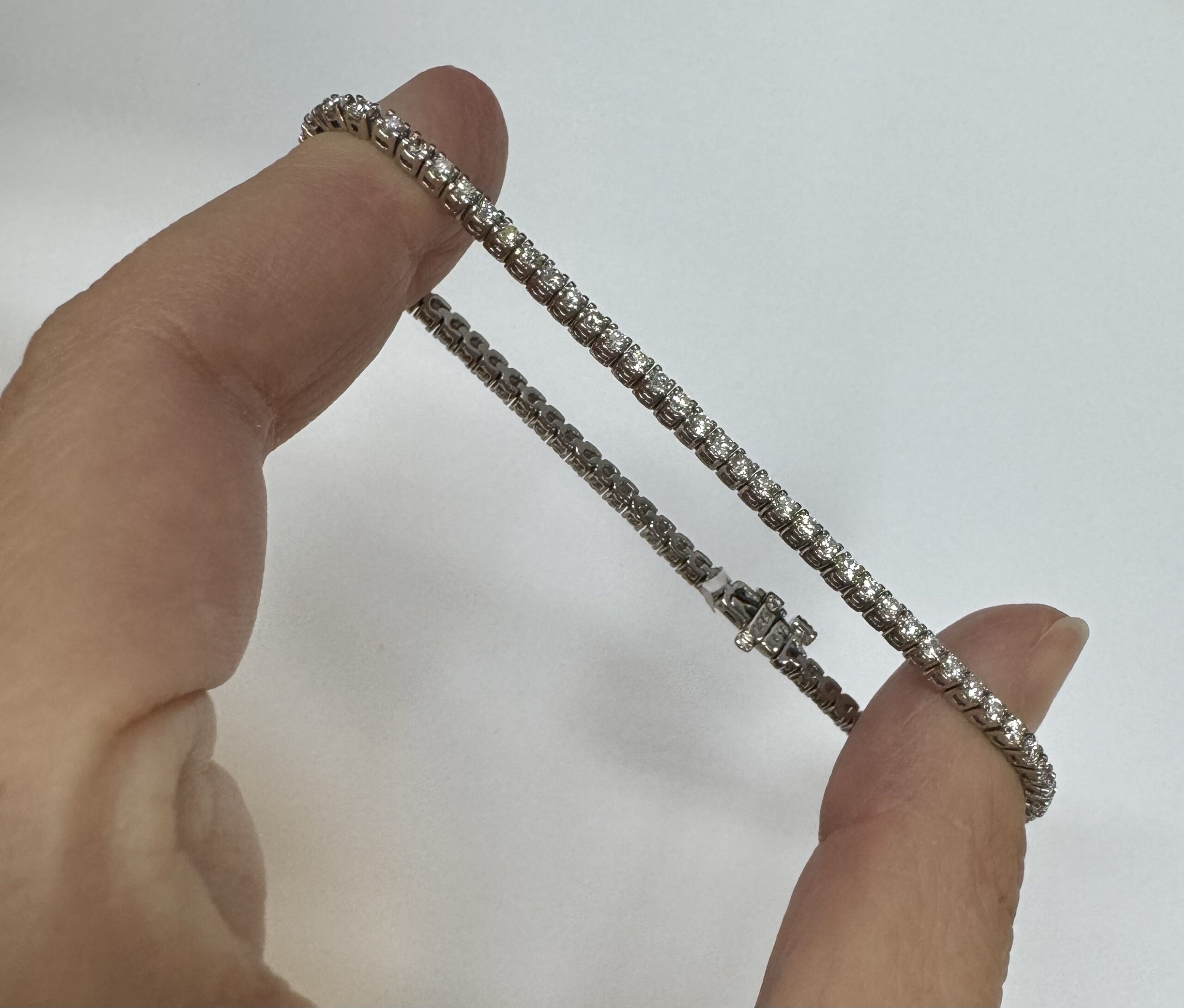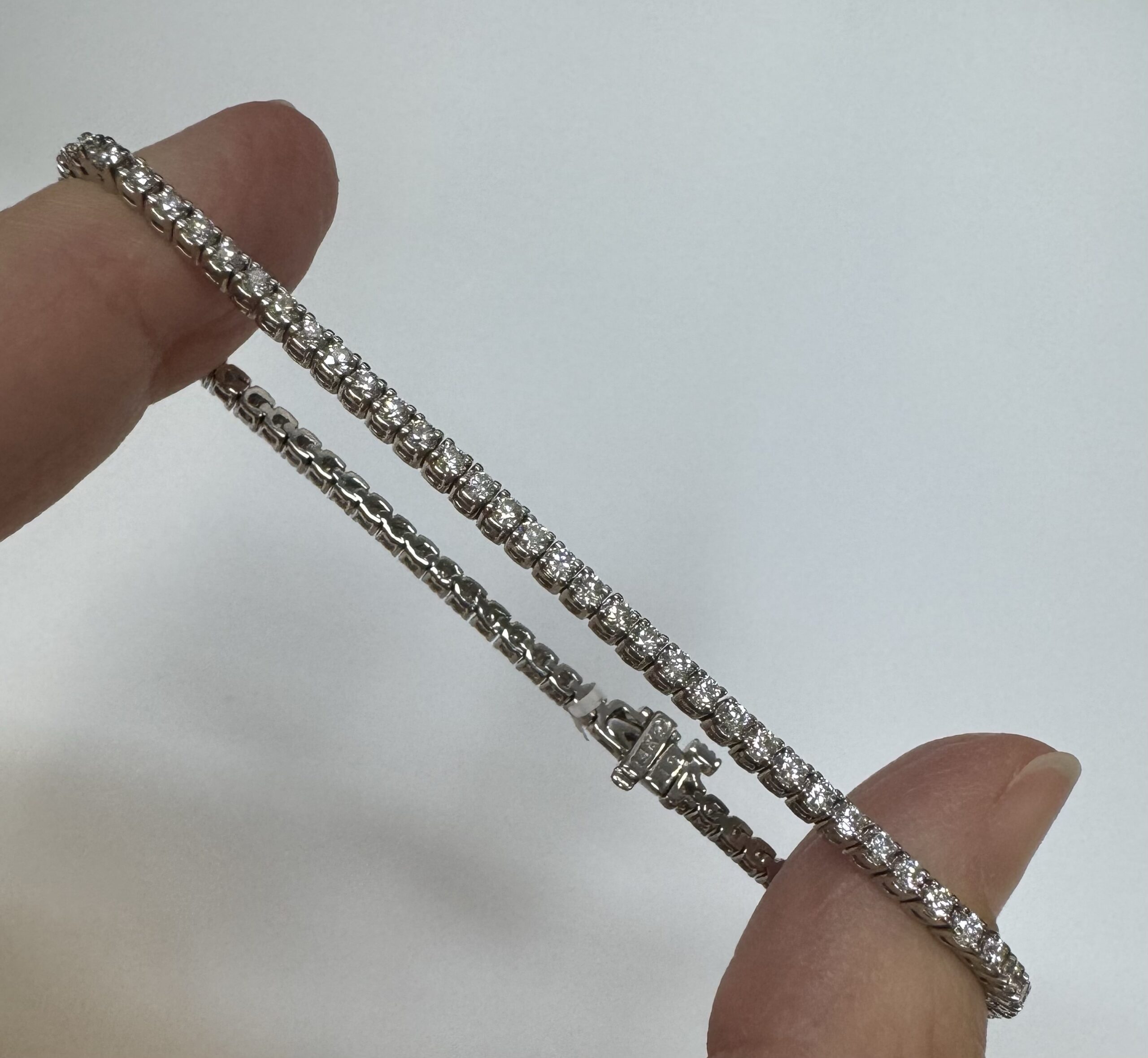 14k white gold 2.13 cttw Round Brilliant Cut diamond block style tennis bracelet. These diamonds average H in color and SI2 in clarity. This bracelet measures 7” in length, and it has an entire weight of 7.2 grams.