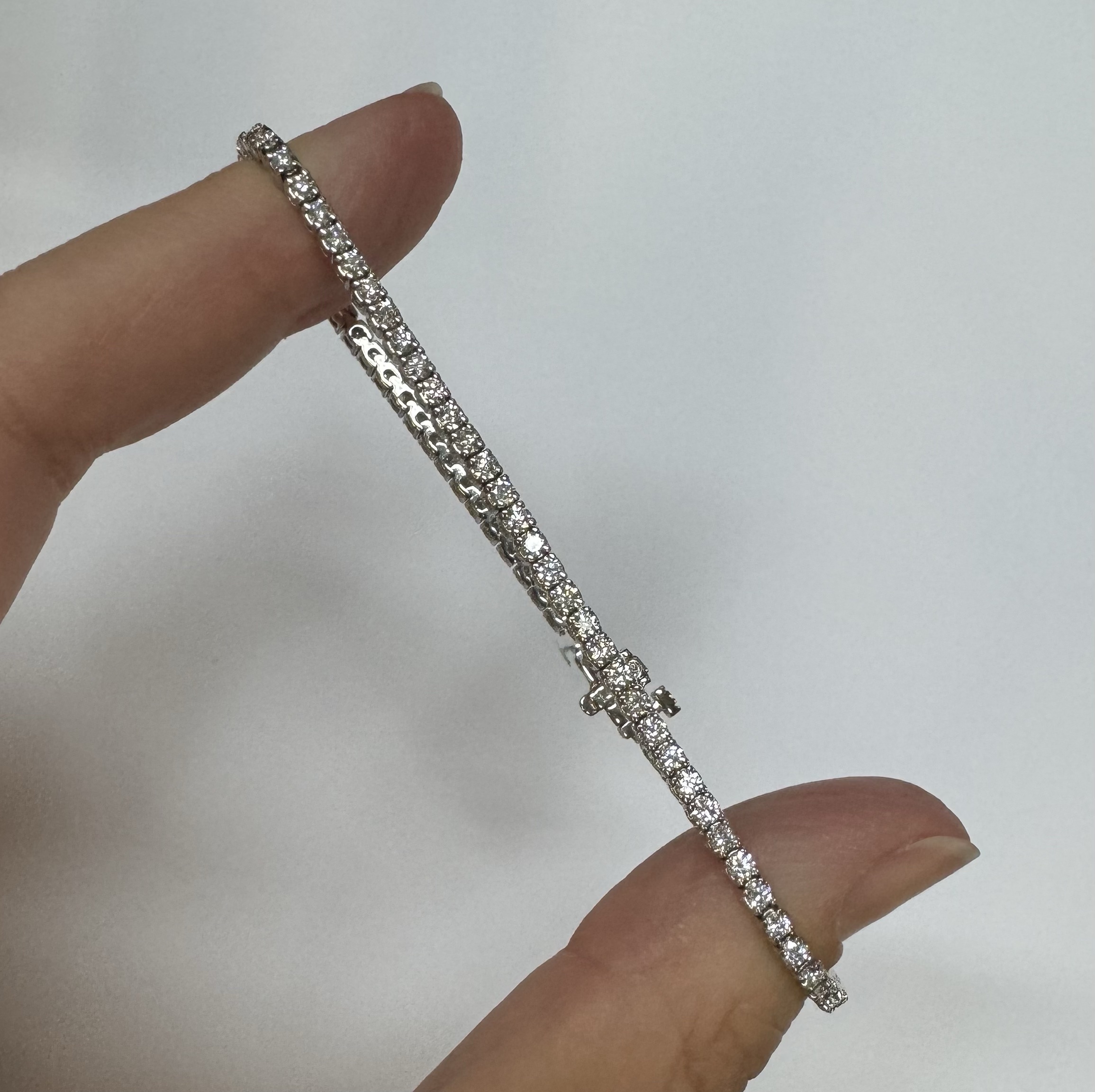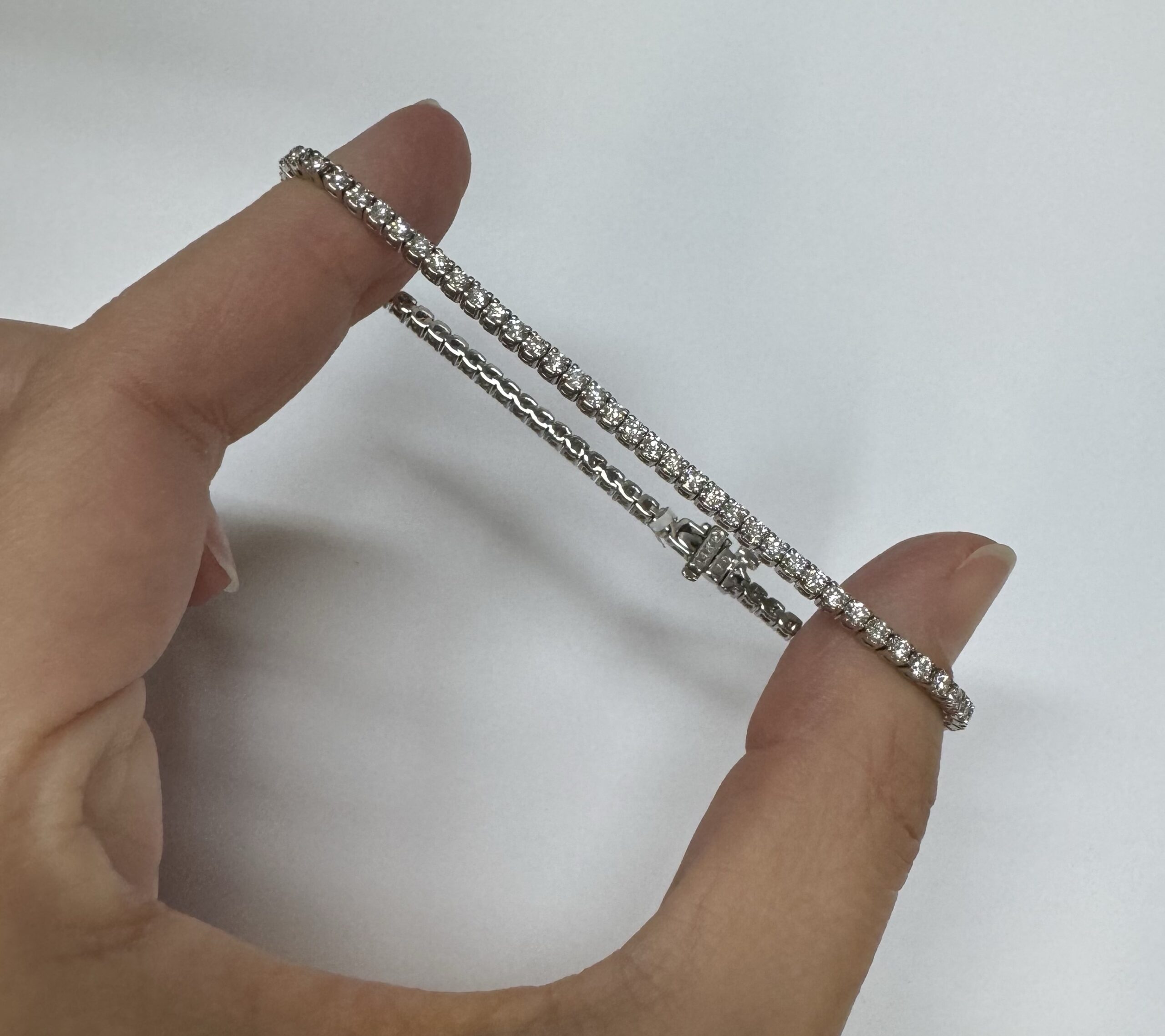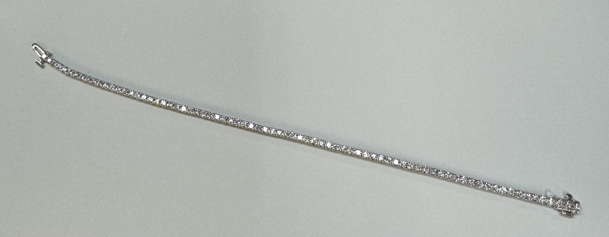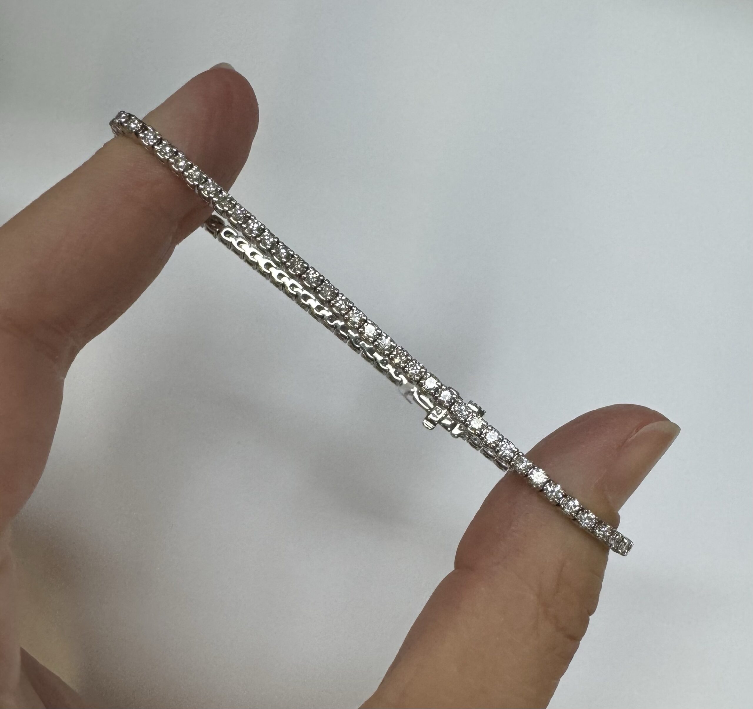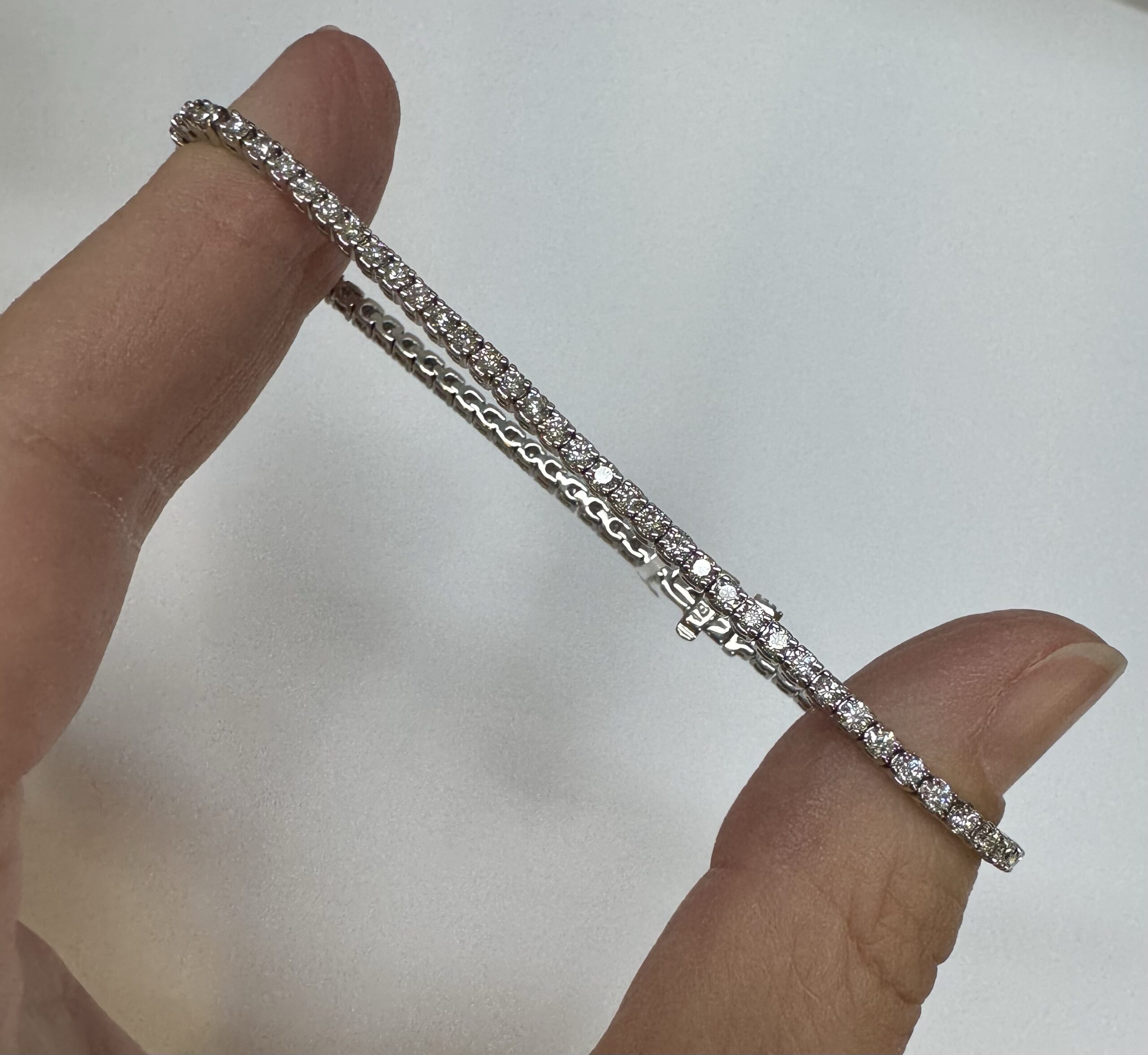 14k white gold 2.13 cttw Round Brilliant Cut diamond block style tennis bracelet. These diamonds average H in color and SI2 in clarity. This bracelet measures 7” in length, and it has an entire weight of 7.2 grams.
