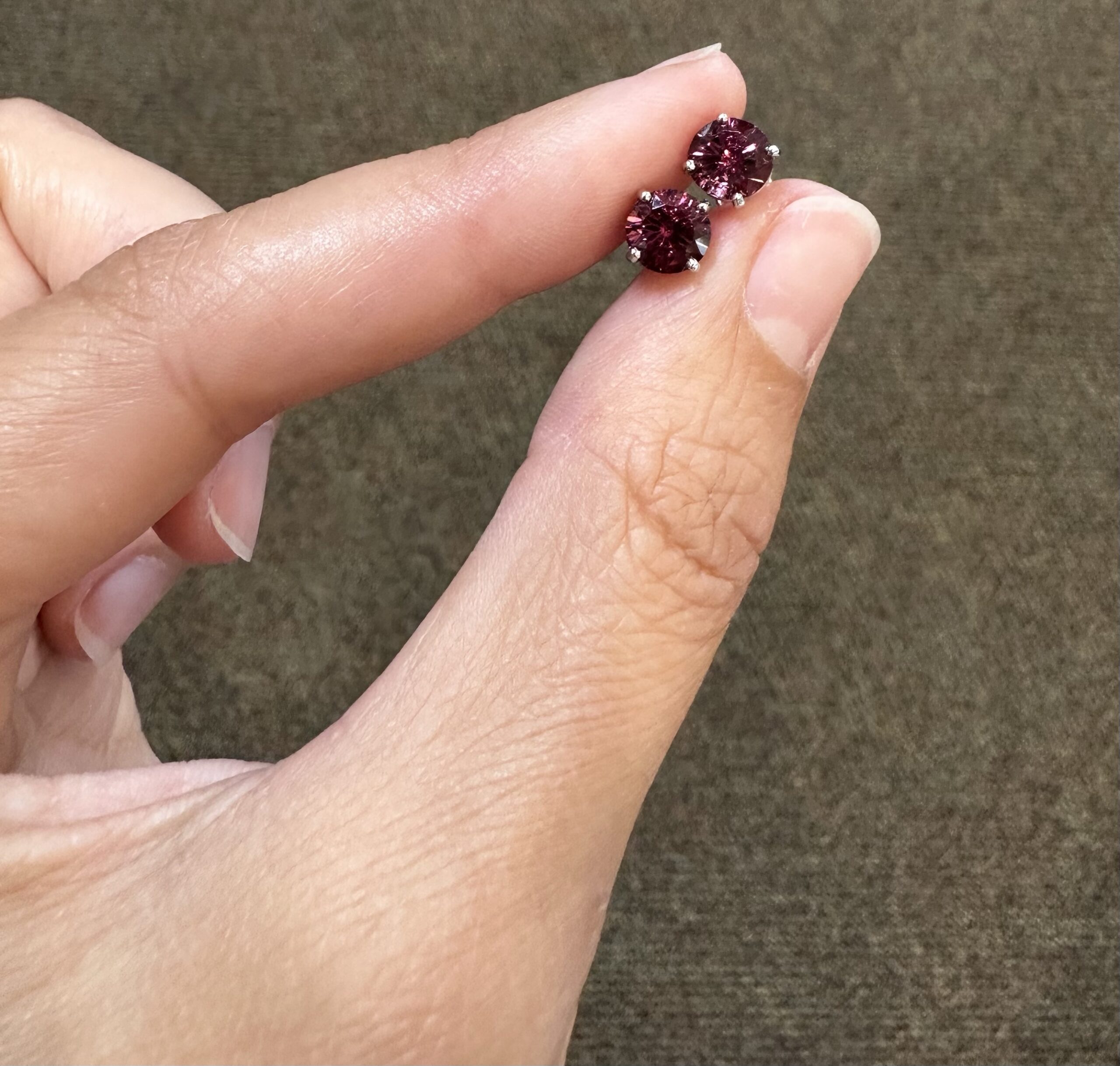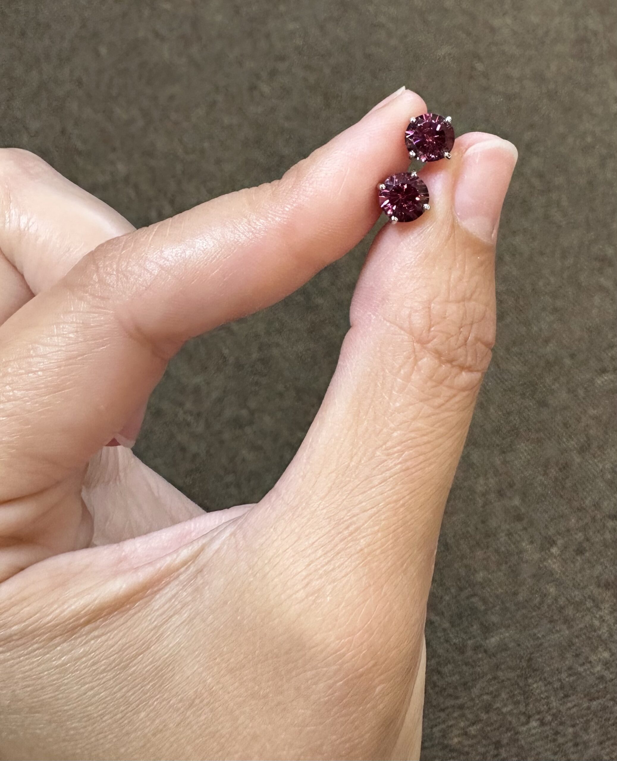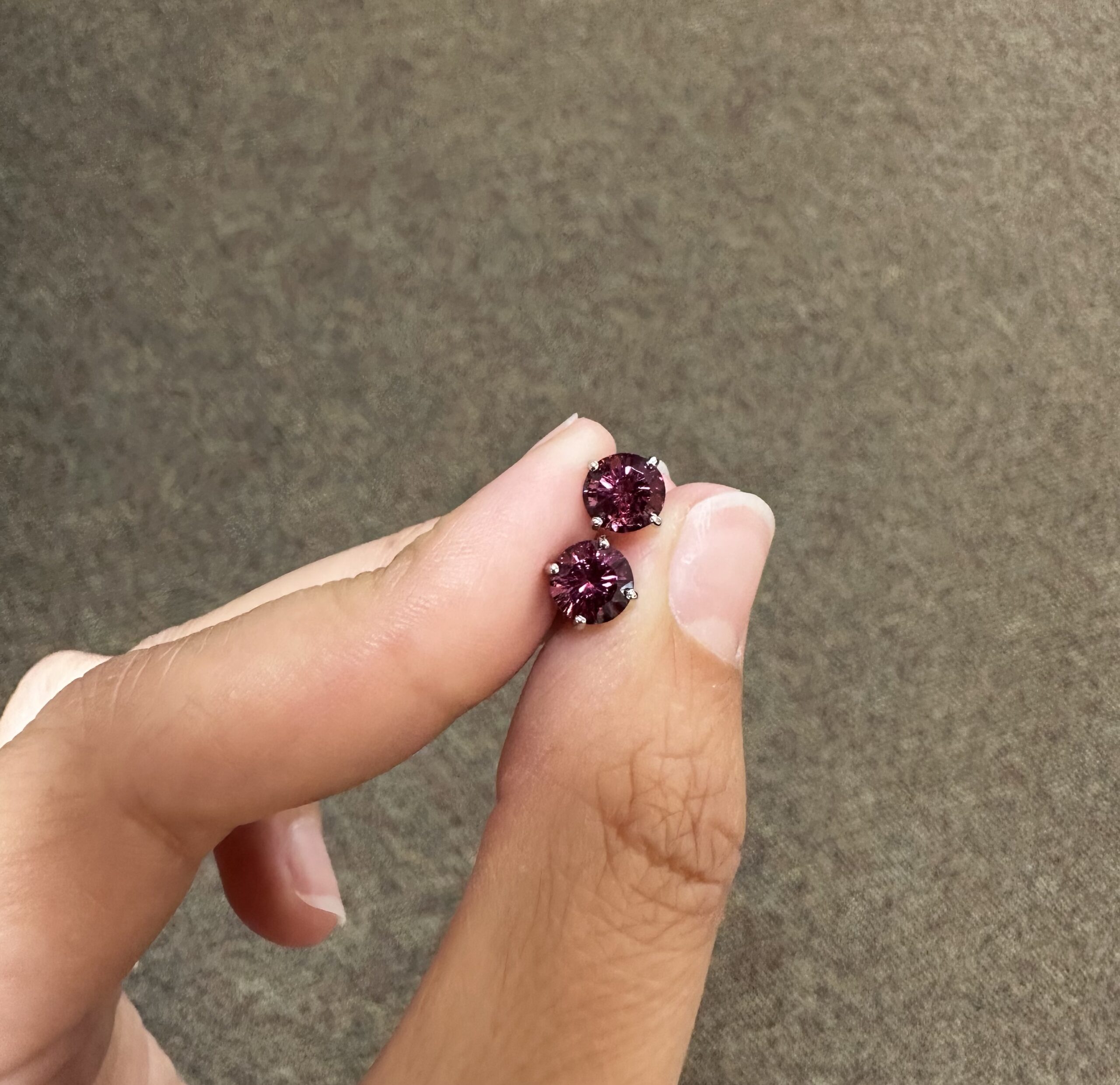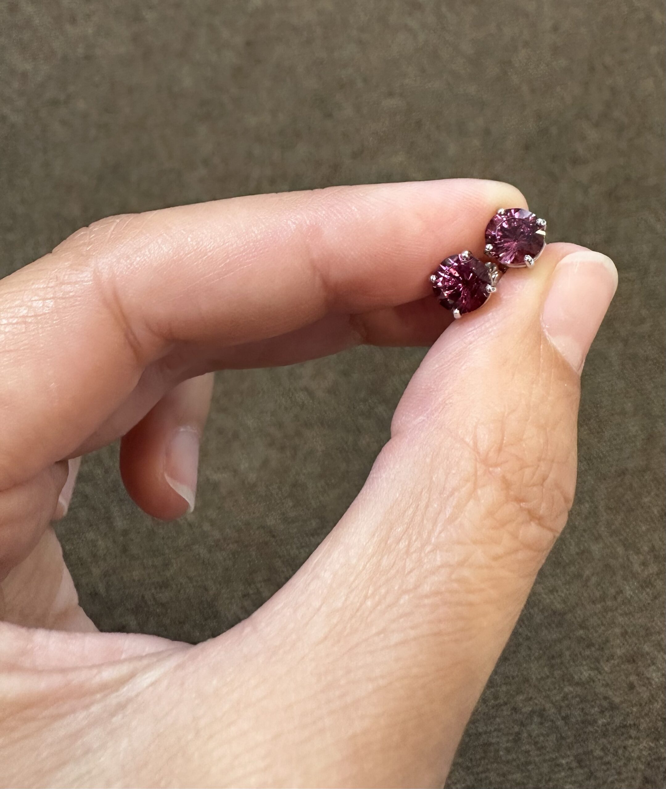 14k white gold round, faceted, basket set genuine 2.19 carat Rhodolite Garnet (January birthstone) stud earrings. These earrings have an entire weight of 1.5 grams.