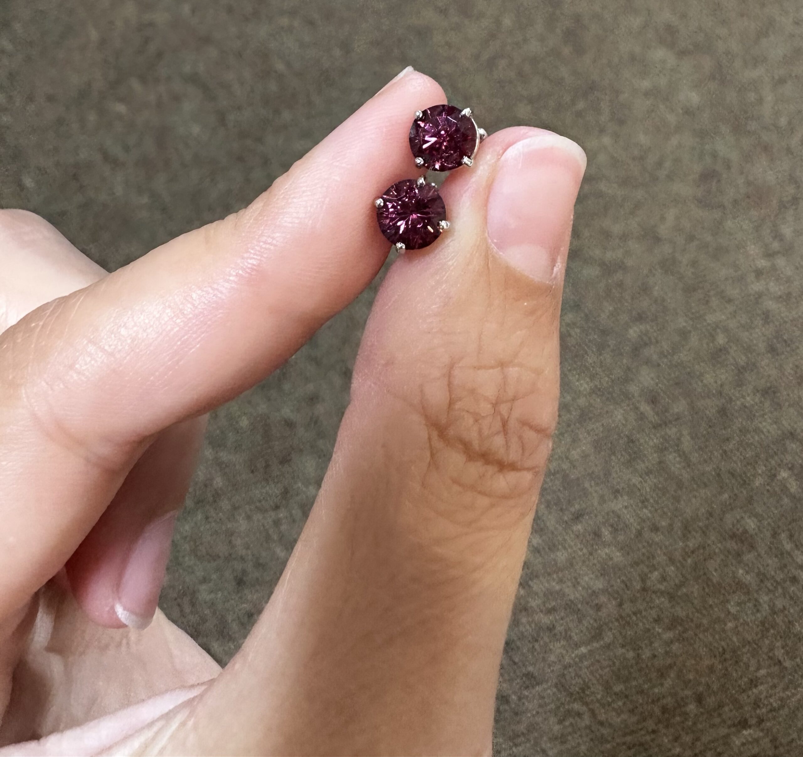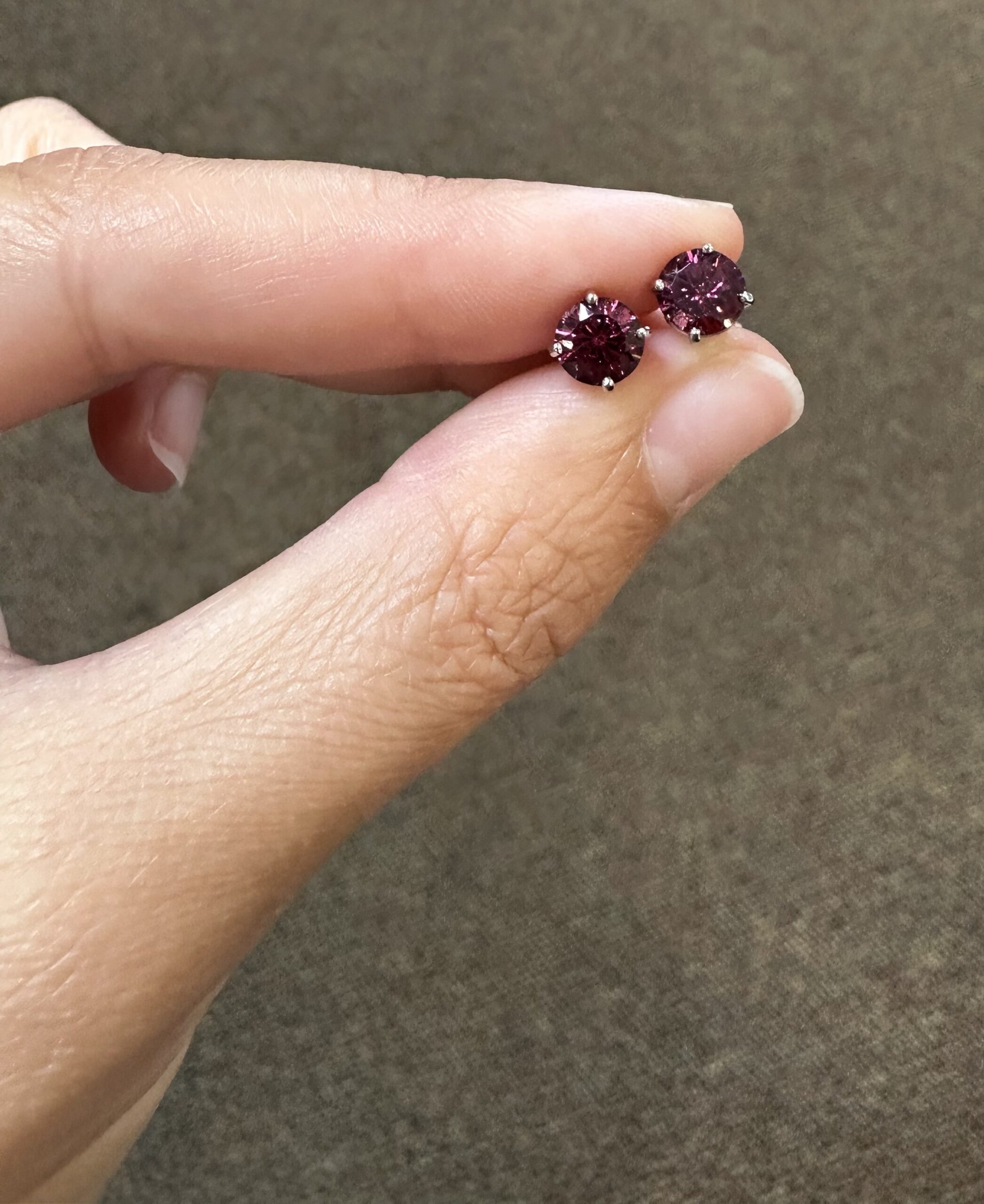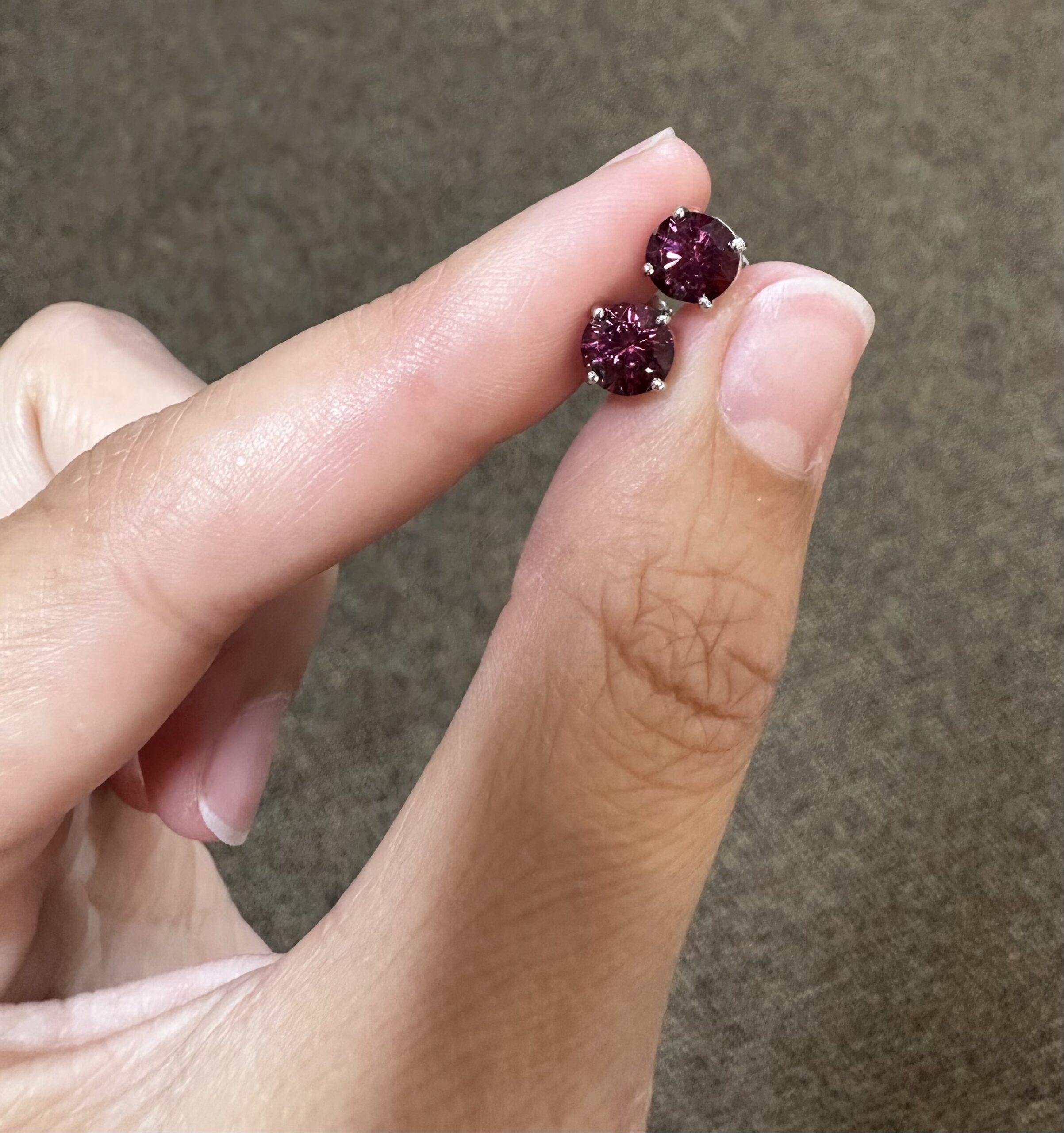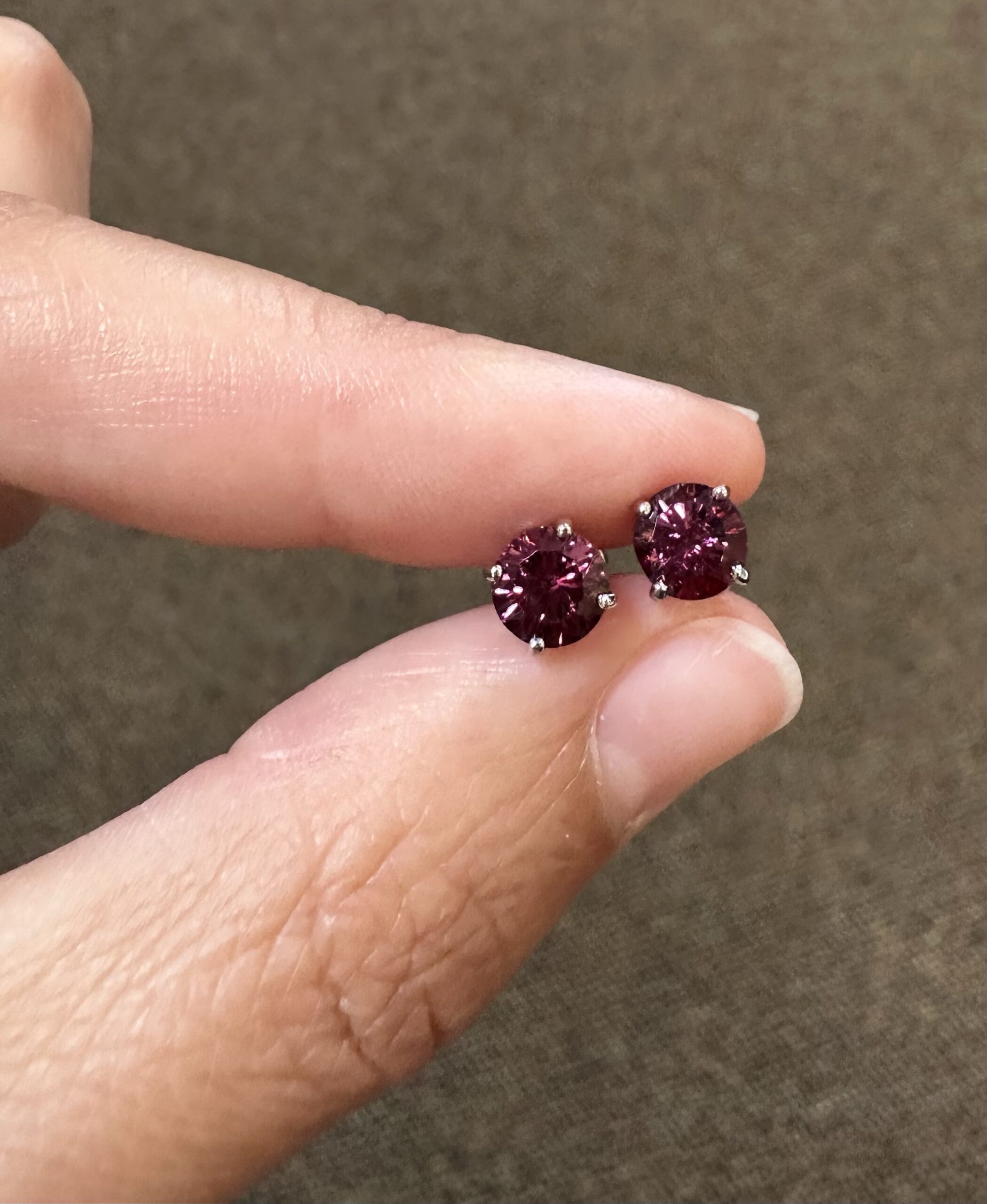 14k white gold round, faceted, basket set genuine 2.19 carat Rhodolite Garnet (January birthstone) stud earrings. These earrings have an entire weight of 1.5 grams.