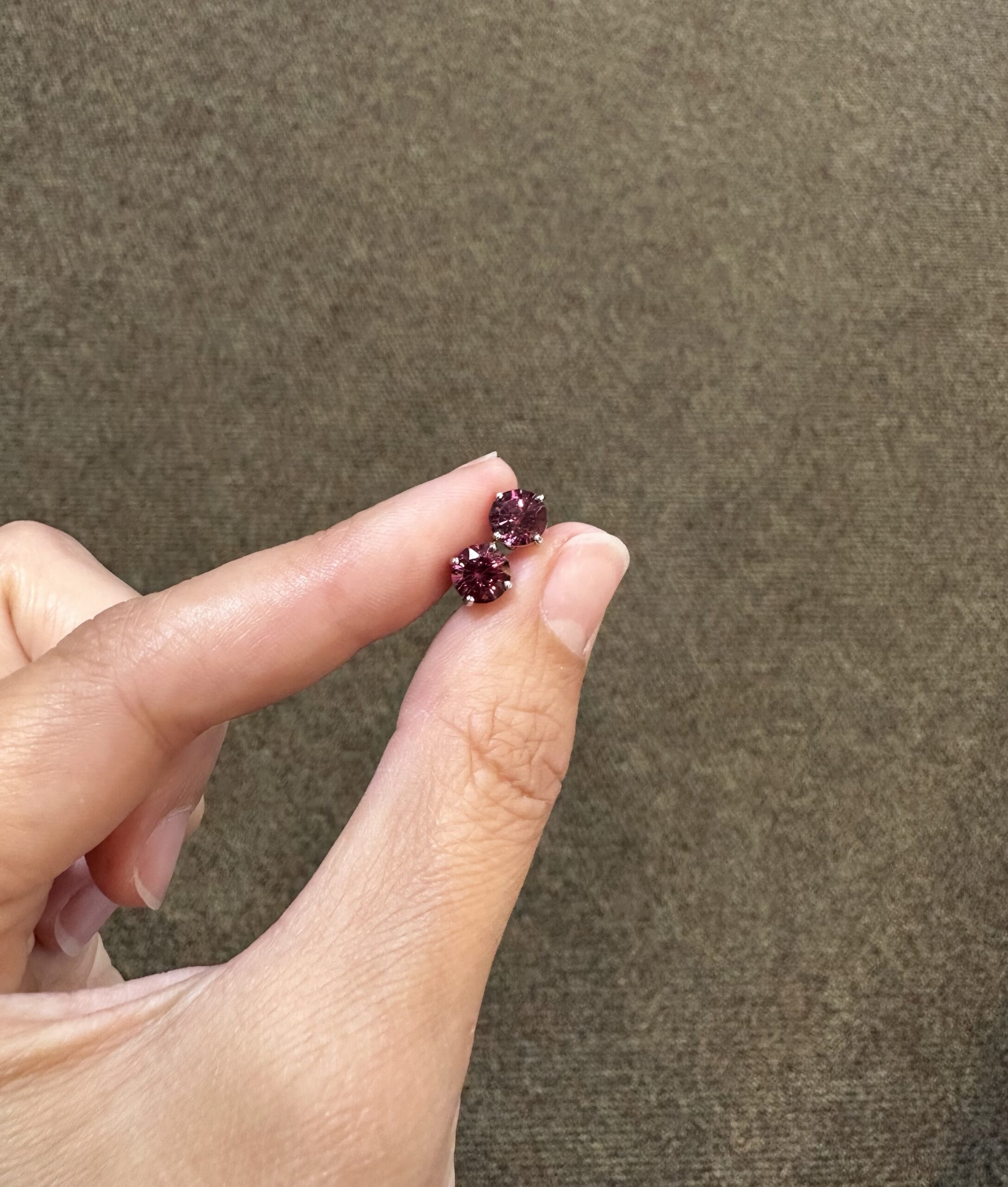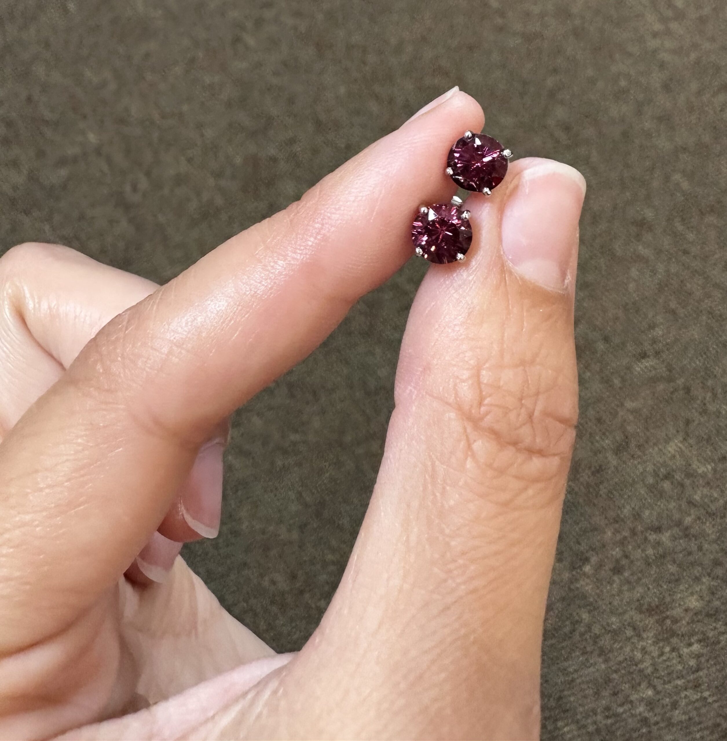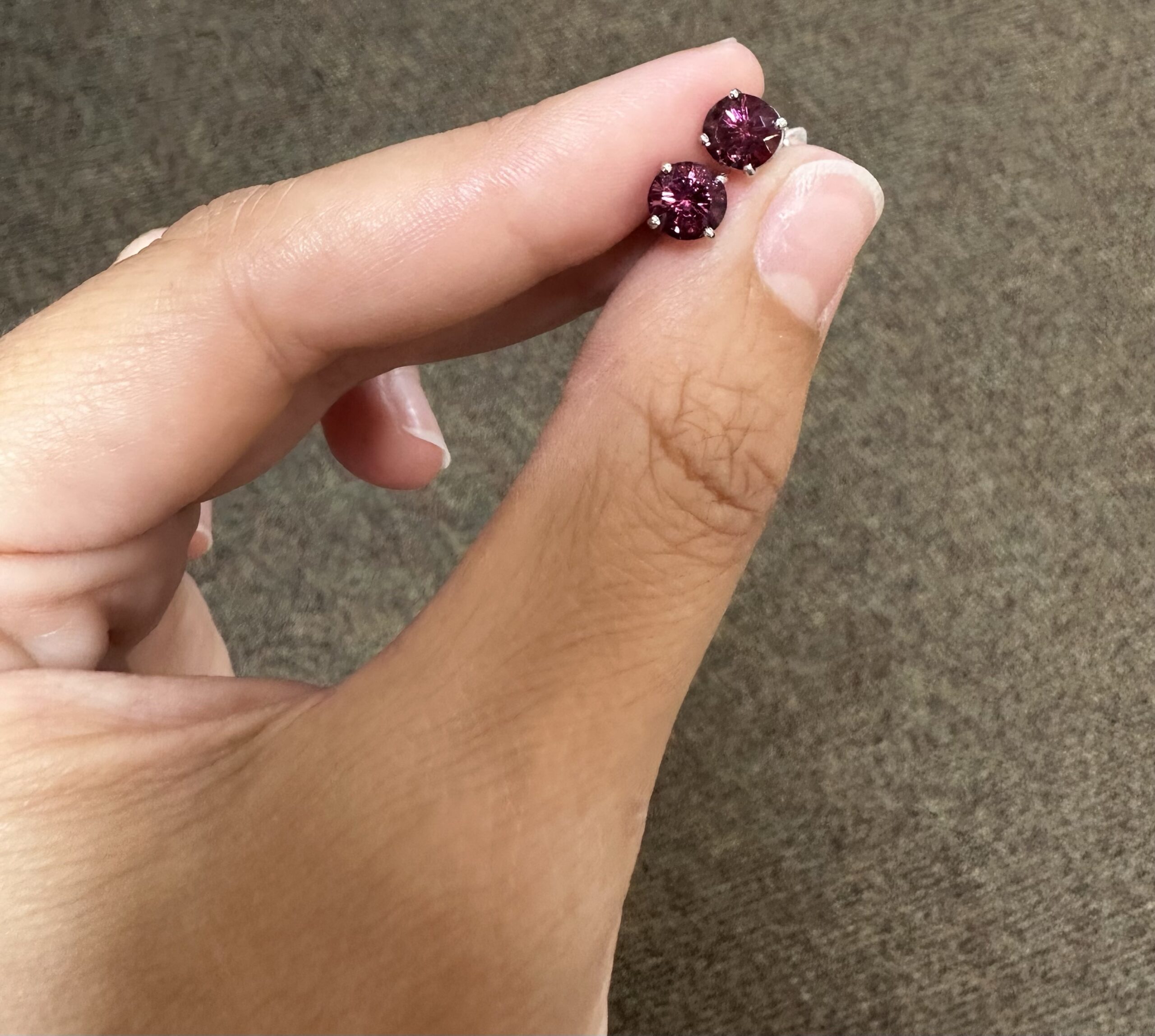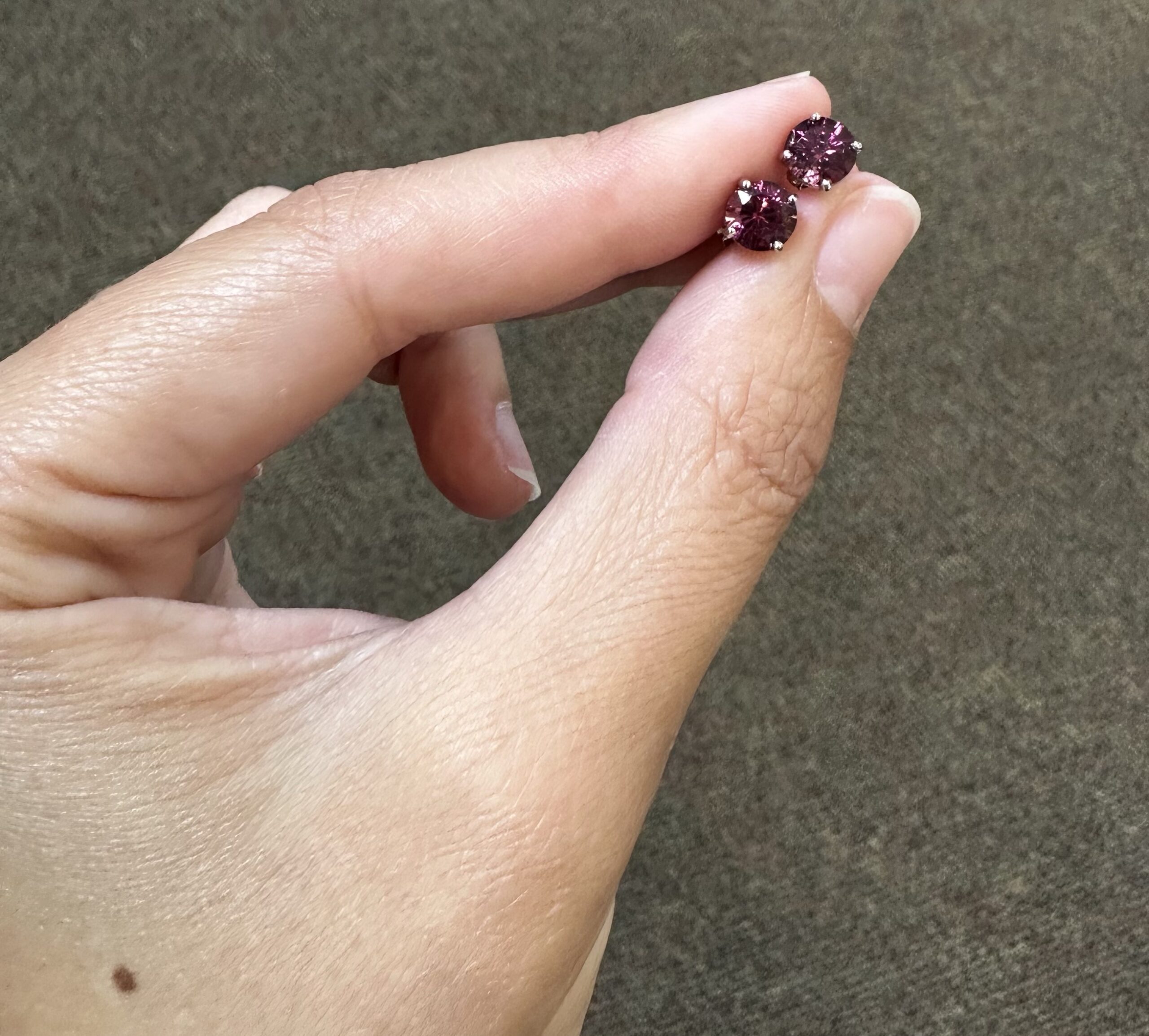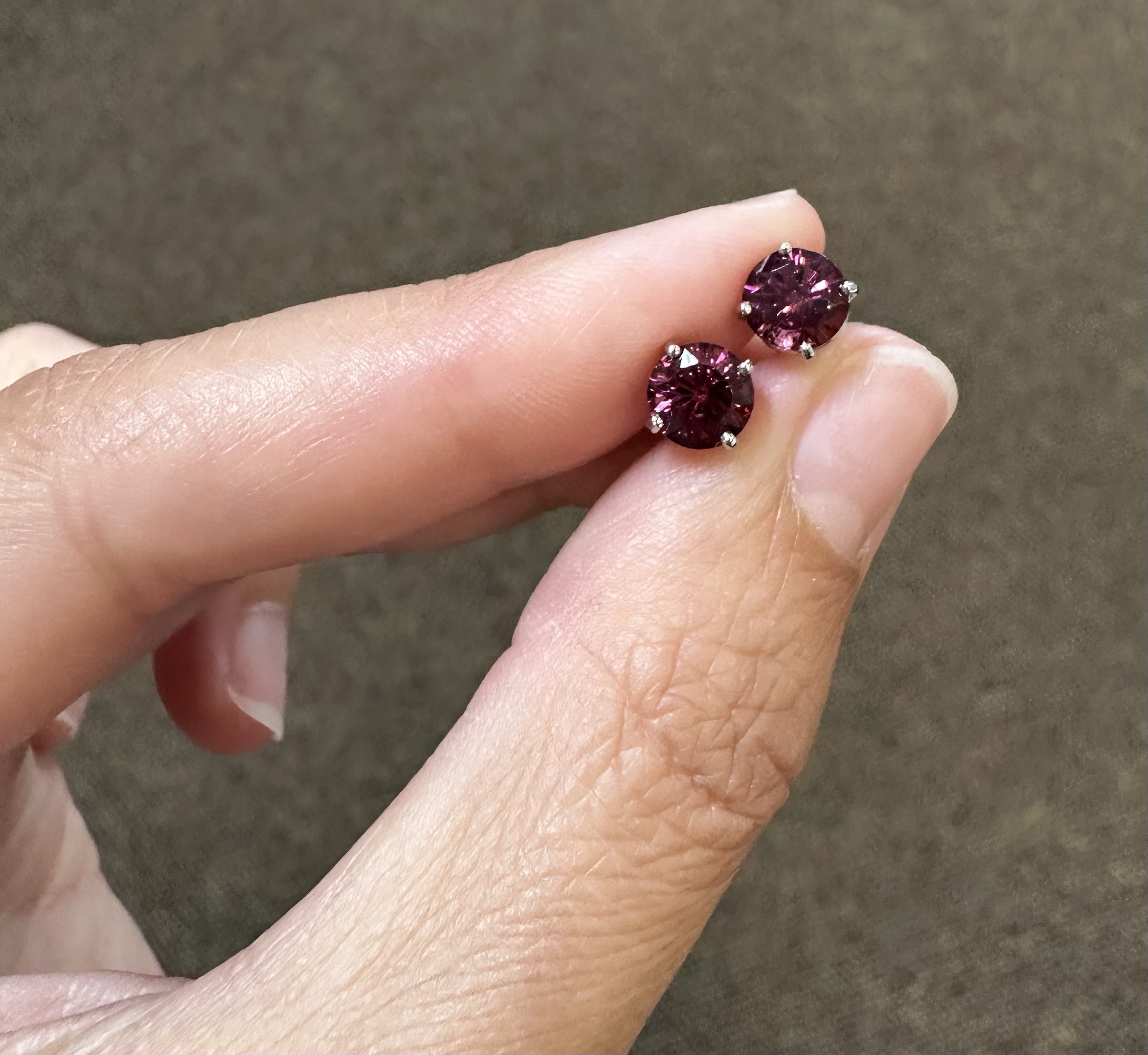 14k white gold round, faceted, basket set genuine 2.19 carat Rhodolite Garnet (January birthstone) stud earrings. These earrings have an entire weight of 1.5 grams.