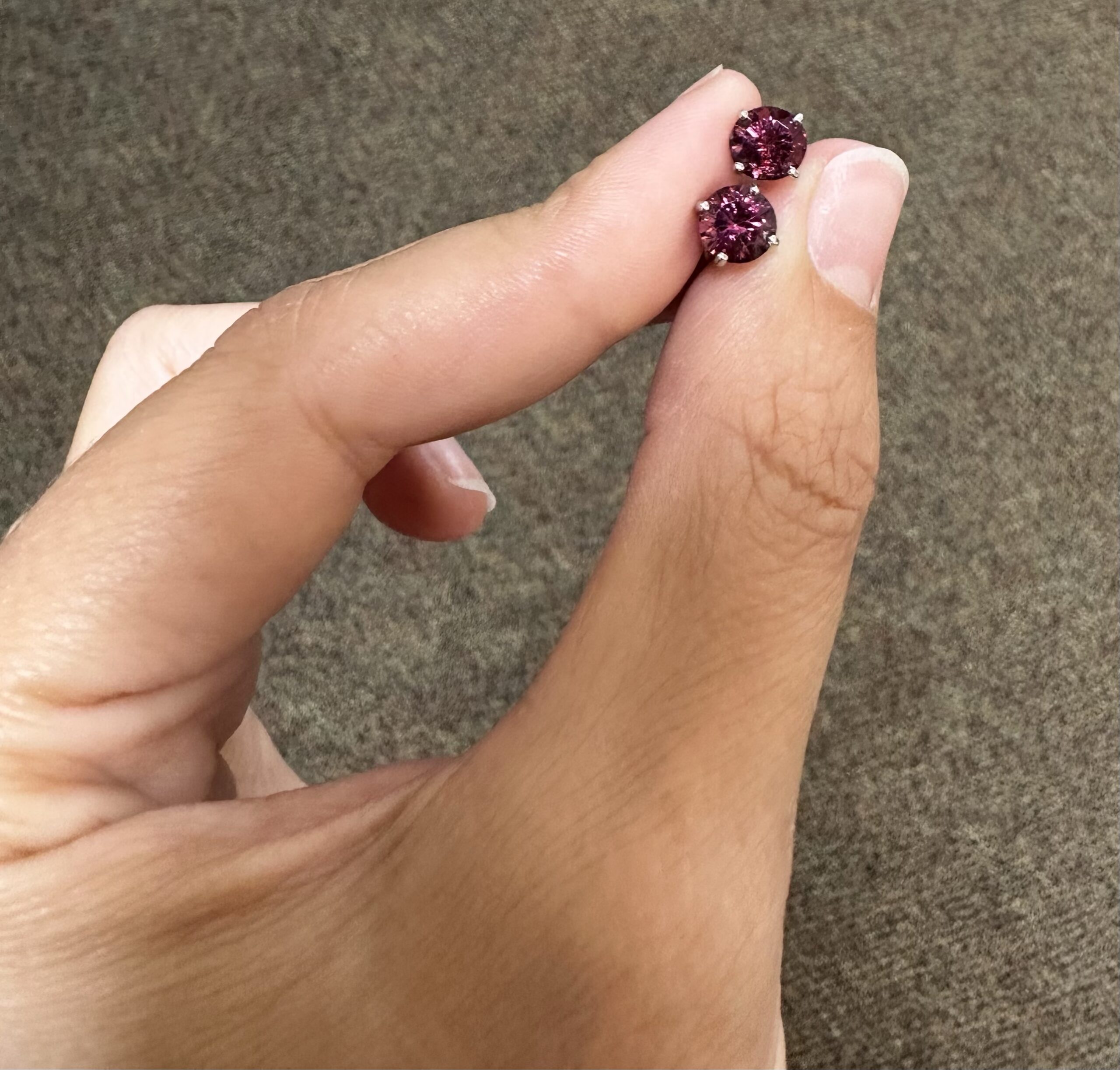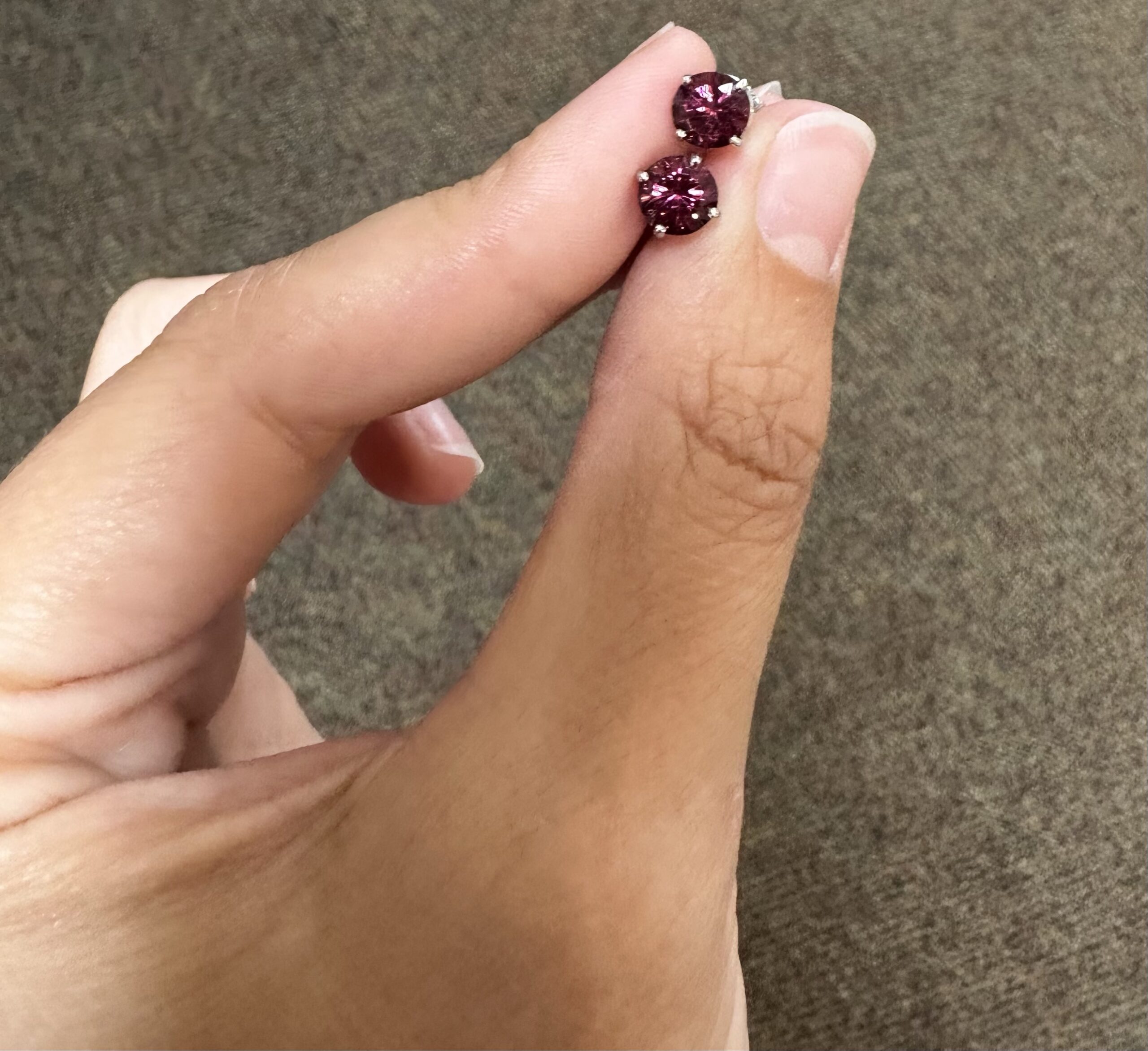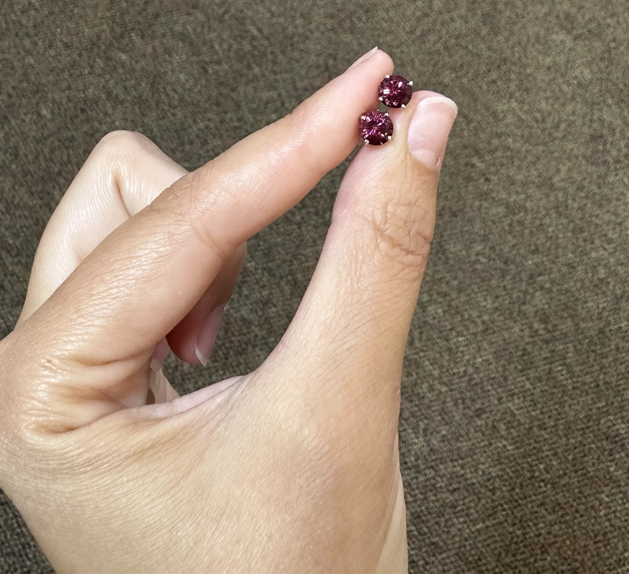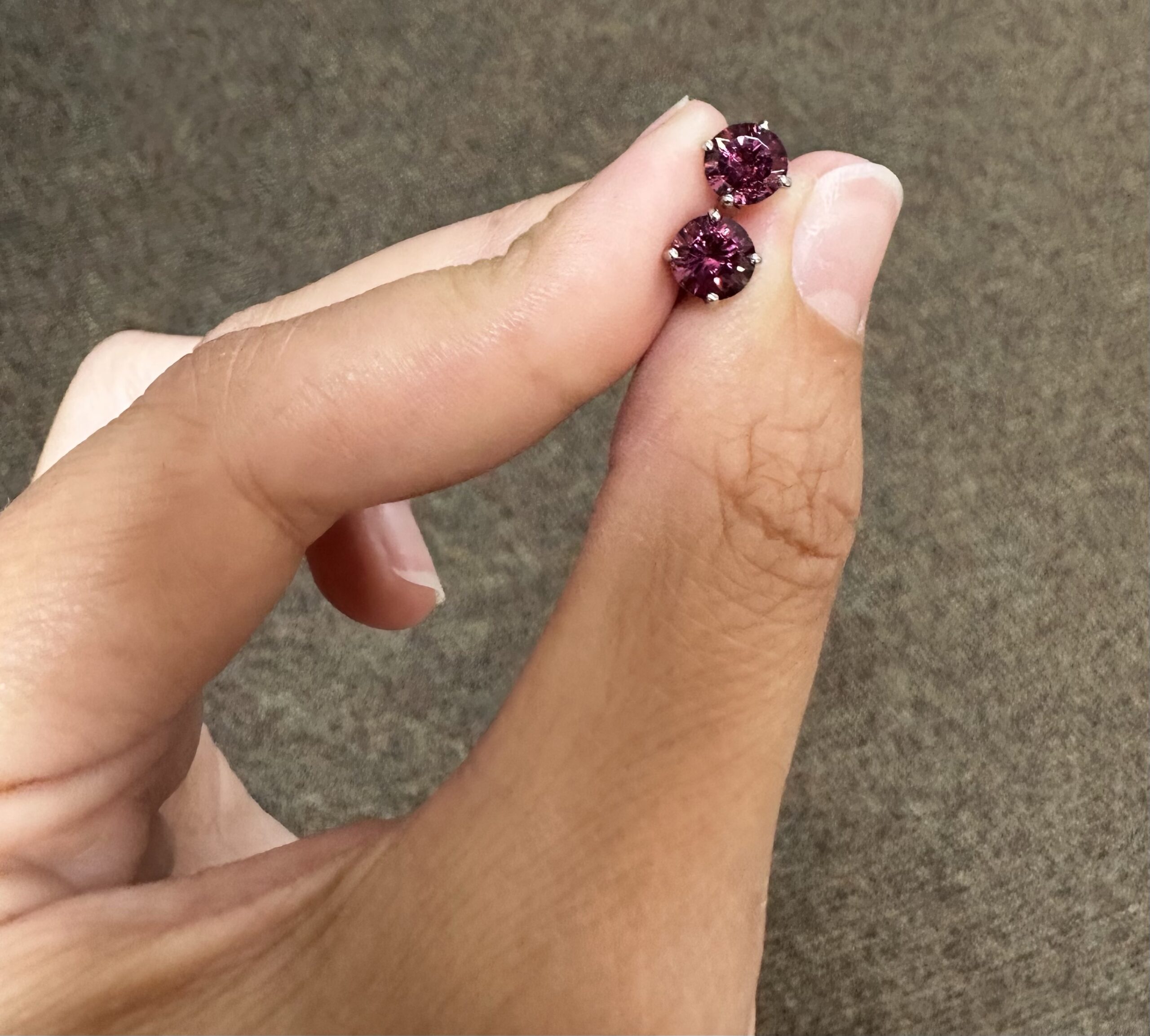 14k white gold round, faceted, basket set genuine 2.19 carat Rhodolite Garnet (January birthstone) stud earrings. These earrings have an entire weight of 1.5 grams.