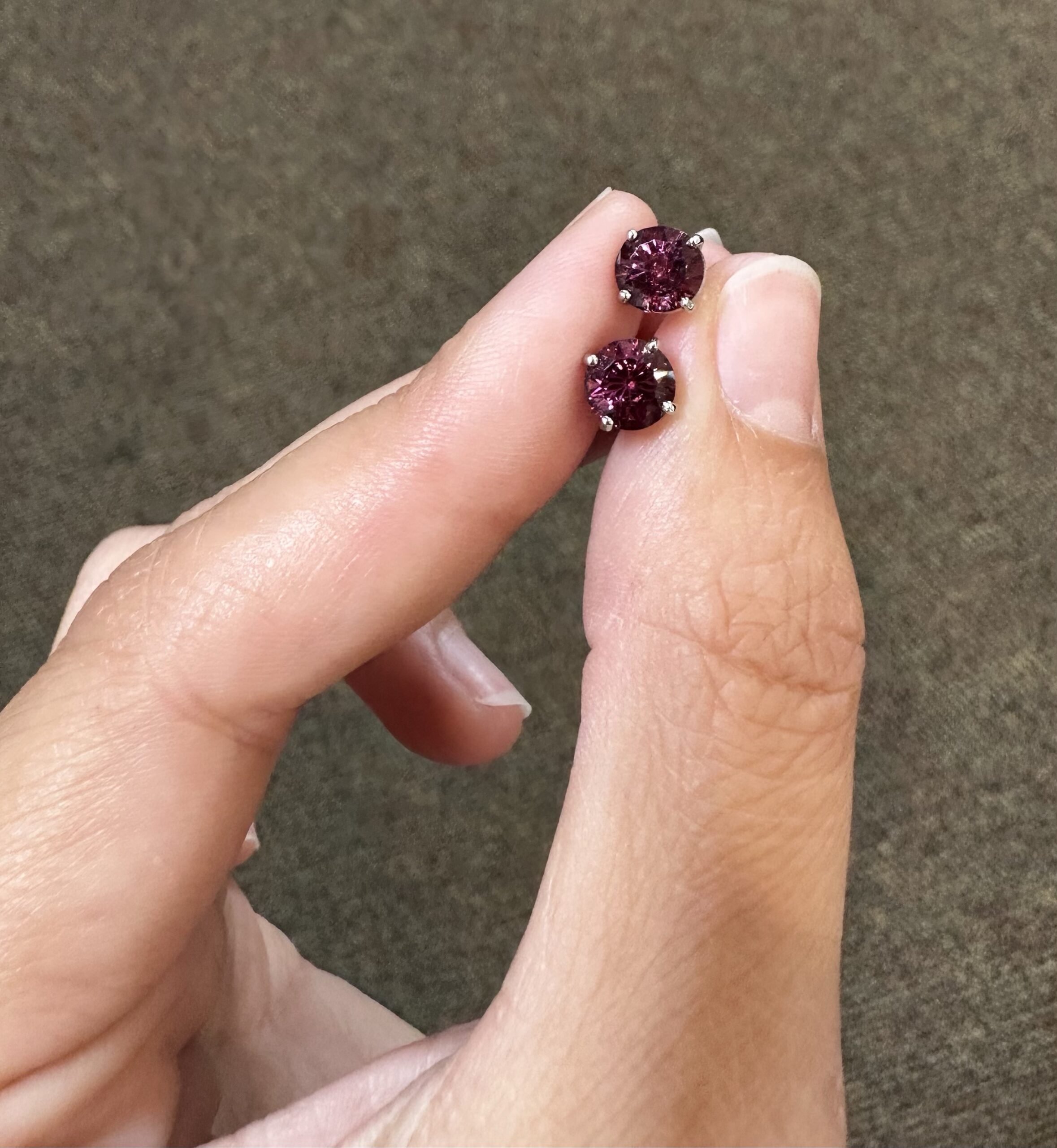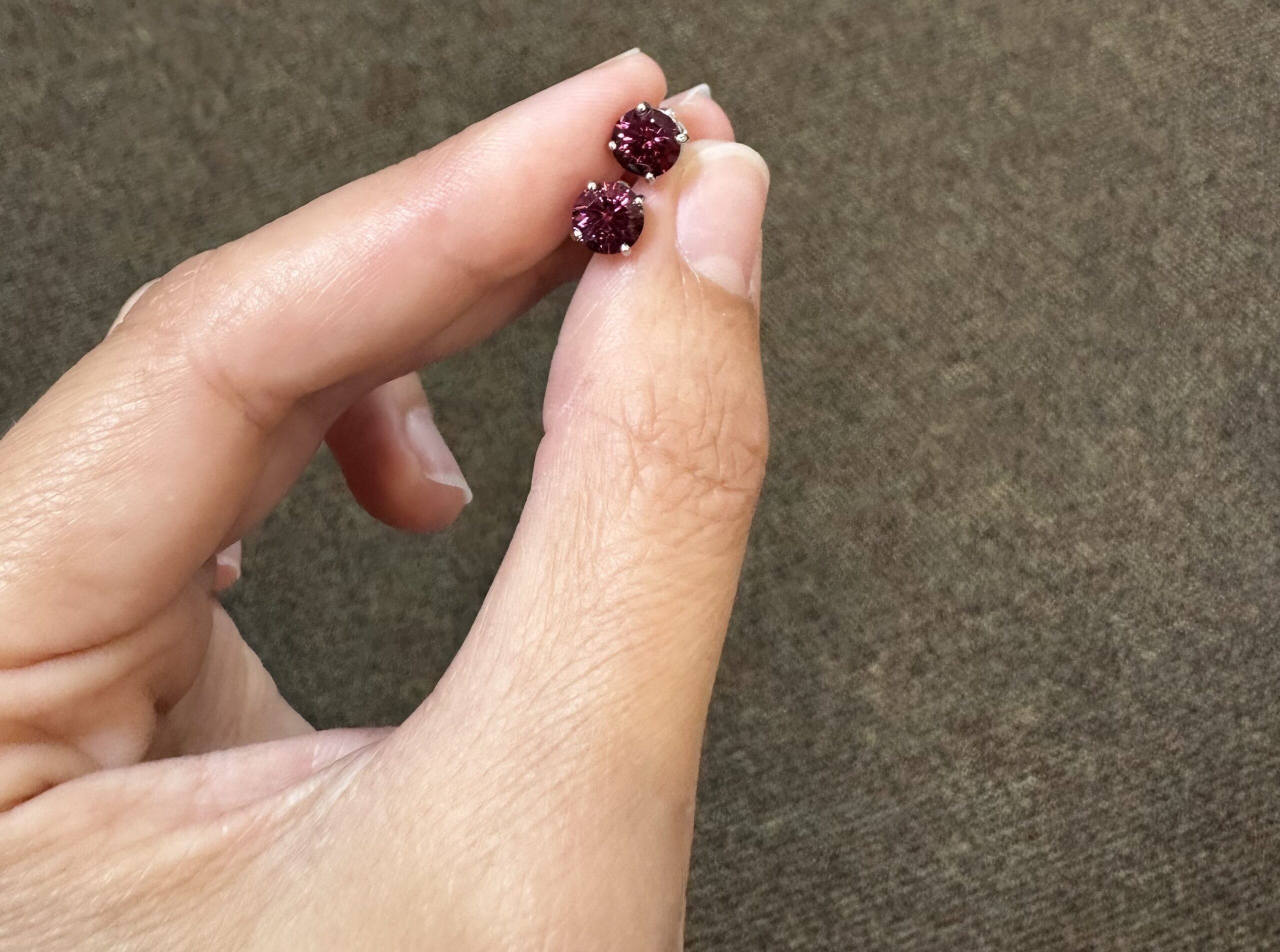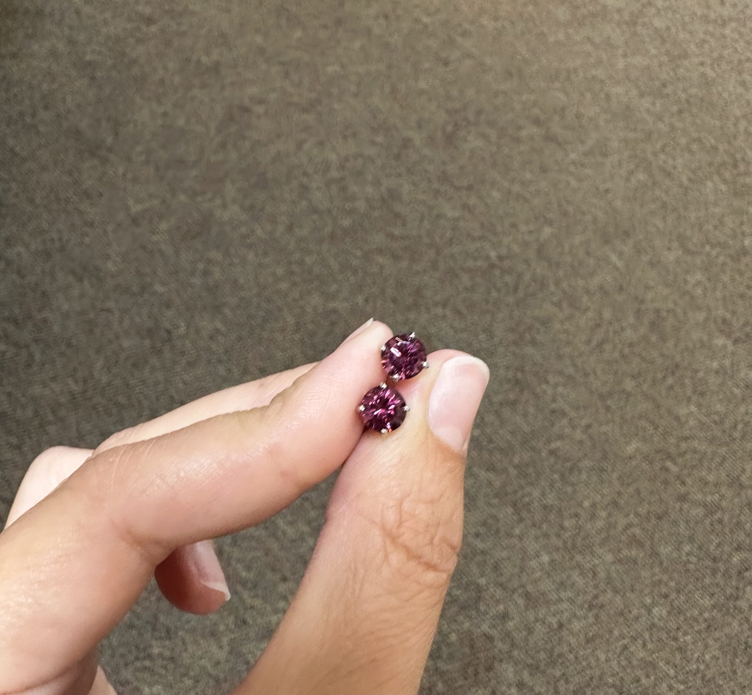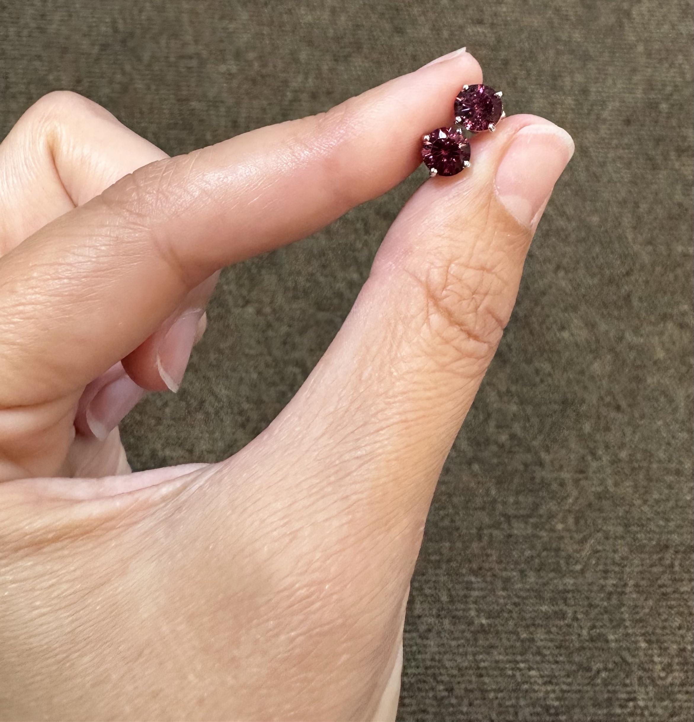 14k white gold round, faceted, basket set genuine 2.19 carat Rhodolite Garnet (January birthstone) stud earrings. These earrings have an entire weight of 1.5 grams.