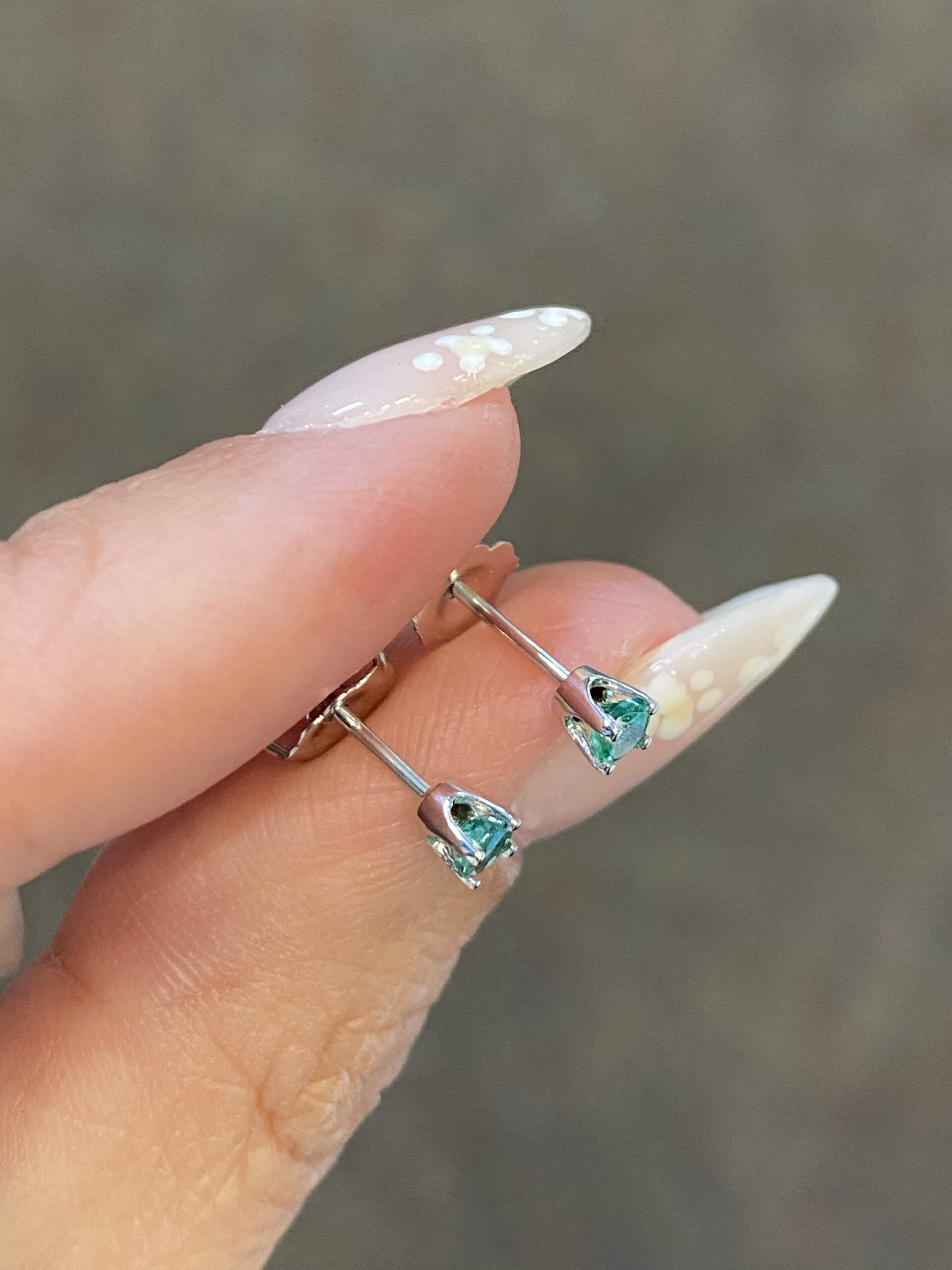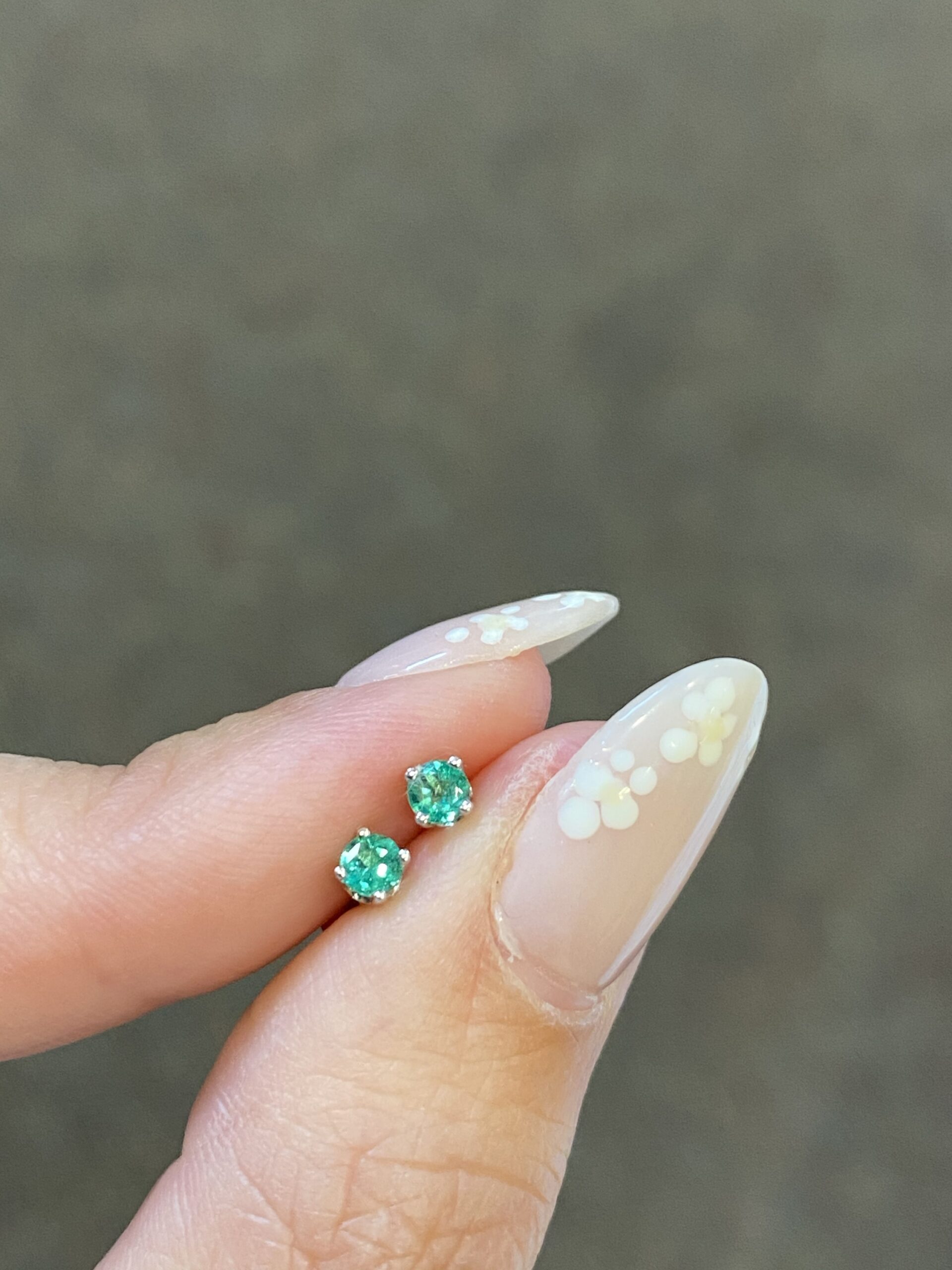 14k white gold genuine round 2.6 mm Emerald basket set stud earrings. These earrings have an entire weight of 0.6 grams.