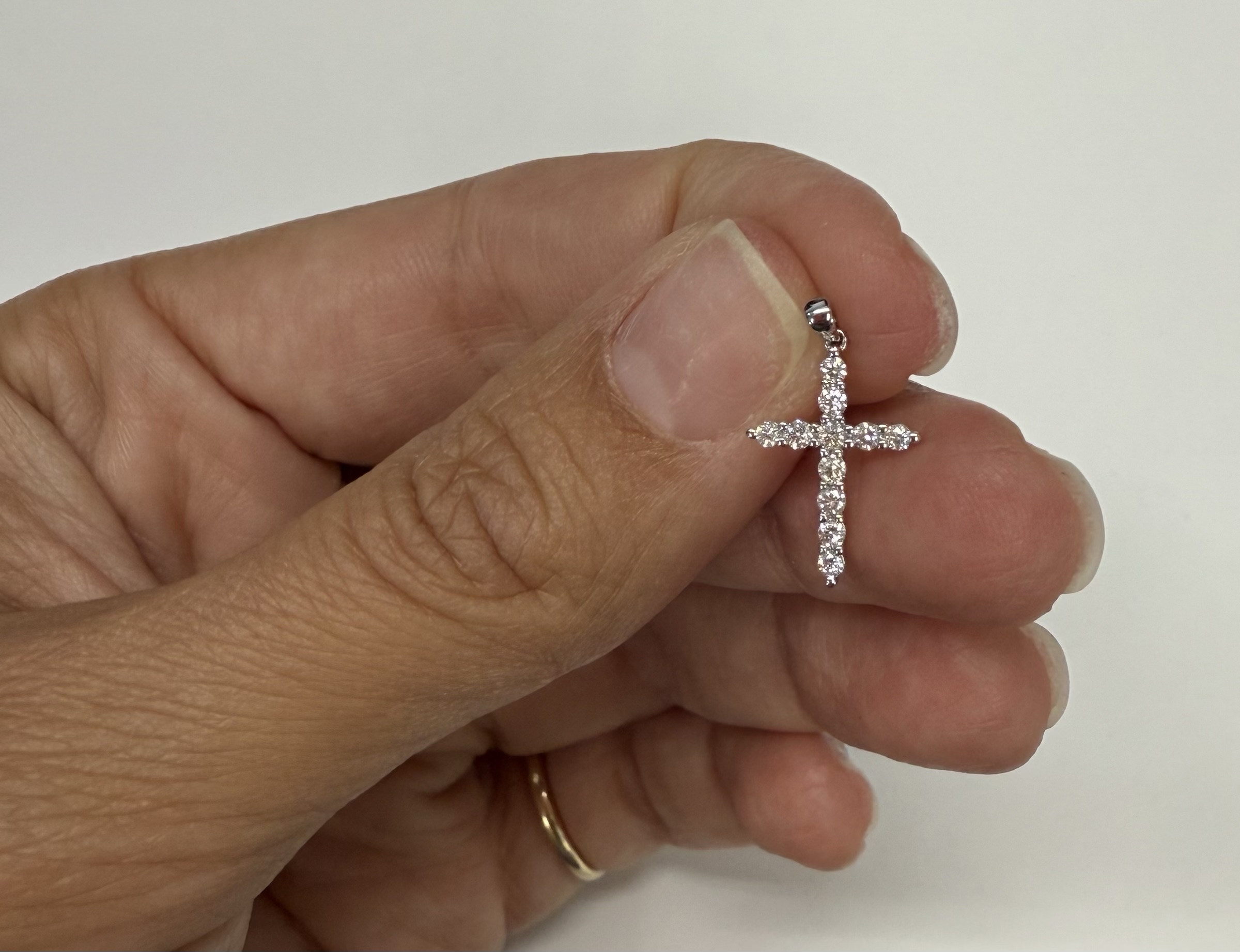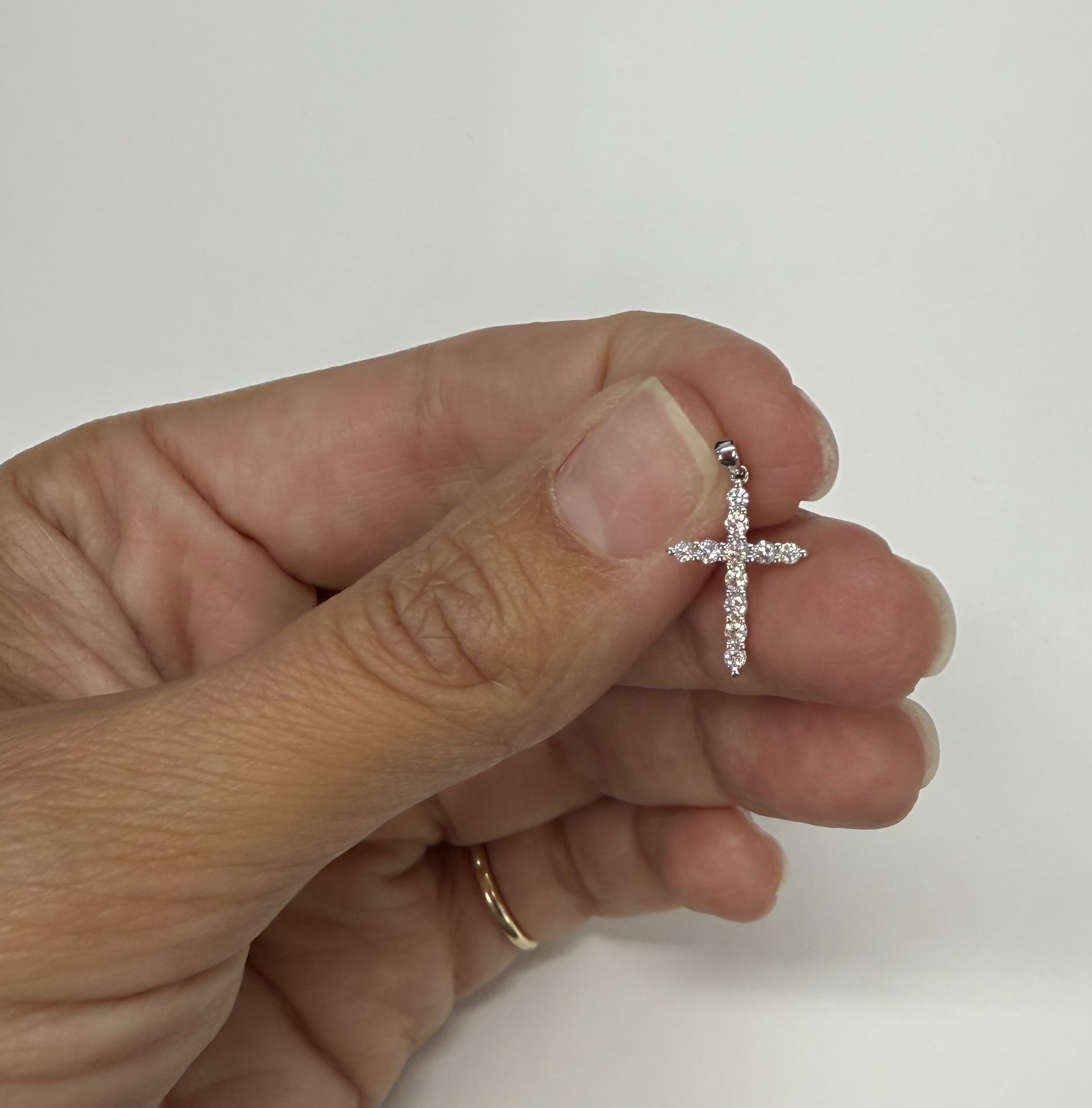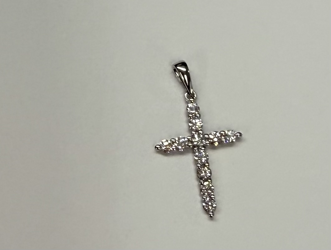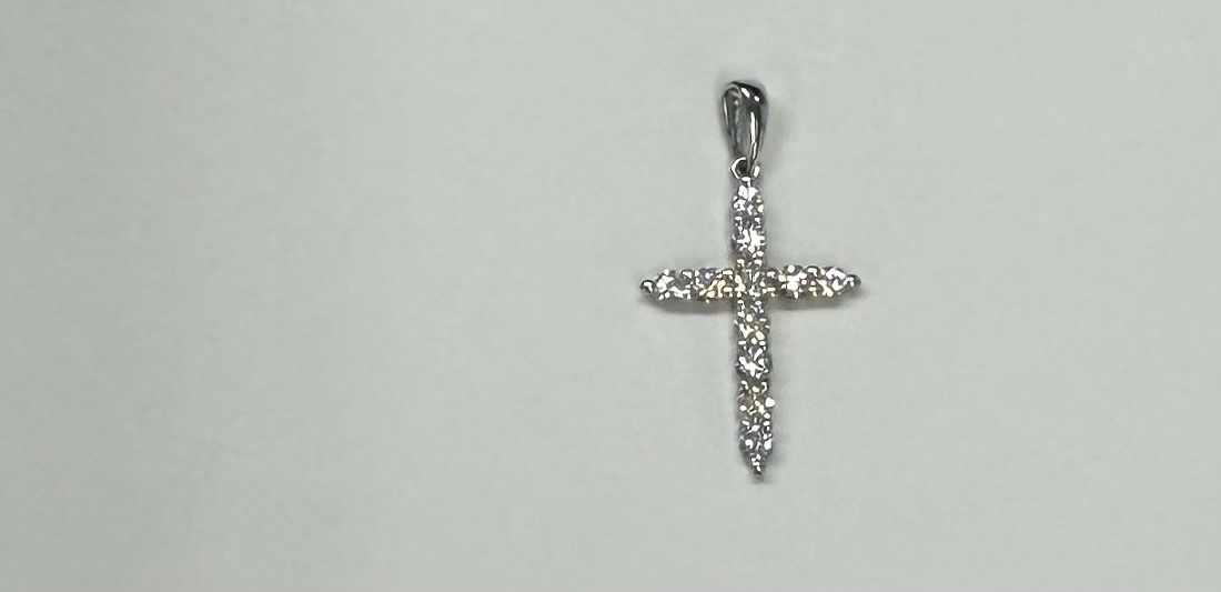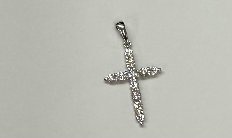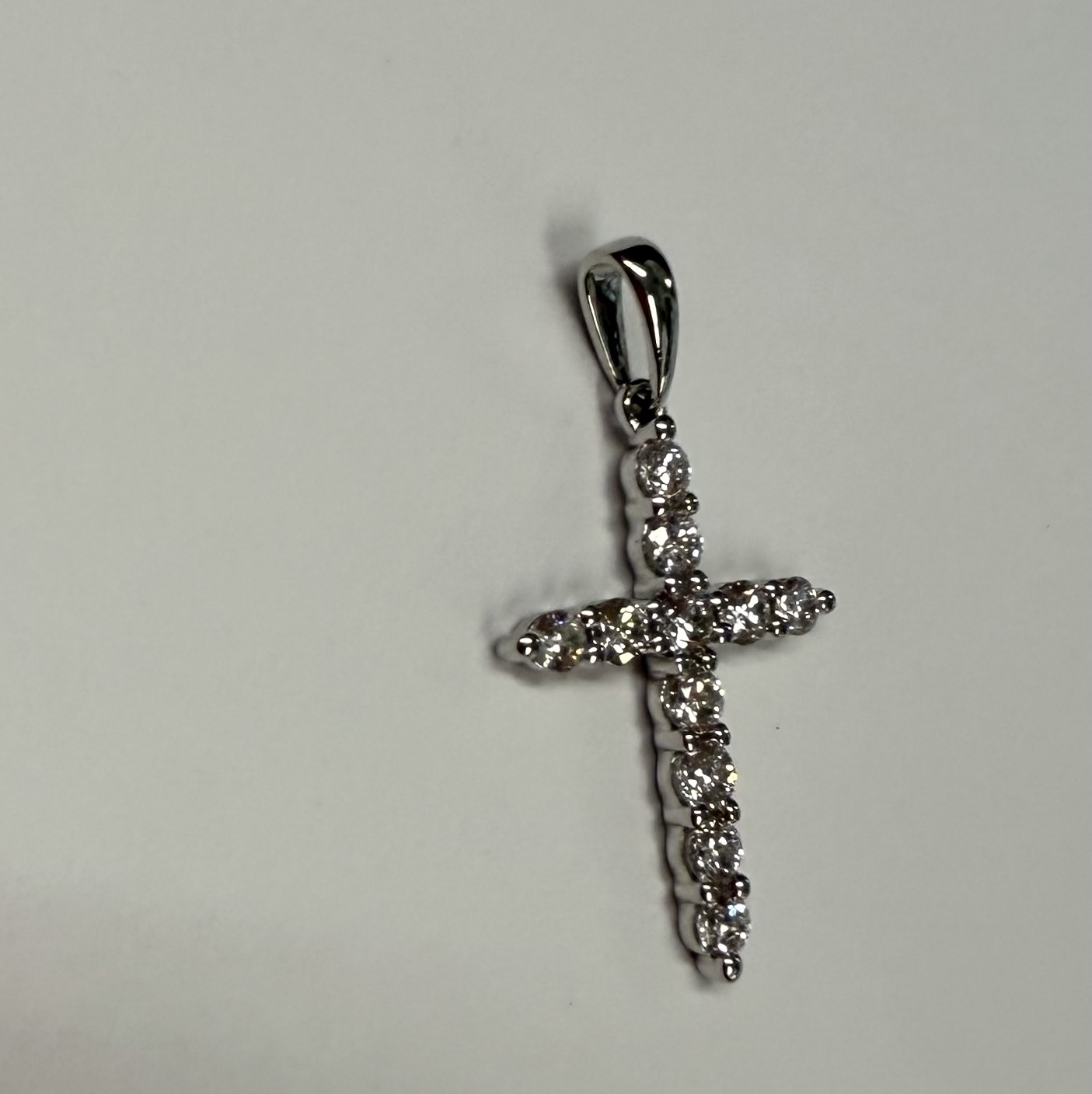 14k white gold genuine .20 cttw Round Brilliant Cut diamond cross. These diamonds average H-I in color and SI1-SI2 in clarity. This cross has an entire weight of 0.4 grams.