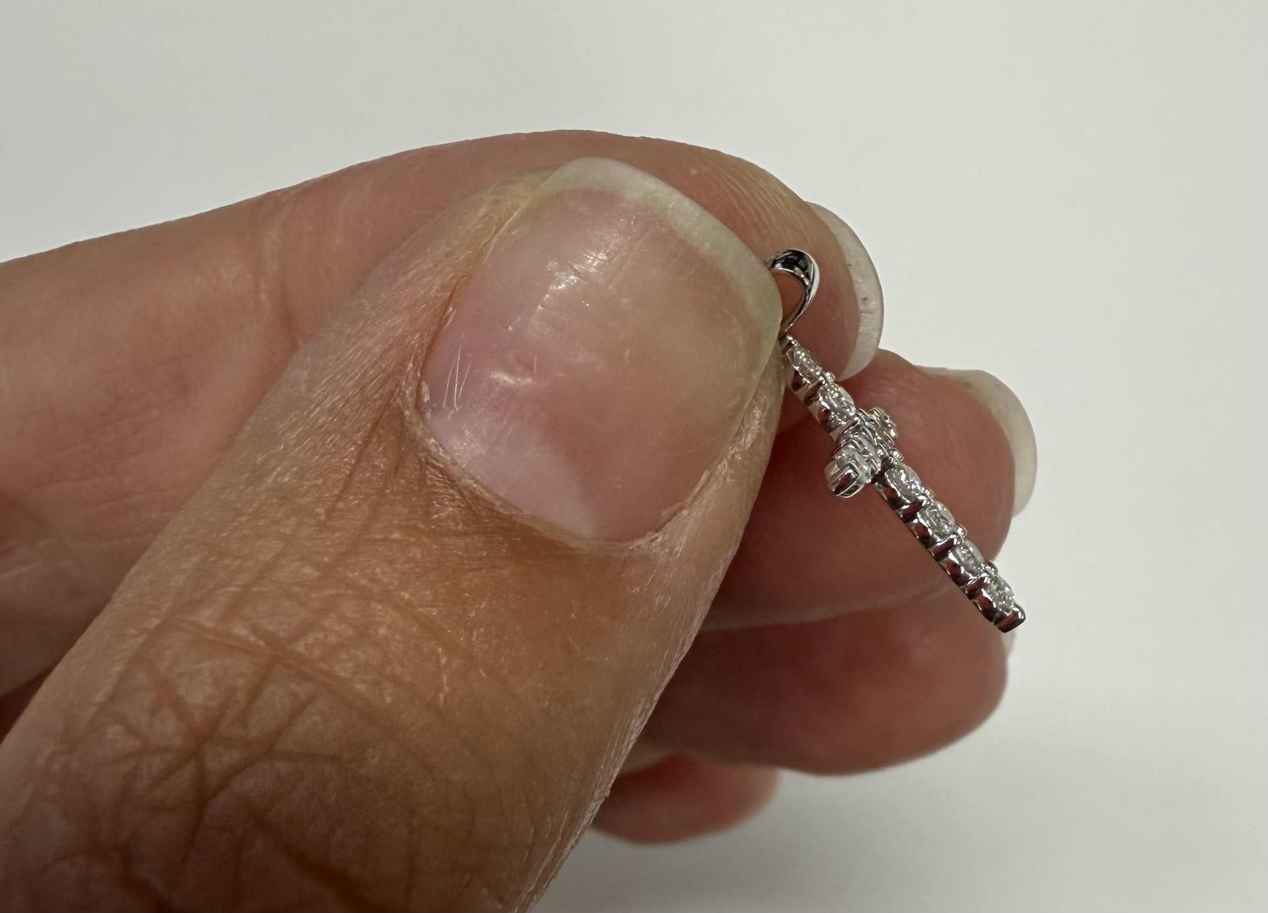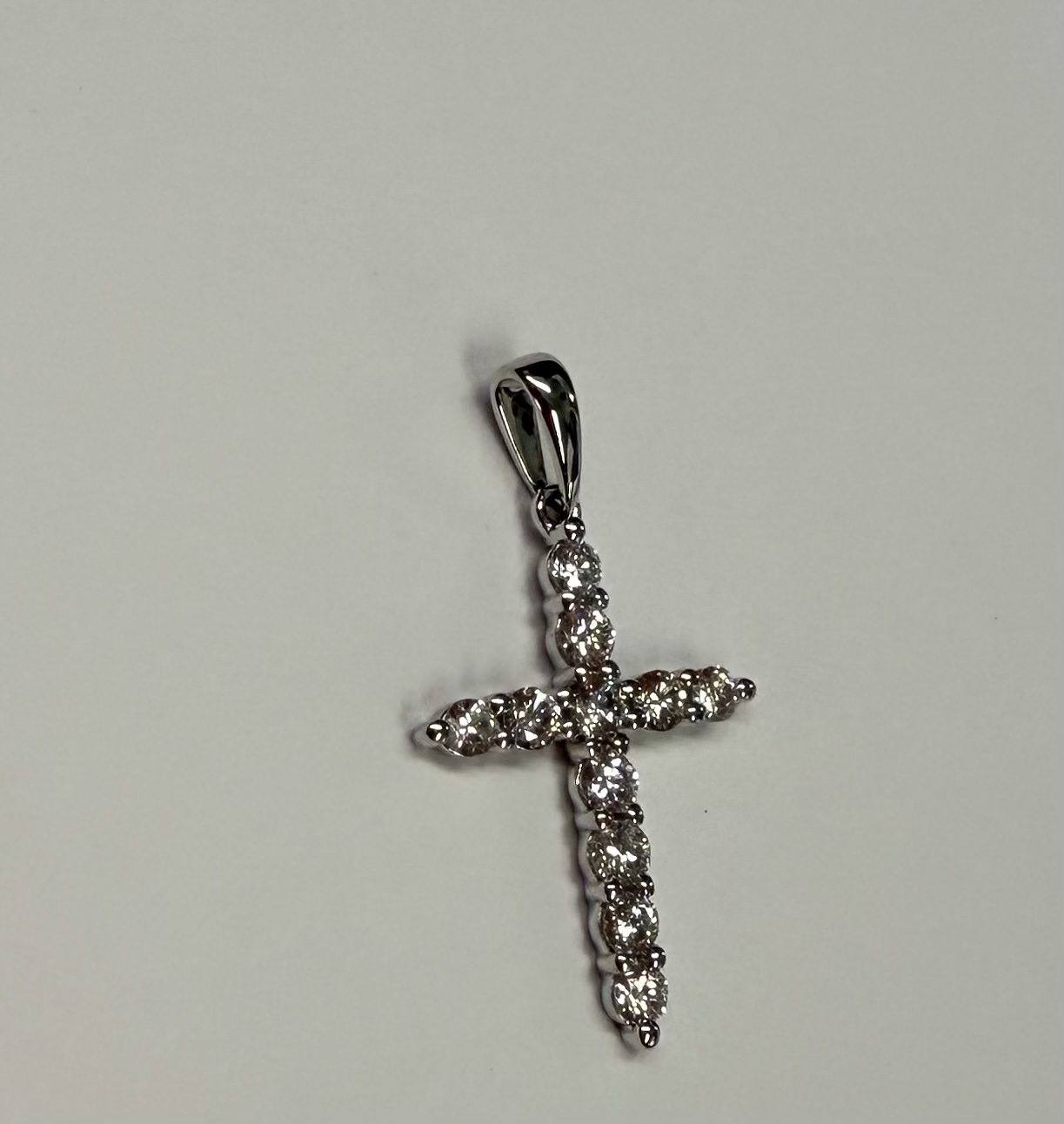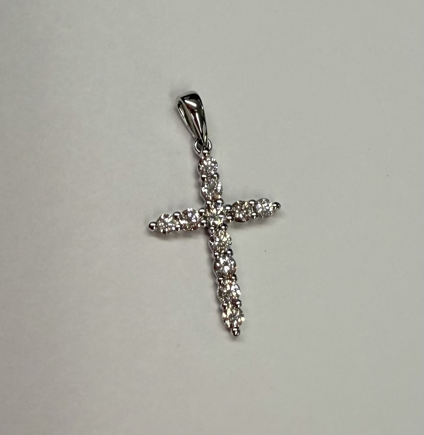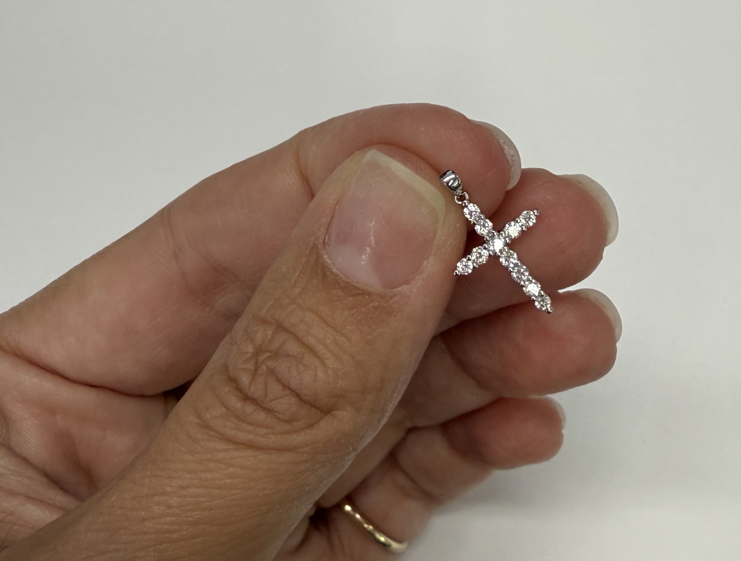 14k white gold genuine .20 cttw Round Brilliant Cut diamond cross. These diamonds average H-I in color and SI1-SI2 in clarity. This cross has an entire weight of 0.4 grams.