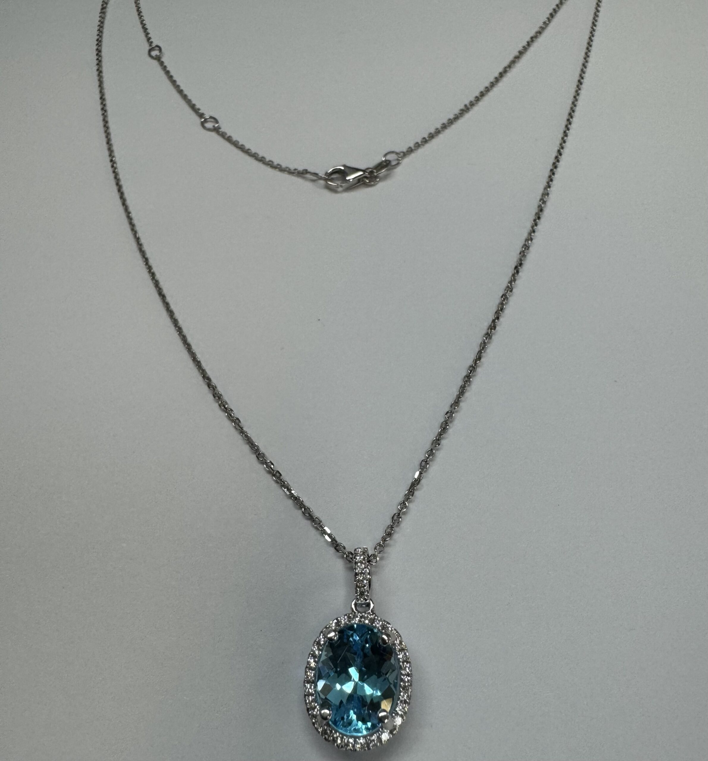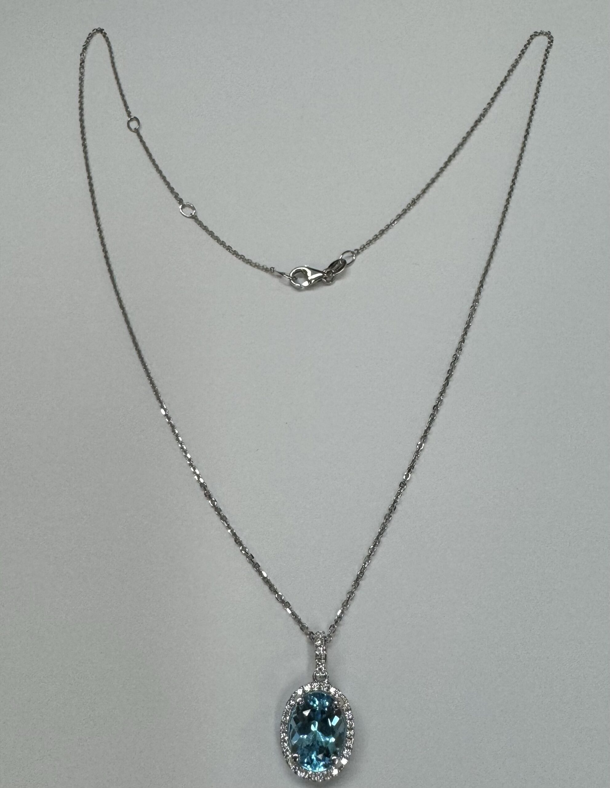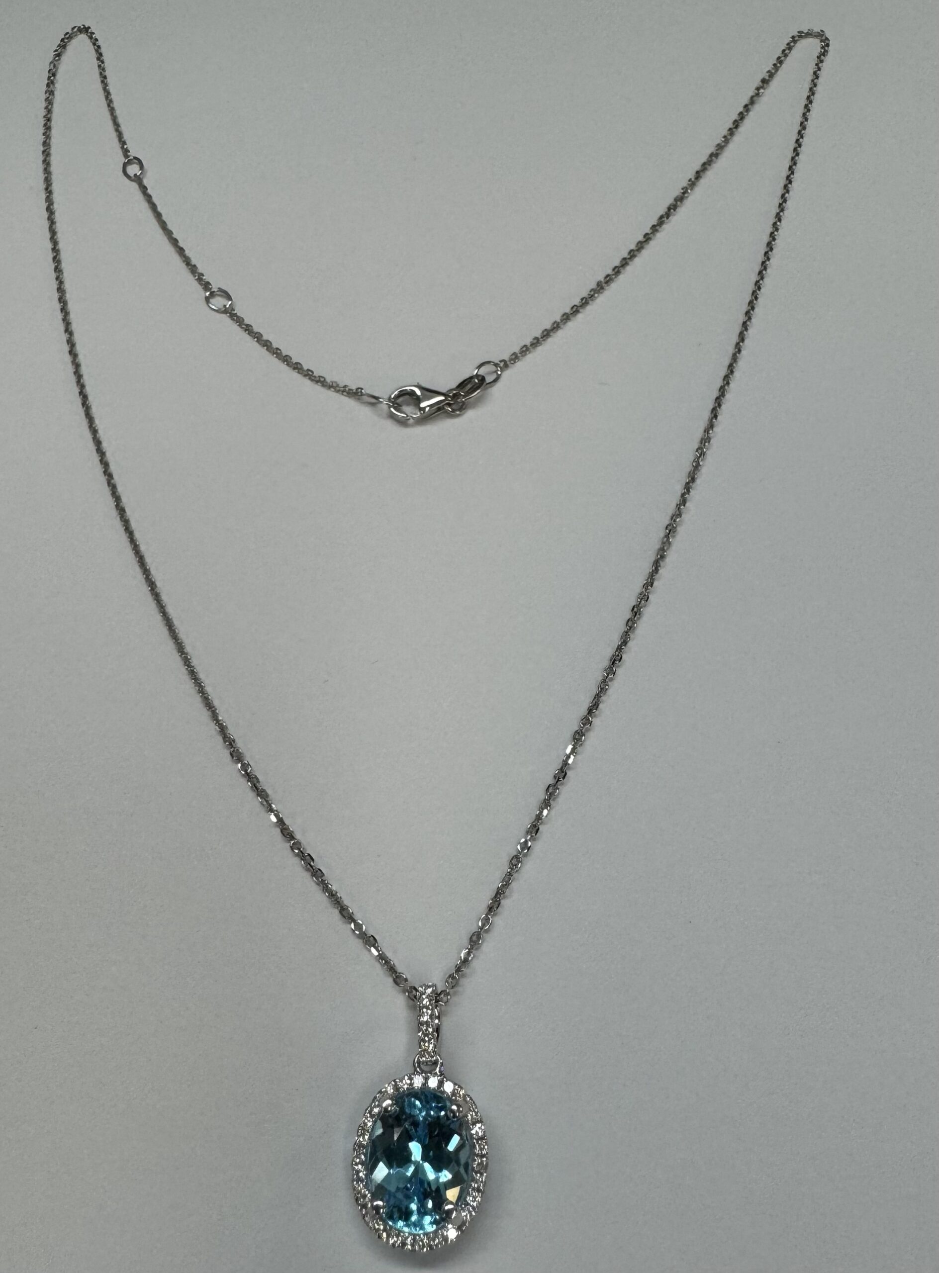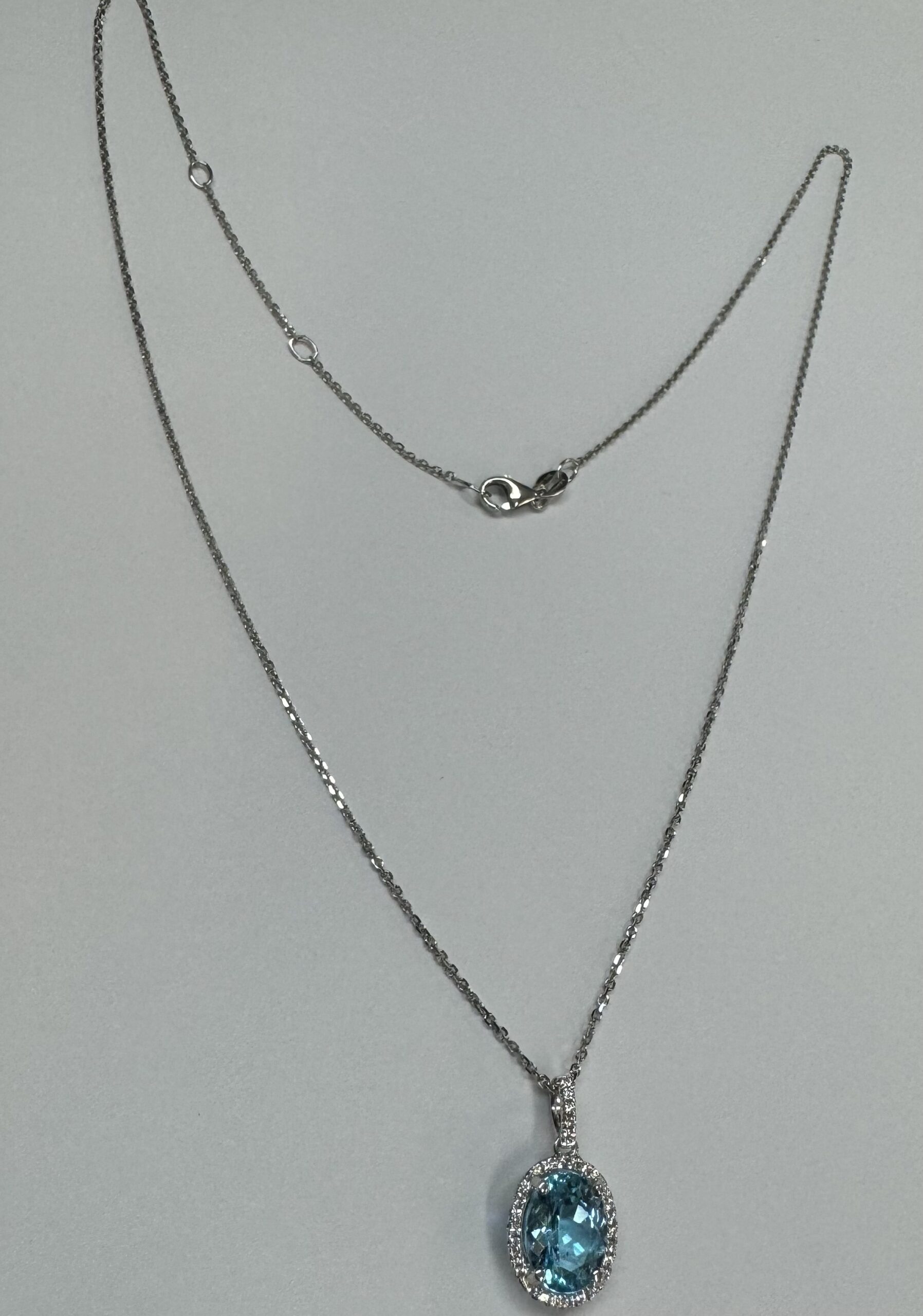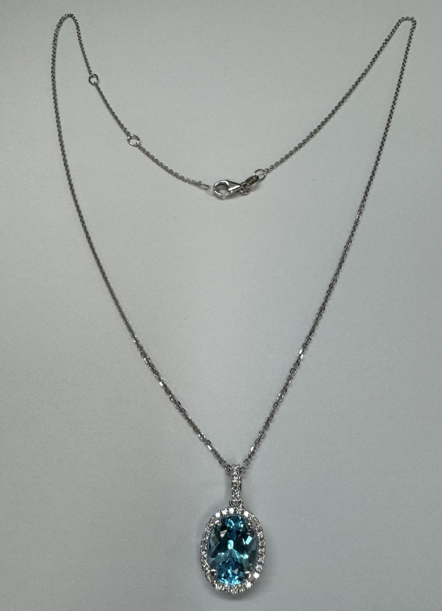 14k white gold oval shaped, faceted genuine 3.00 carat Blue Topaz and genuine .18 cttw Round Brilliant Cut diamond halo pendant. These diamonds average G-H in color and SI1 in clarity. This pendant is suspended from a 14k white gold forzantina chain with a lobster claw clasp, which is adjustable 16-17-18″. This piece has an entire weight of 3.3 grams.