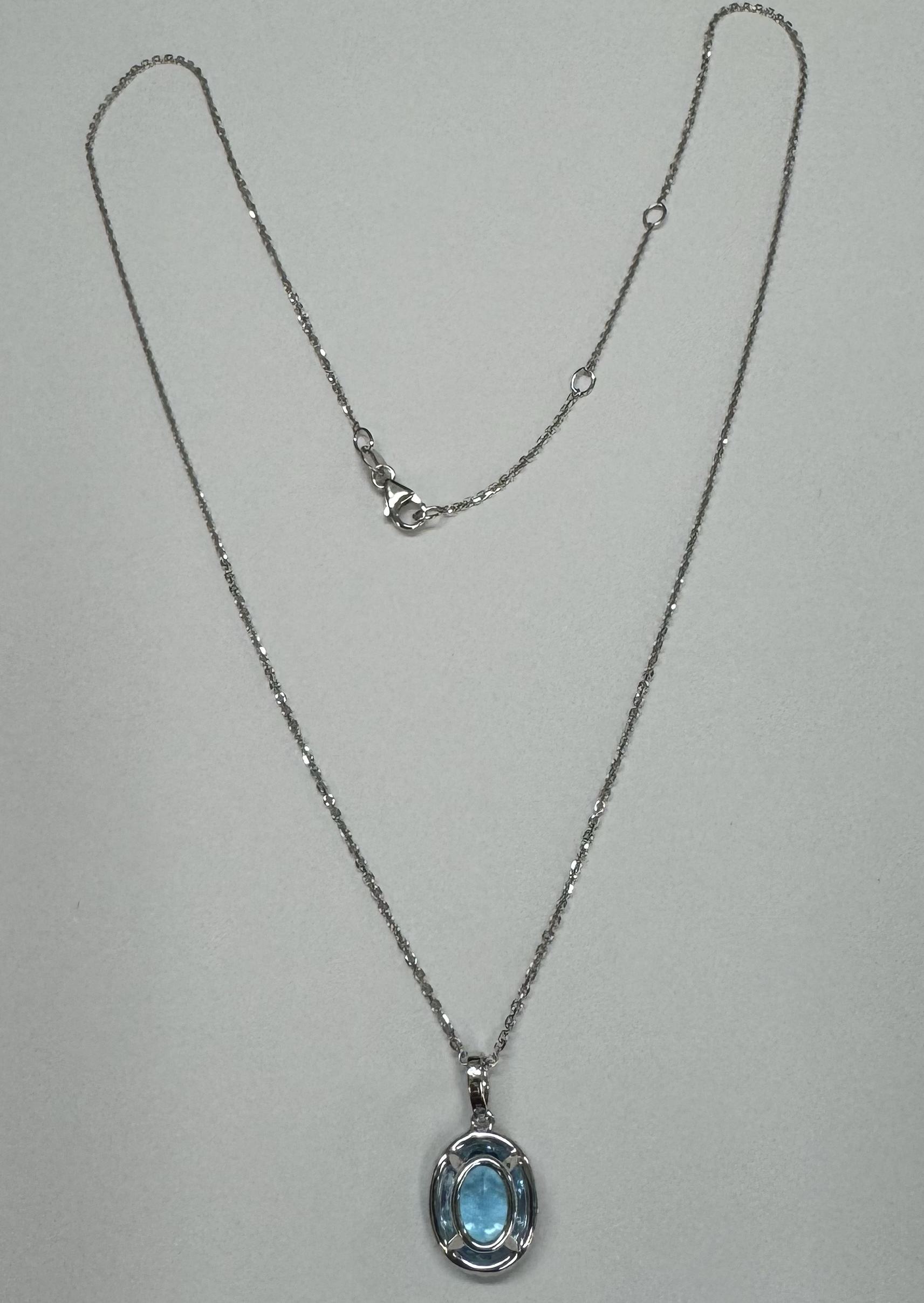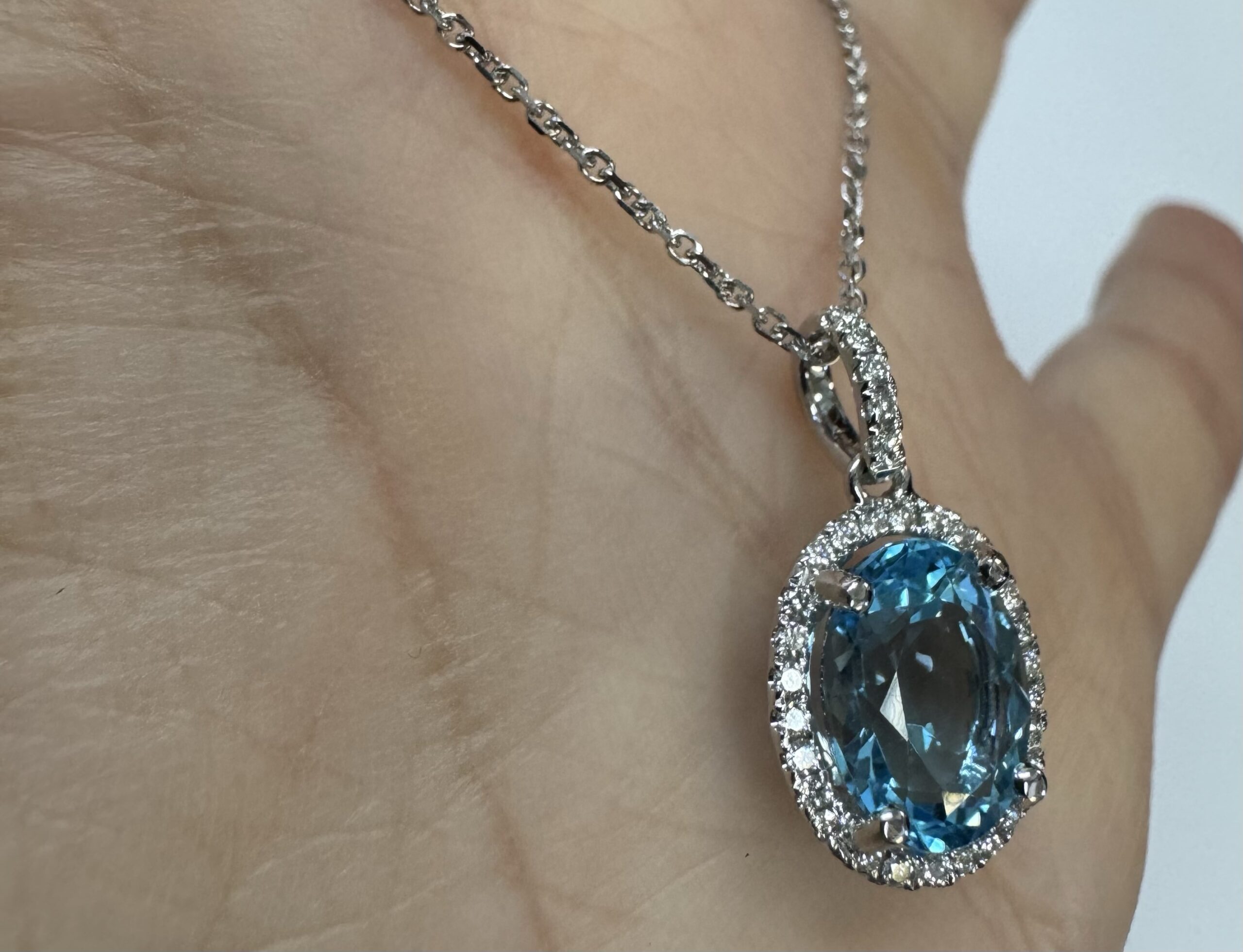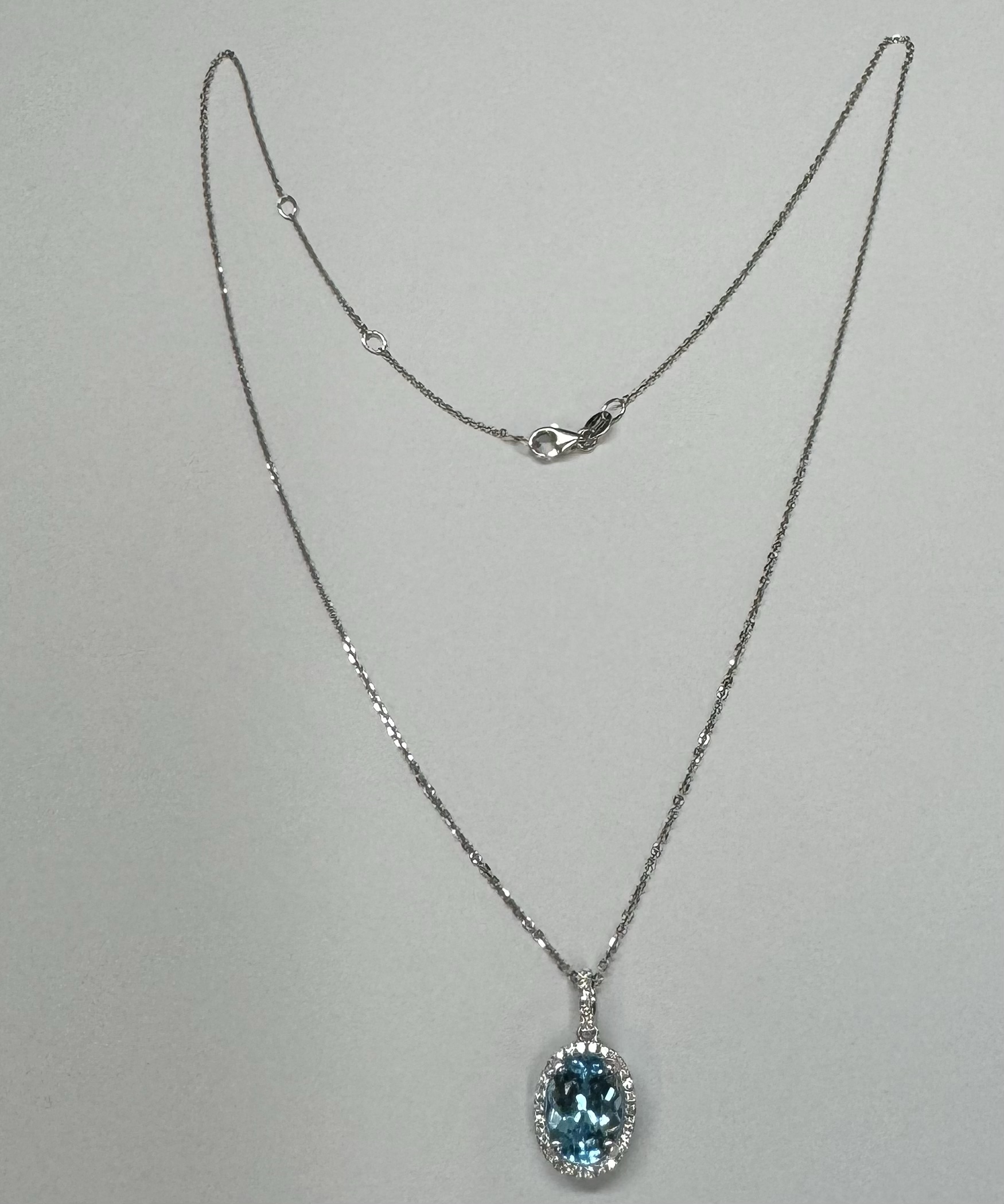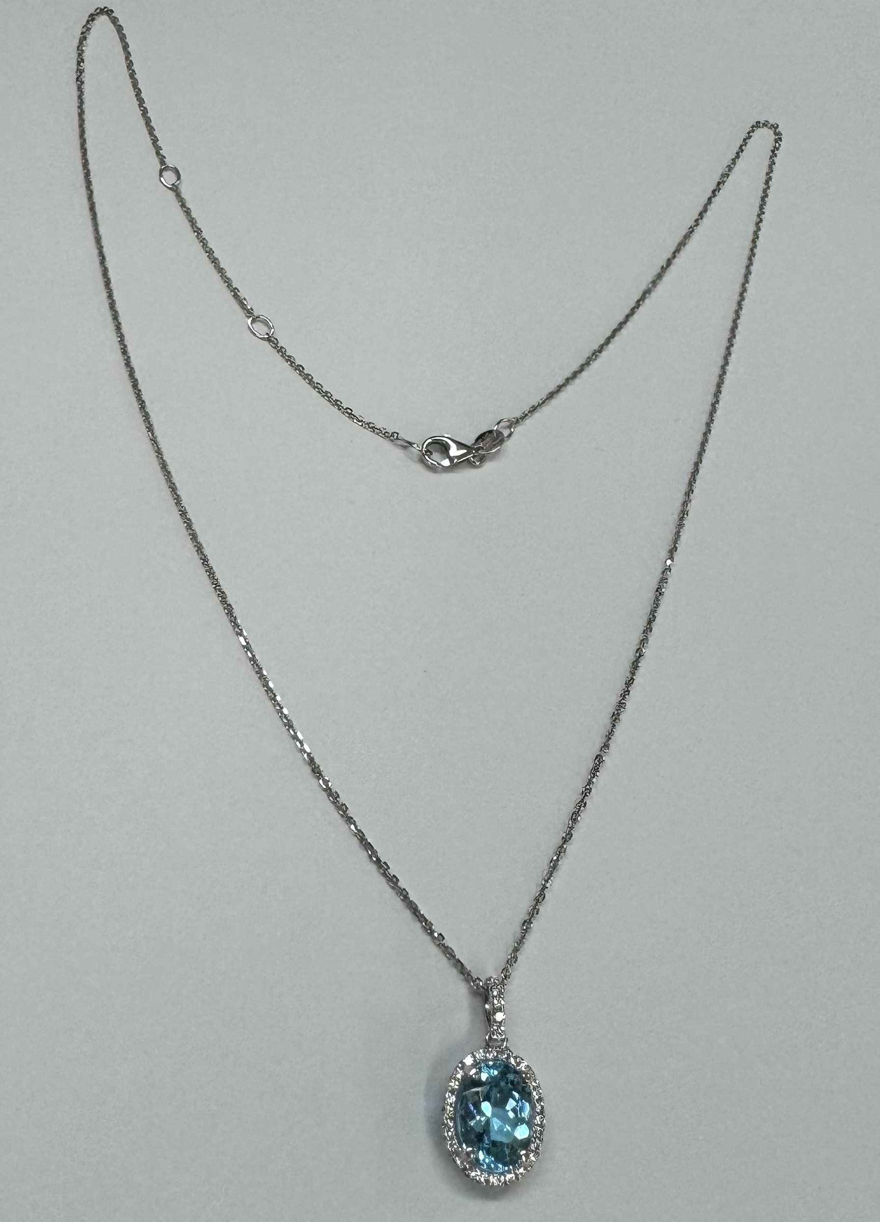 14k white gold oval shaped, faceted genuine 3.00 carat Blue Topaz and genuine .18 cttw Round Brilliant Cut diamond halo pendant. These diamonds average G-H in color and SI1 in clarity. This pendant is suspended from a 14k white gold forzantina chain with a lobster claw clasp, which is adjustable 16-17-18″. This piece has an entire weight of 3.3 grams.