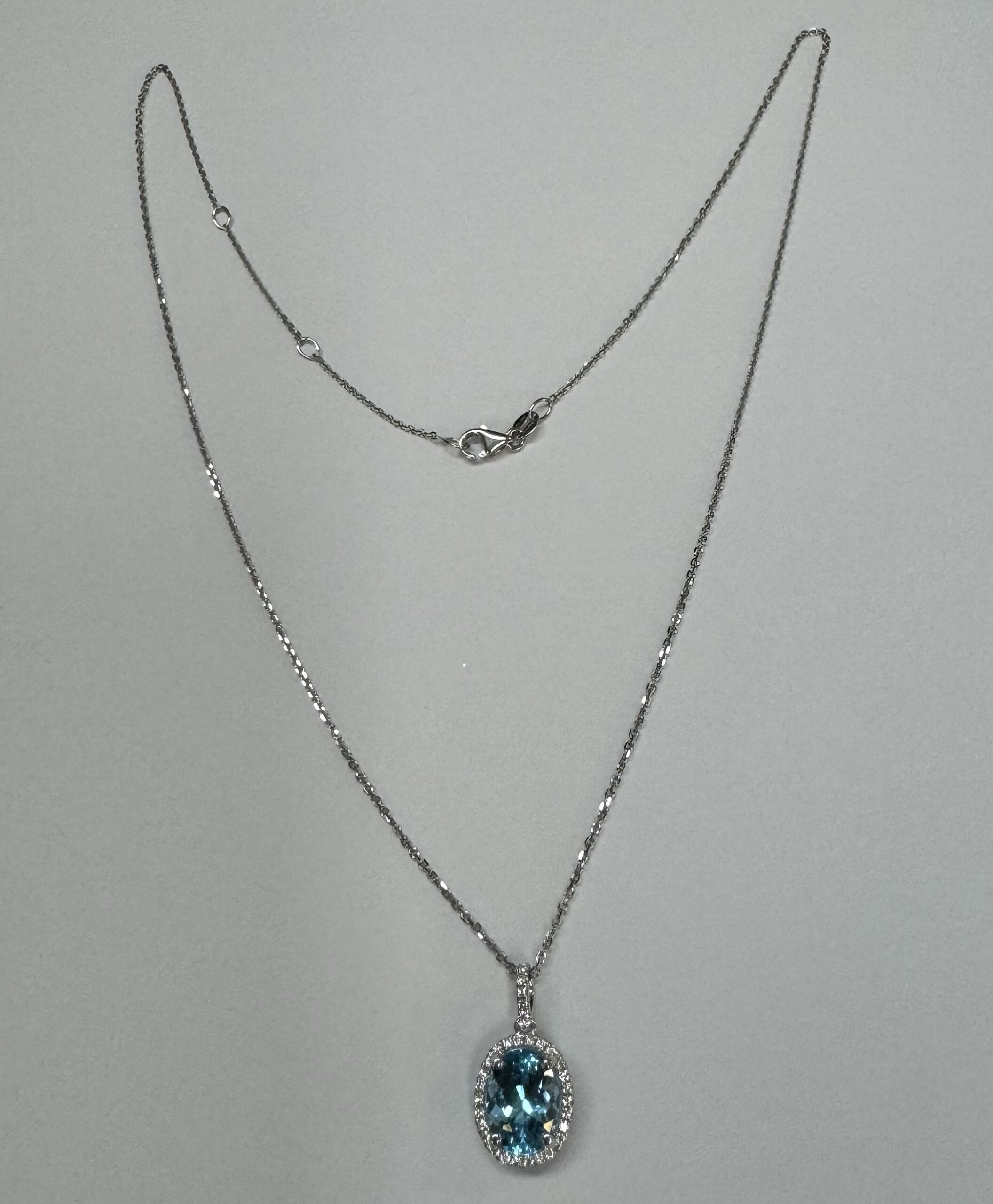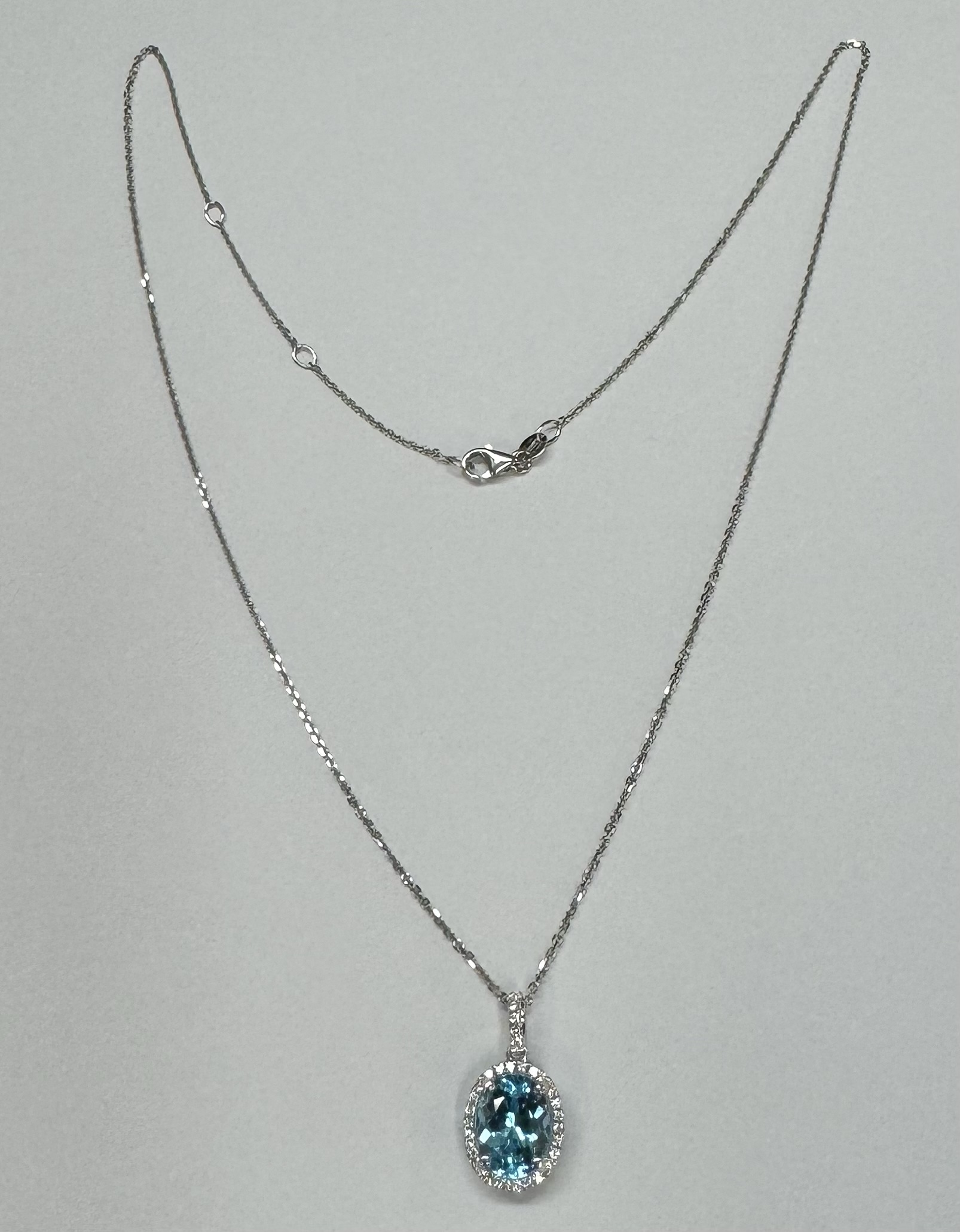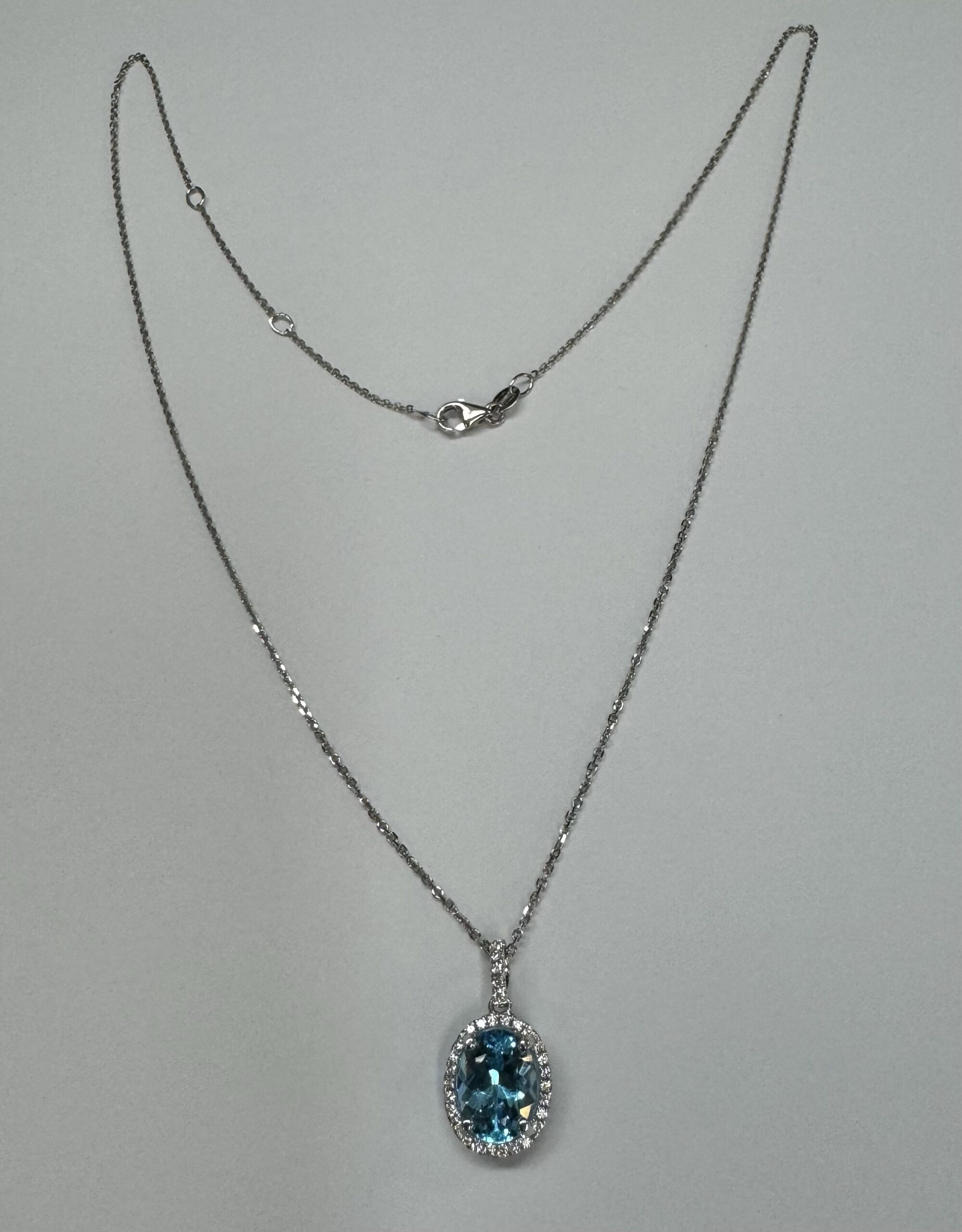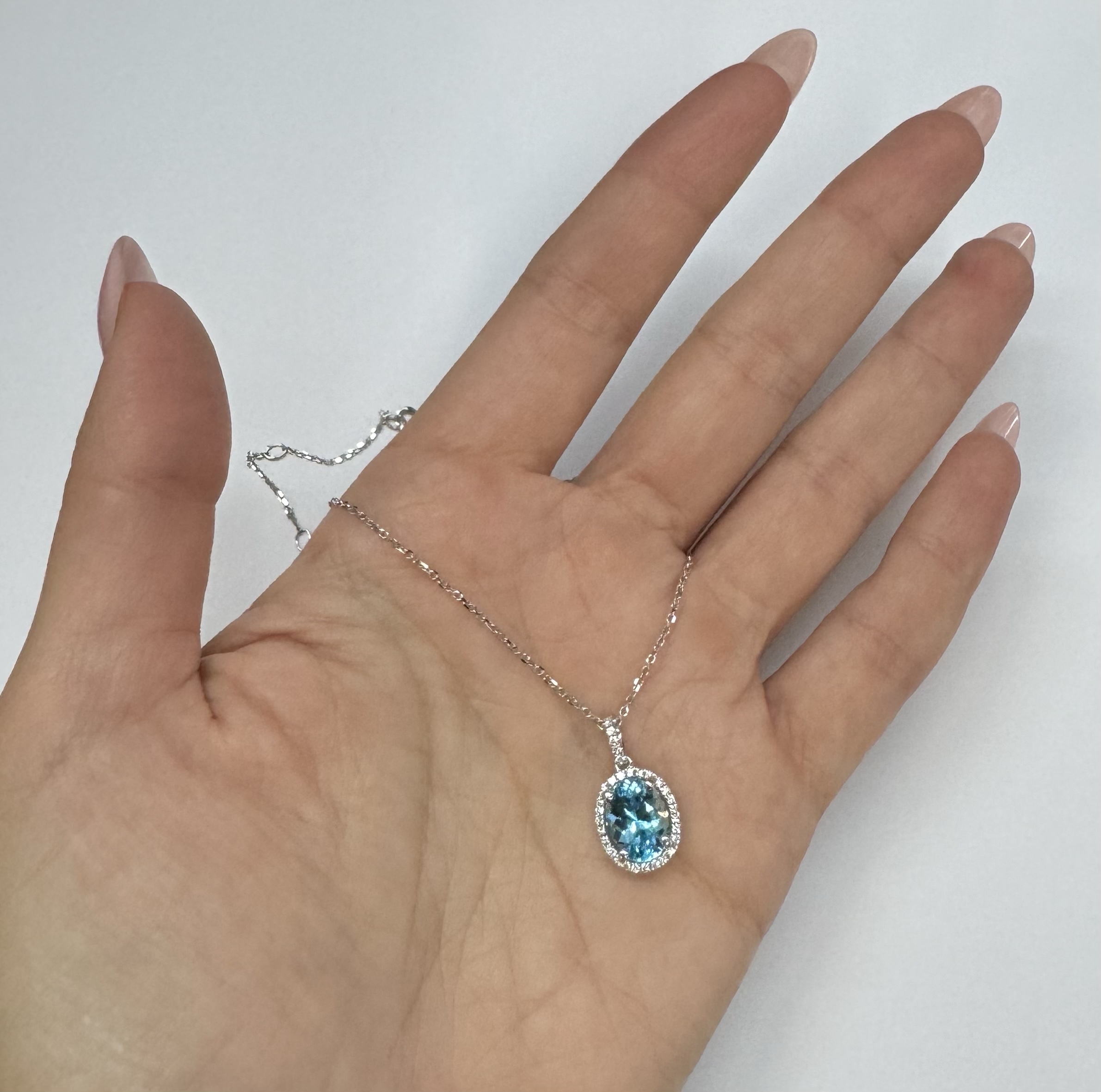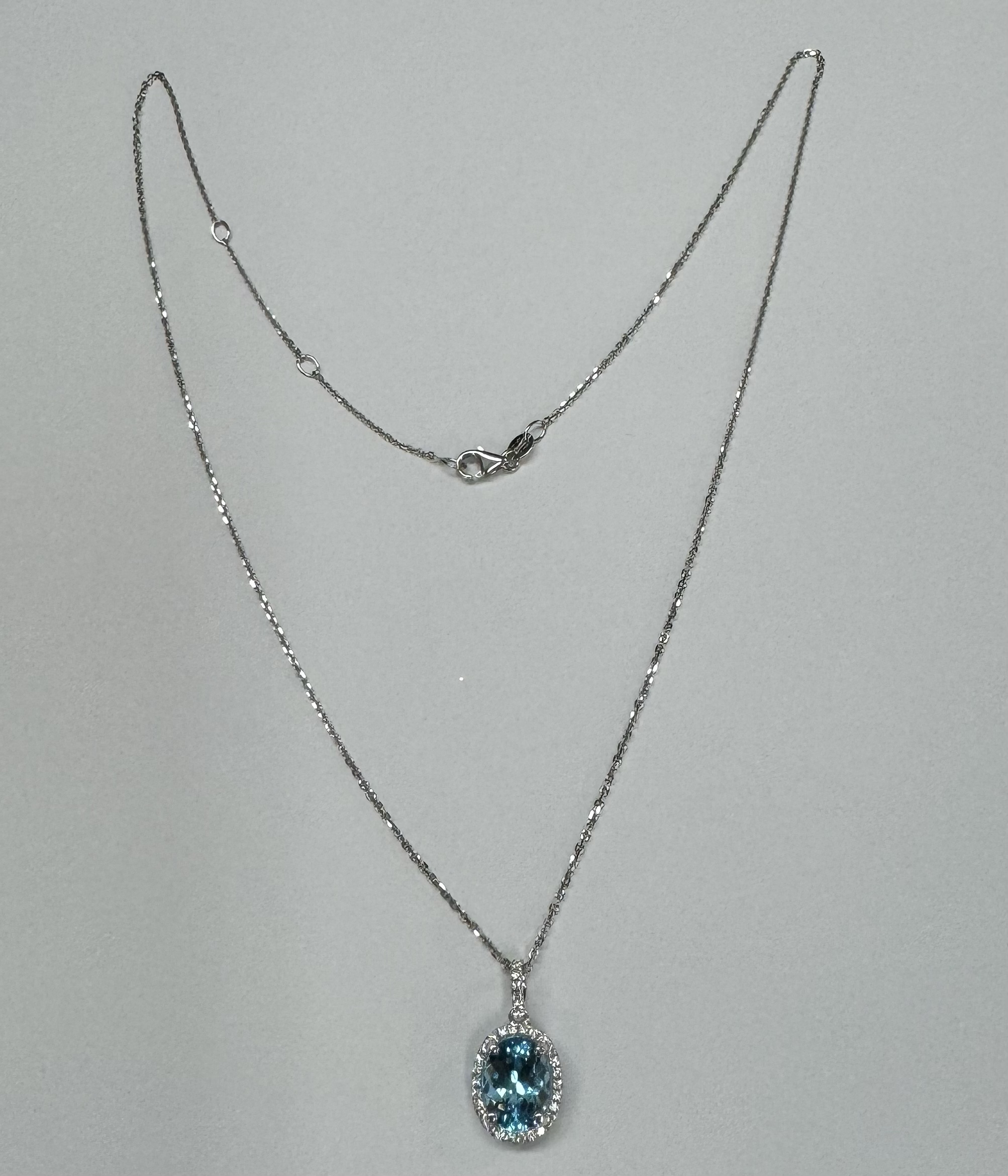 14k white gold oval shaped, faceted genuine 3.00 carat Blue Topaz and genuine .18 cttw Round Brilliant Cut diamond halo pendant. These diamonds average G-H in color and SI1 in clarity. This pendant is suspended from a 14k white gold forzantina chain with a lobster claw clasp, which is adjustable 16-17-18″. This piece has an entire weight of 3.3 grams.