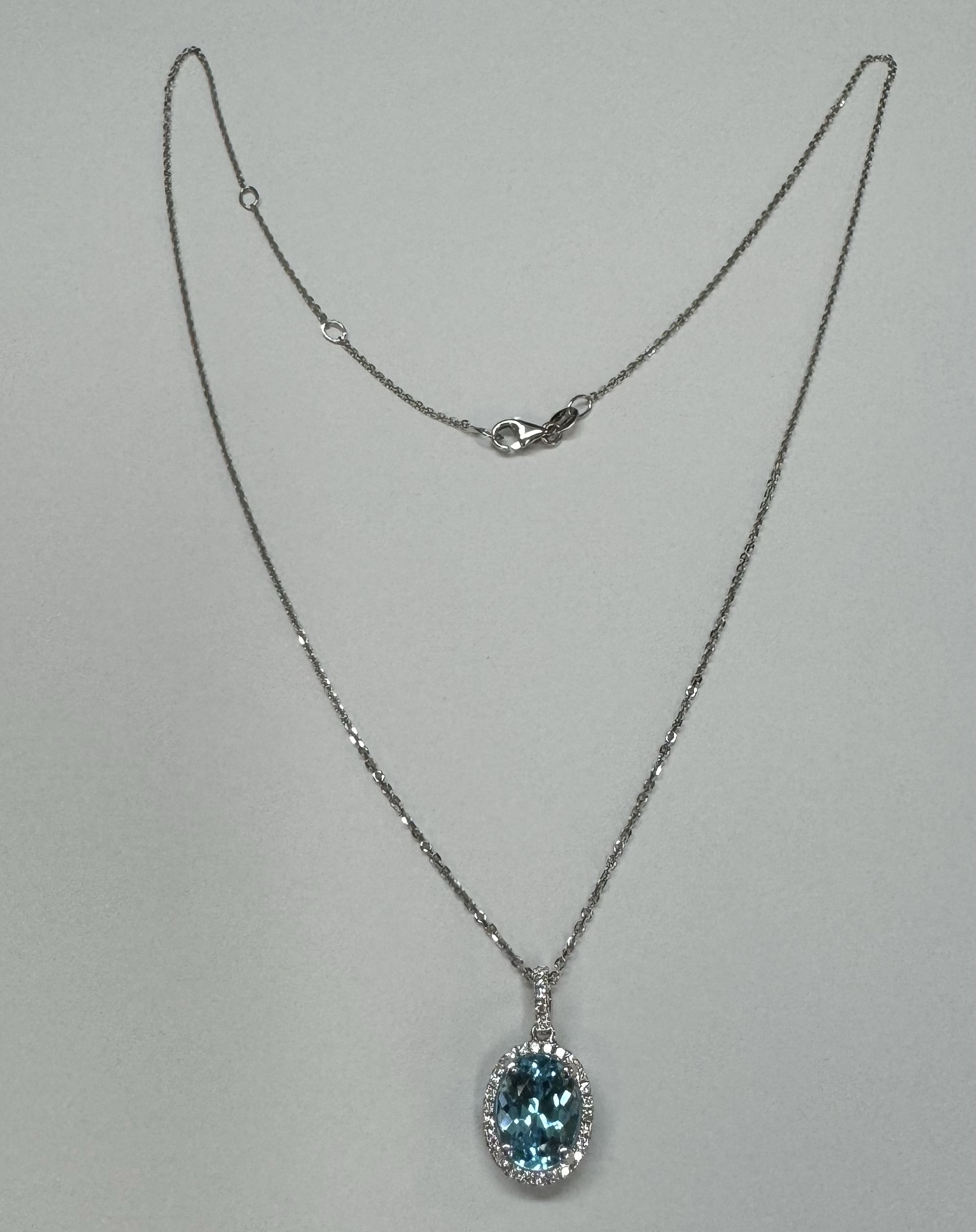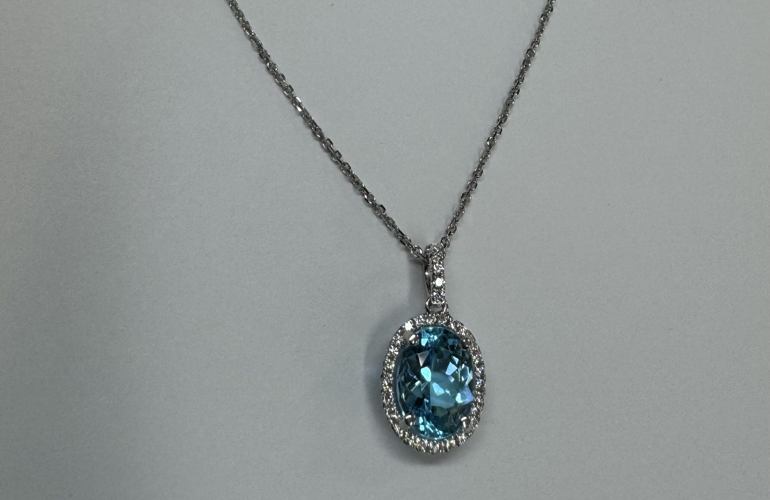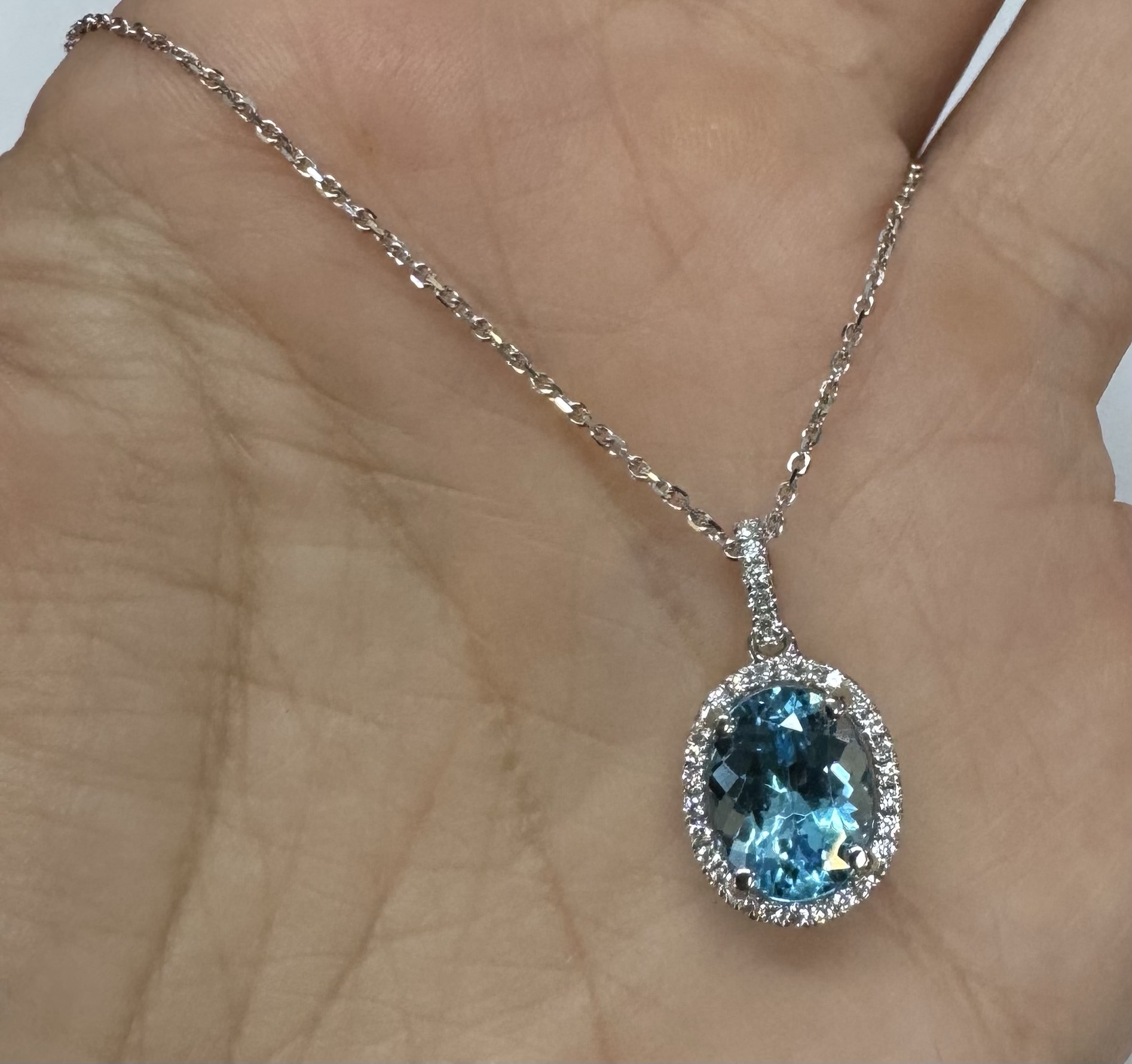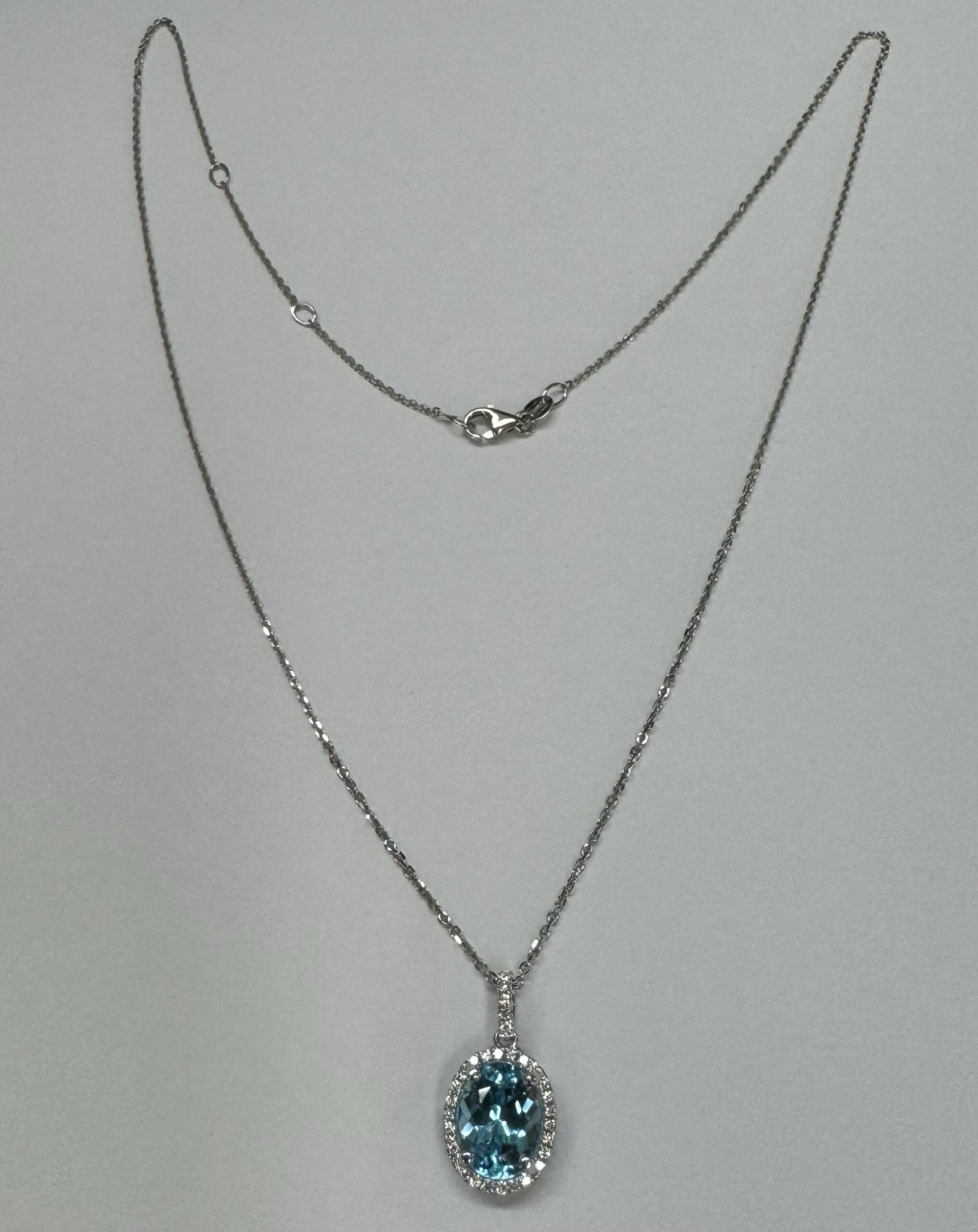 14k white gold oval shaped, faceted genuine 3.00 carat Blue Topaz and genuine .18 cttw Round Brilliant Cut diamond halo pendant. These diamonds average G-H in color and SI1 in clarity. This pendant is suspended from a 14k white gold forzantina chain with a lobster claw clasp, which is adjustable 16-17-18″. This piece has an entire weight of 3.3 grams.