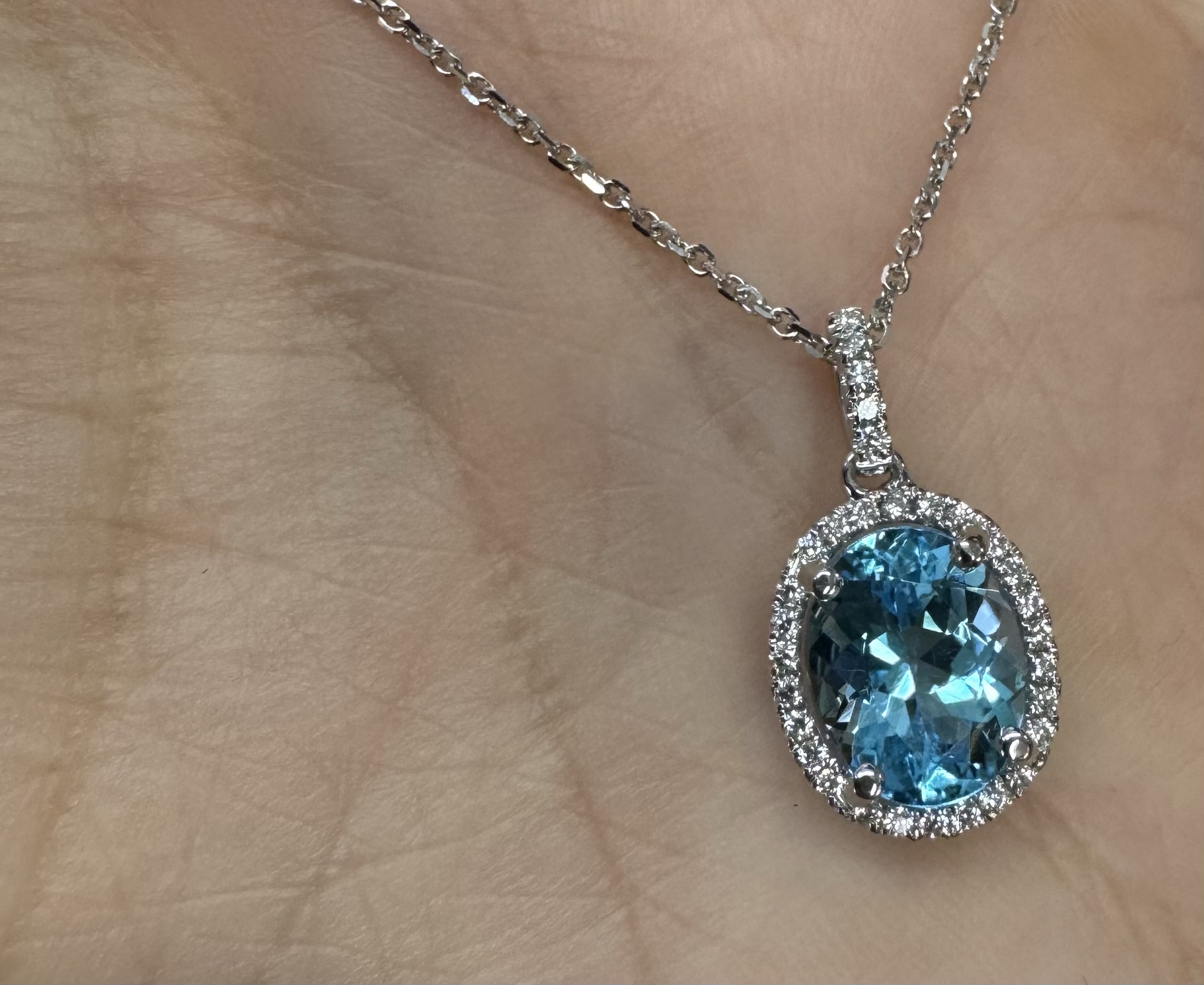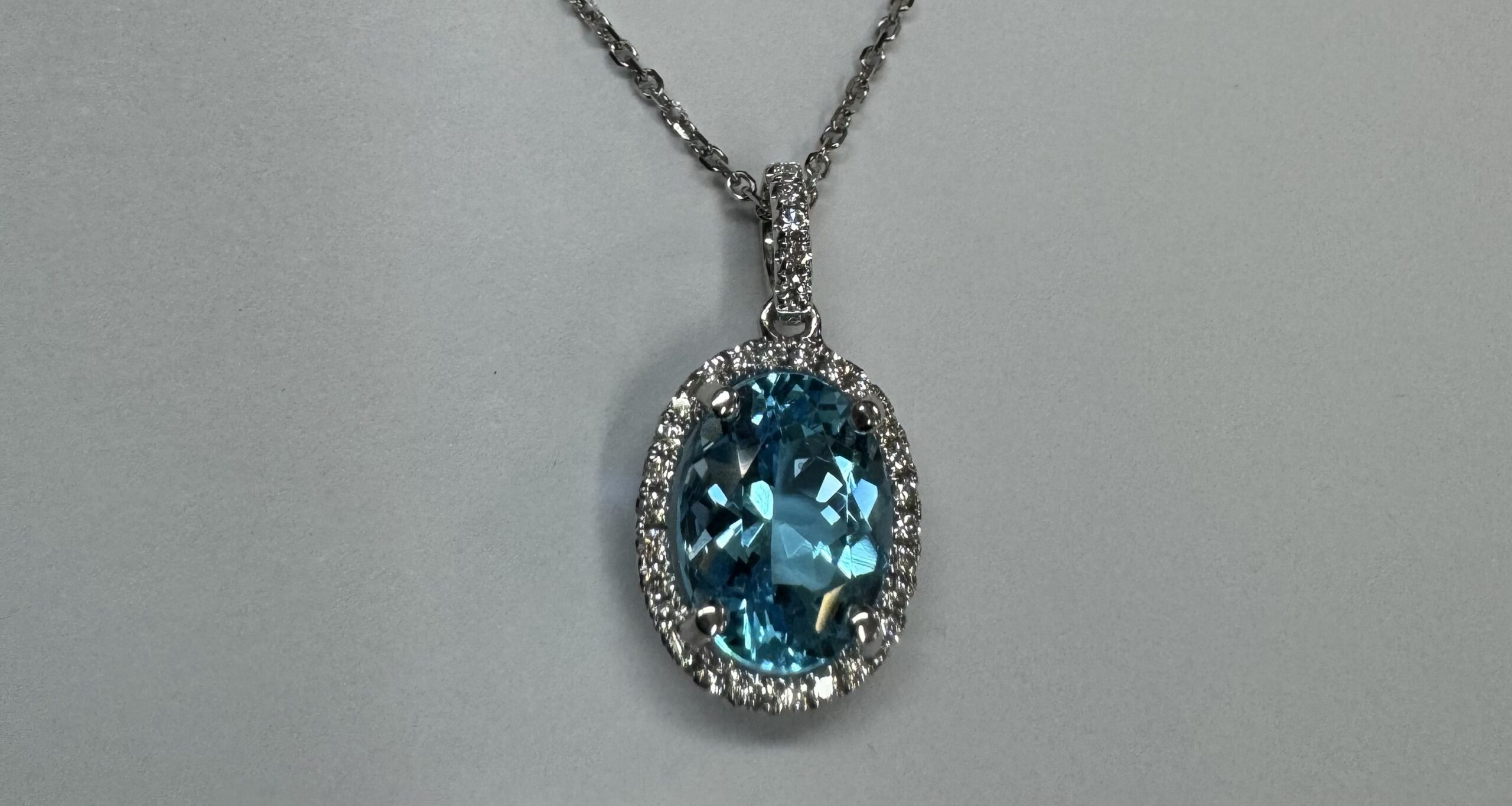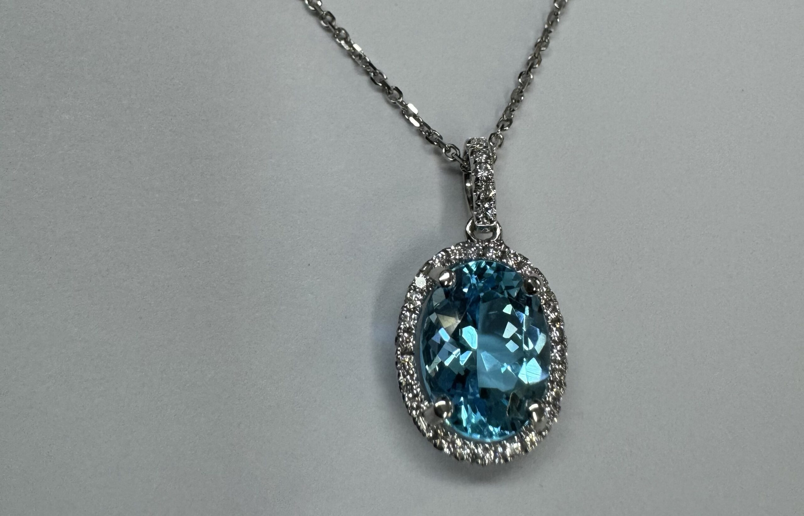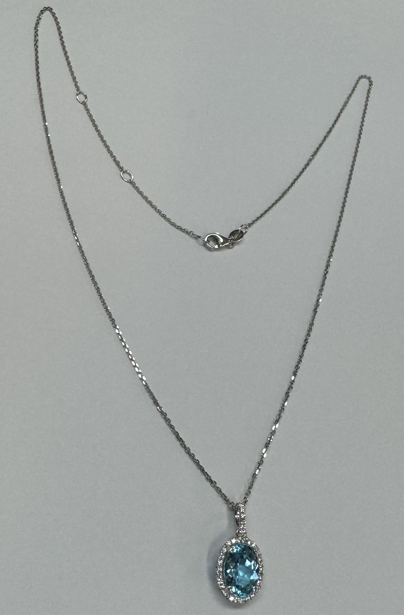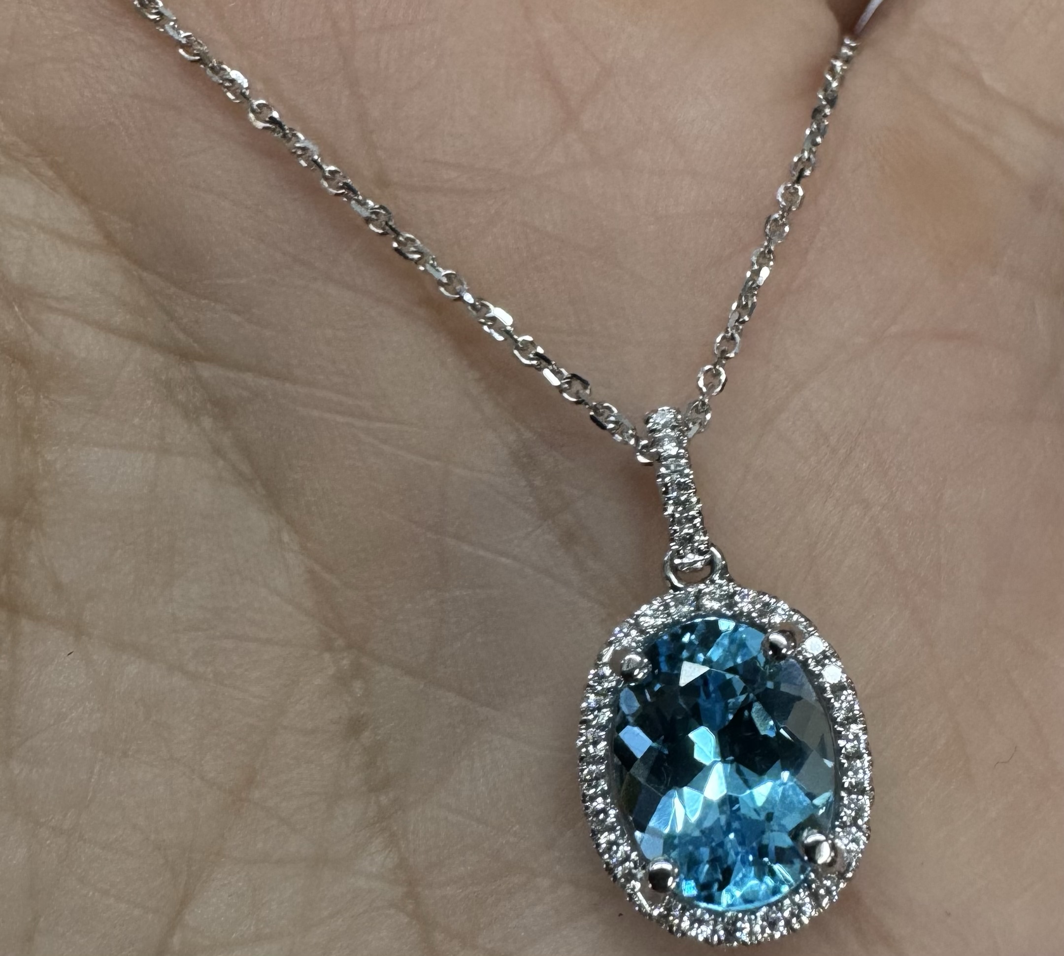14k white gold oval shaped, faceted genuine 3.00 carat Blue Topaz and genuine .18 cttw Round Brilliant Cut diamond halo pendant. These diamonds average G-H in color and SI1 in clarity. This pendant is suspended from a 14k white gold forzantina chain with a lobster claw clasp, which is adjustable 16-17-18″. This piece has an entire weight of 3.3 grams.