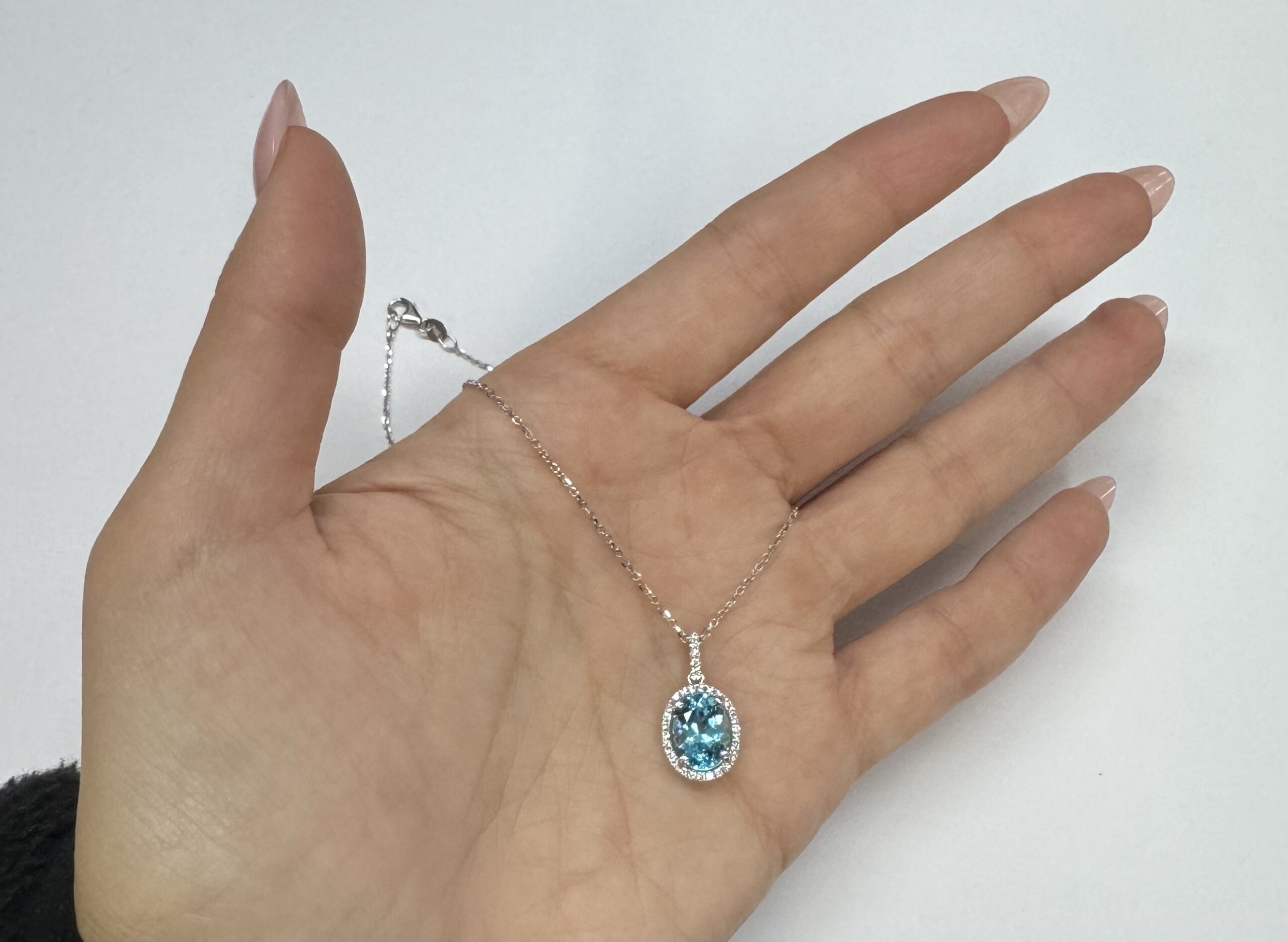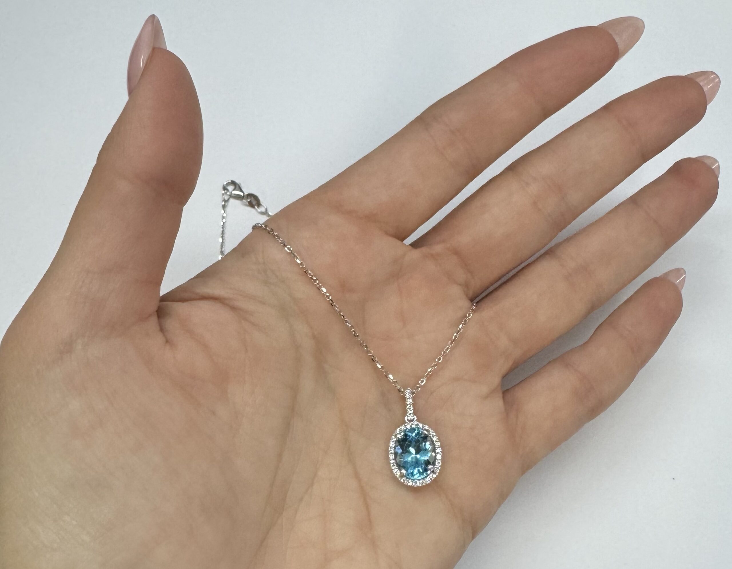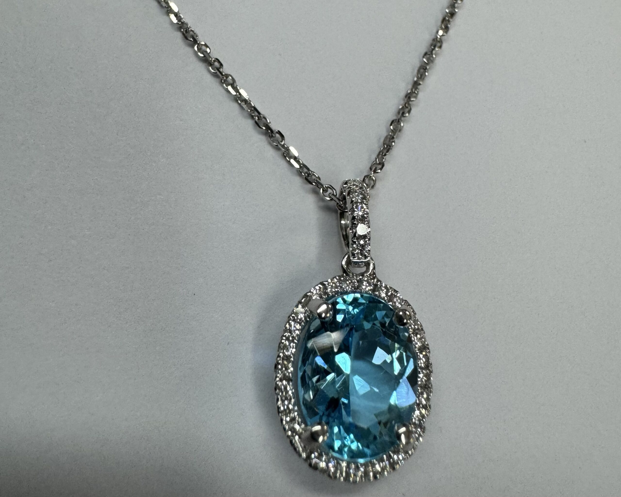 14k White Gold Genuine 3.00 Carat Blue Topaz & Diamond Halo Pendant