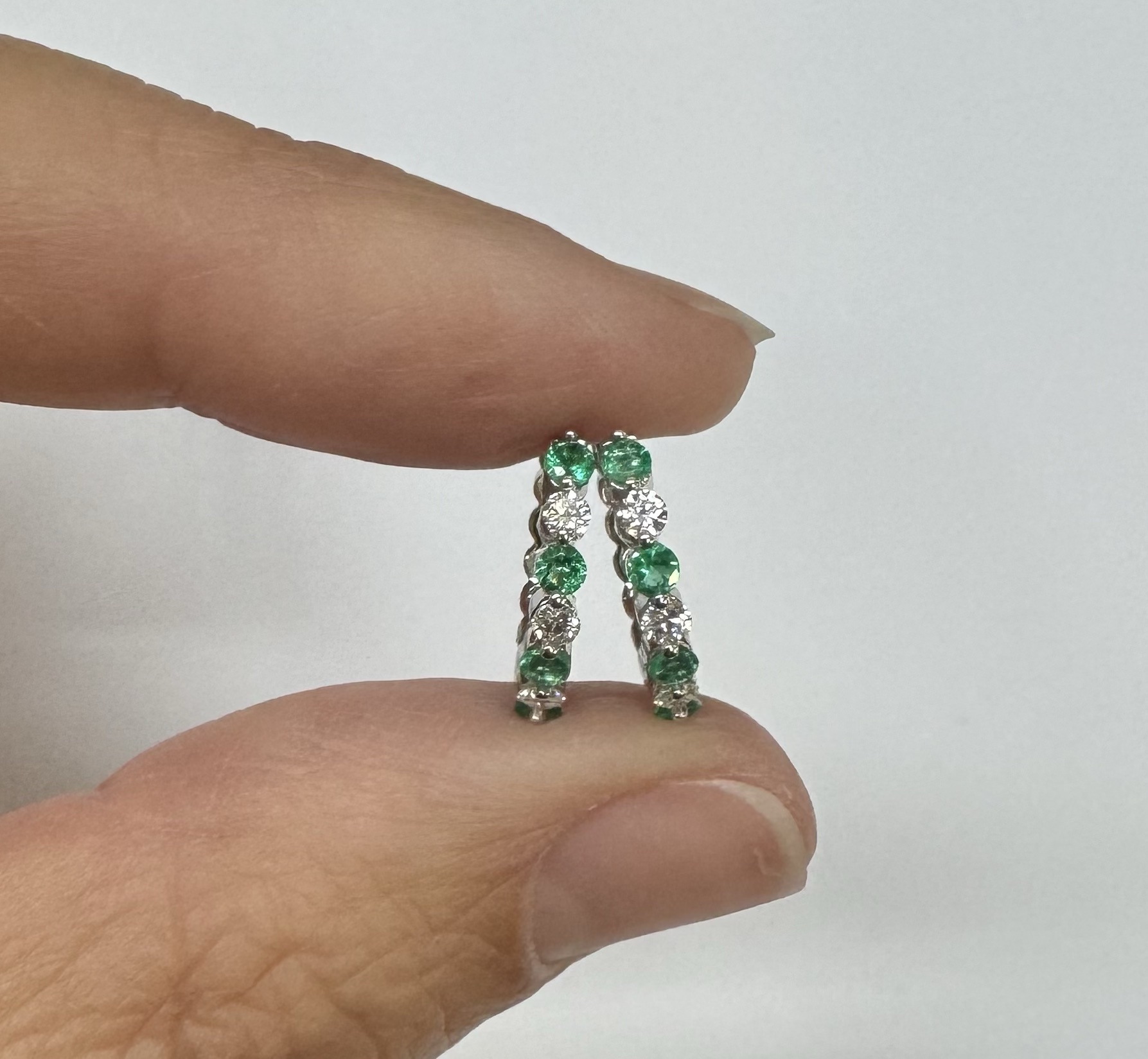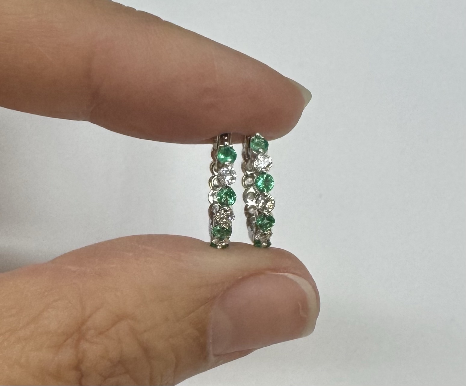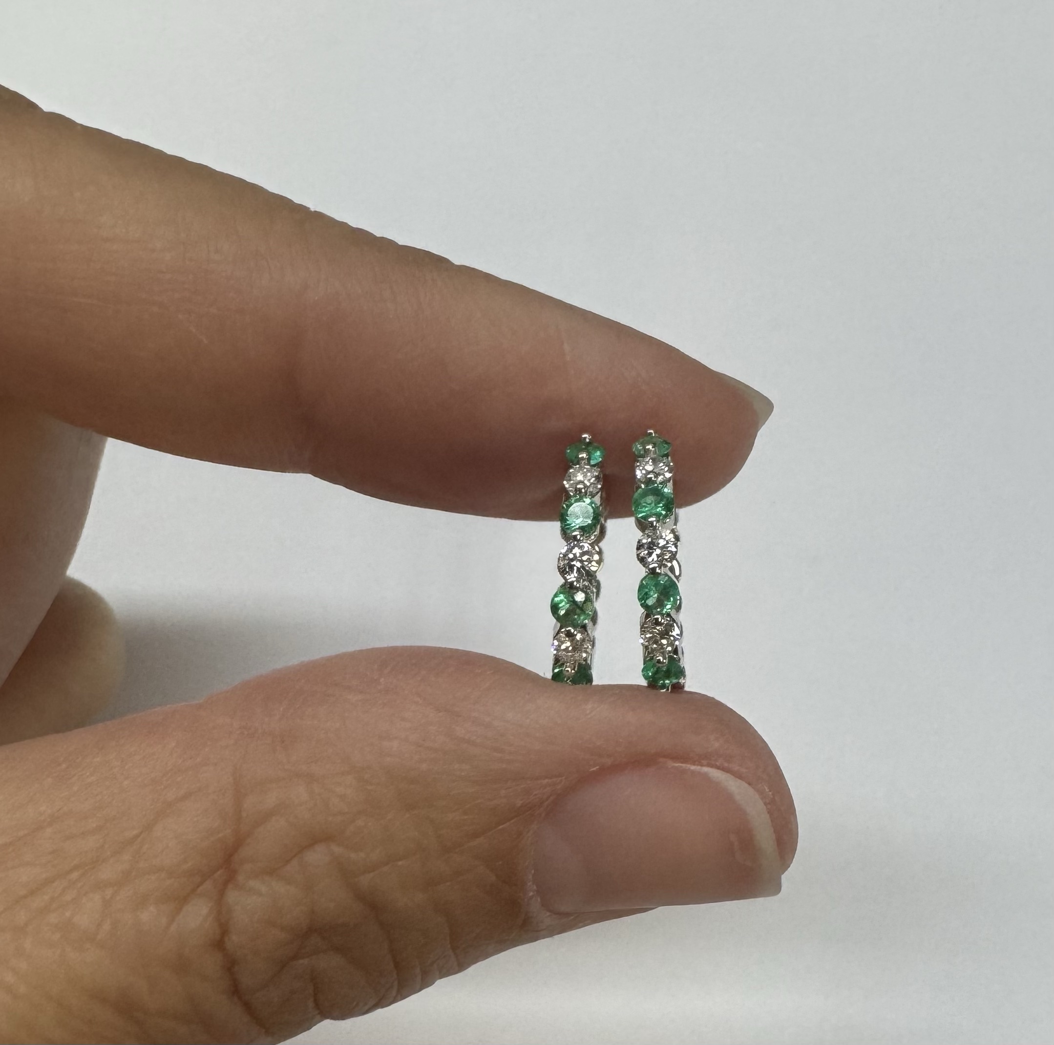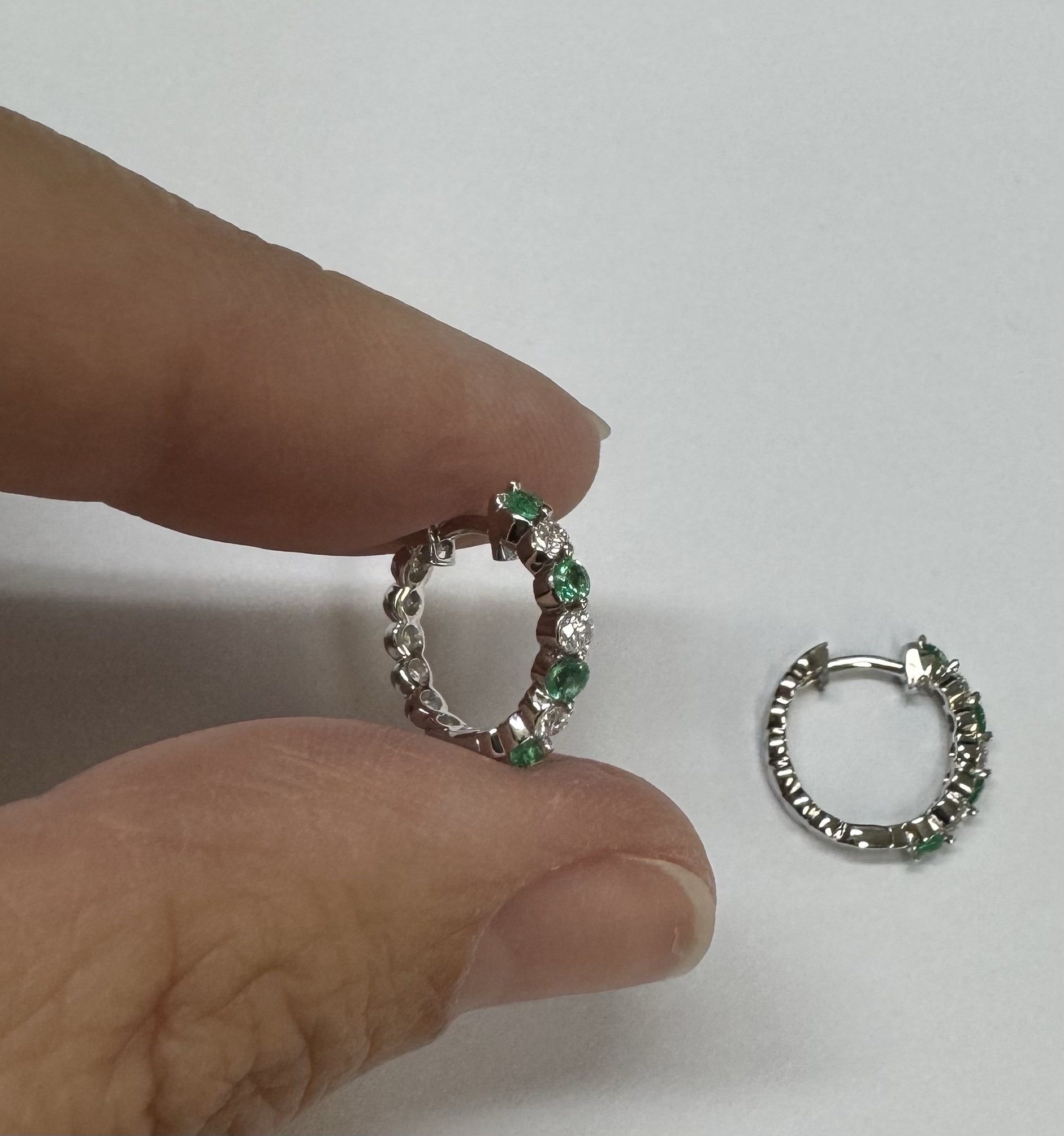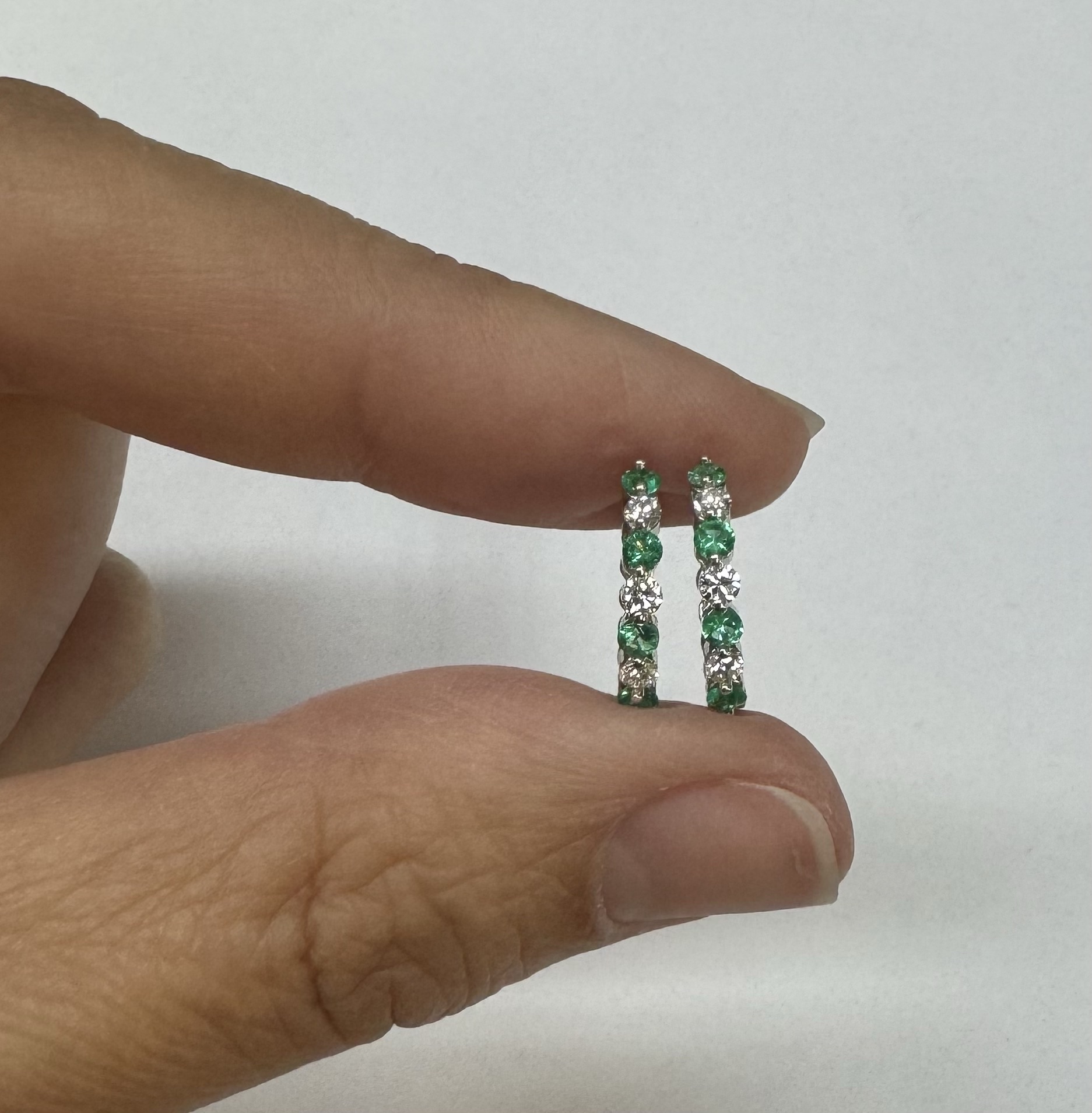 14k white gold genuine Emerald and Diamond huggy hoop earrings. Each earring contains 4 genuine round, faceted Emeralds, 8 in all, which have a total combined weight of .32/100-ct. Set alternately with the Emeralds are 3 genuine Round Brilliant Cut diamonds, 6 in all, which have a total combined weight of .18/200-ct. These diamonds average G-H in color and SI1 in clarity. These earrings measure approximately 2 x 14 mm in size, and they have an entire weight of 1.7 grams.