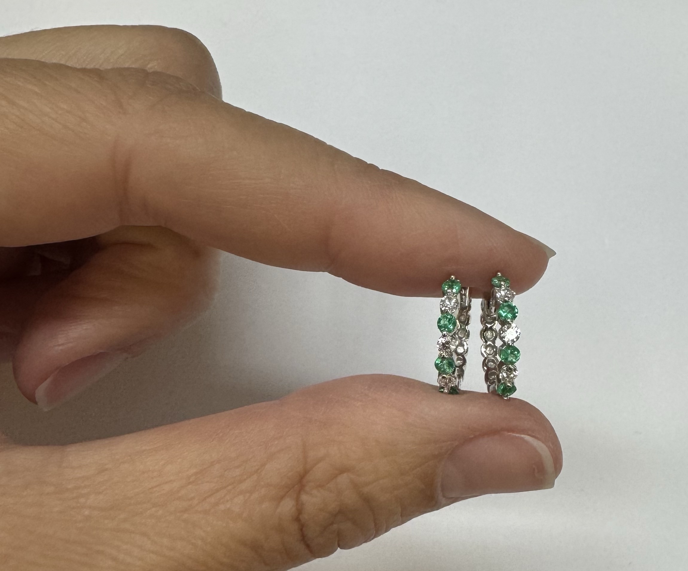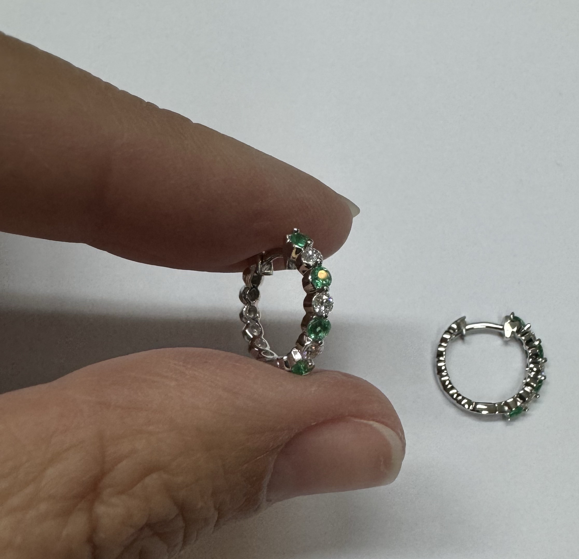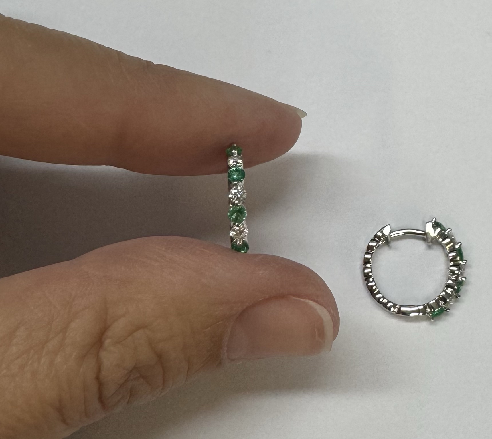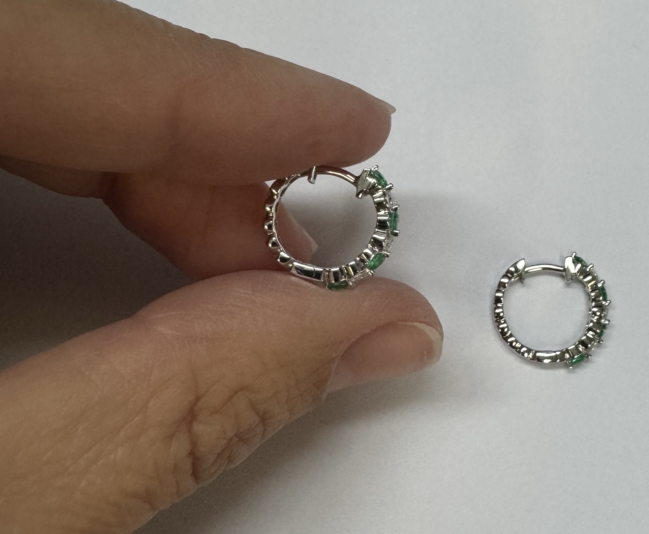 14k white gold genuine Emerald and Diamond huggy hoop earrings. Each earring contains 4 genuine round, faceted Emeralds, 8 in all, which have a total combined weight of .32/100-ct. Set alternately with the Emeralds are 3 genuine Round Brilliant Cut diamonds, 6 in all, which have a total combined weight of .18/200-ct. These diamonds average G-H in color and SI1 in clarity. These earrings measure approximately 2 x 14 mm in size, and they have an entire weight of 1.7 grams.