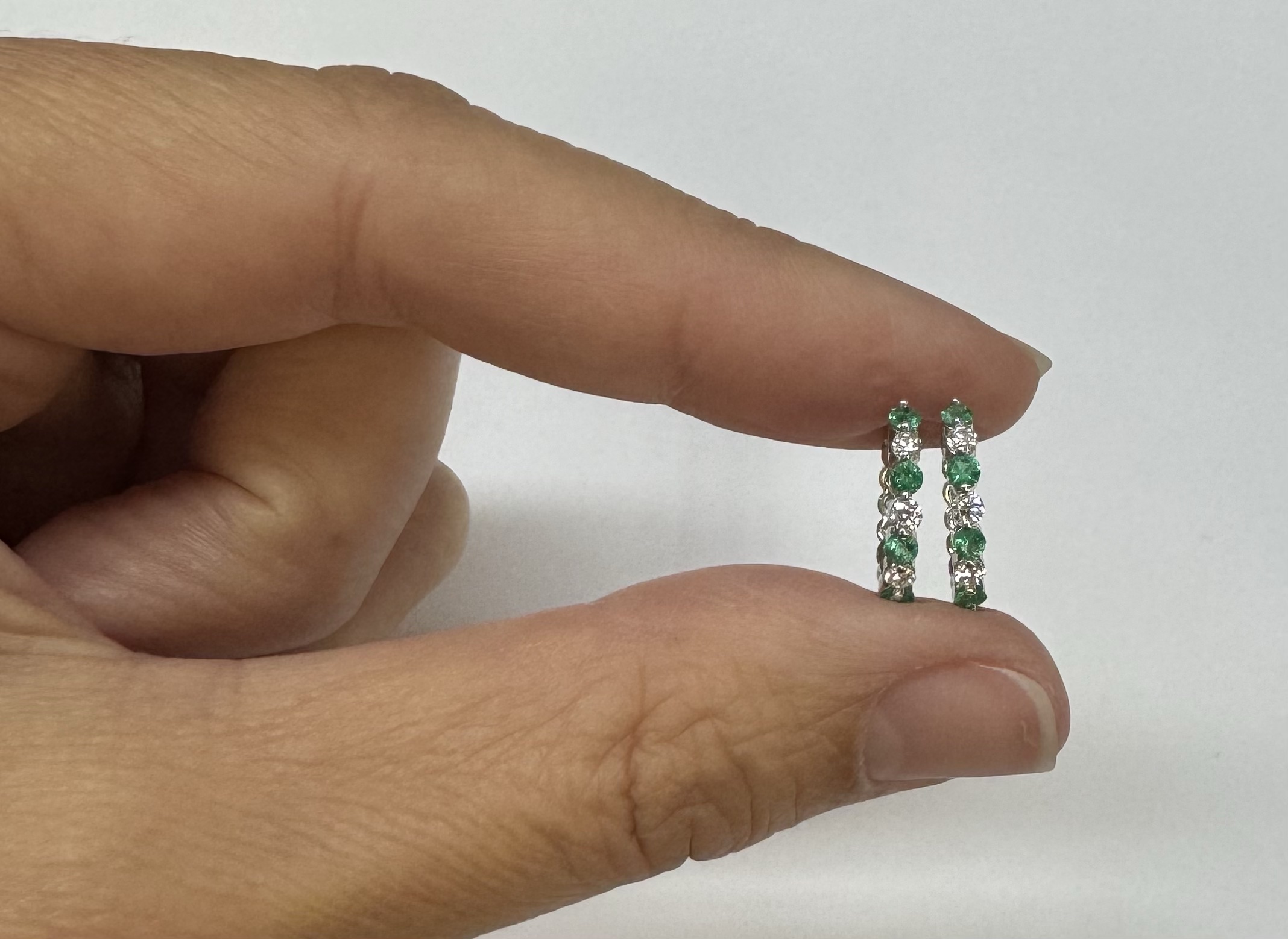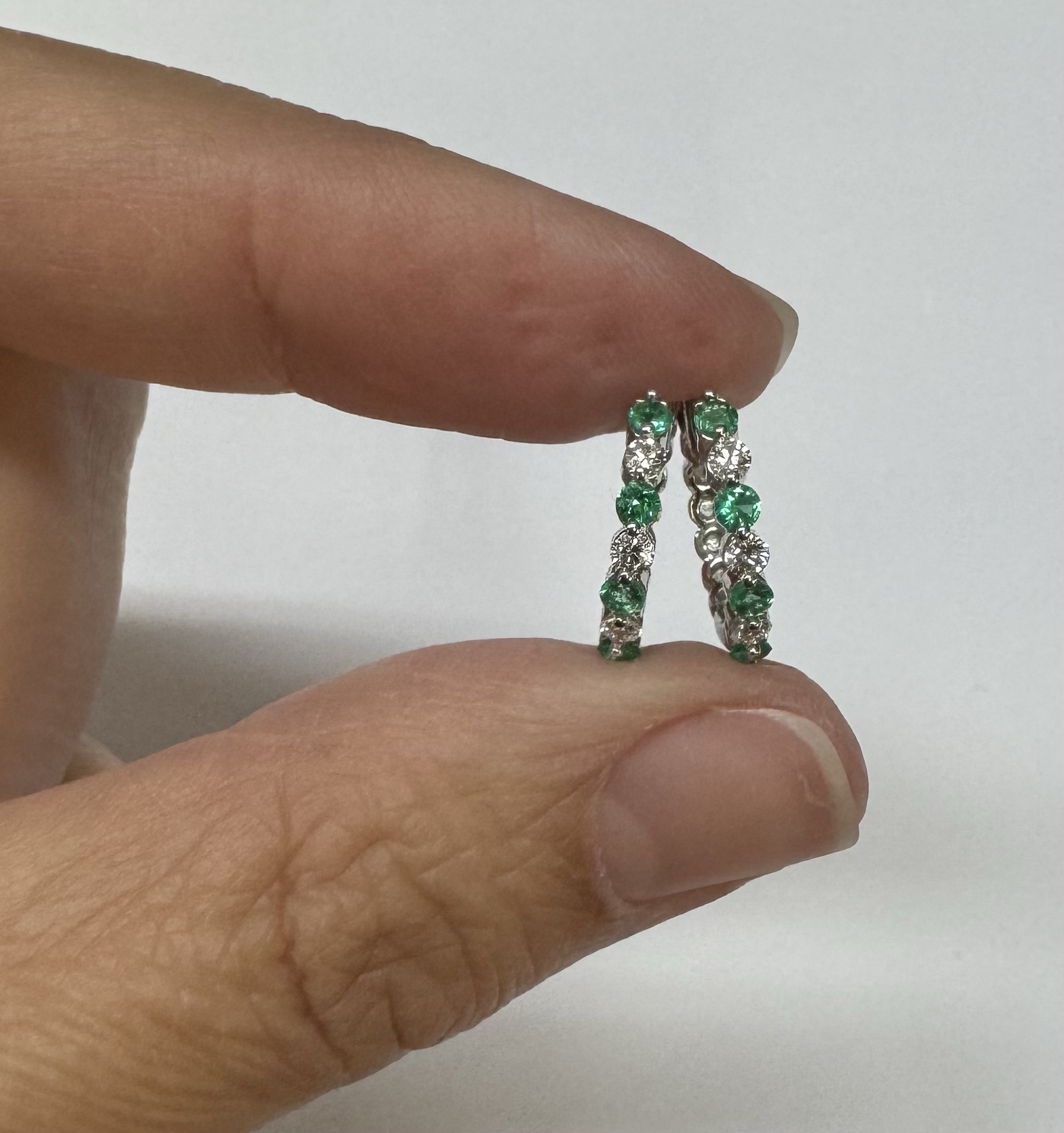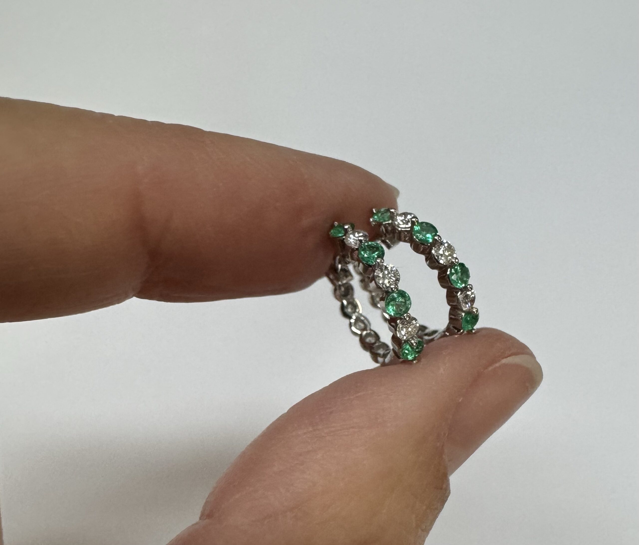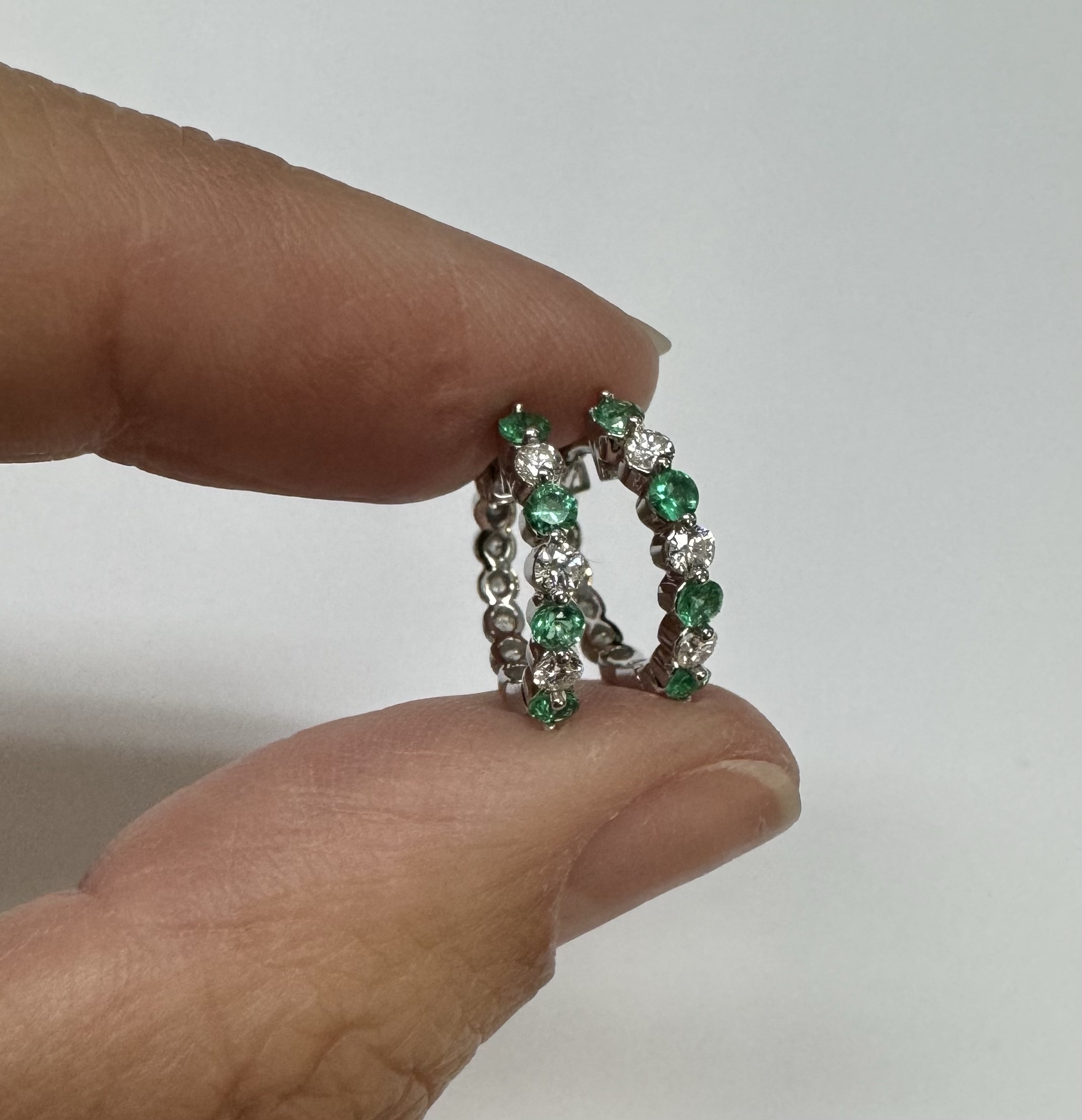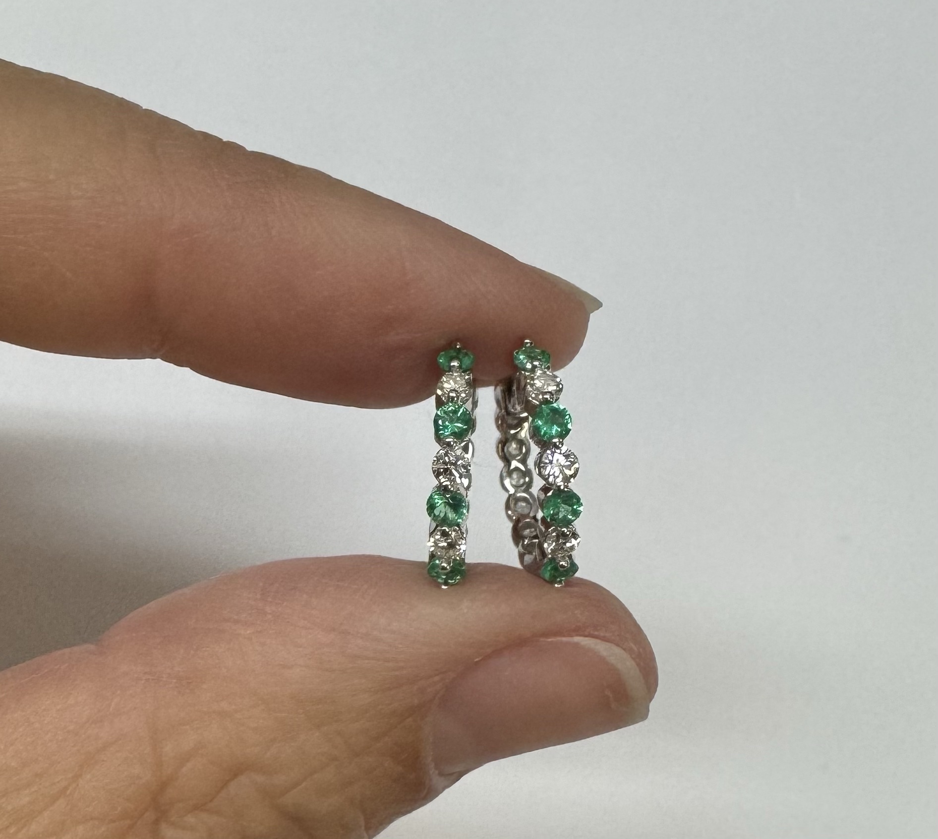 14k white gold genuine Emerald and Diamond huggy hoop earrings. Each earring contains 4 genuine round, faceted Emeralds, 8 in all, which have a total combined weight of .32/100-ct. Set alternately with the Emeralds are 3 genuine Round Brilliant Cut diamonds, 6 in all, which have a total combined weight of .18/200-ct. These diamonds average G-H in color and SI1 in clarity. These earrings measure approximately 2 x 14 mm in size, and they have an entire weight of 1.7 grams.
