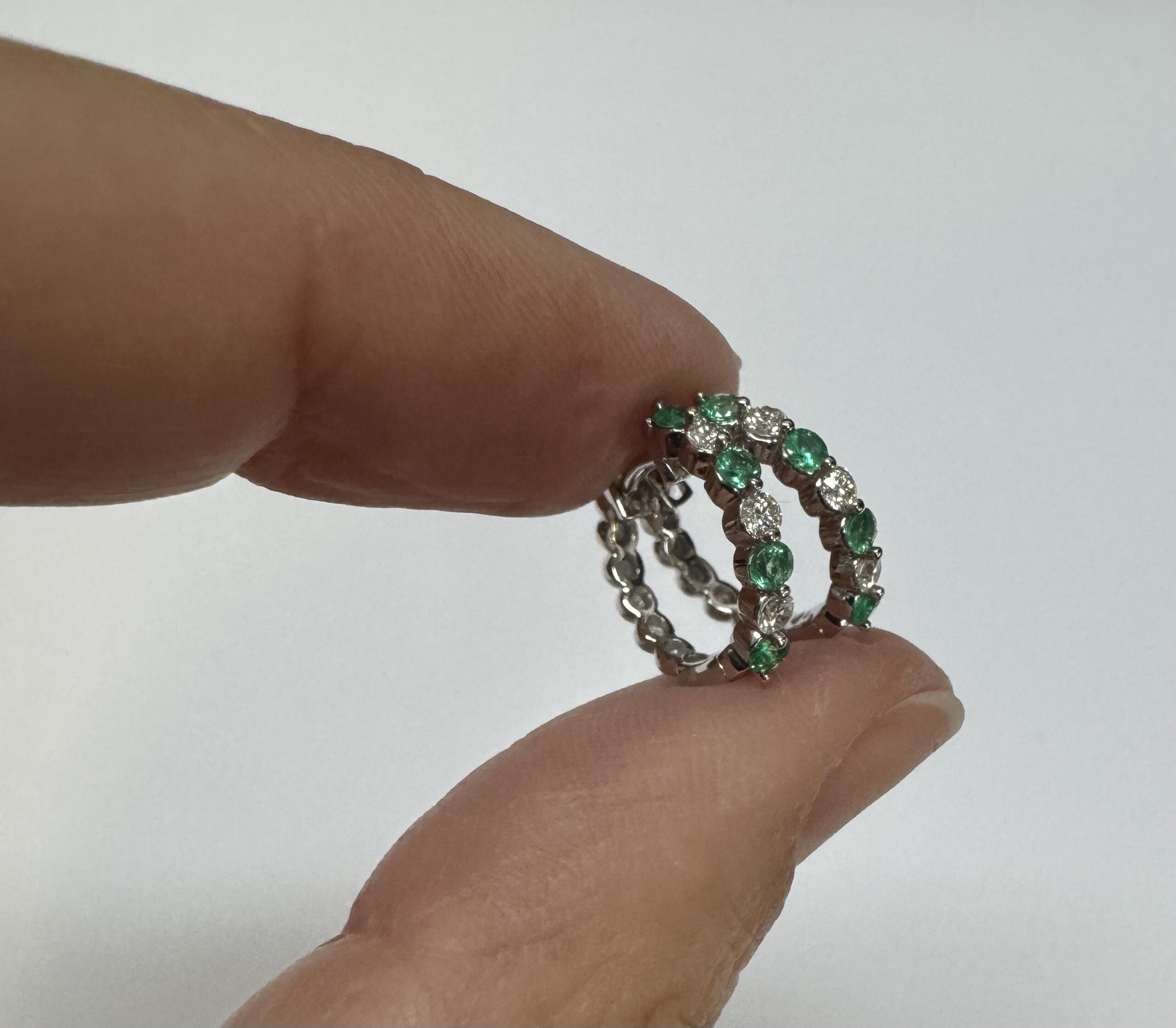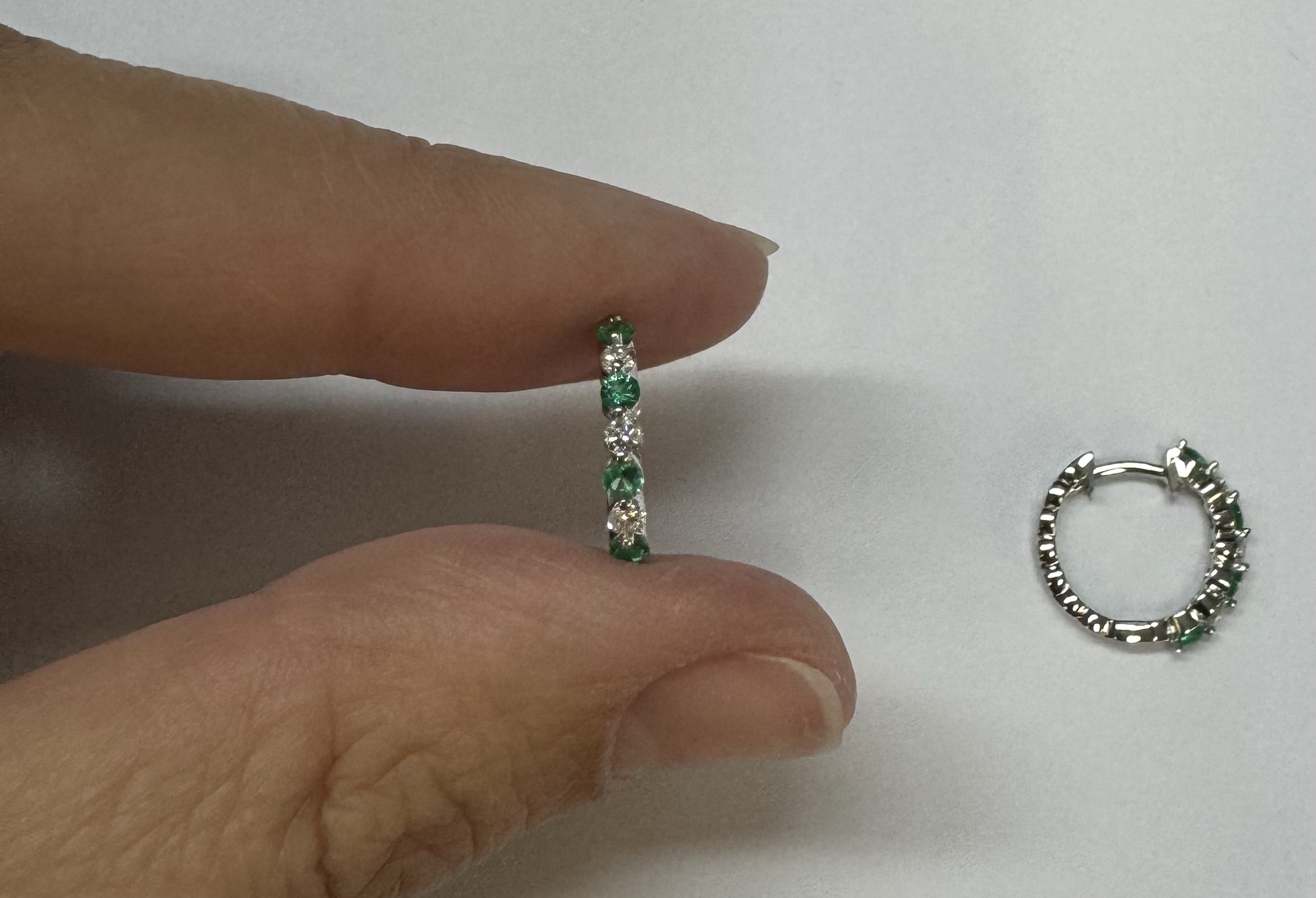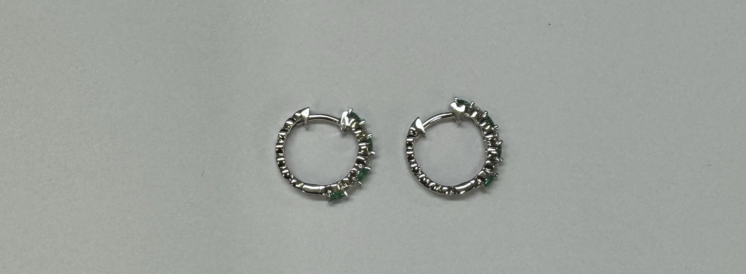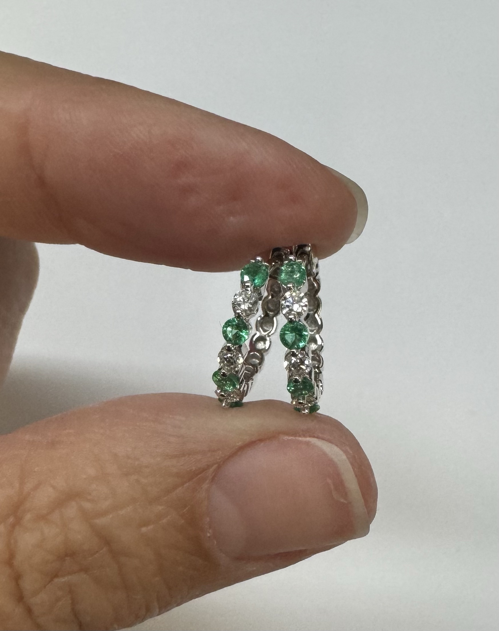 14k white gold genuine Emerald and Diamond huggy hoop earrings. Each earring contains 4 genuine round, faceted Emeralds, 8 in all, which have a total combined weight of .32/100-ct. Set alternately with the Emeralds are 3 genuine Round Brilliant Cut diamonds, 6 in all, which have a total combined weight of .18/200-ct. These diamonds average G-H in color and SI1 in clarity. These earrings measure approximately 2 x 14 mm in size, and they have an entire weight of 1.7 grams.