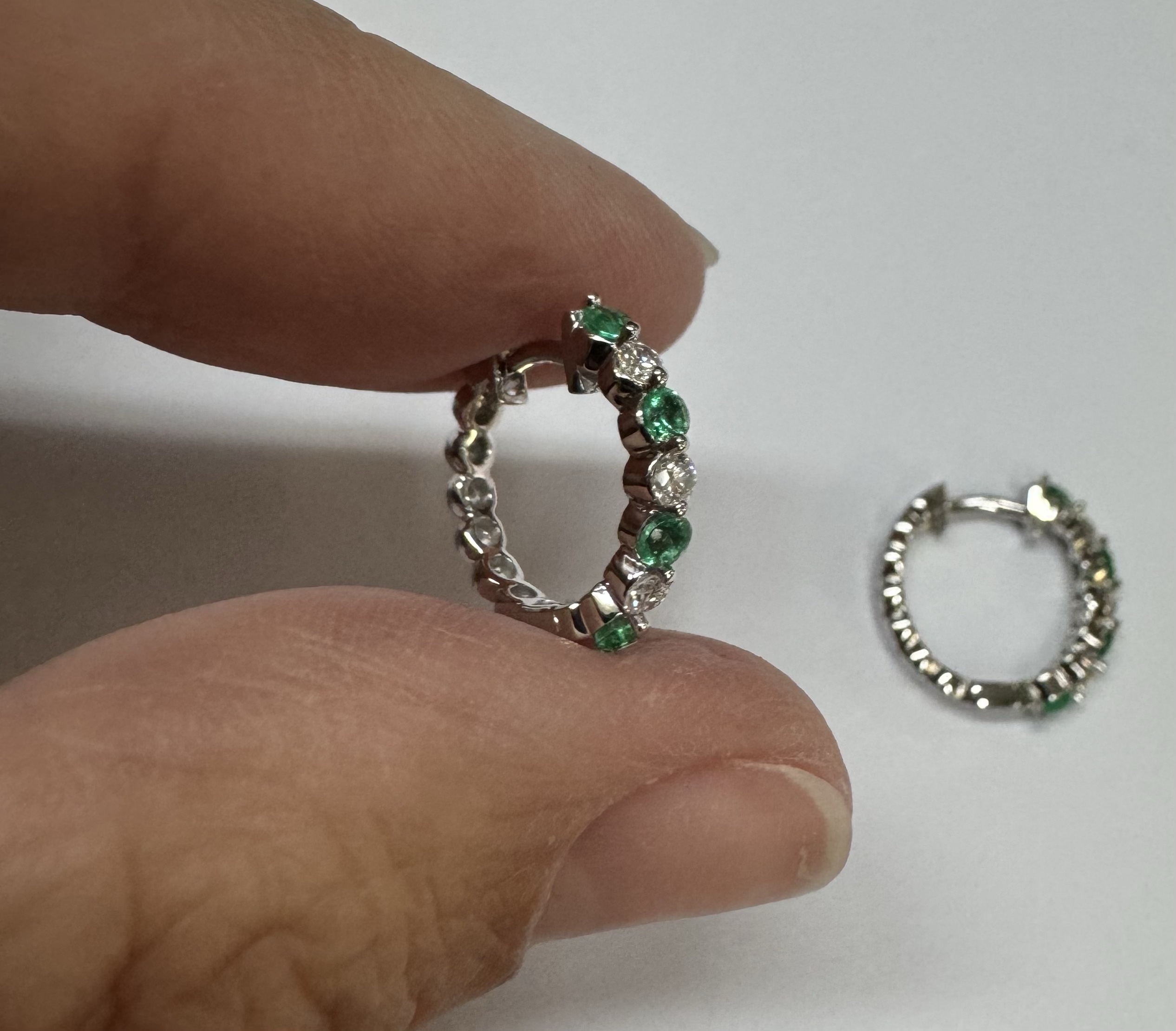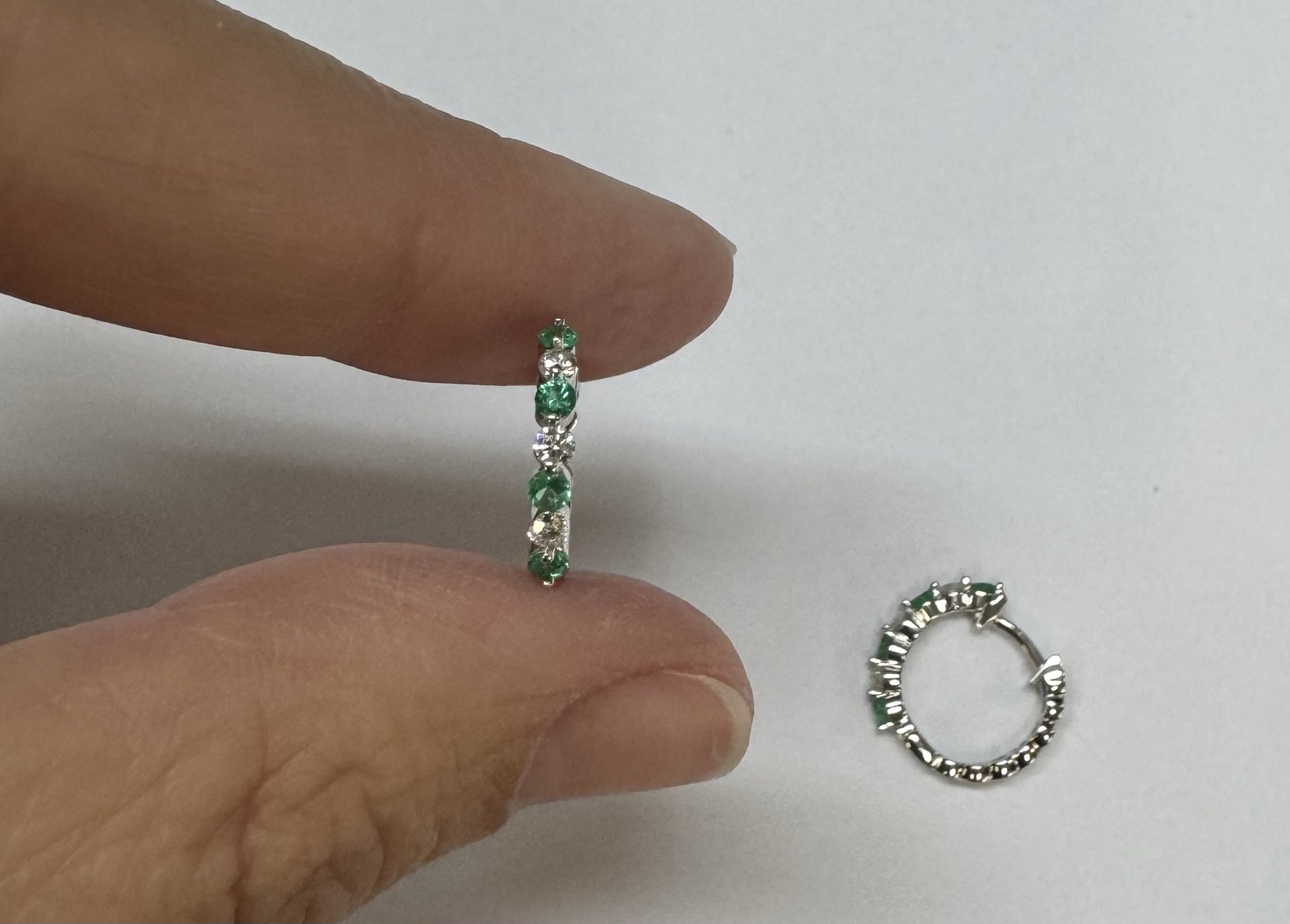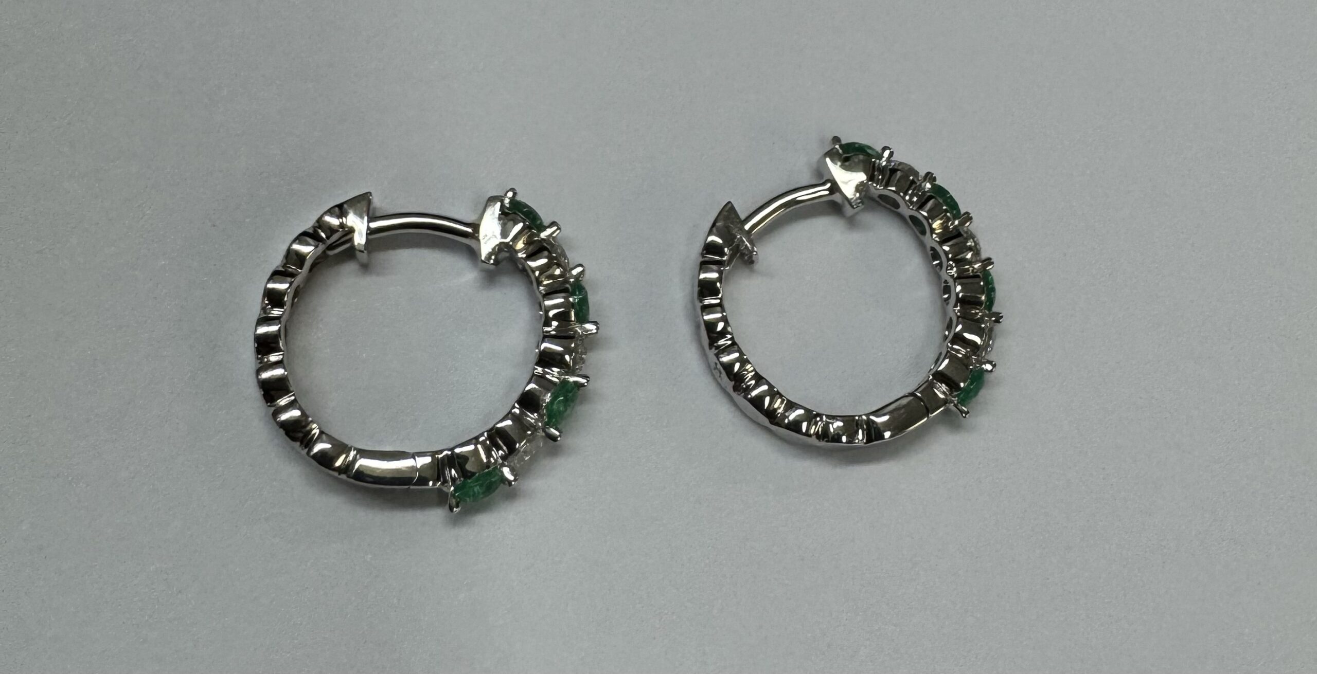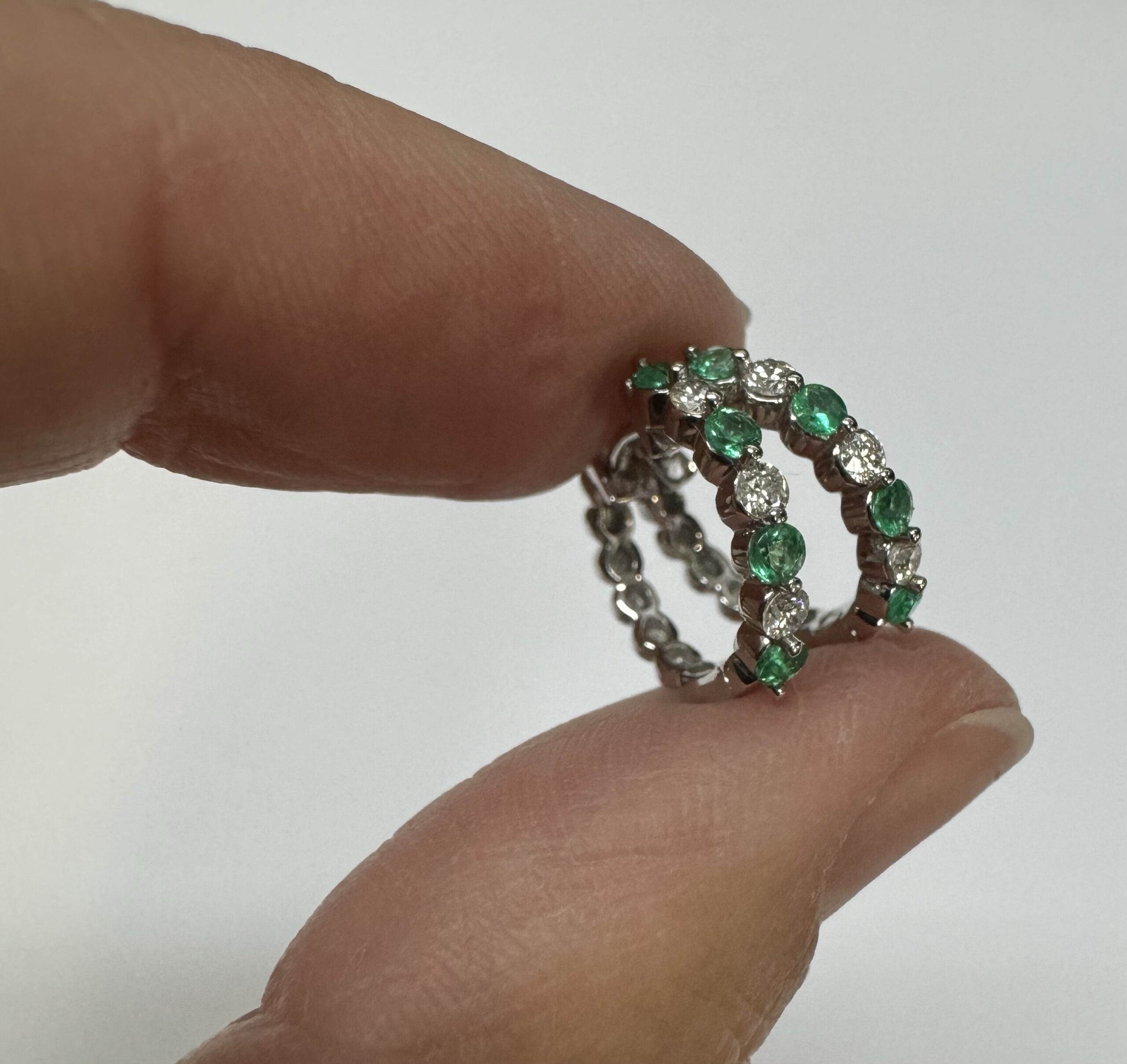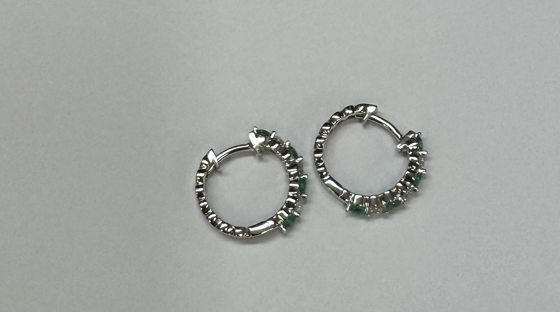 14k white gold genuine Emerald and Diamond huggy hoop earrings. Each earring contains 4 genuine round, faceted Emeralds, 8 in all, which have a total combined weight of .32/100-ct. Set alternately with the Emeralds are 3 genuine Round Brilliant Cut diamonds, 6 in all, which have a total combined weight of .18/200-ct. These diamonds average G-H in color and SI1 in clarity. These earrings measure approximately 2 x 14 mm in size, and they have an entire weight of 1.7 grams.