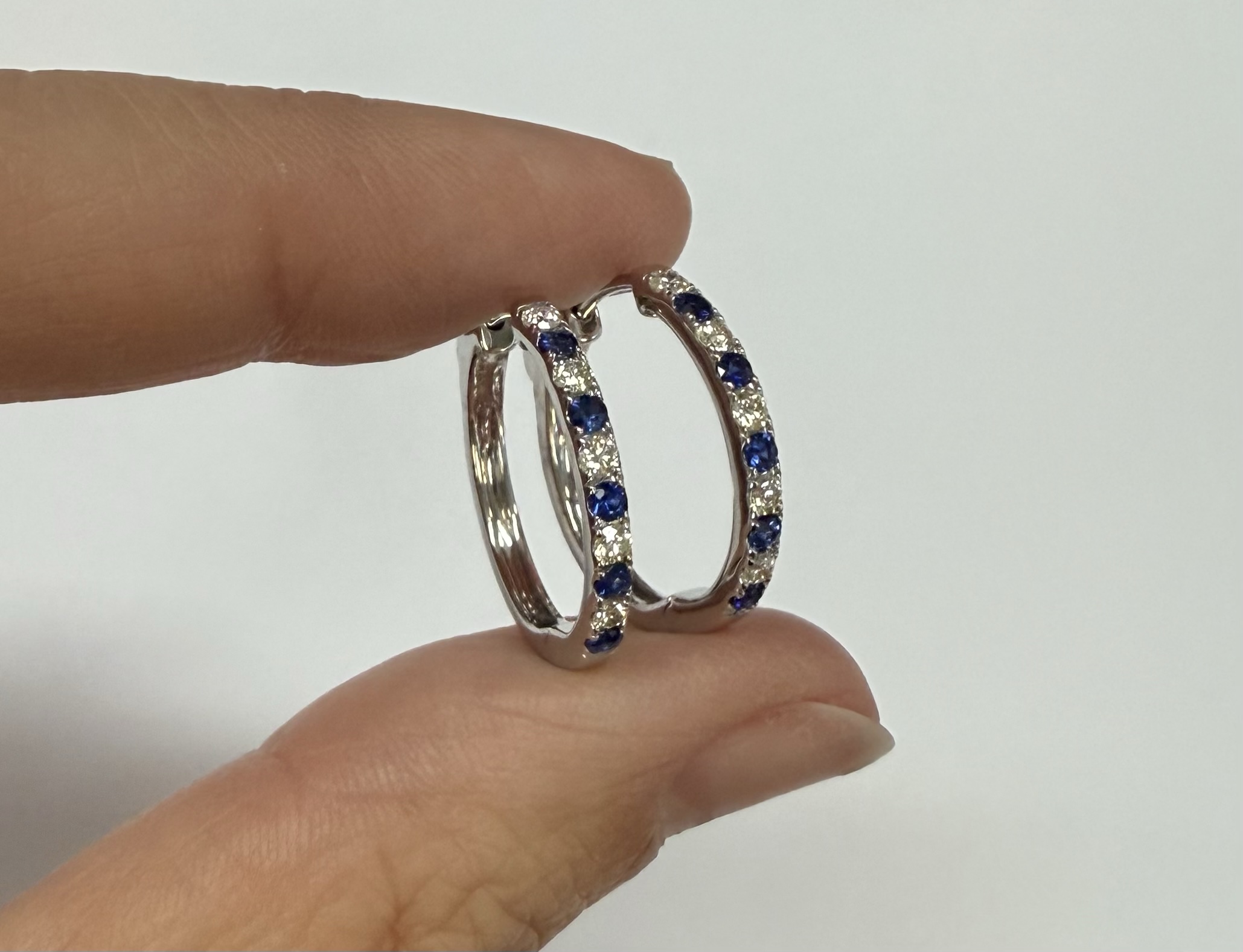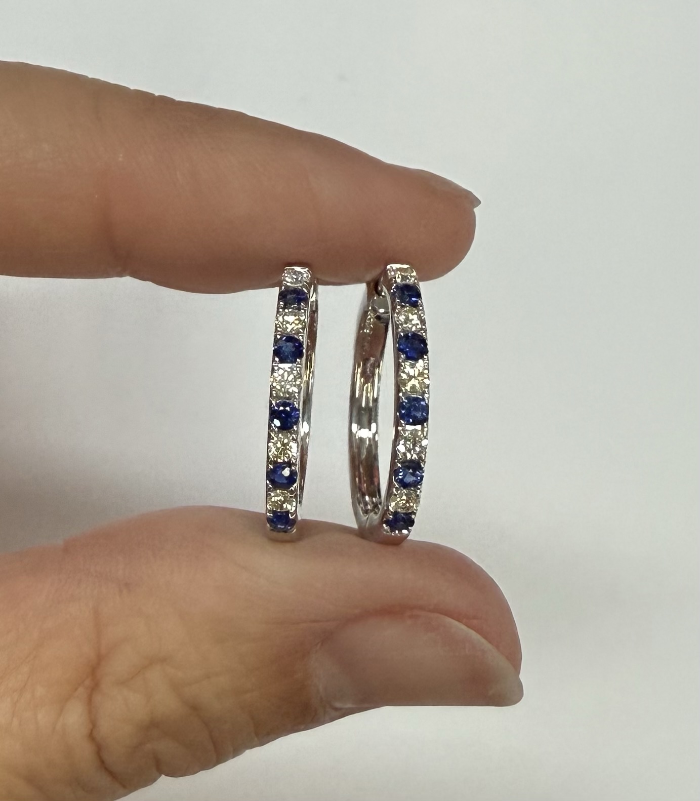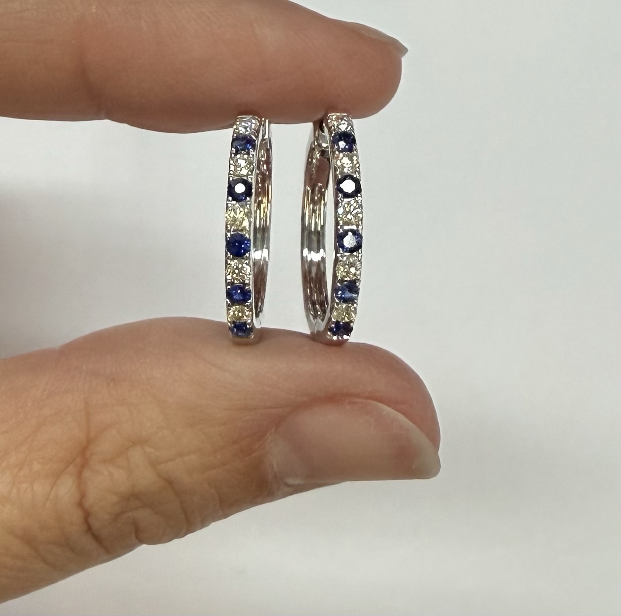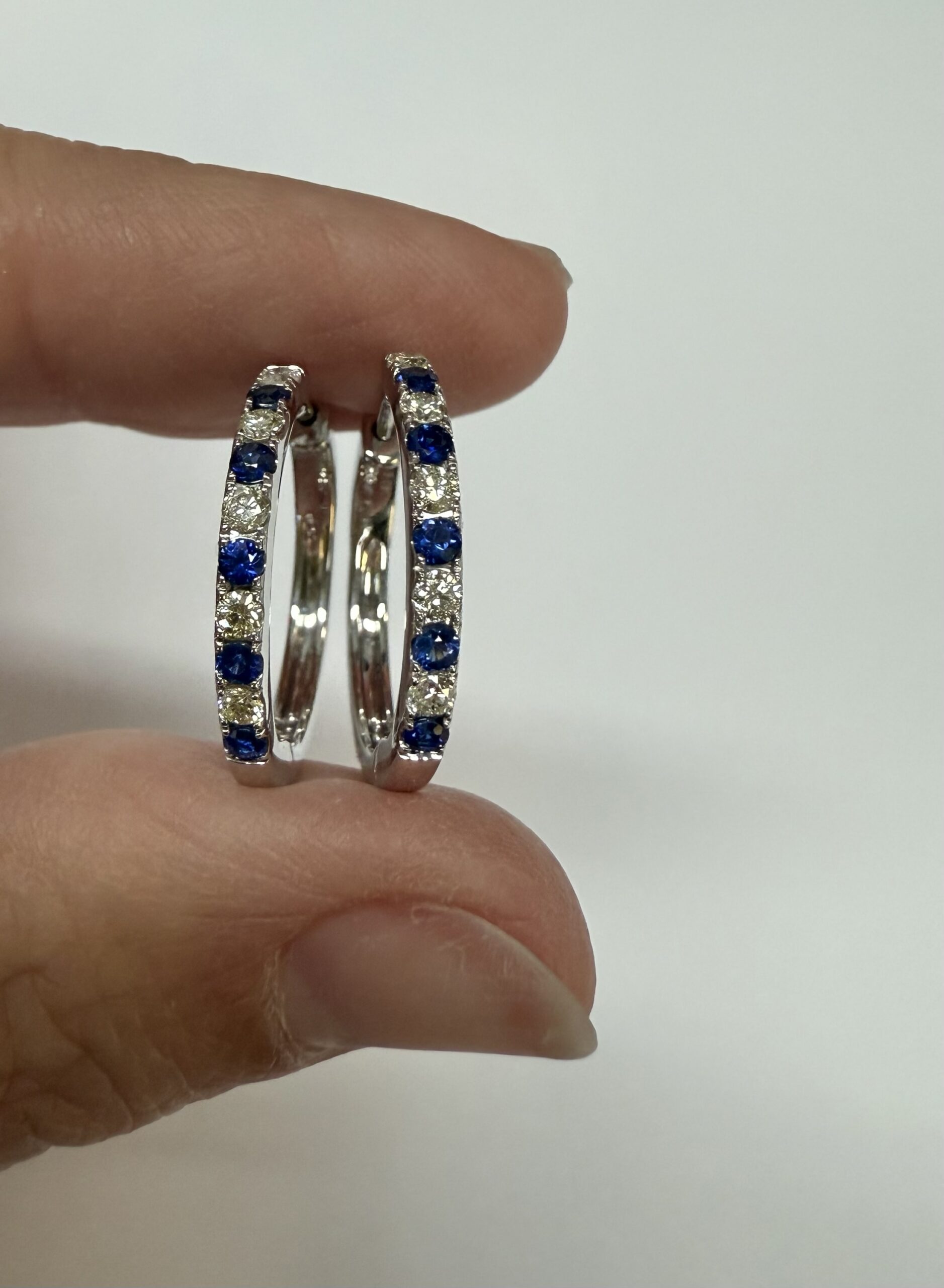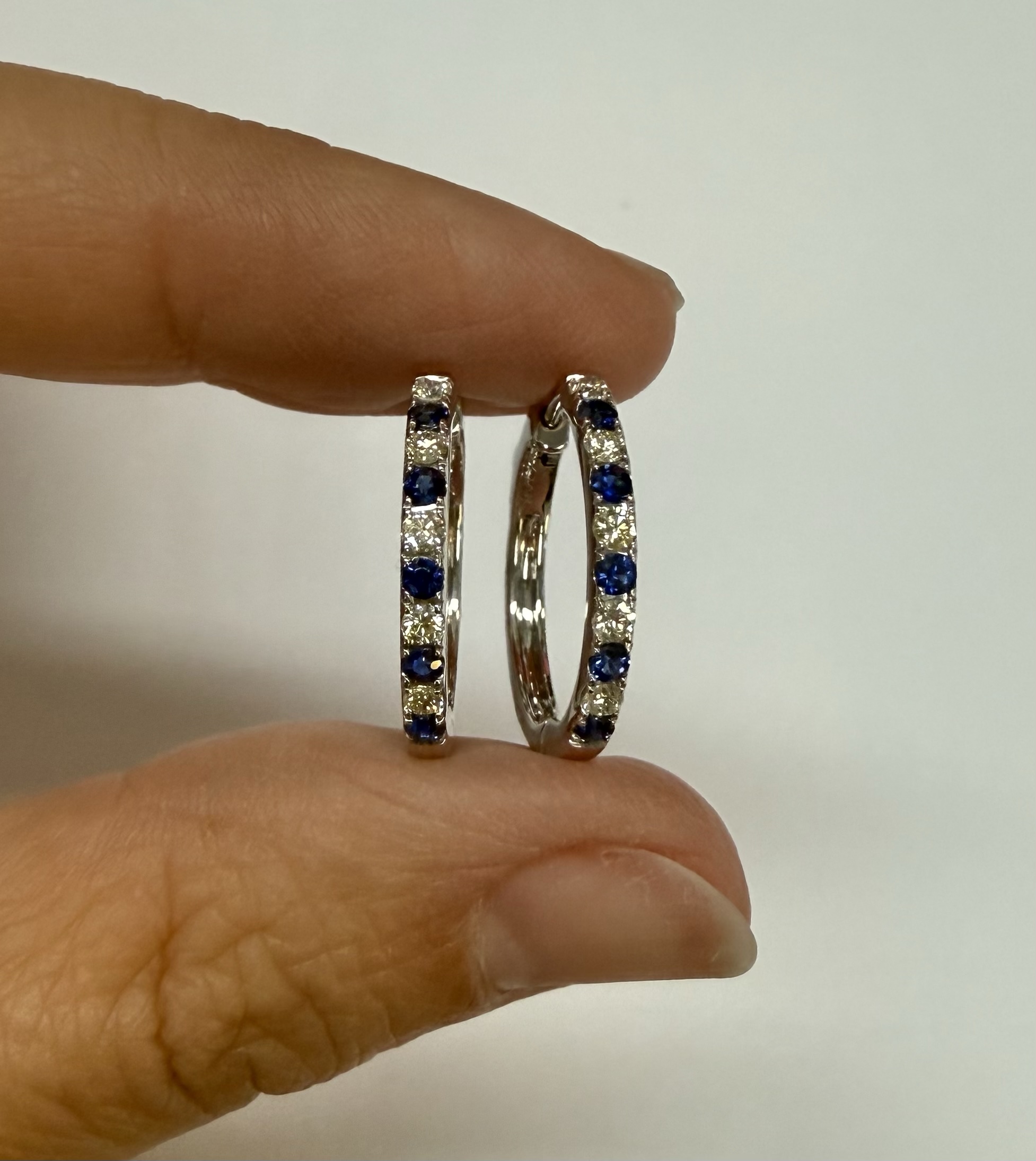 14k white gold genuine 10 Sapphire (5 each earring) genuine .35 cttw & 10 stone genuine .25 cttw Round Brilliant Cut diamond hoop earrings. These diamonds average G in color, and SI1 in clarity. These diamonds are nicely proportioned and well finished. These earrings have an entire weight of 3.8 grams.