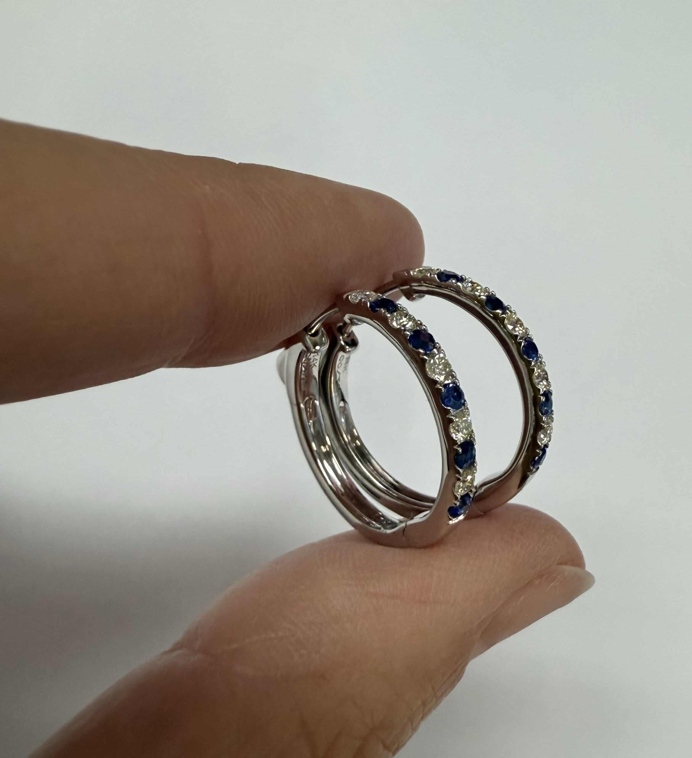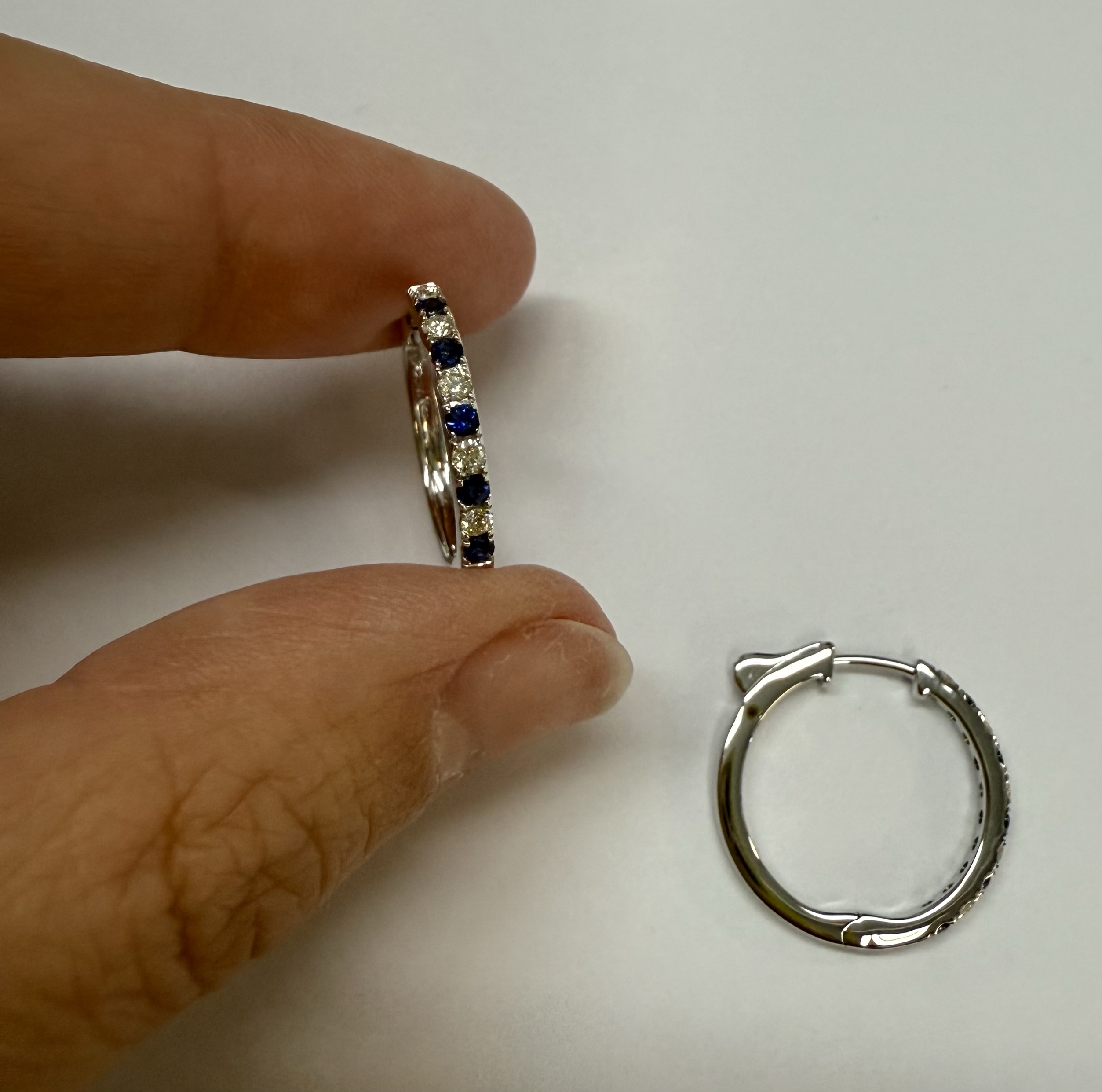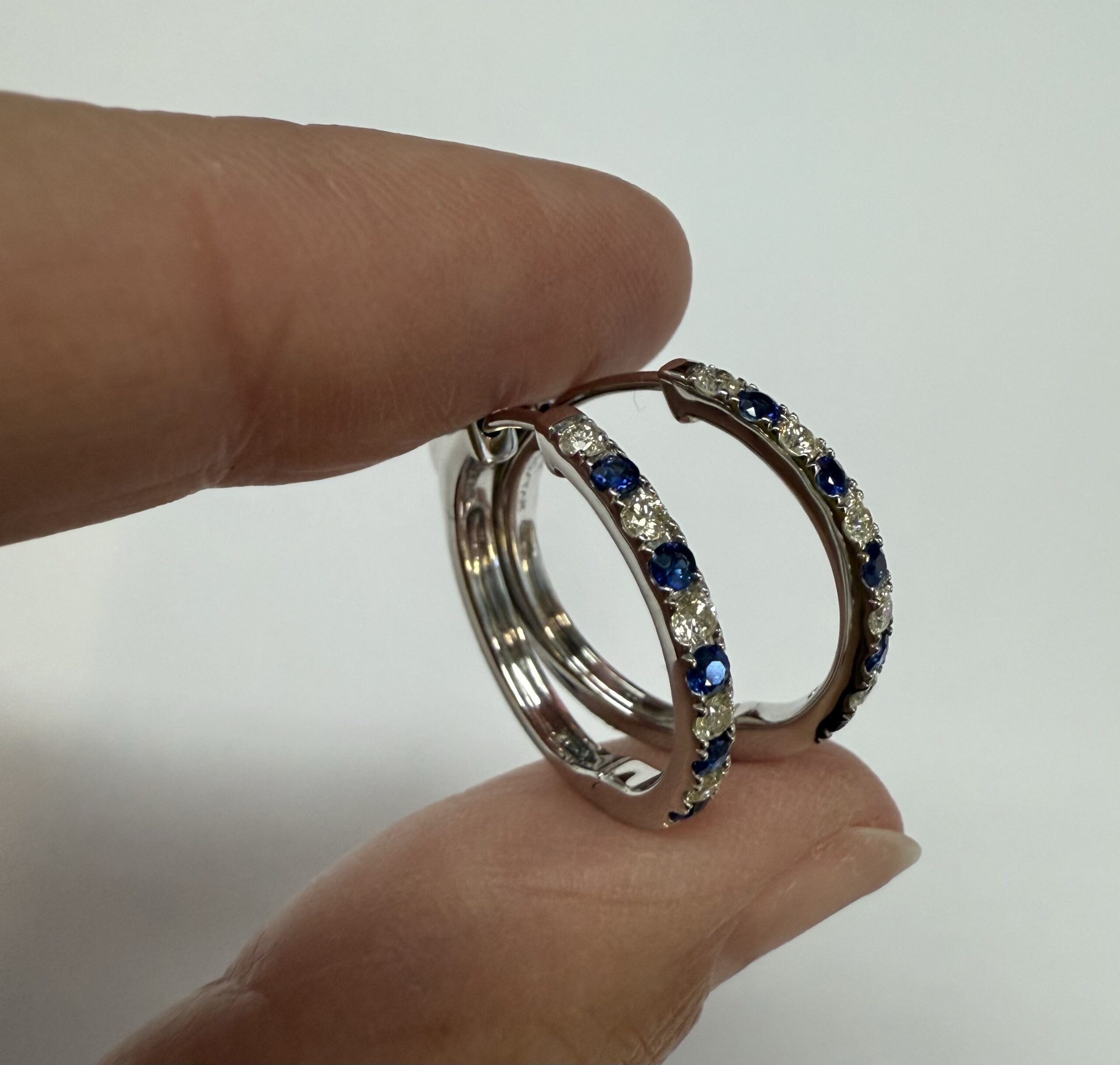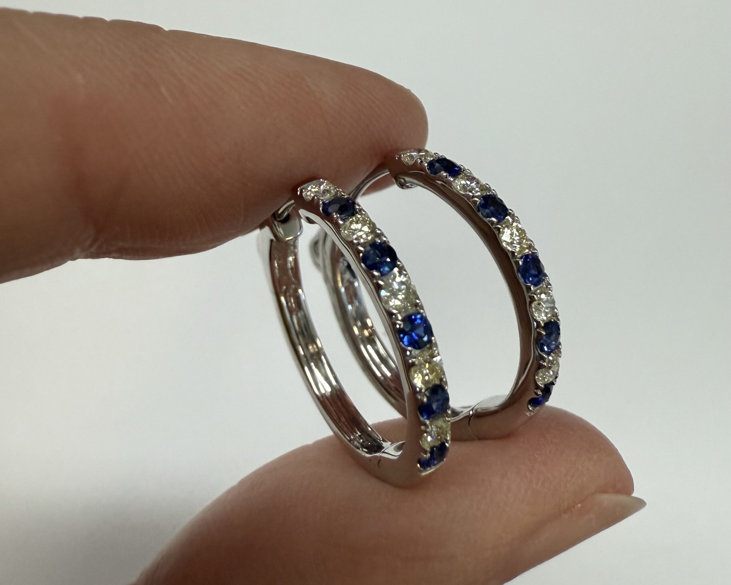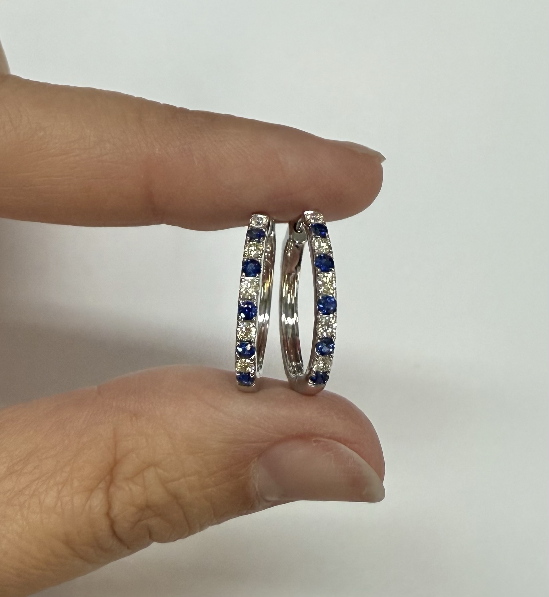 14k white gold genuine 10 Sapphire (5 each earring) genuine .35 cttw & 10 stone genuine .25 cttw Round Brilliant Cut diamond hoop earrings. These diamonds average G in color, and SI1 in clarity. These diamonds are nicely proportioned and well finished. These earrings have an entire weight of 3.8 grams.