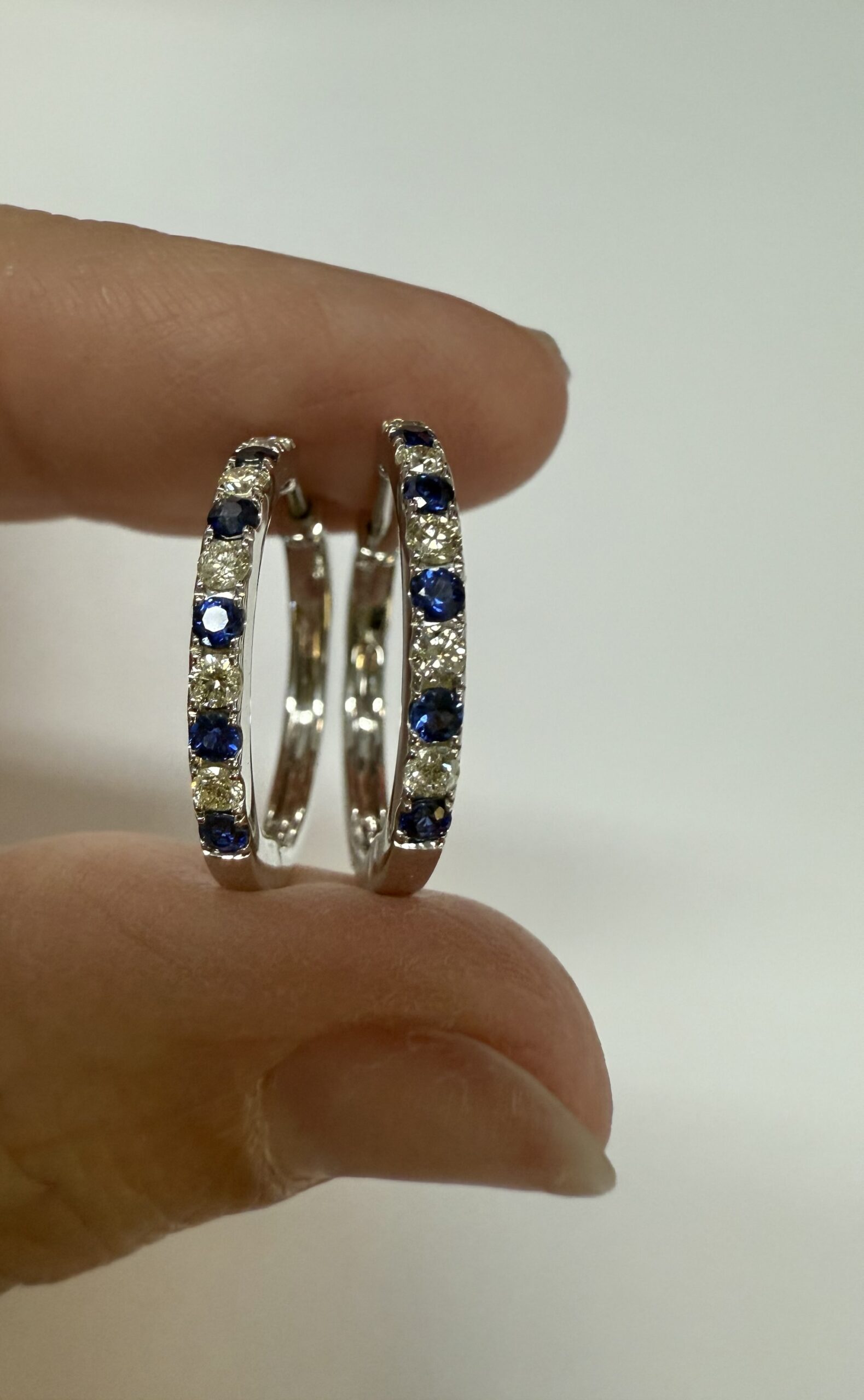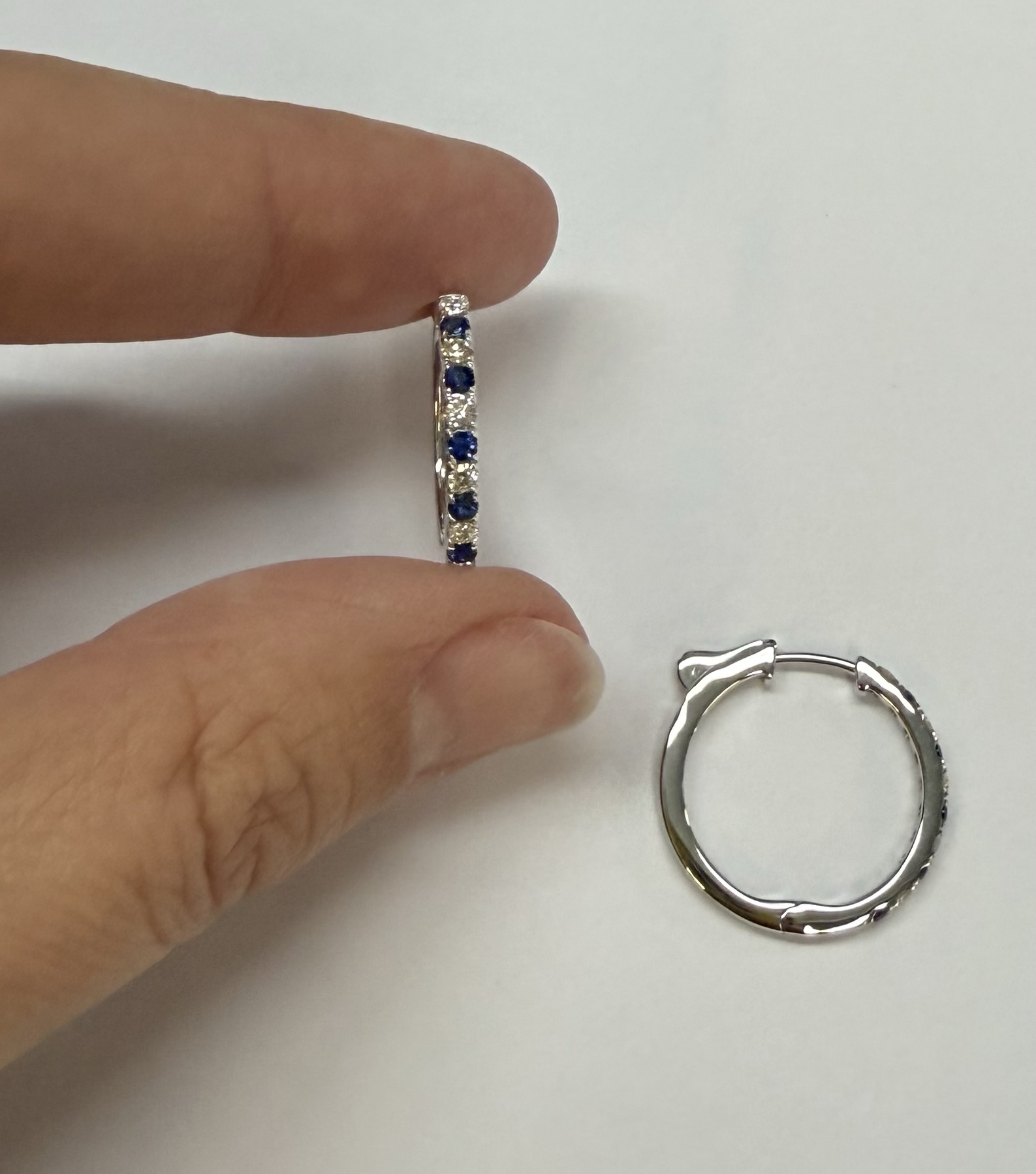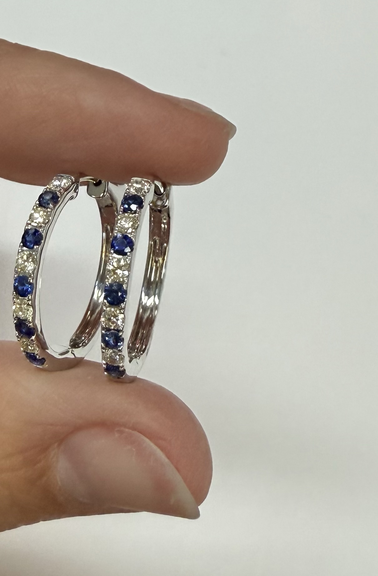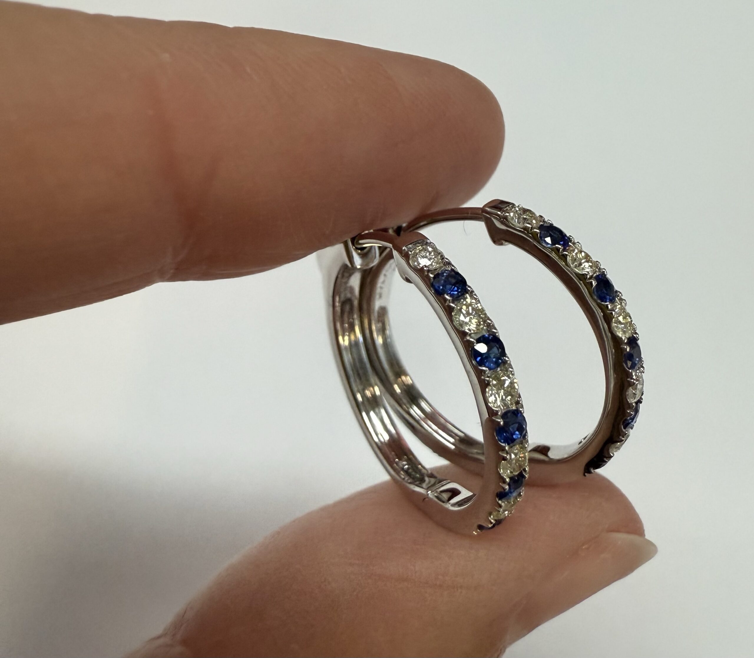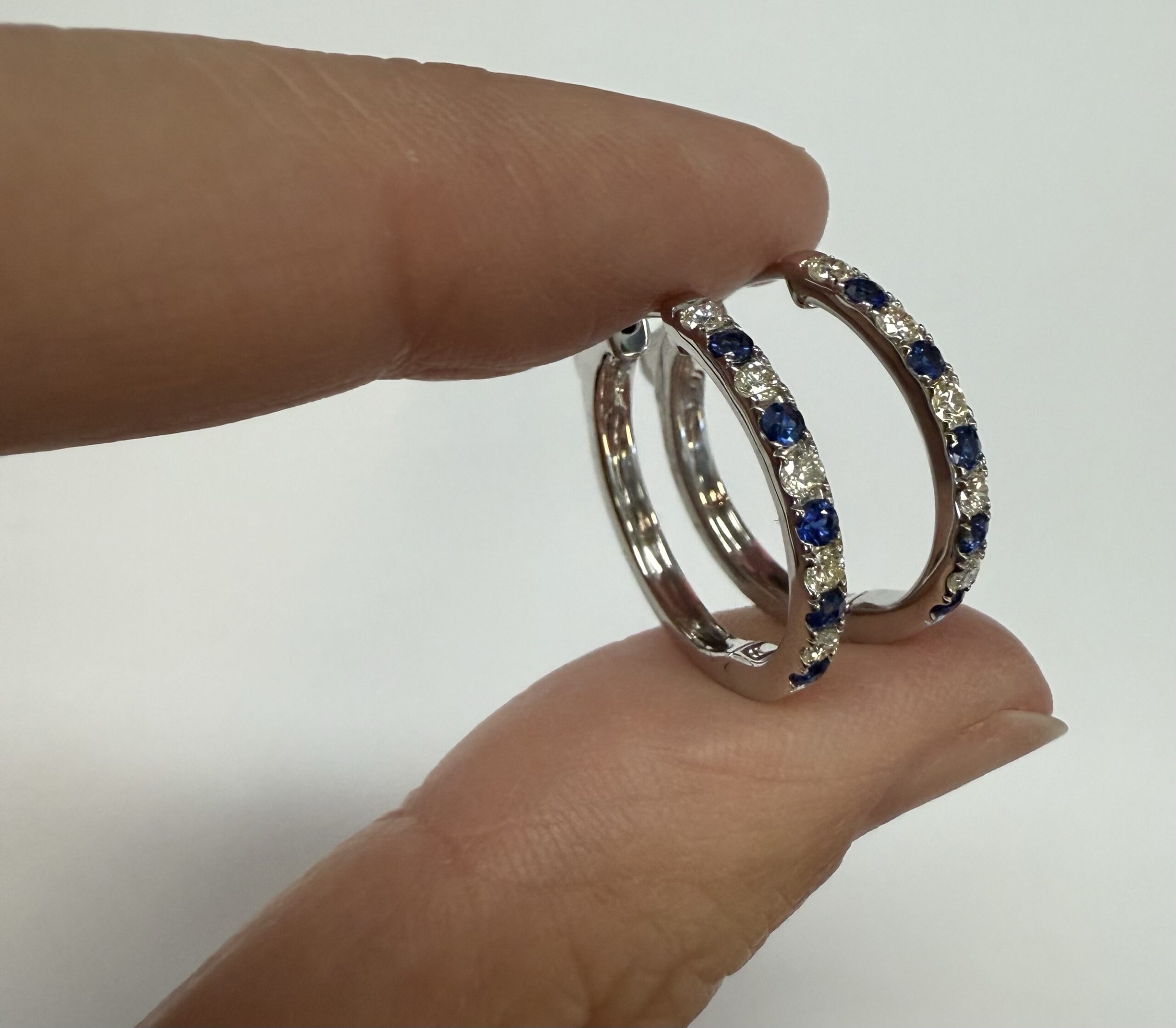14k white gold genuine 10 Sapphire (5 each earring) genuine .35 cttw & 10 stone genuine .25 cttw Round Brilliant Cut diamond hoop earrings. These diamonds average G in color, and SI1 in clarity. These diamonds are nicely proportioned and well finished. These earrings have an entire weight of 3.8 grams.