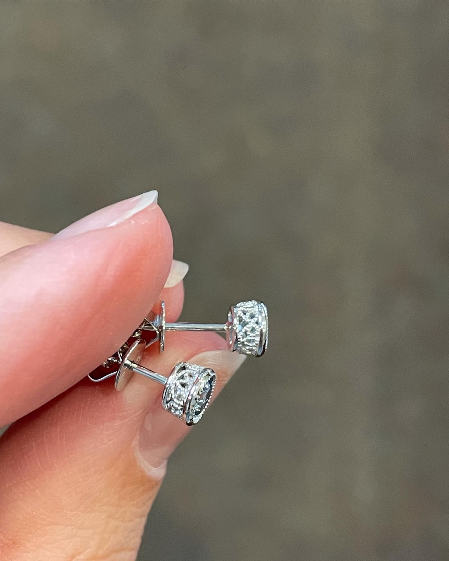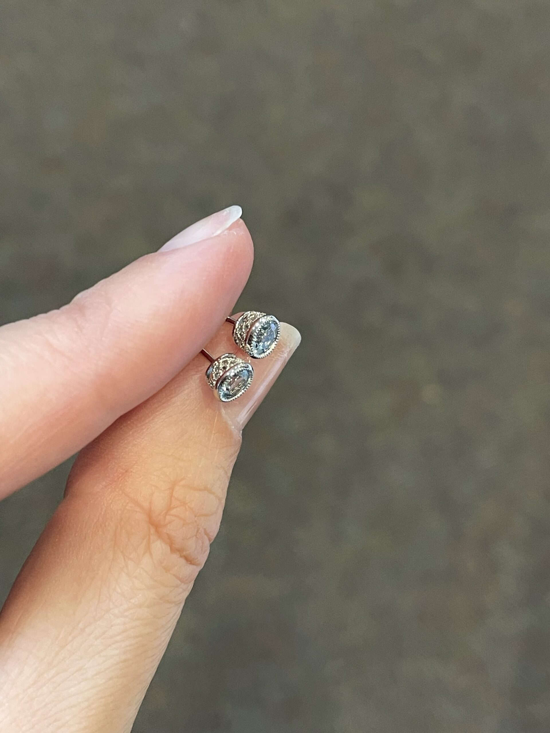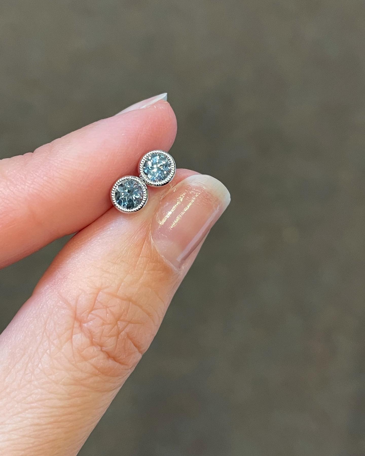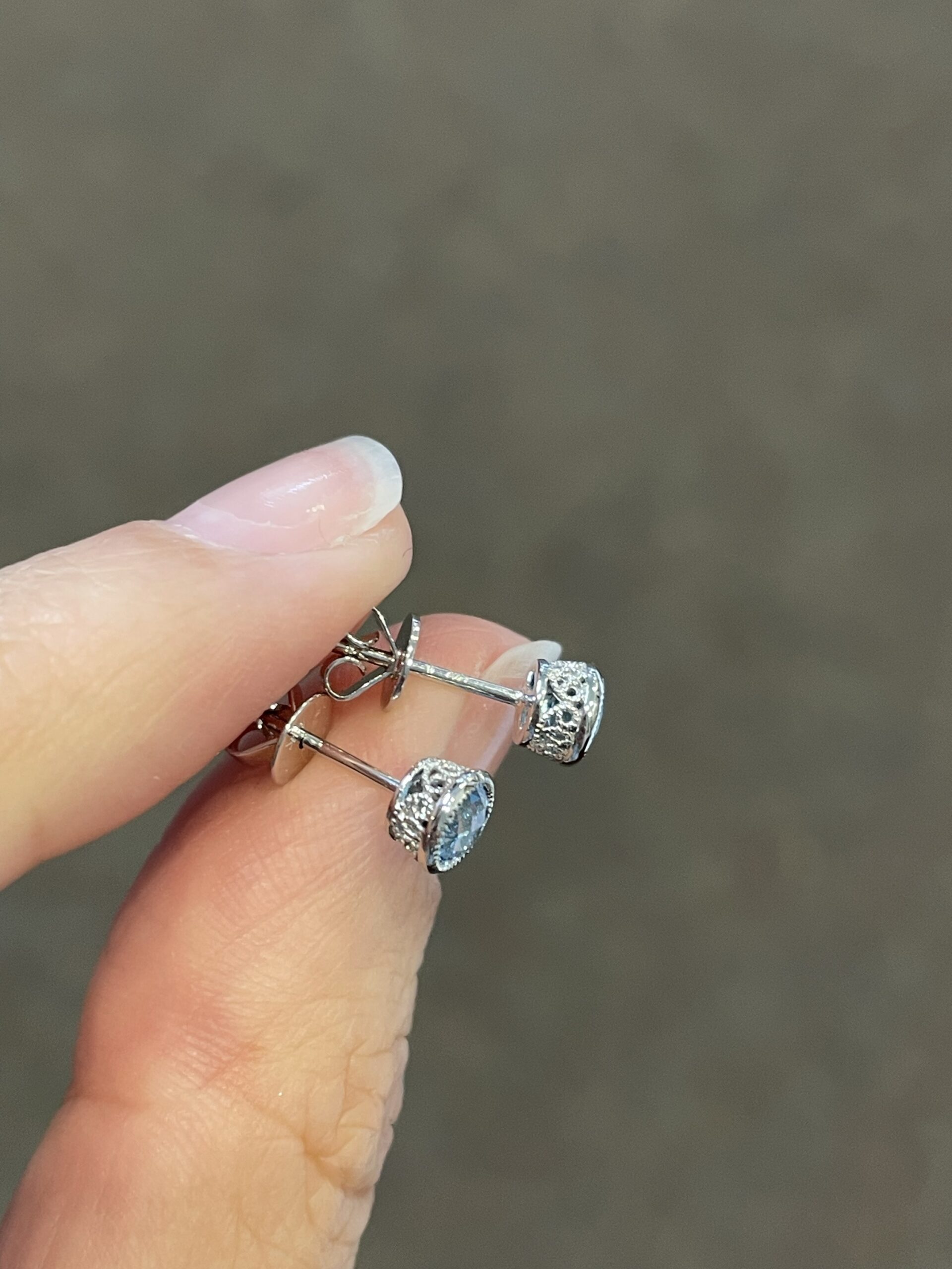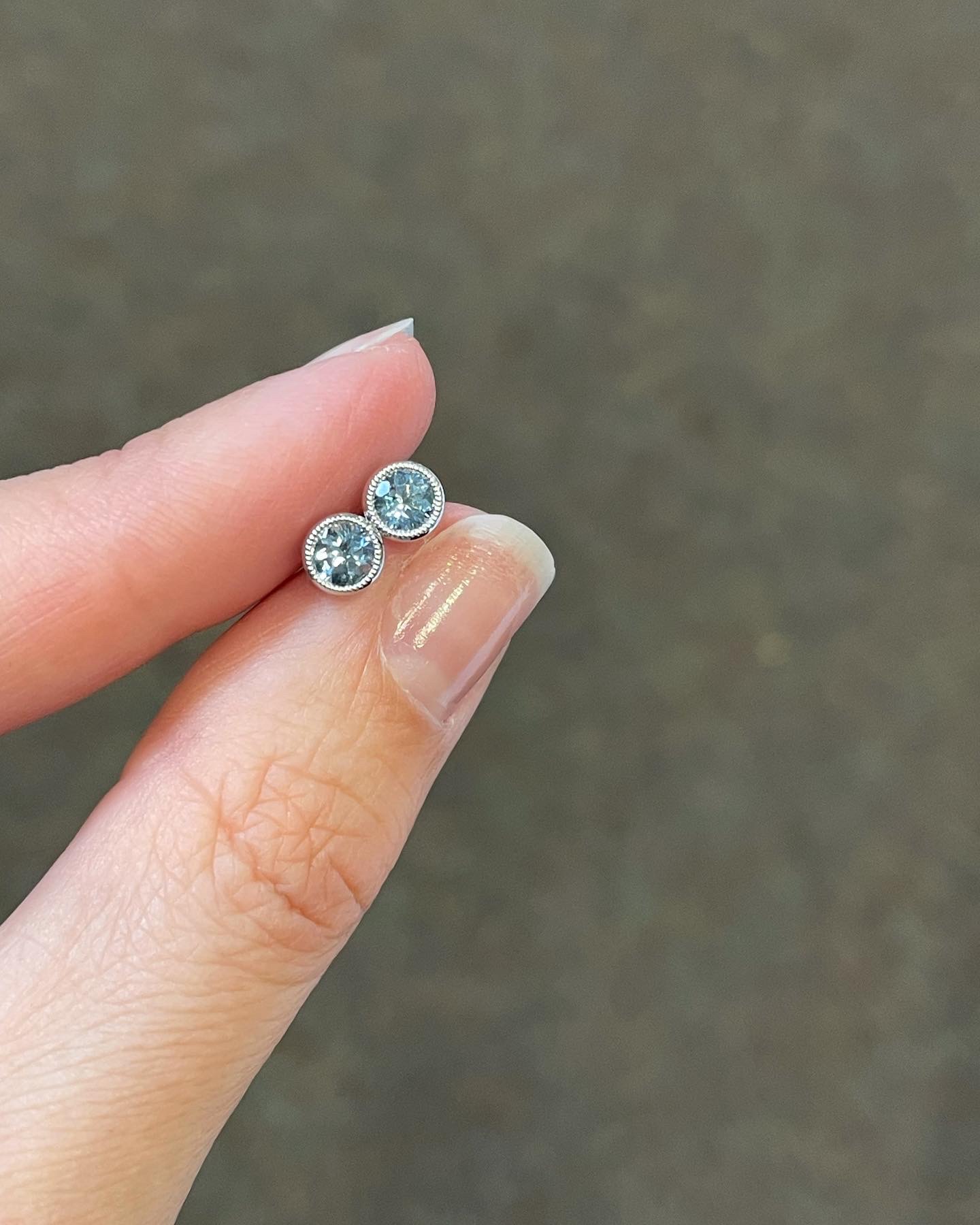 14k white gold round, faceted, bezel set genuine .44 Cttw Aquamarine (March birthstone) 5 mm stud earrings, enhanced with filigree and mill grain details.