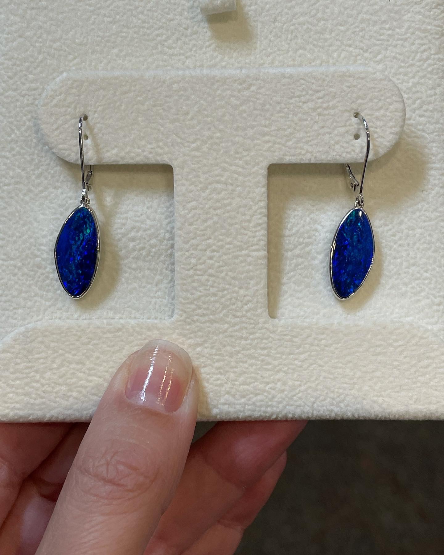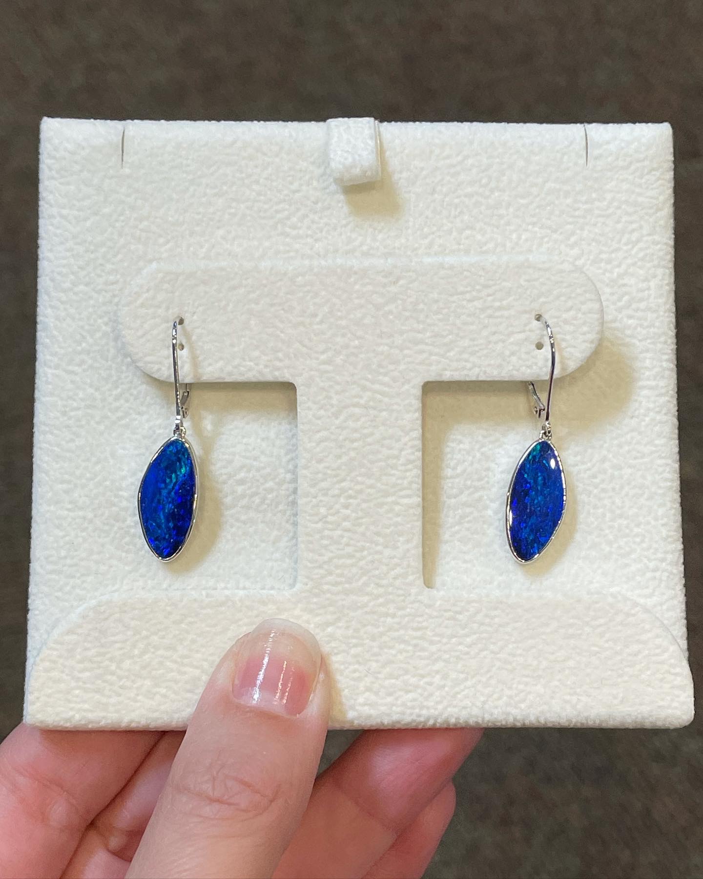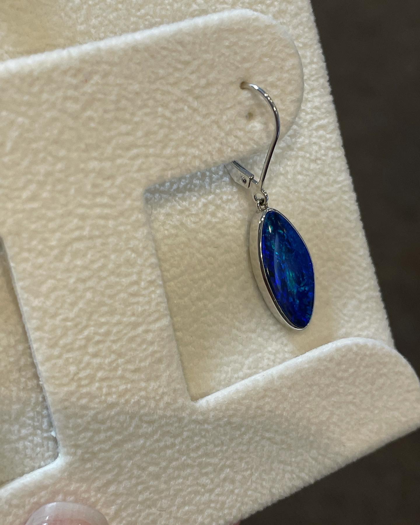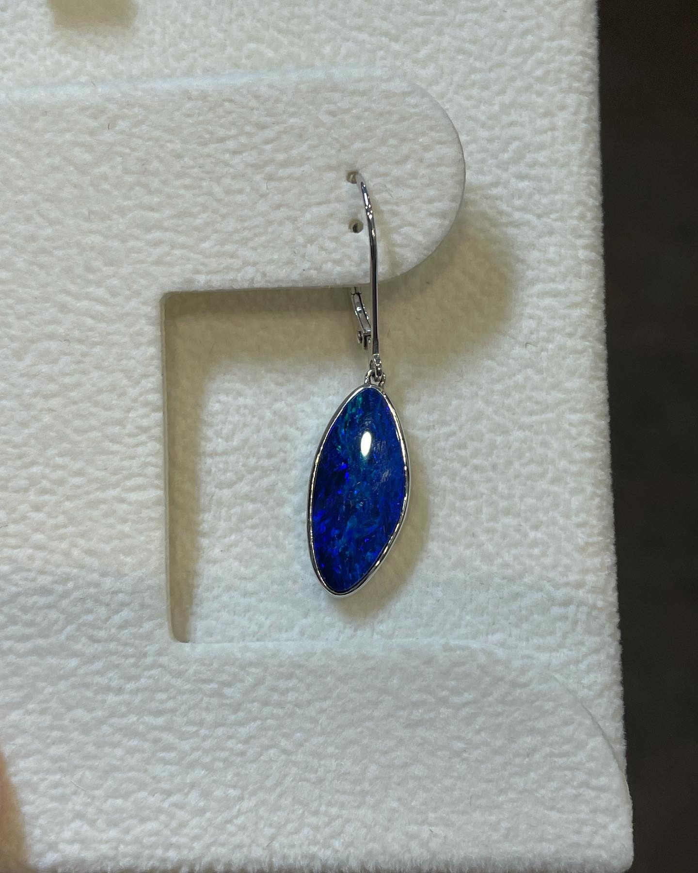 14k white gold genuine 5.52 Cttw Opal Doublet (Opal backed by a genuine Onyx behind it) bezel set lever back dangle earrings. These earrings have an entire weight of 3.5 grams.