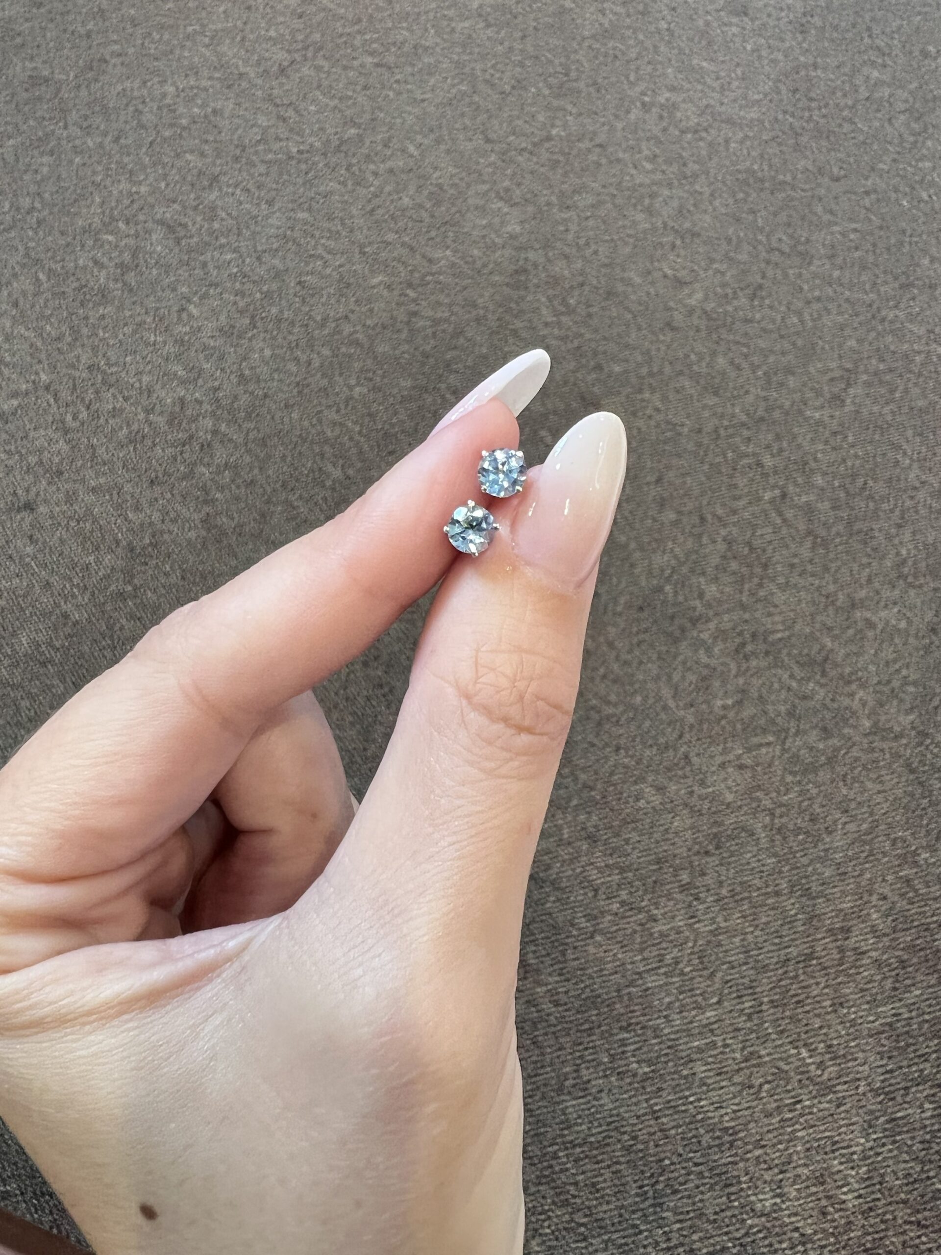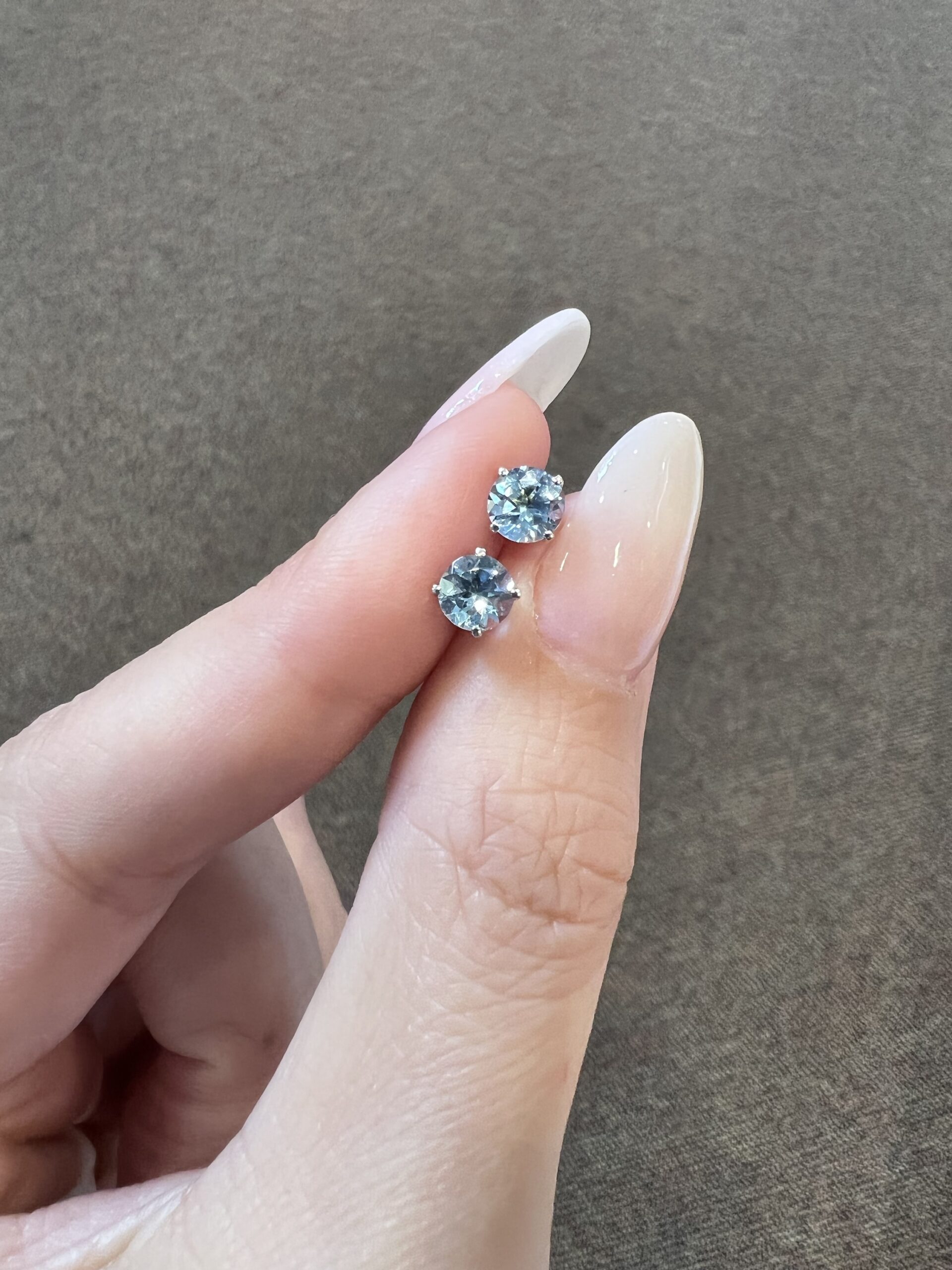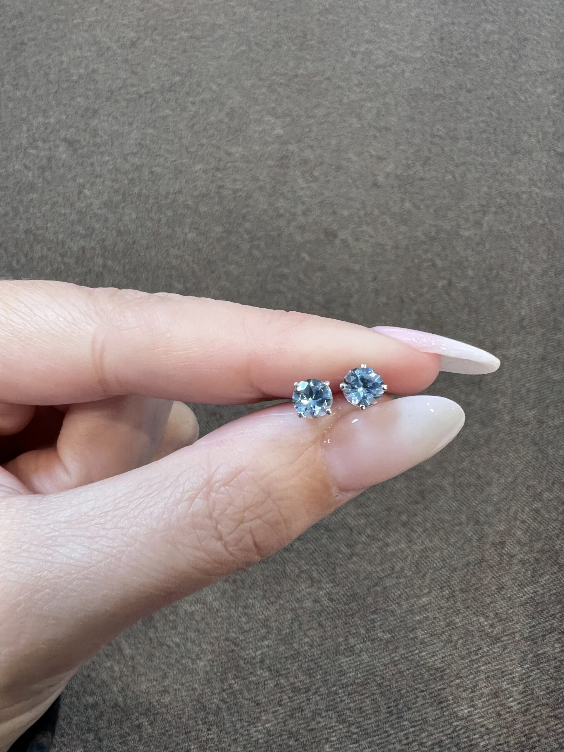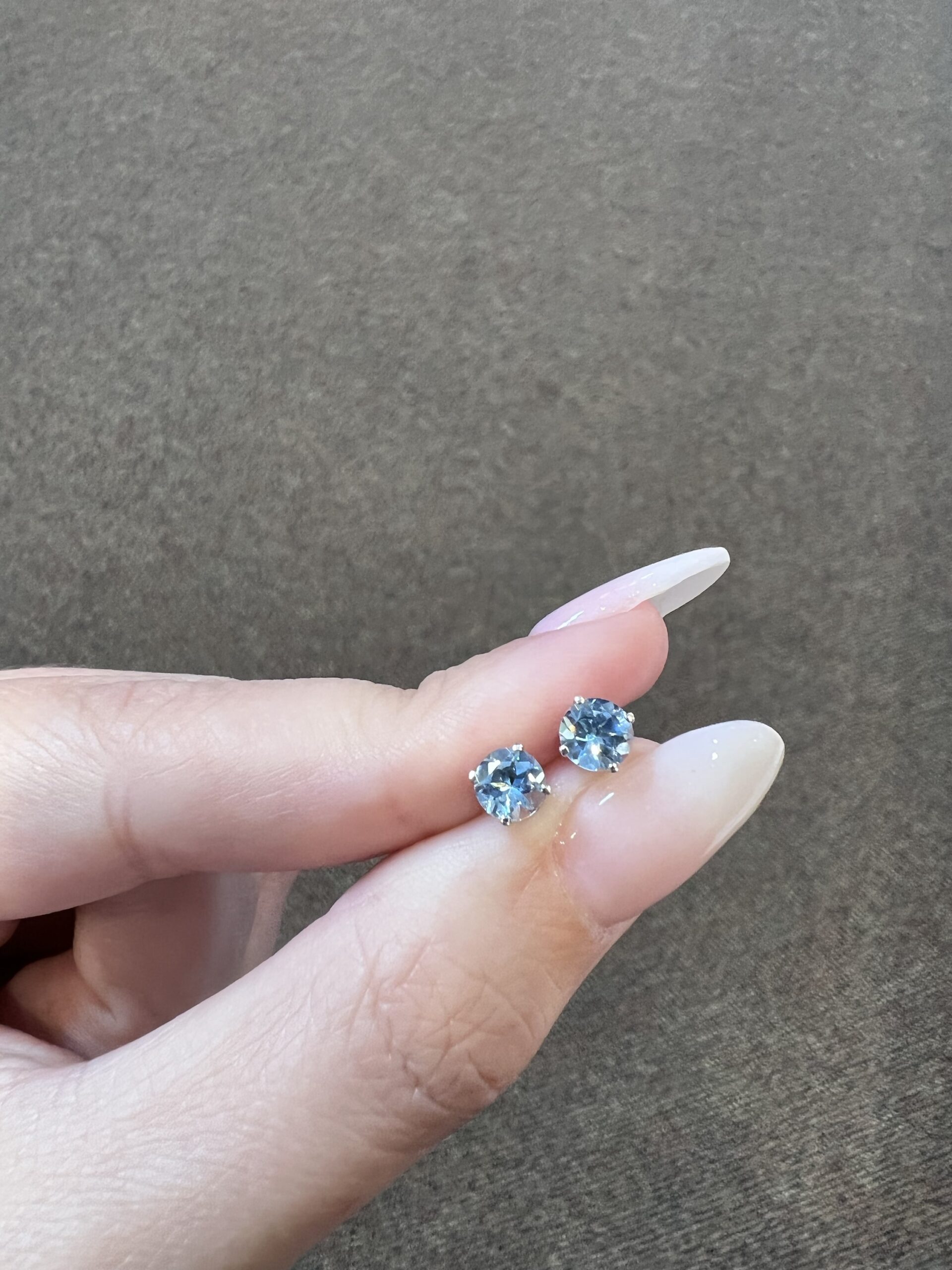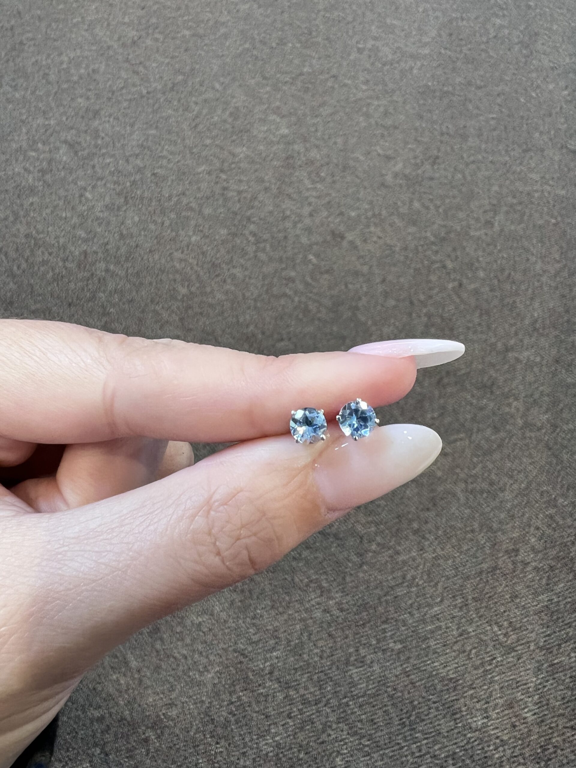 14k white gold genuine round, faceted 5 mm Aquamarine stud earrings. These earrings have an entire weight of 1.1 grams.