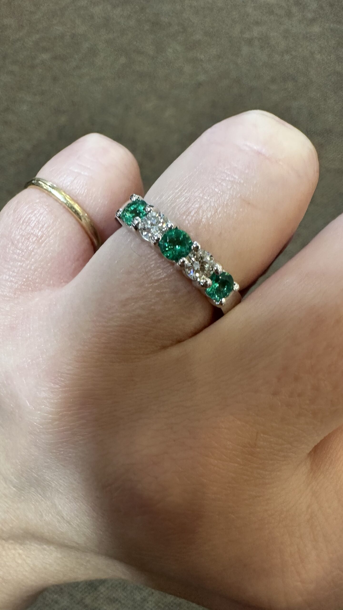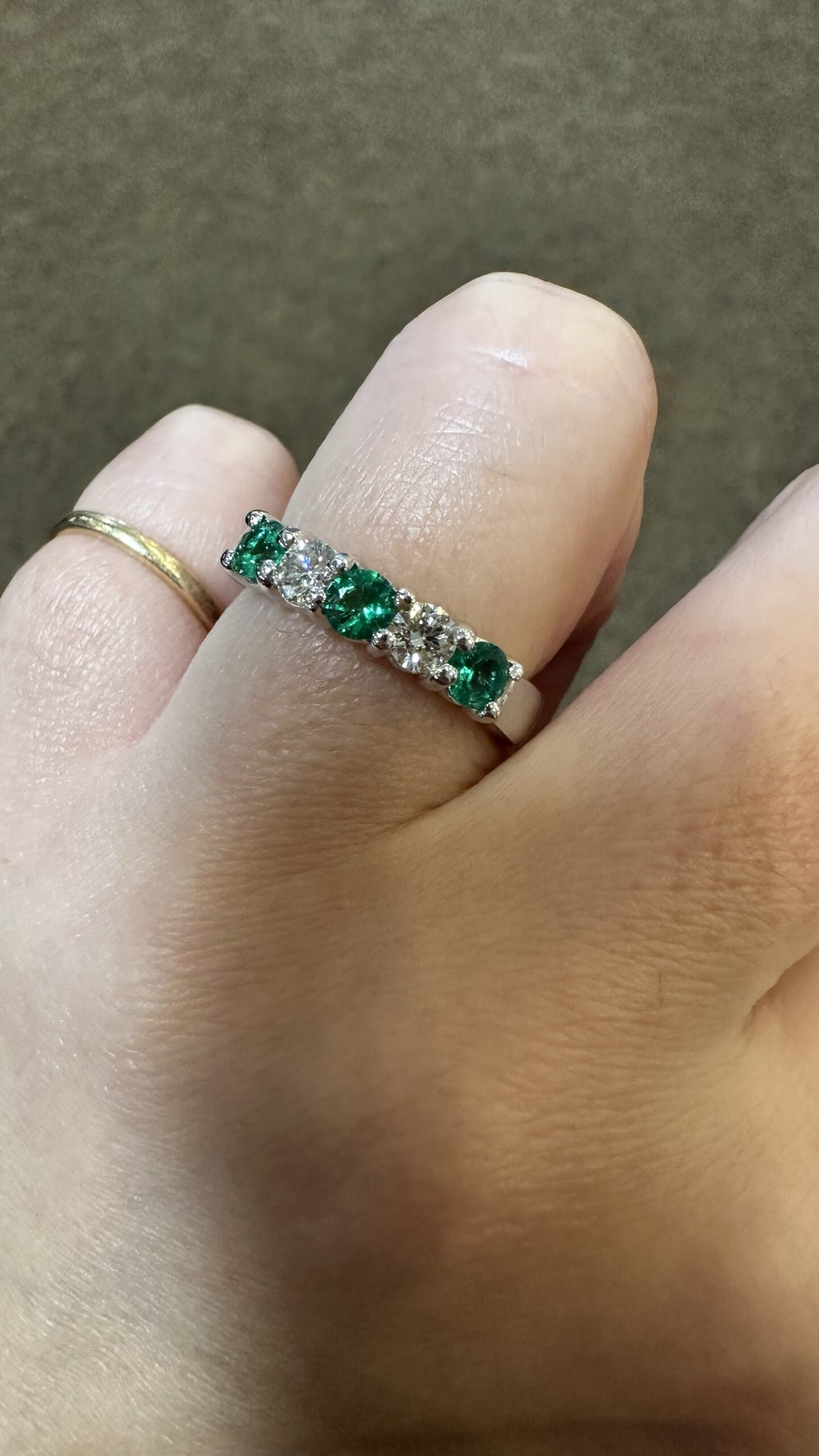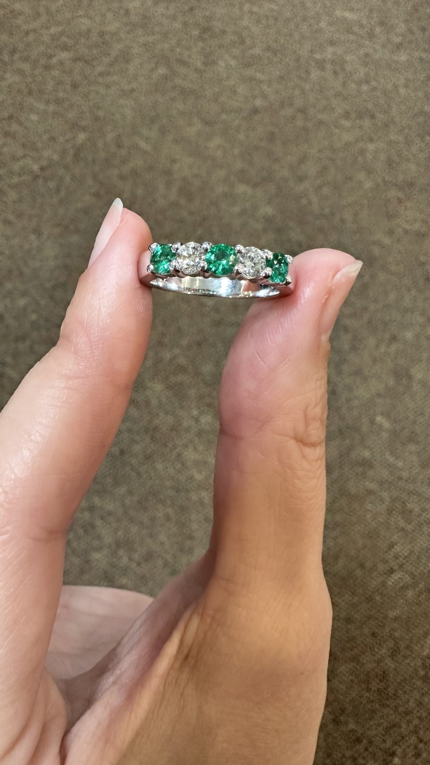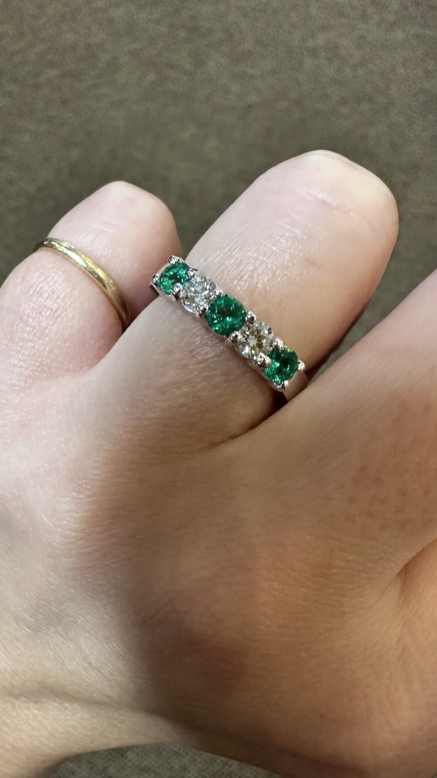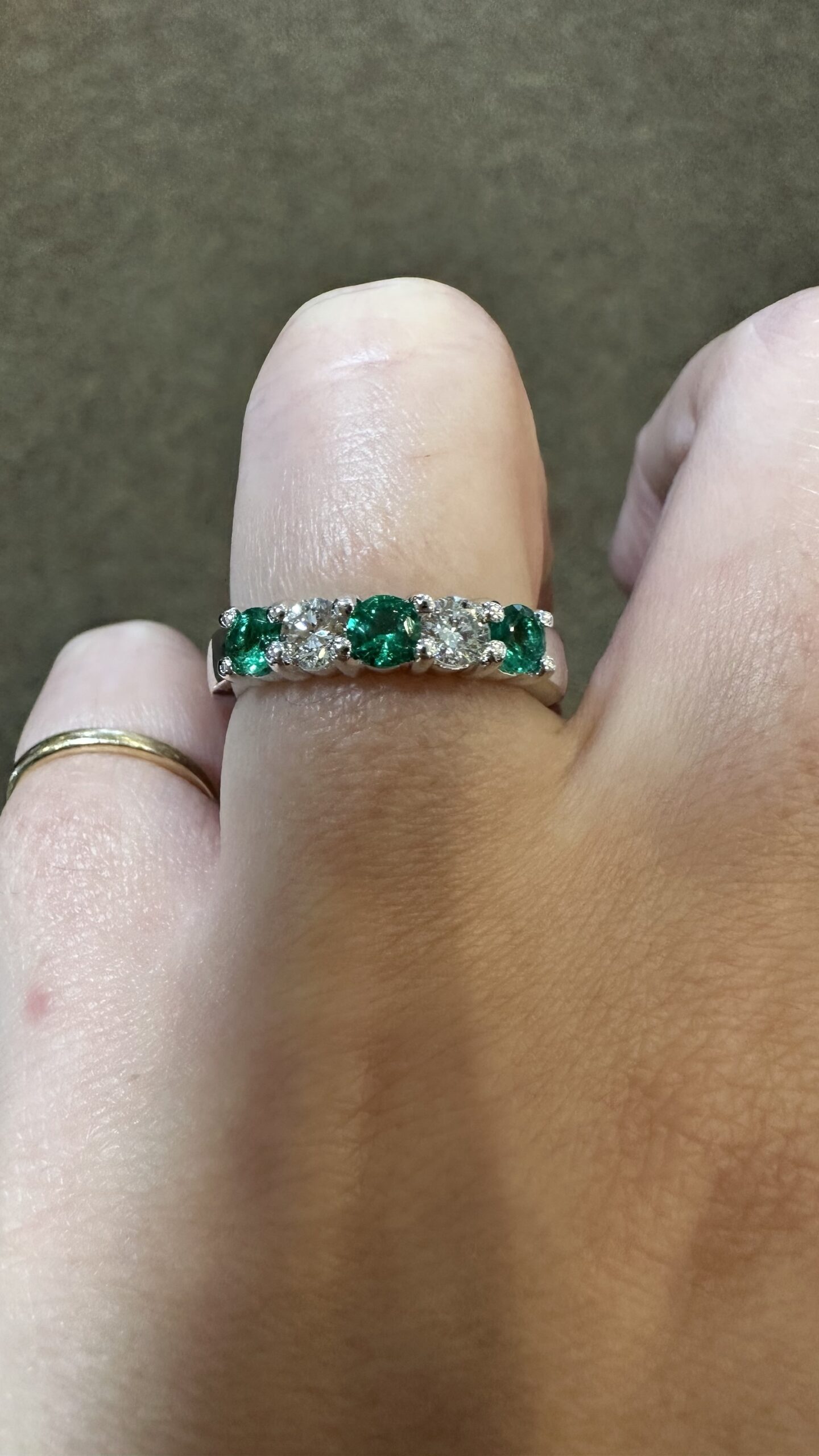 14k white gold genuine Emerald and diamond 5 stone shared prong band. This band contains three genuine round, faceted Emeralds, which have a total combined weight of .51 cttw. These Emeralds have vivid light to medium green color, and are set alternately with two genuine Round Brilliant Cut diamonds which have a total combined weight of .38 cttw. These diamonds average G-H in color and SI in clarity. These gemstones are all nicely proportioned and well finished. This ring has an entire weight of 4.7 grams. This ring is a finger size 7 1/2, but it can be reasonably sized. Please make note of the finger size needed in the comments section at checkout.