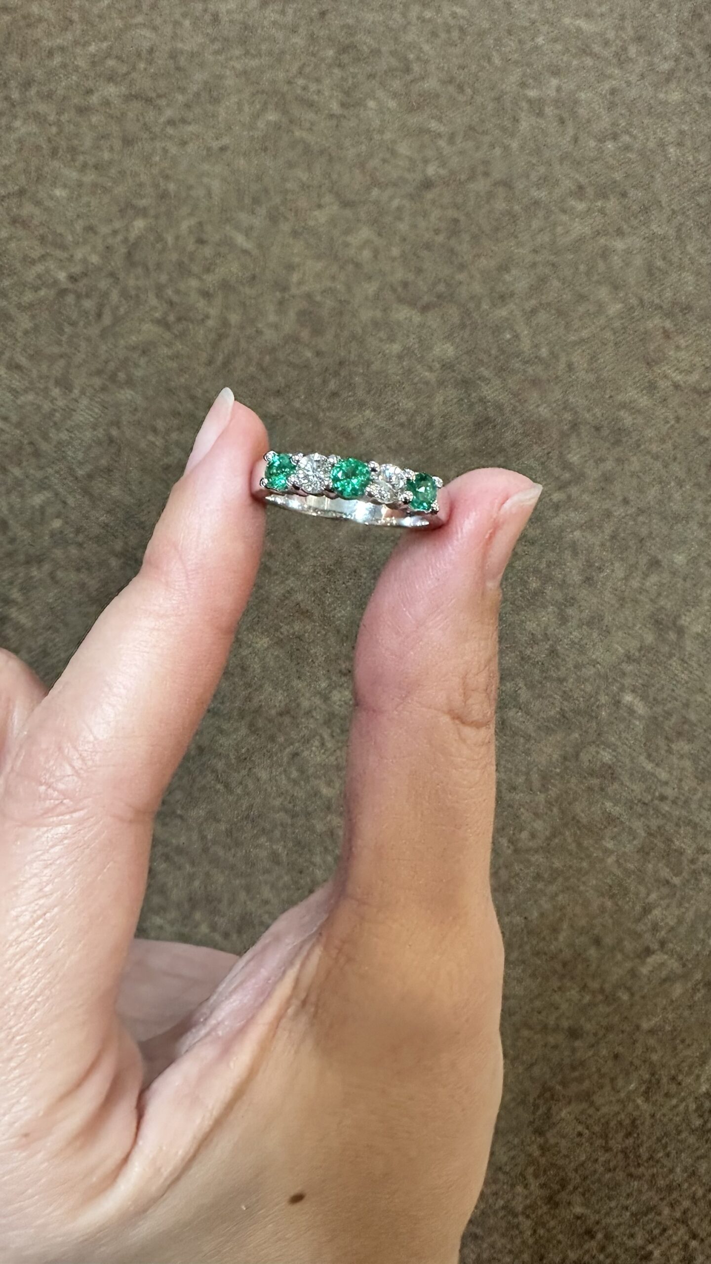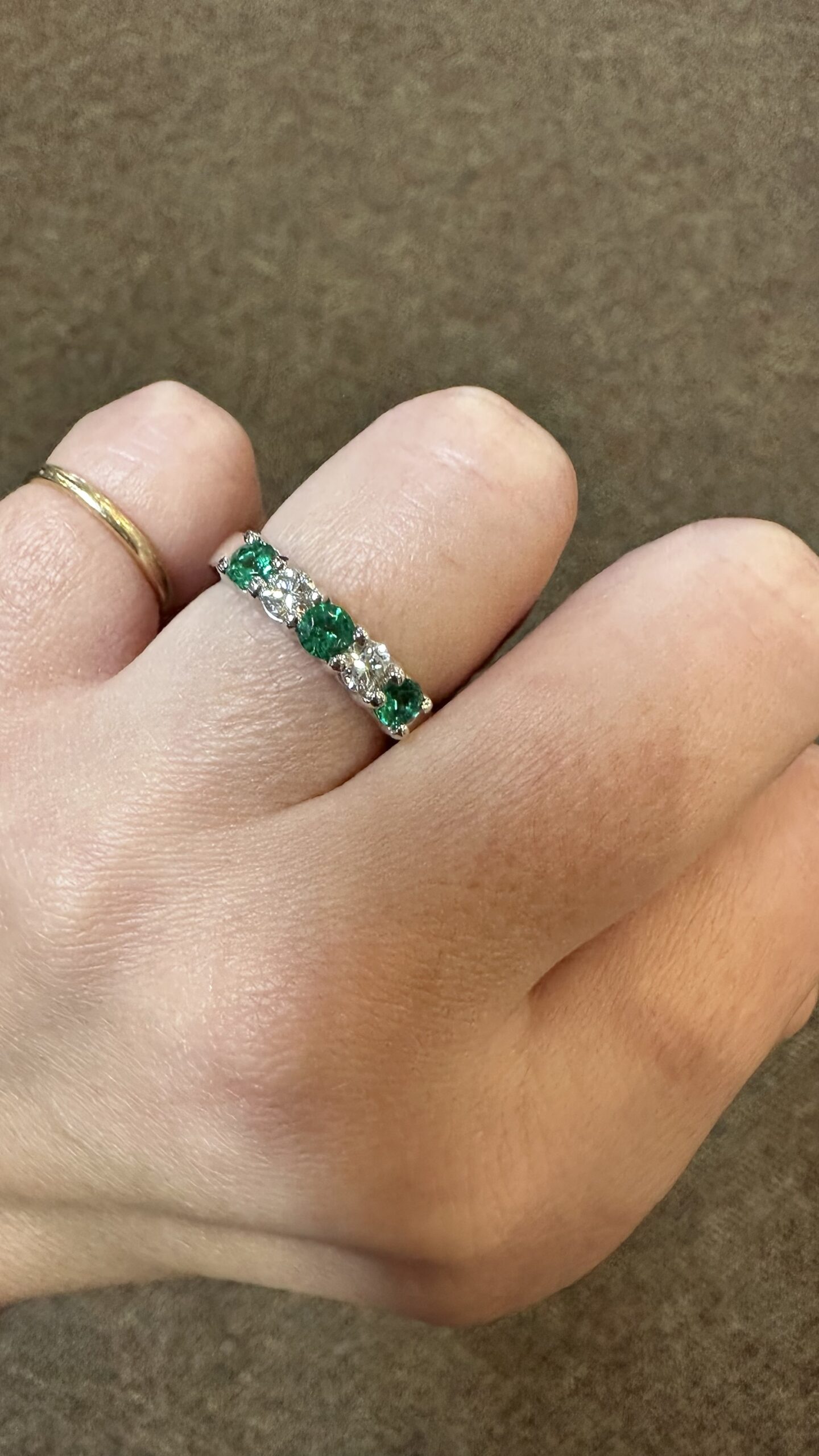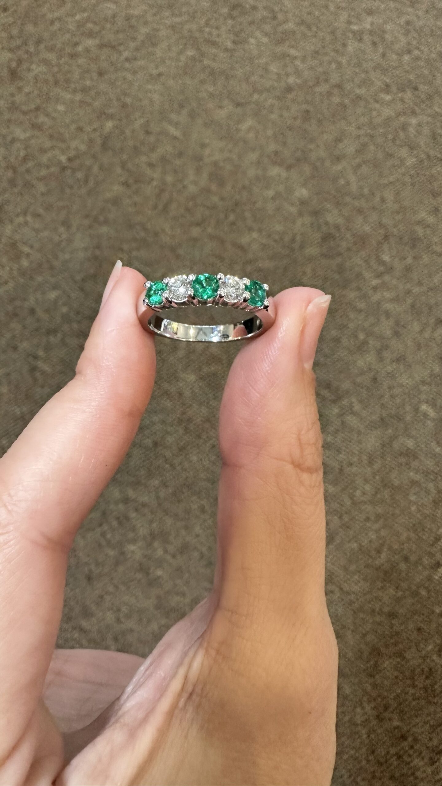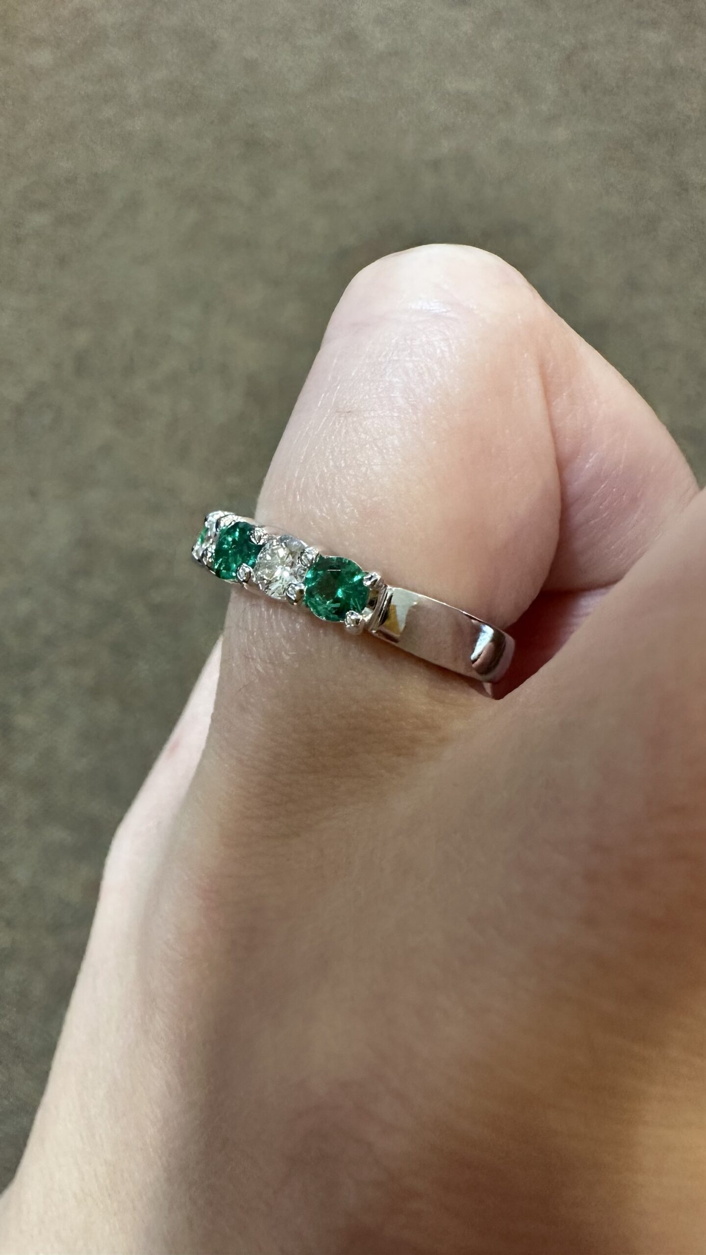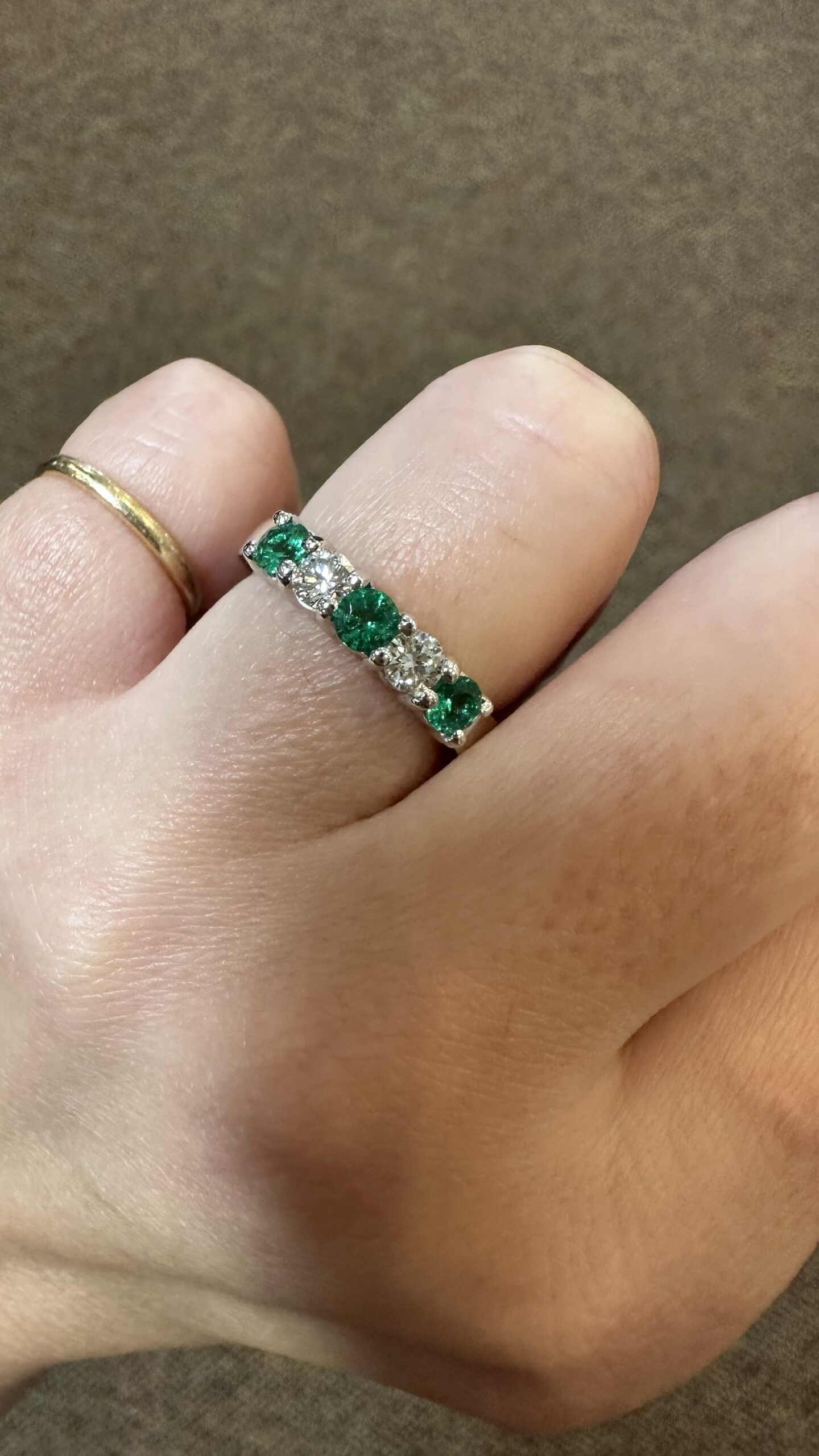14k white gold genuine Emerald and diamond 5 stone shared prong band. This band contains three genuine round, faceted Emeralds, which have a total combined weight of .51 cttw. These Emeralds have vivid light to medium green color, and are set alternately with two genuine Round Brilliant Cut diamonds which have a total combined weight of .38 cttw. These diamonds average G-H in color and SI in clarity. These gemstones are all nicely proportioned and well finished. This ring has an entire weight of 4.7 grams. This ring is a finger size 7 1/2, but it can be reasonably sized. Please make note of the finger size needed in the comments section at checkout.