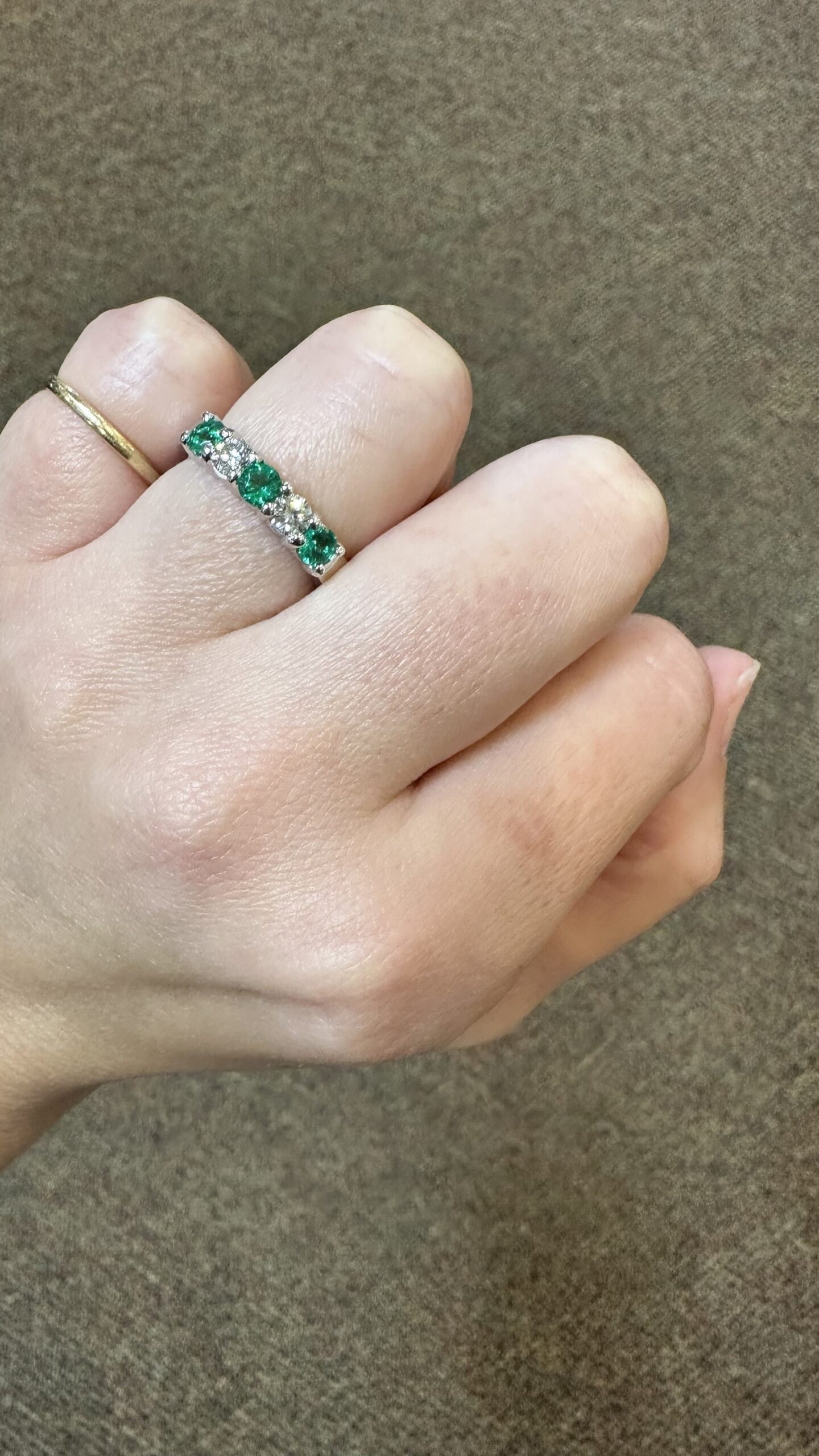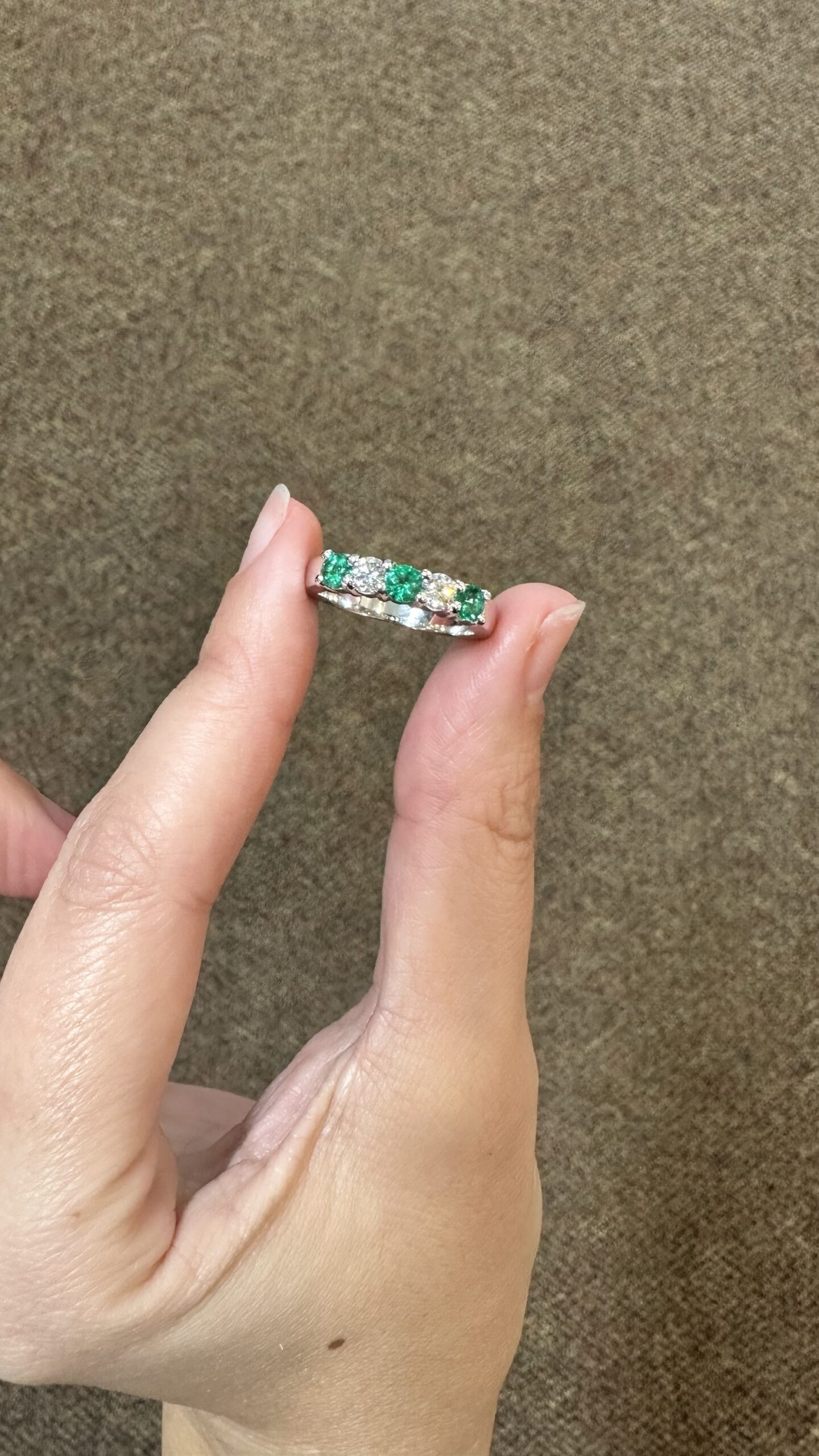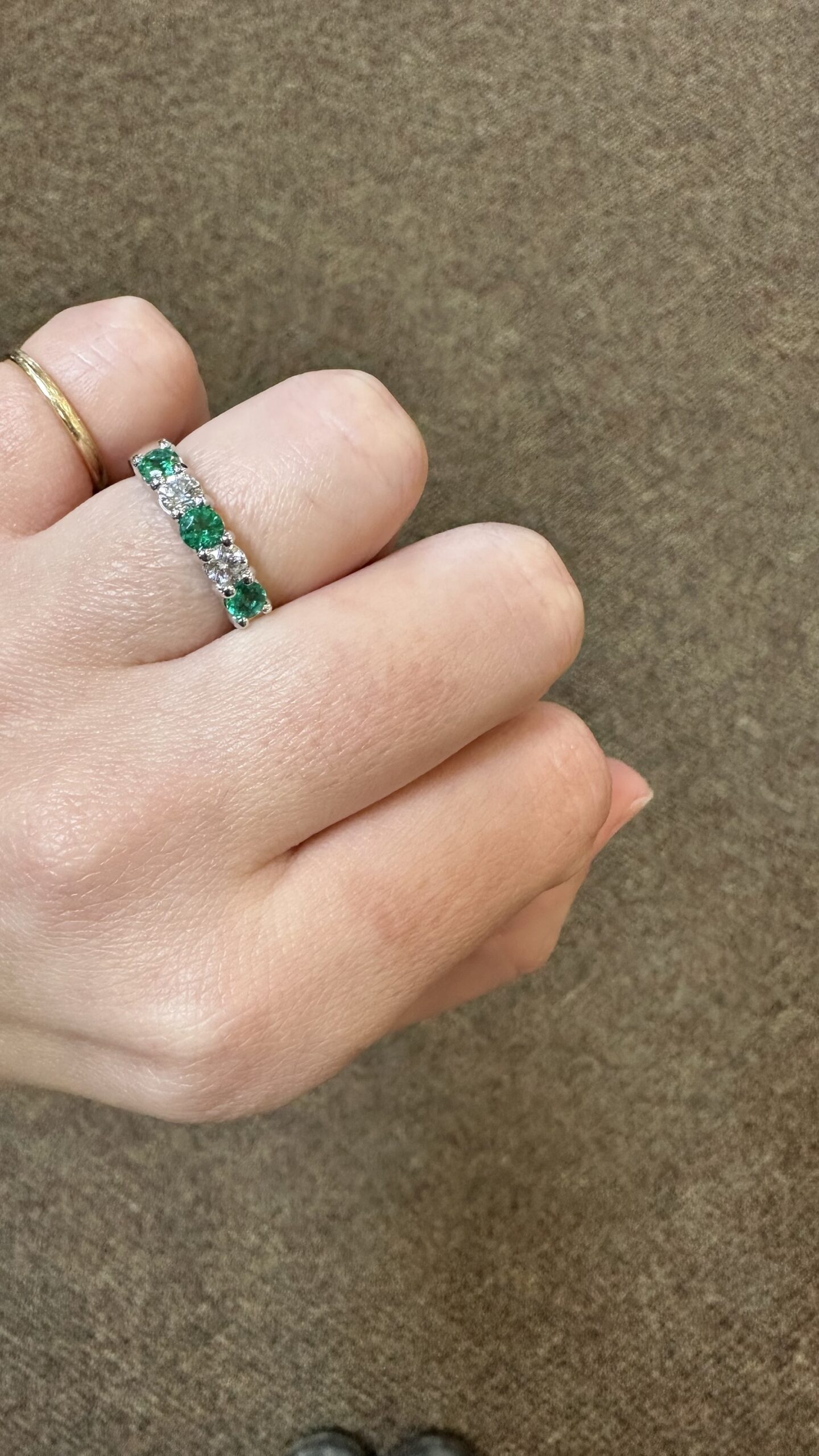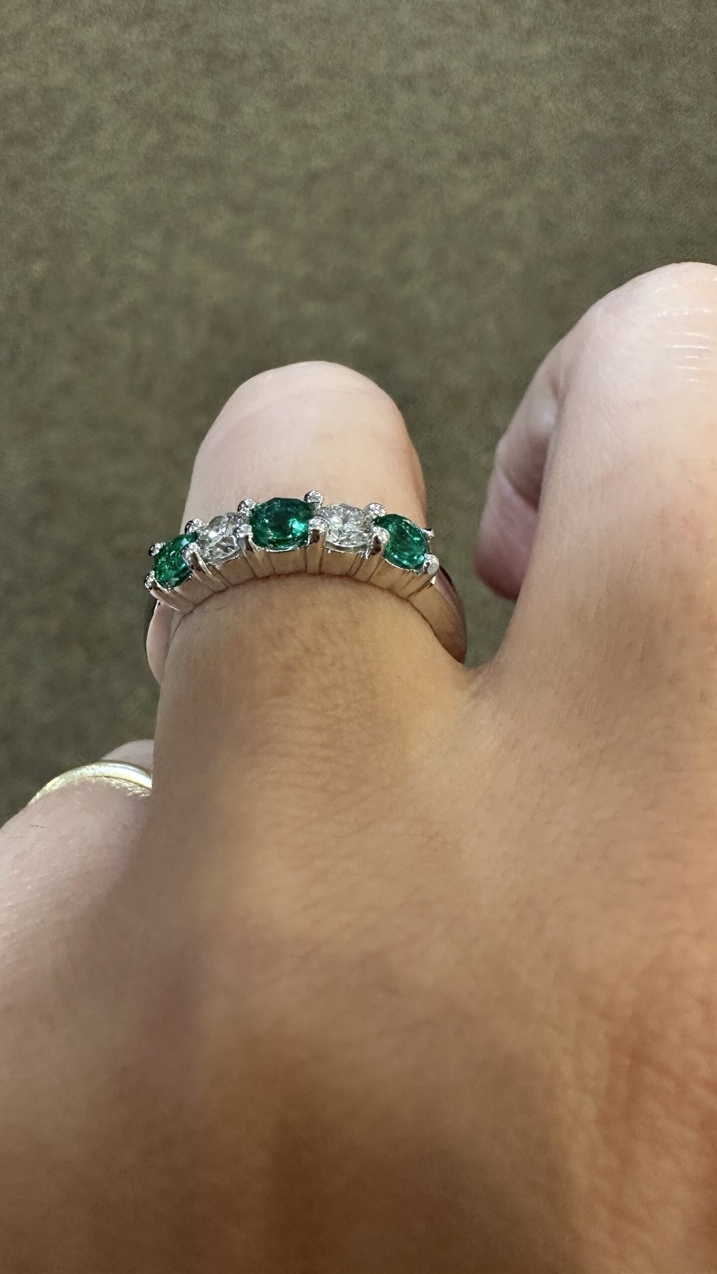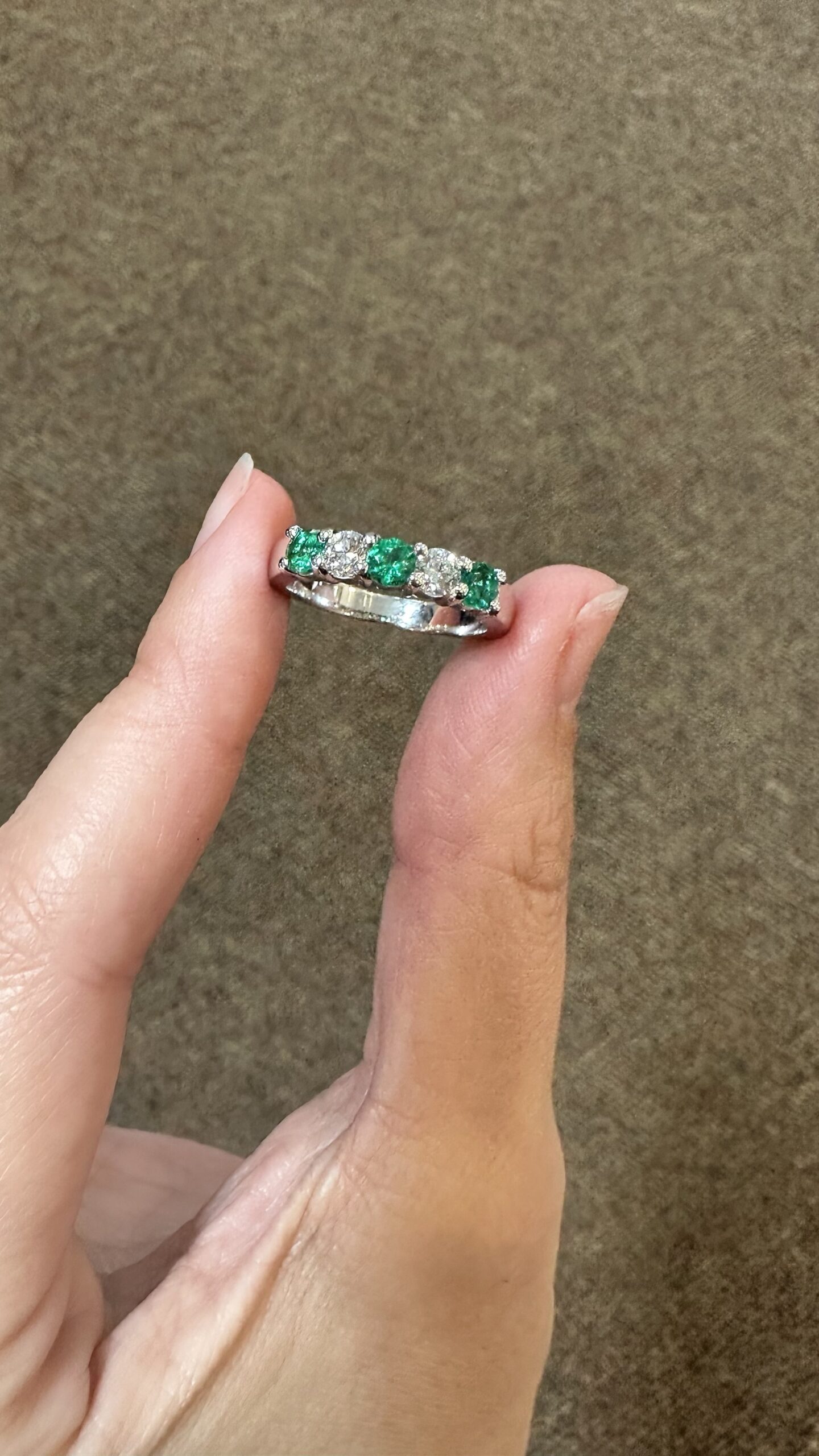 14k white gold genuine Emerald and diamond 5 stone shared prong band. This band contains three genuine round, faceted Emeralds, which have a total combined weight of .51 cttw. These Emeralds have vivid light to medium green color, and are set alternately with two genuine Round Brilliant Cut diamonds which have a total combined weight of .38 cttw. These diamonds average G-H in color and SI in clarity. These gemstones are all nicely proportioned and well finished. This ring has an entire weight of 4.7 grams. This ring is a finger size 7 1/2, but it can be reasonably sized. Please make note of the finger size needed in the comments section at checkout.