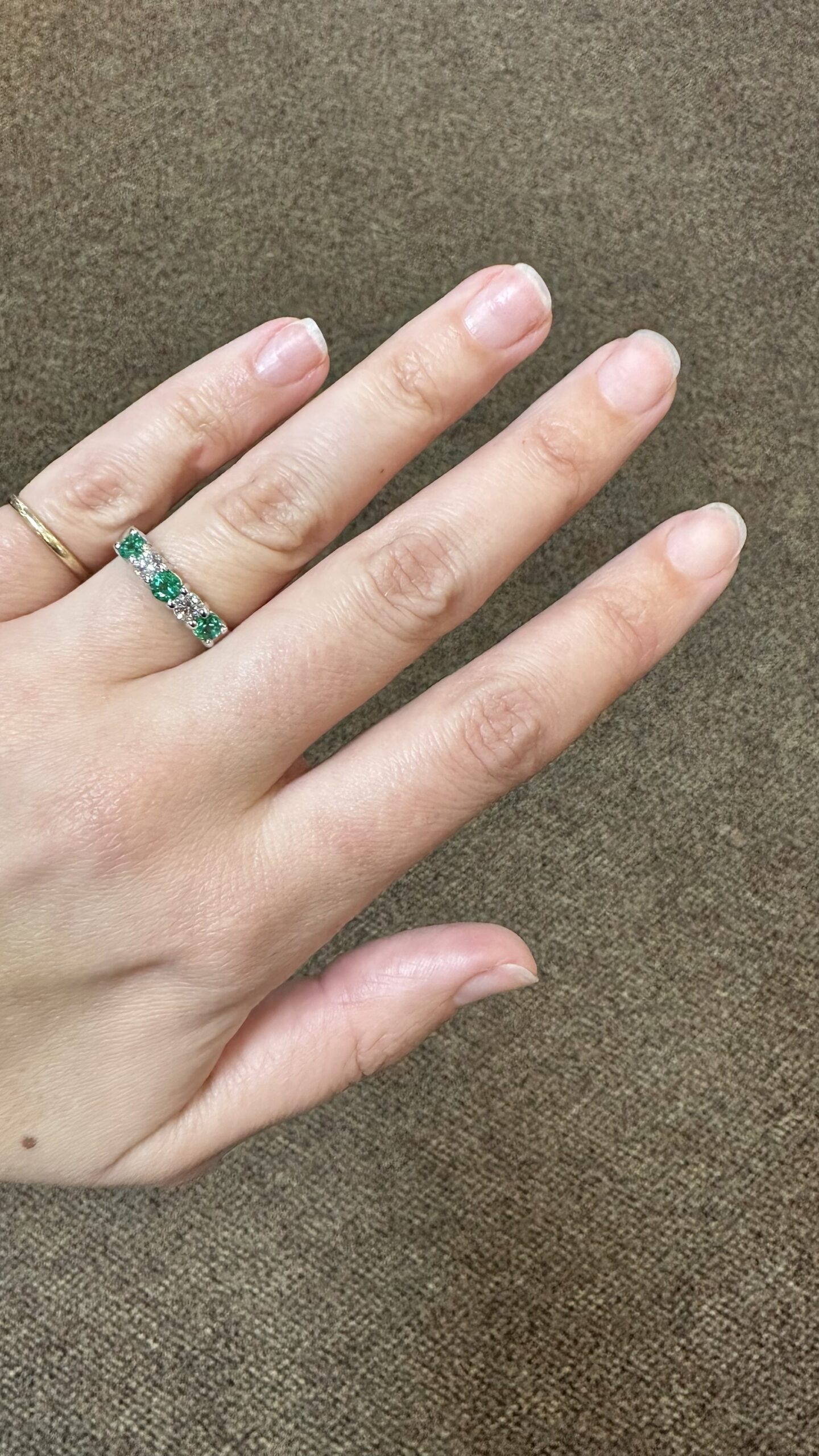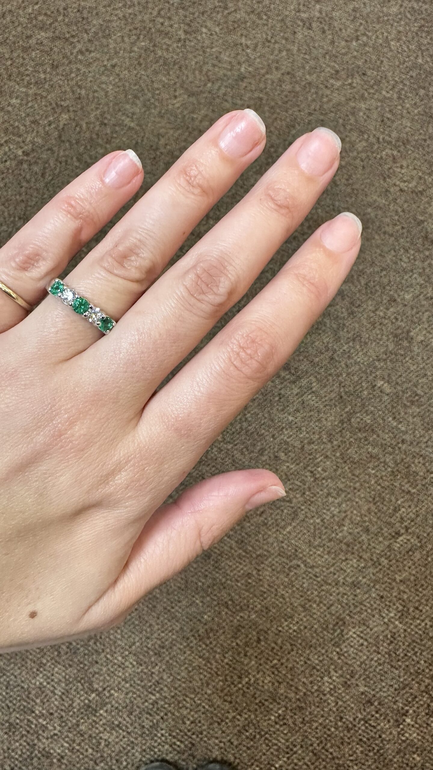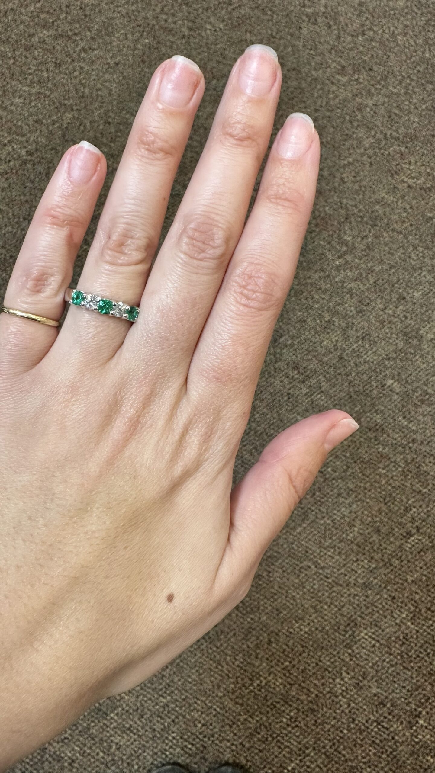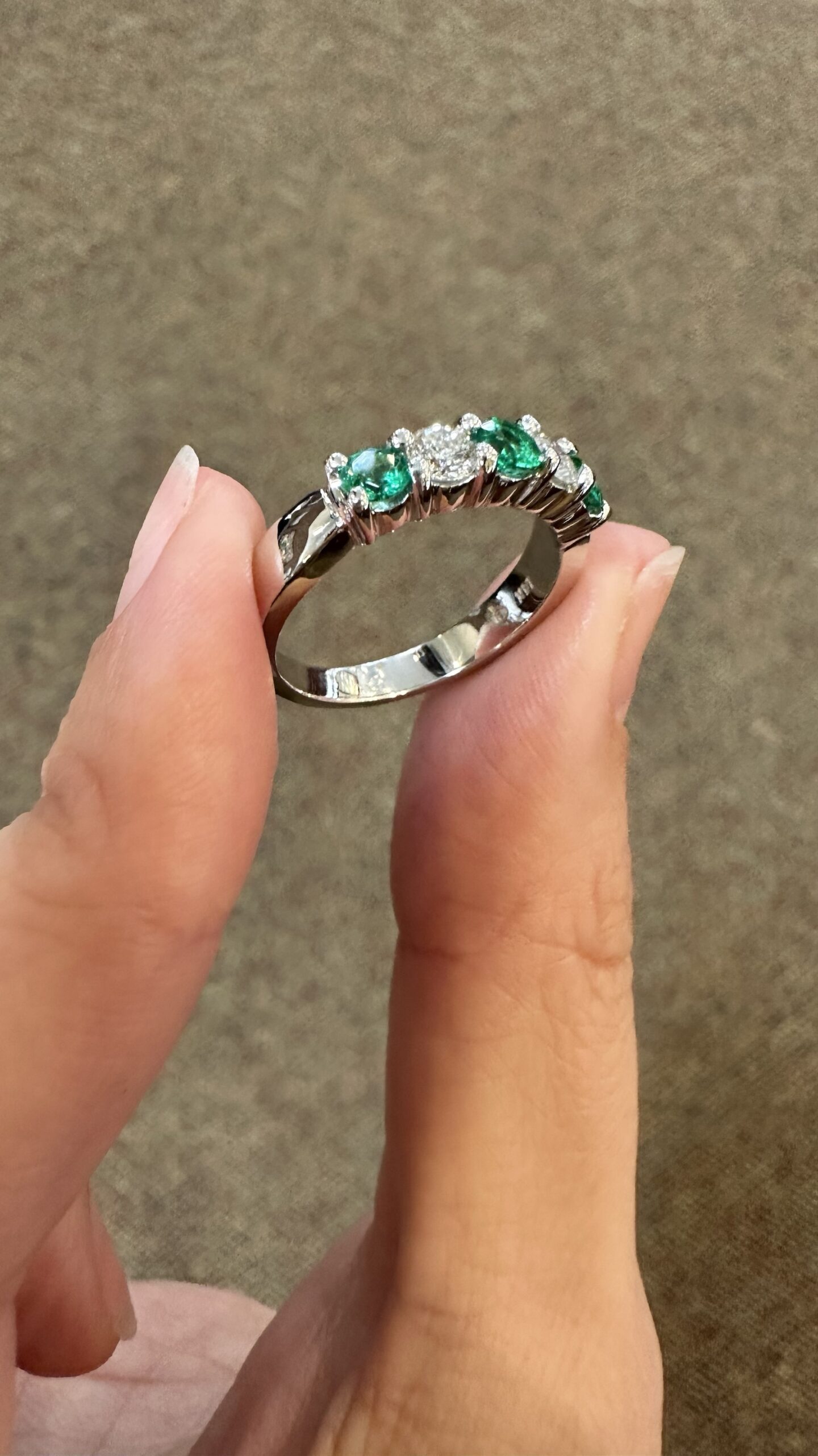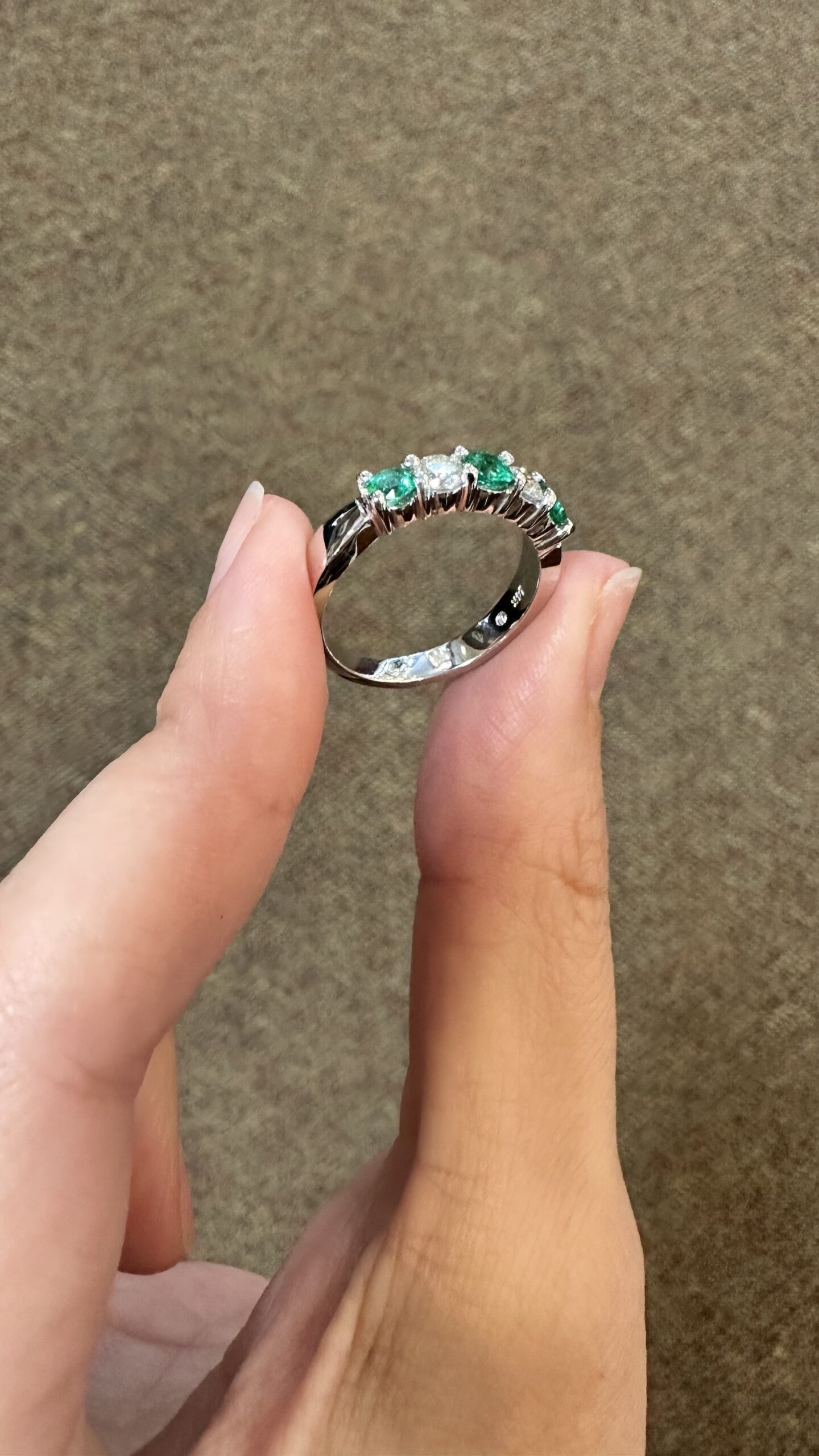 14k white gold genuine Emerald and diamond 5 stone shared prong band. This band contains three genuine round, faceted Emeralds, which have a total combined weight of .51 cttw. These Emeralds have vivid light to medium green color, and are set alternately with two genuine Round Brilliant Cut diamonds which have a total combined weight of .38 cttw. These diamonds average G-H in color and SI in clarity. These gemstones are all nicely proportioned and well finished. This ring has an entire weight of 4.7 grams. This ring is a finger size 7 1/2, but it can be reasonably sized. Please make note of the finger size needed in the comments section at checkout.