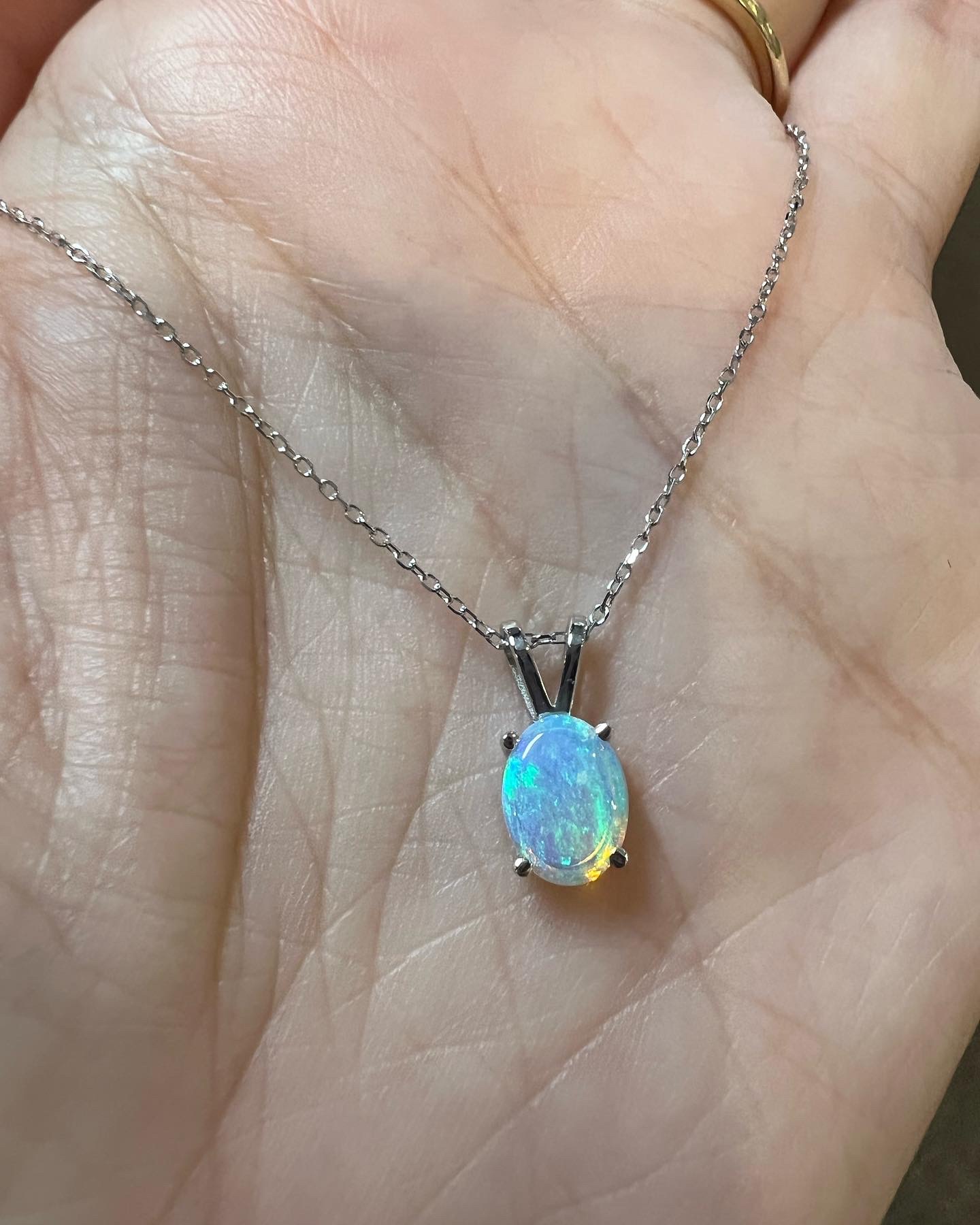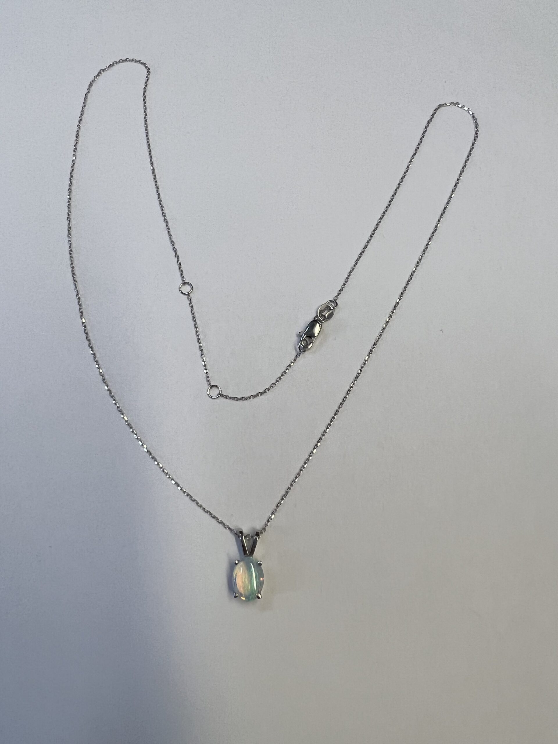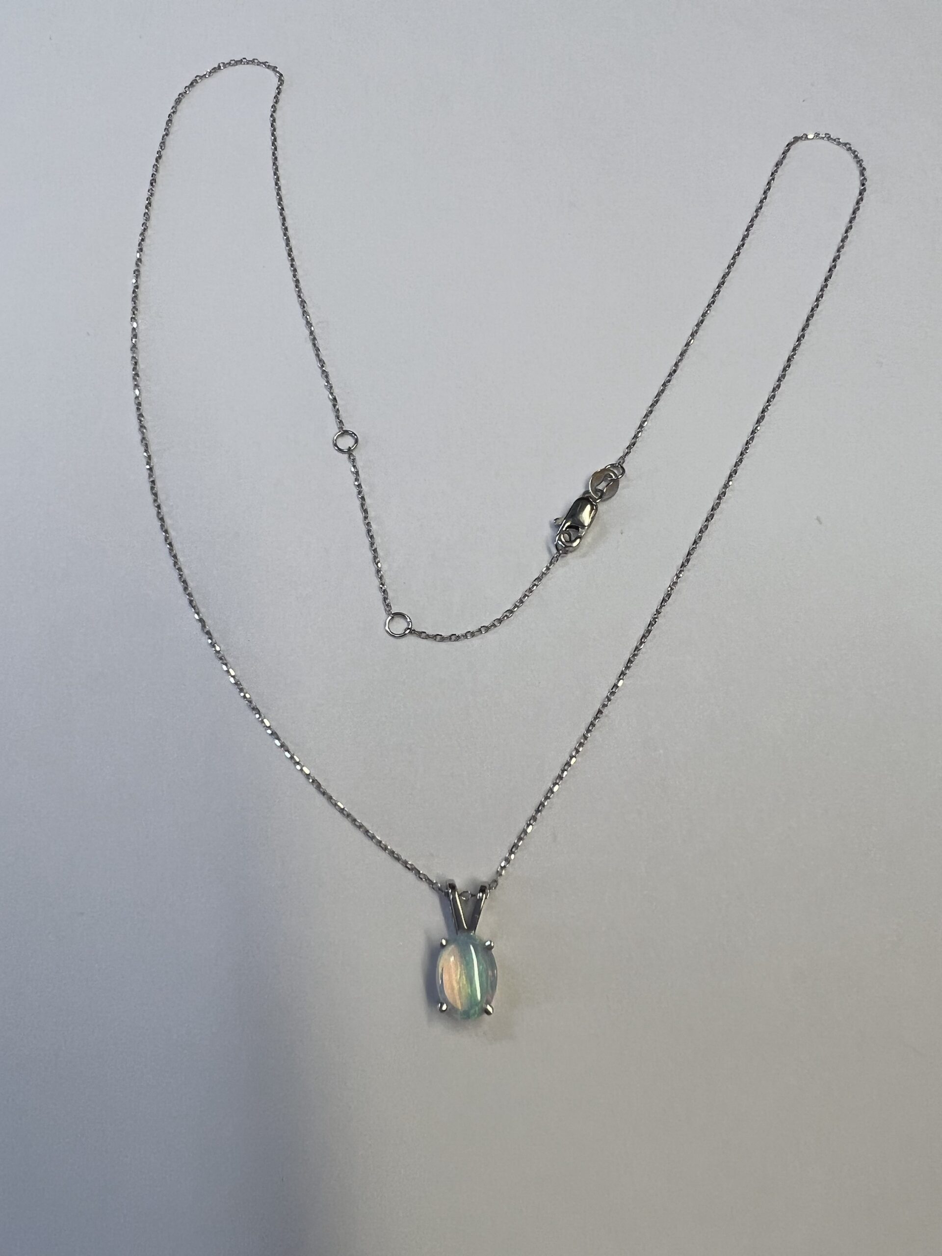 14k white gold oval shaped genuine .52 Cttw Opal (October birthstone) basket set pendant with rabbit ear bail. This pendant is suspended from an adjustable 14k white gold 16-18” forzantina chain with lobster claw clasp. This piece has an entire weight of 1.7 grams.