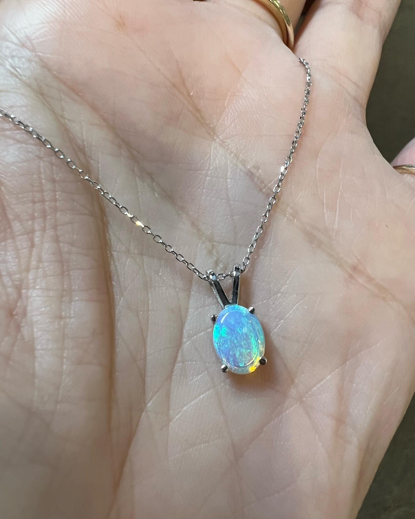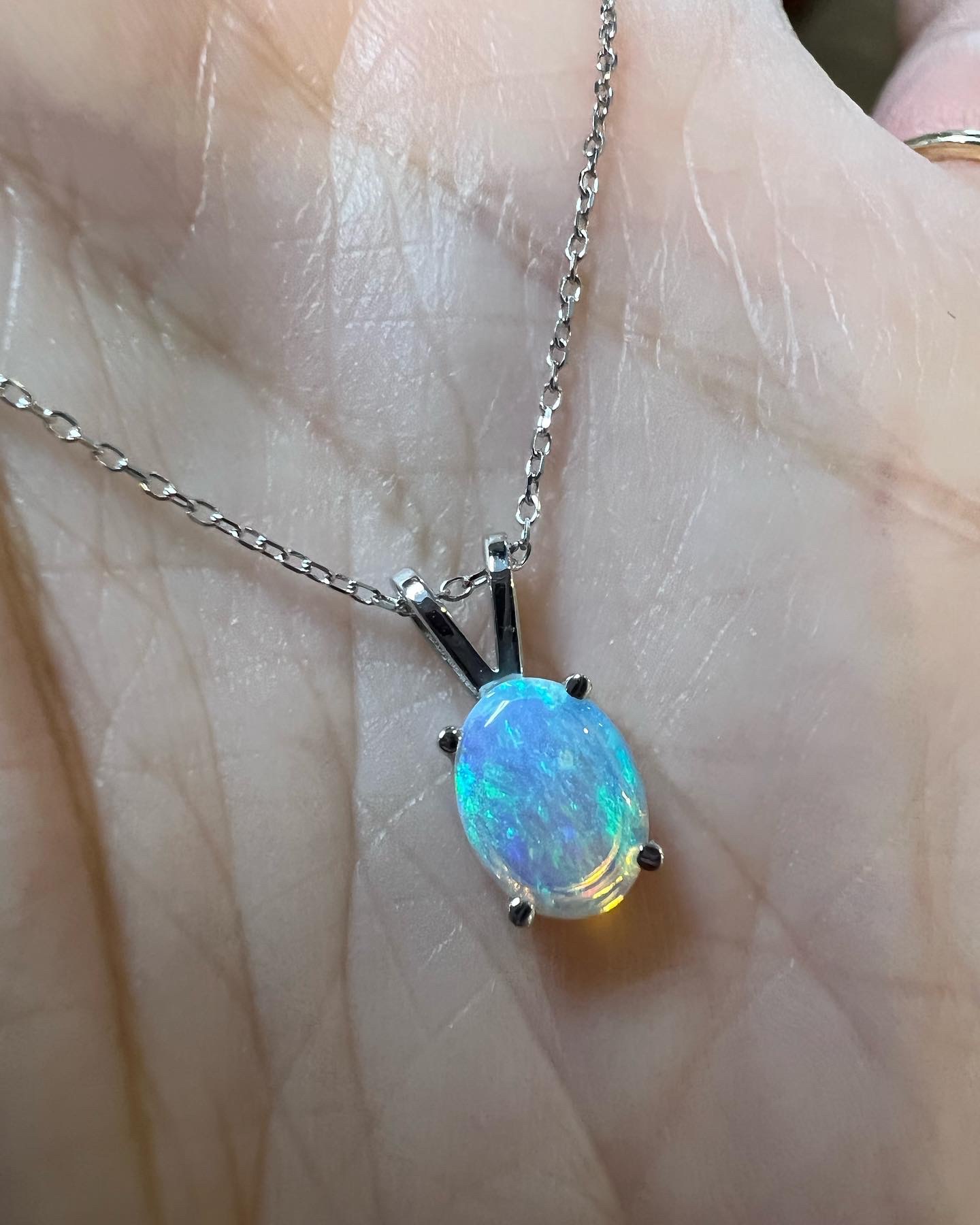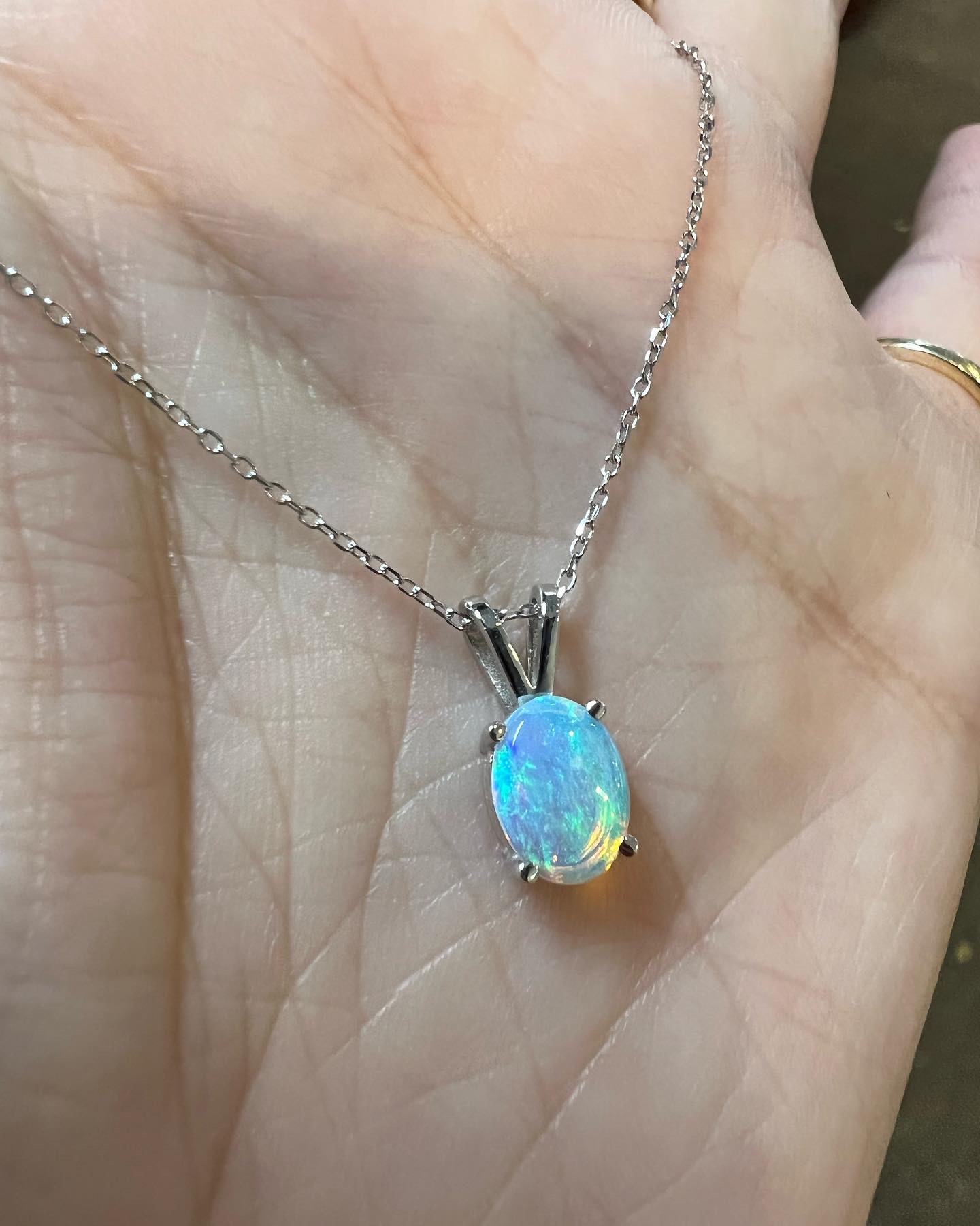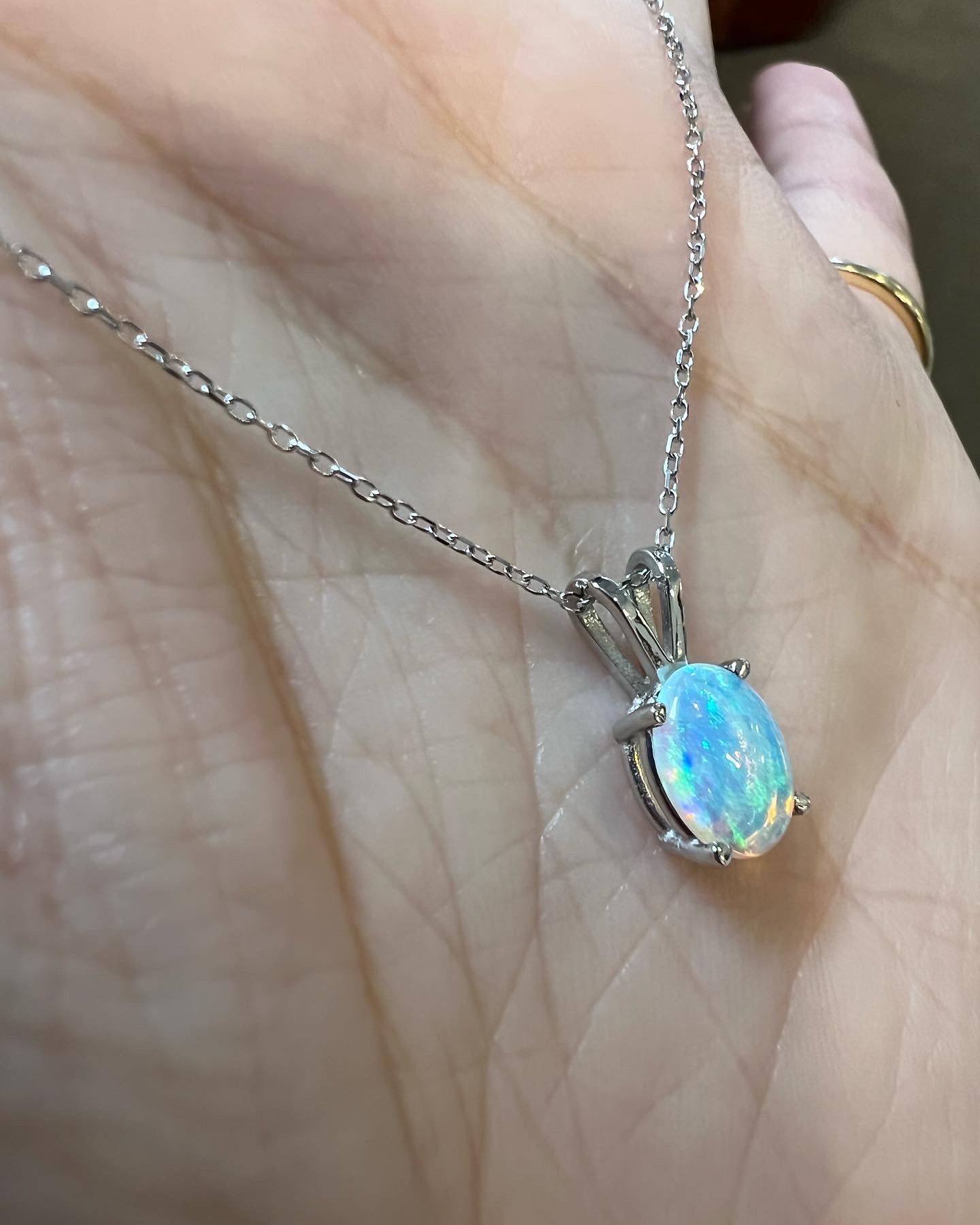 14k white gold oval shaped genuine .52 Cttw Opal (October birthstone) basket set pendant with rabbit ear bail. This pendant is suspended from an adjustable 14k white gold 16-18” forzantina chain with lobster claw clasp. This piece has an entire weight of 1.7 grams.