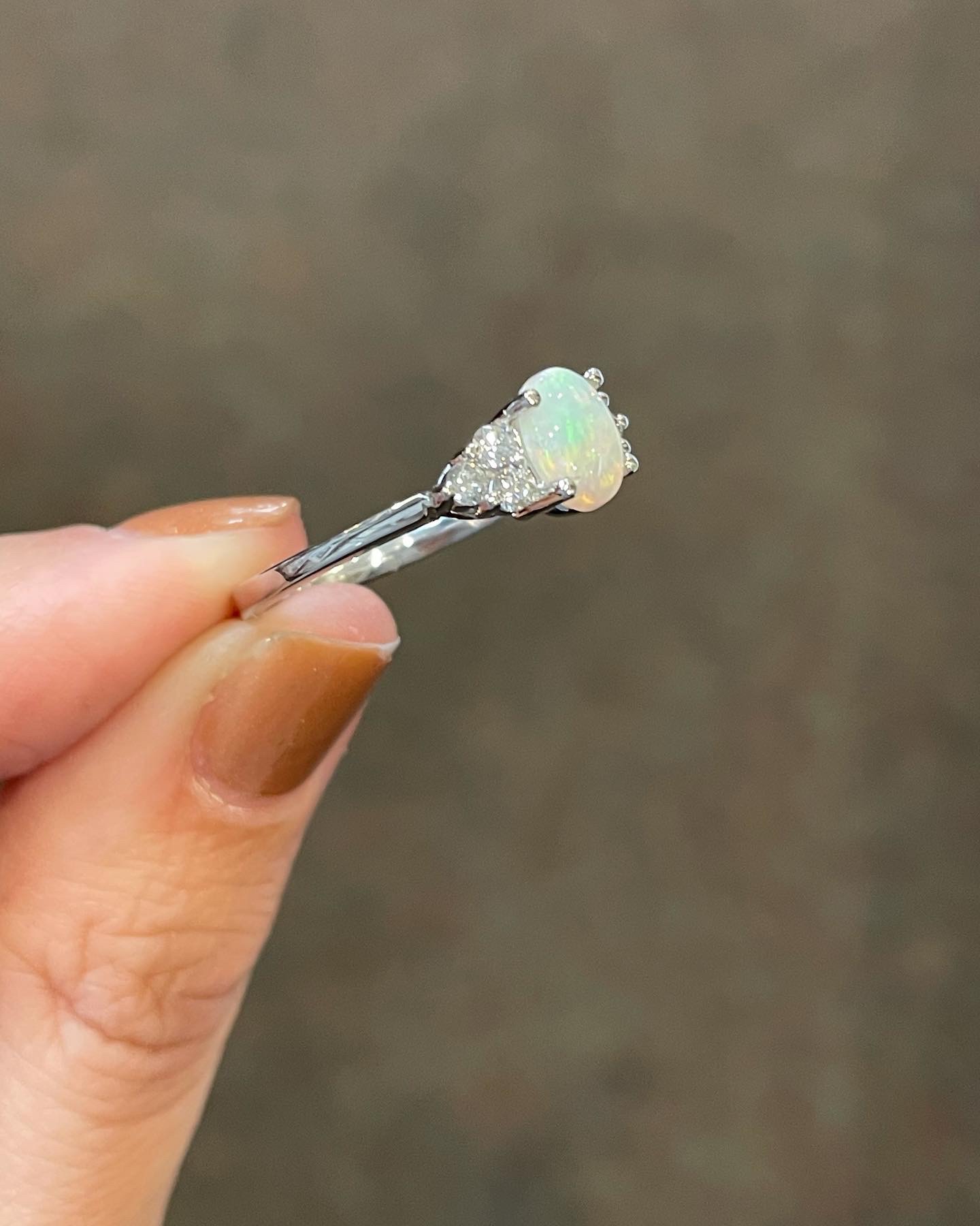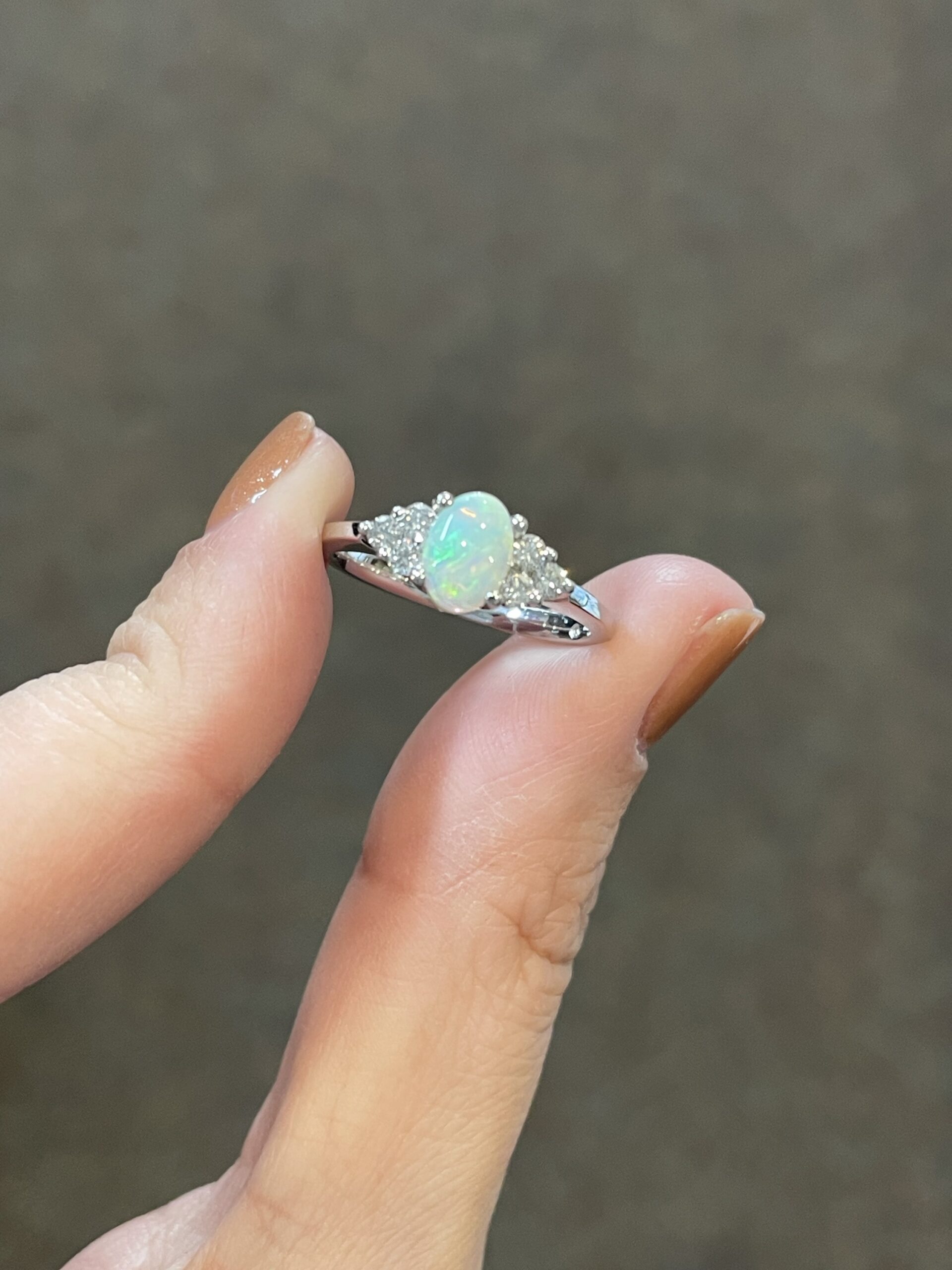 14k white gold genuine oval shaped .59 Cttw Opal (October birthstone) ring, accented by 6 genuine Round Brilliant Cut diamonds which have a total combined weight of .24 Cttw. These diamonds average G-H in color and SI1 in clarity. This ring is a finger size 6 1/2, but it can be reasonably sized. Please make note of the size needed in the comments section at checkout. This ring has an entire weight of 3.3 grams.