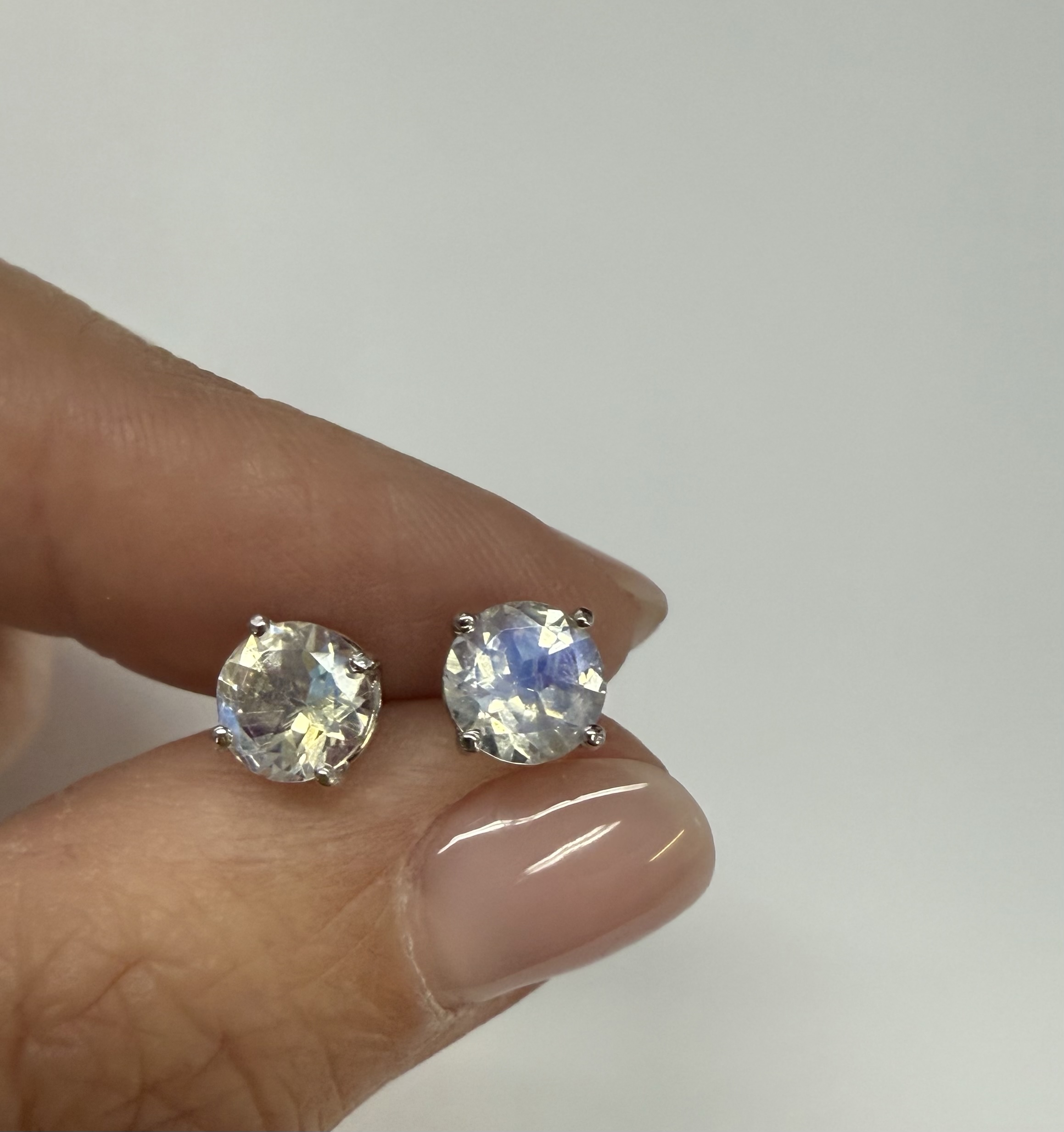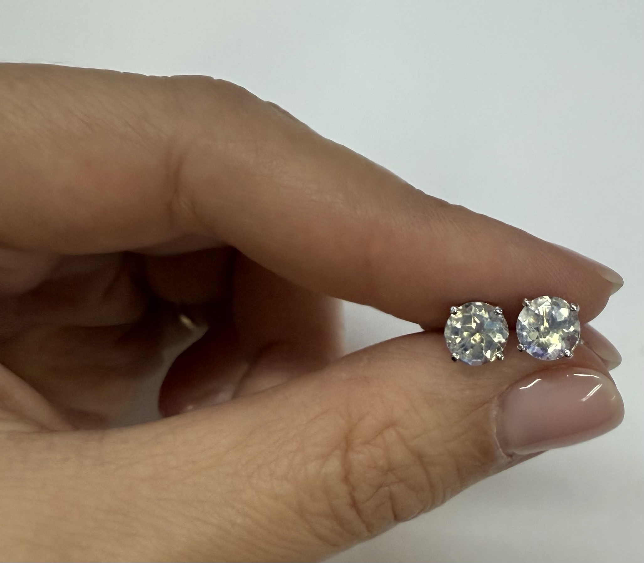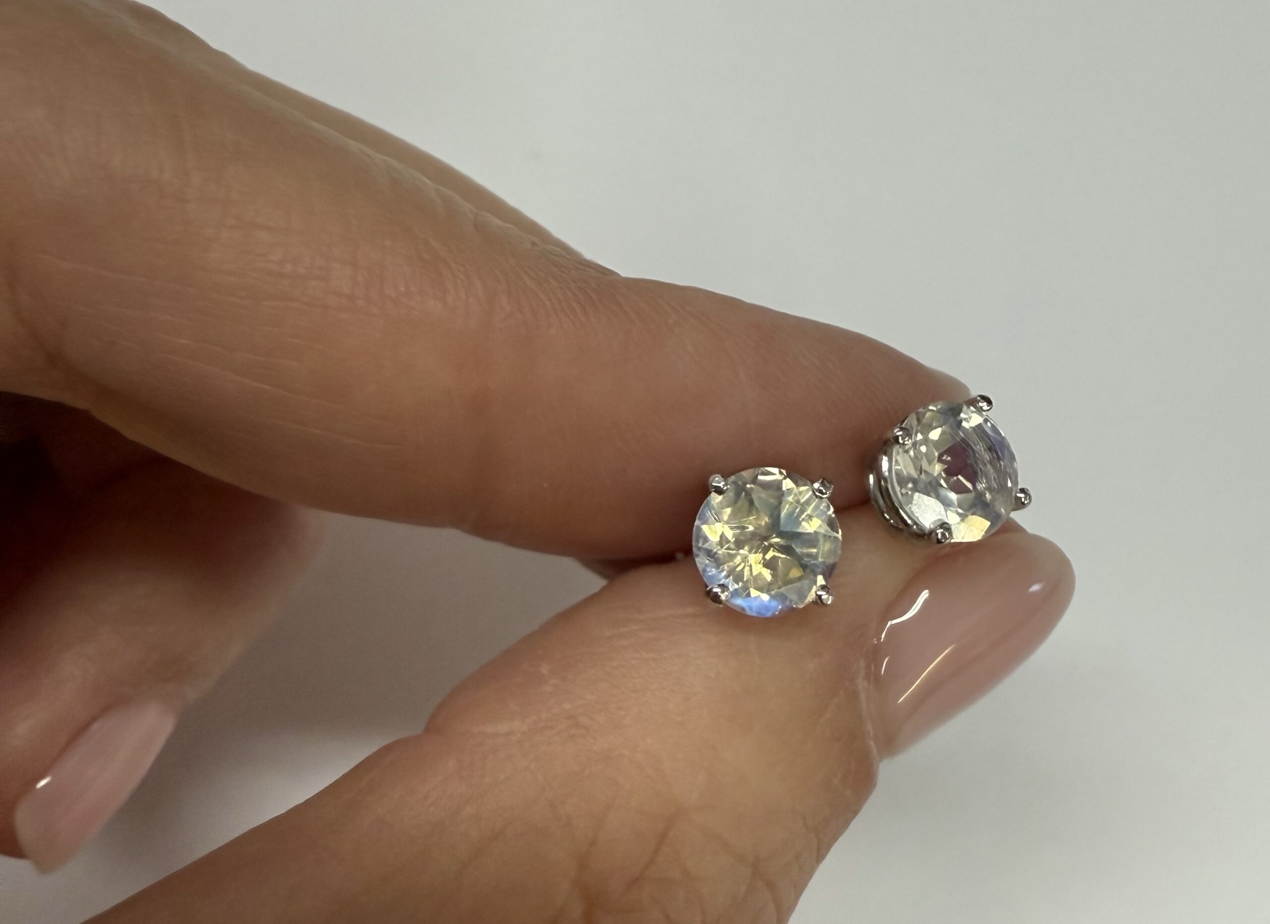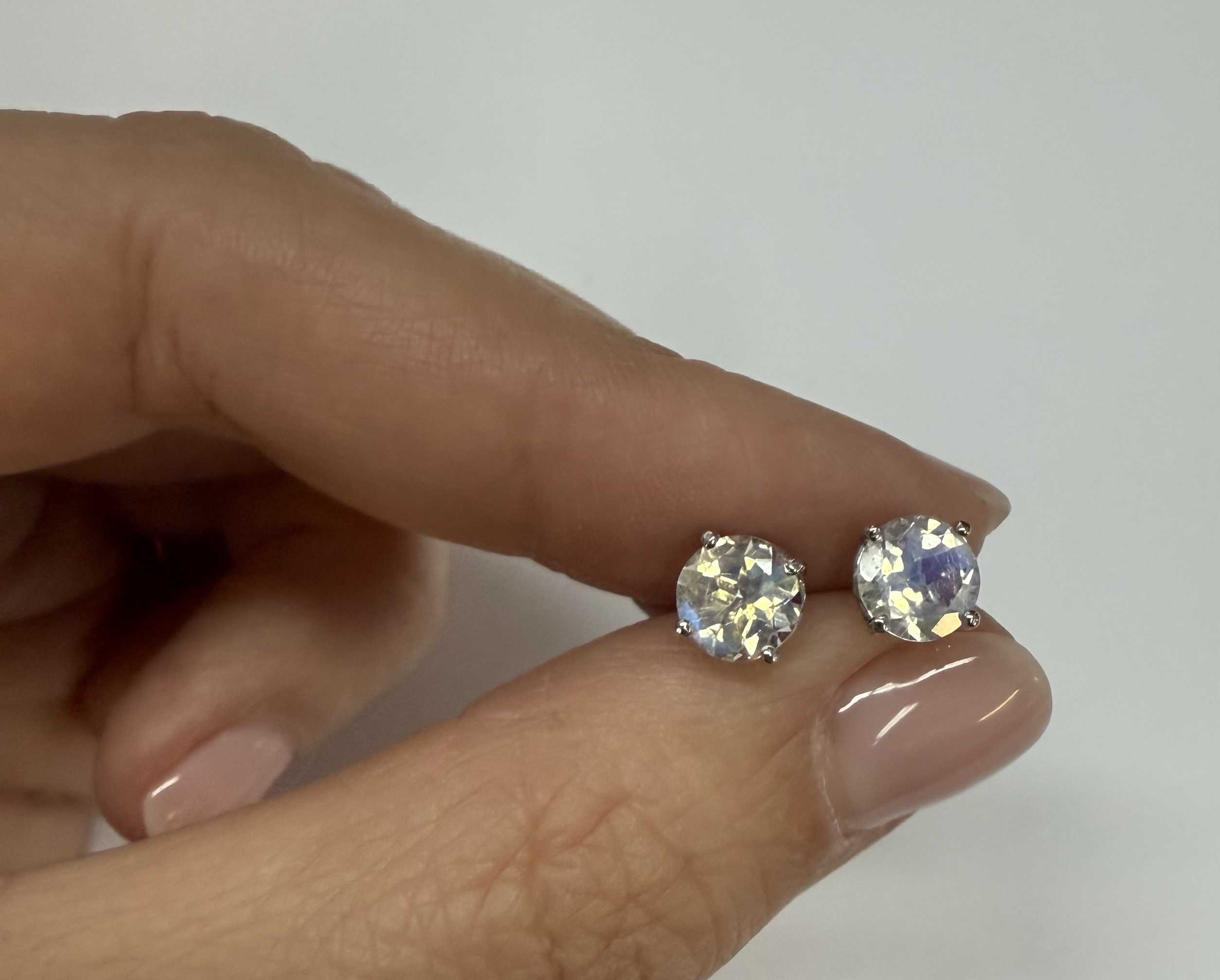 14k white gold round 6 mm AAA quality faceted genuine Moonstone basket set stud earrings. These earrings have an entire weight of grams.