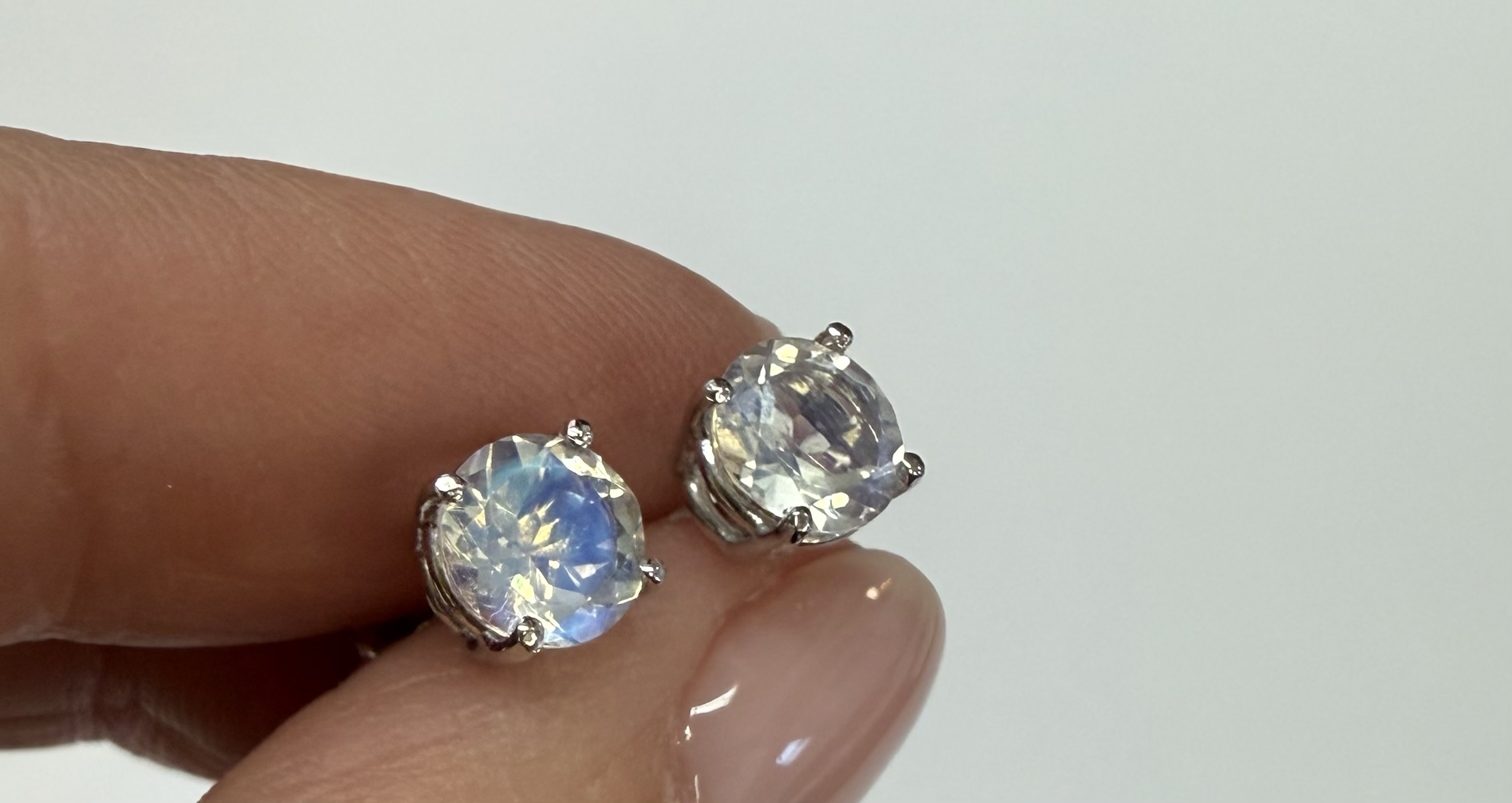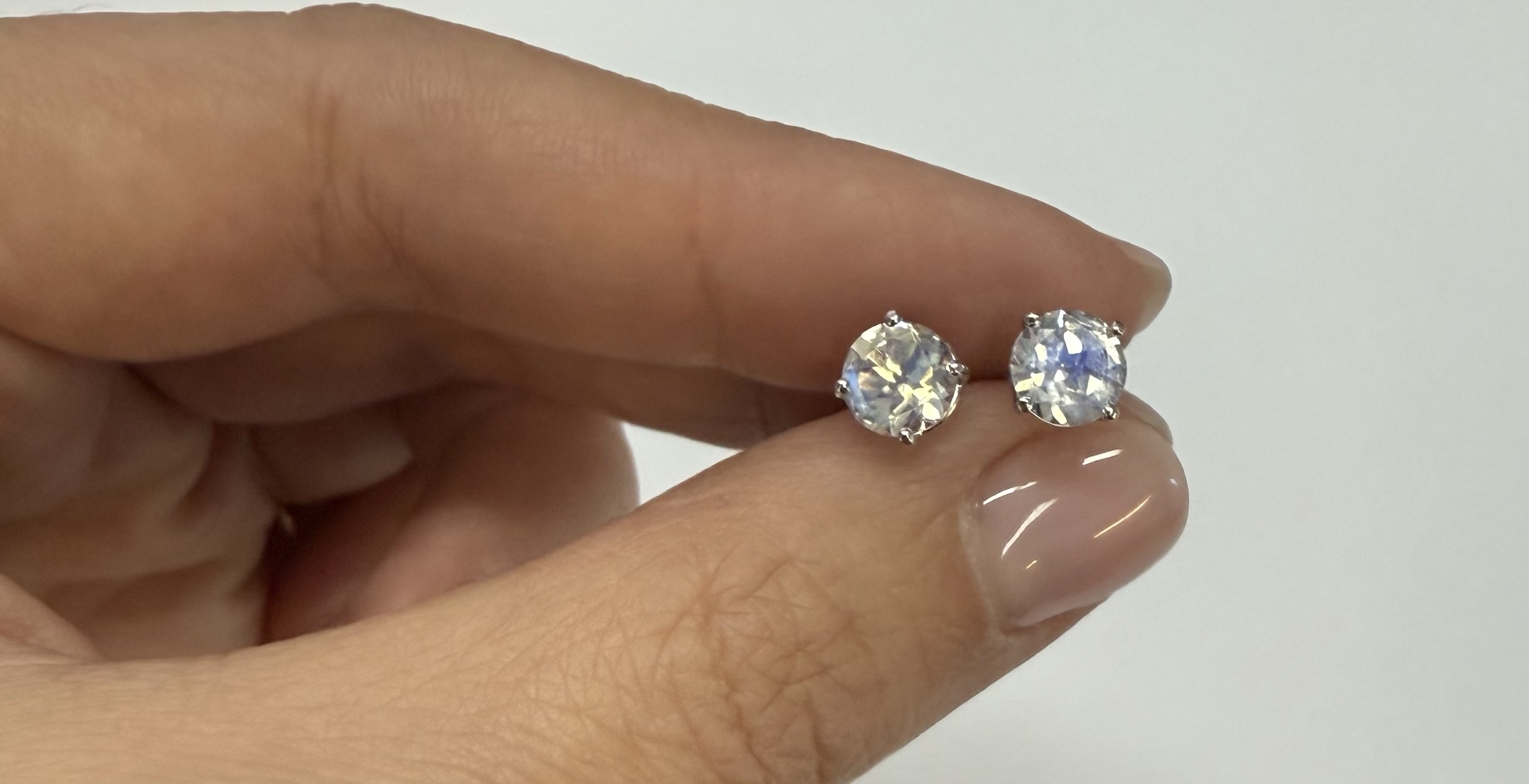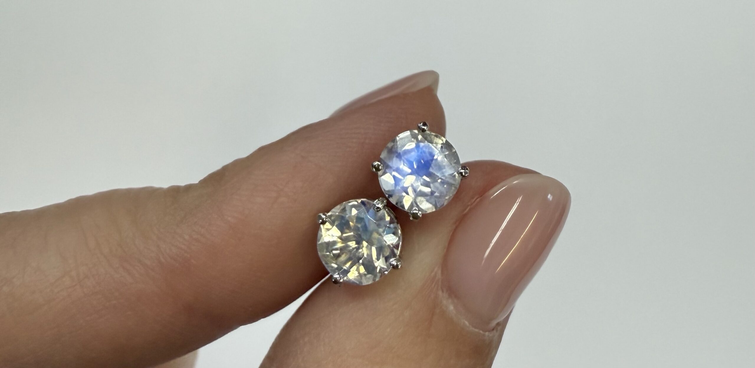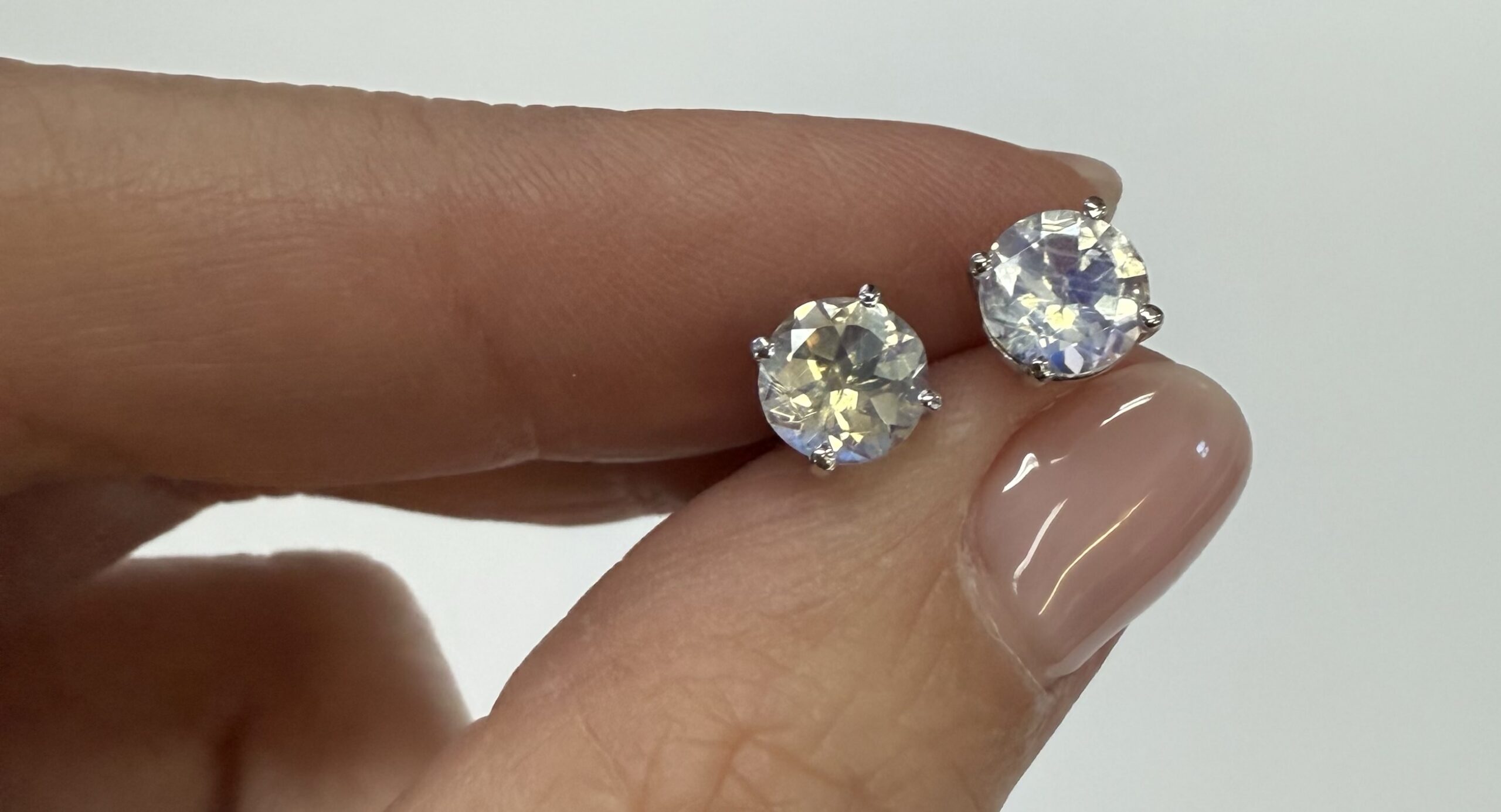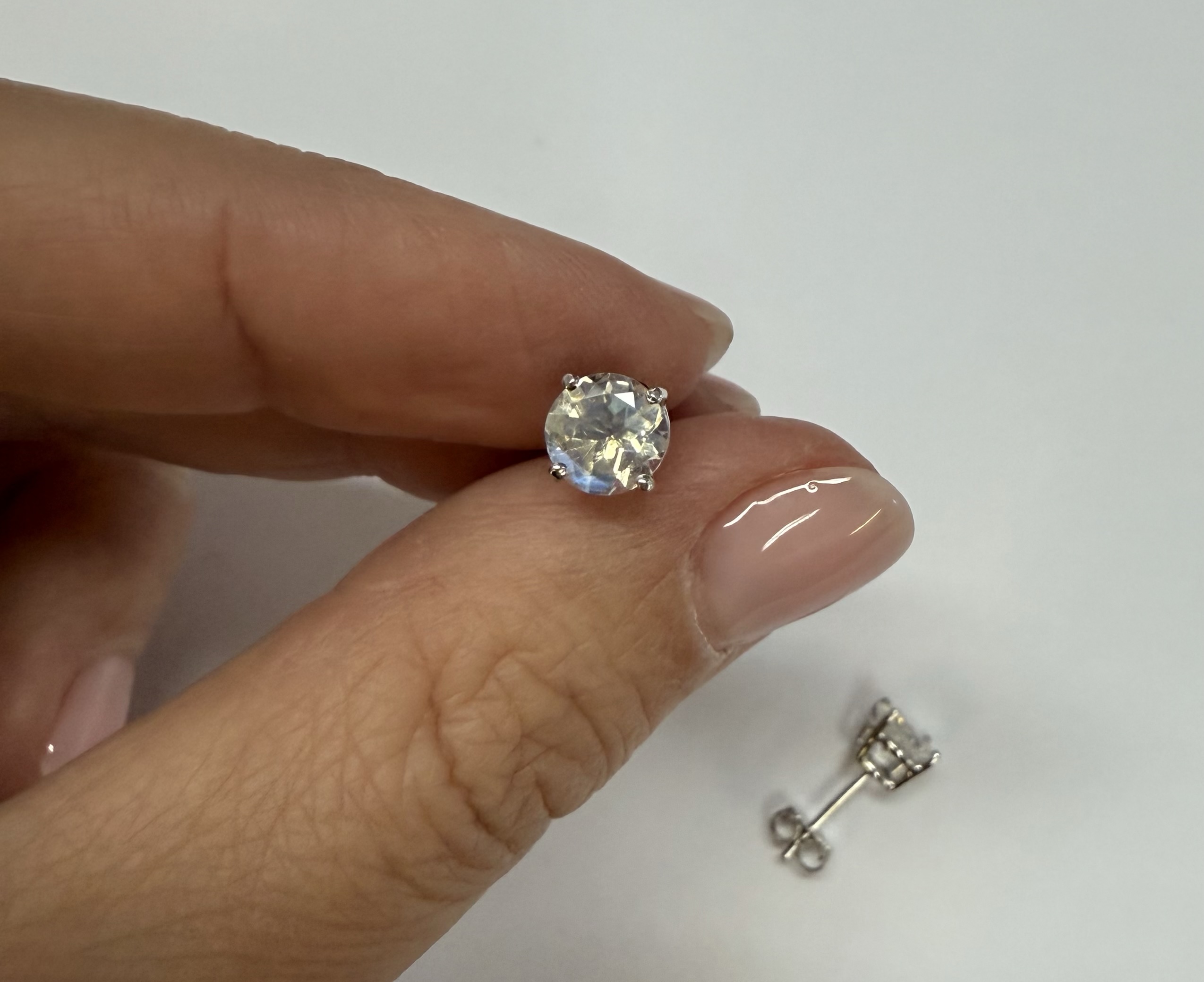 14k white gold round 6 mm AAA quality faceted genuine Moonstone basket set stud earrings. These earrings have an entire weight of grams.