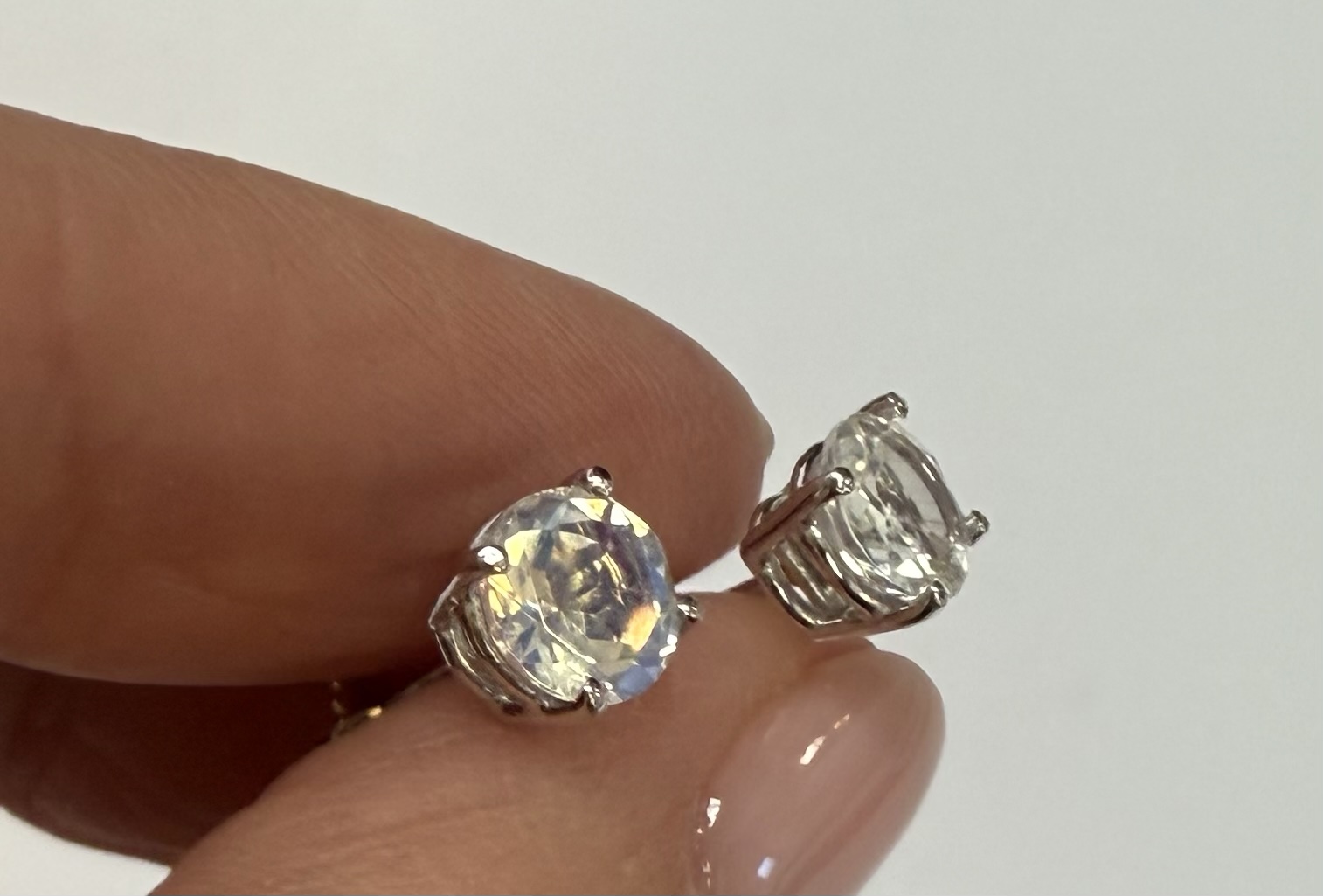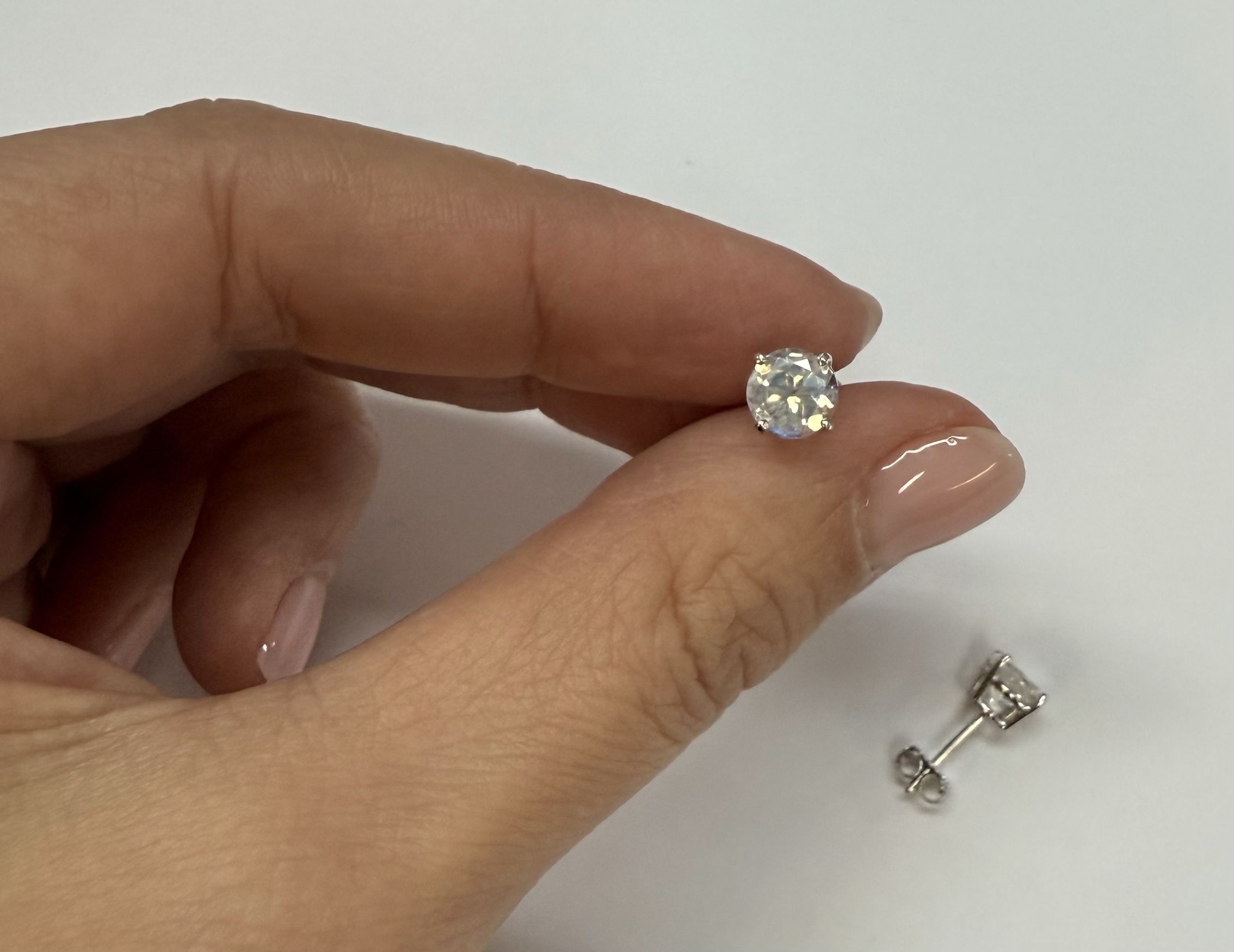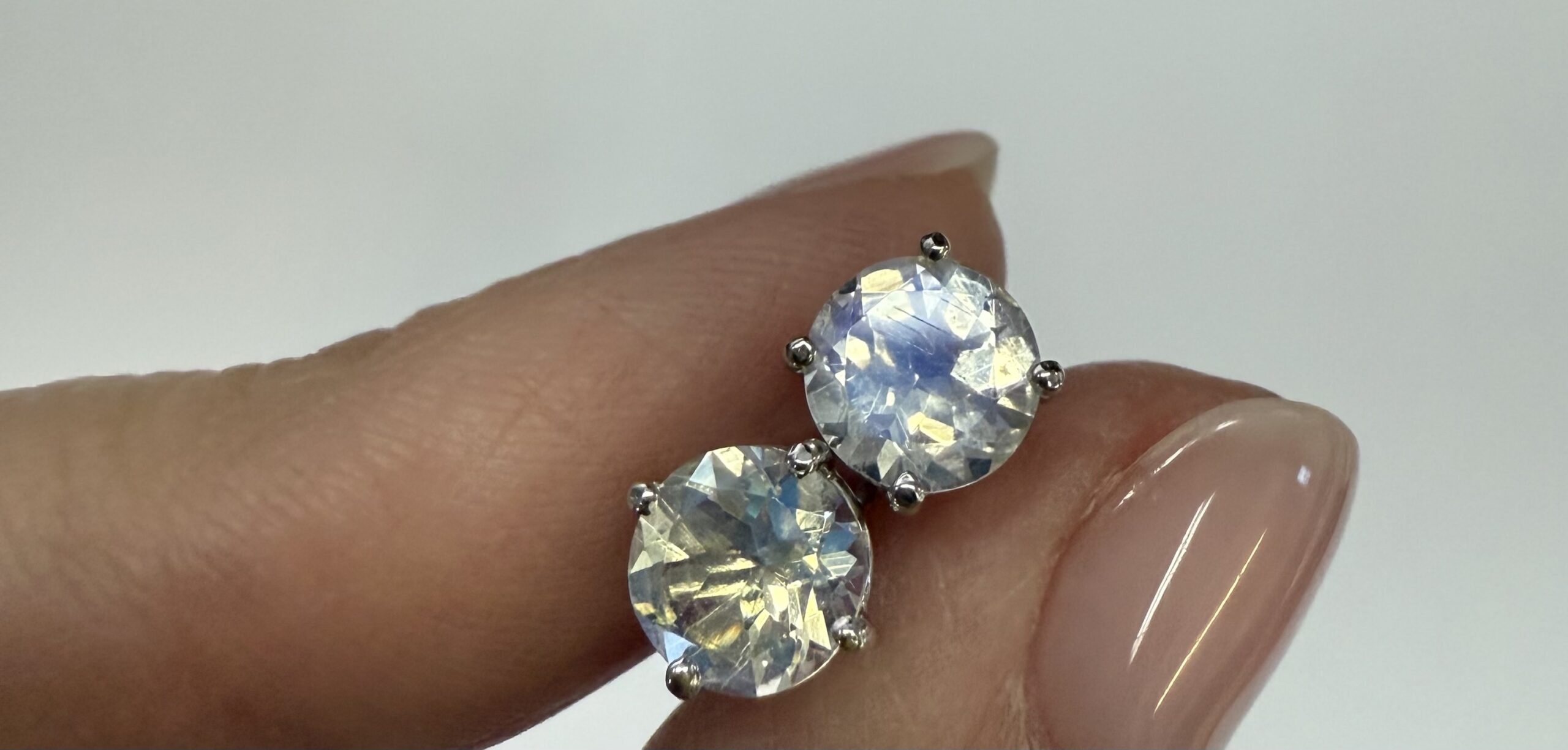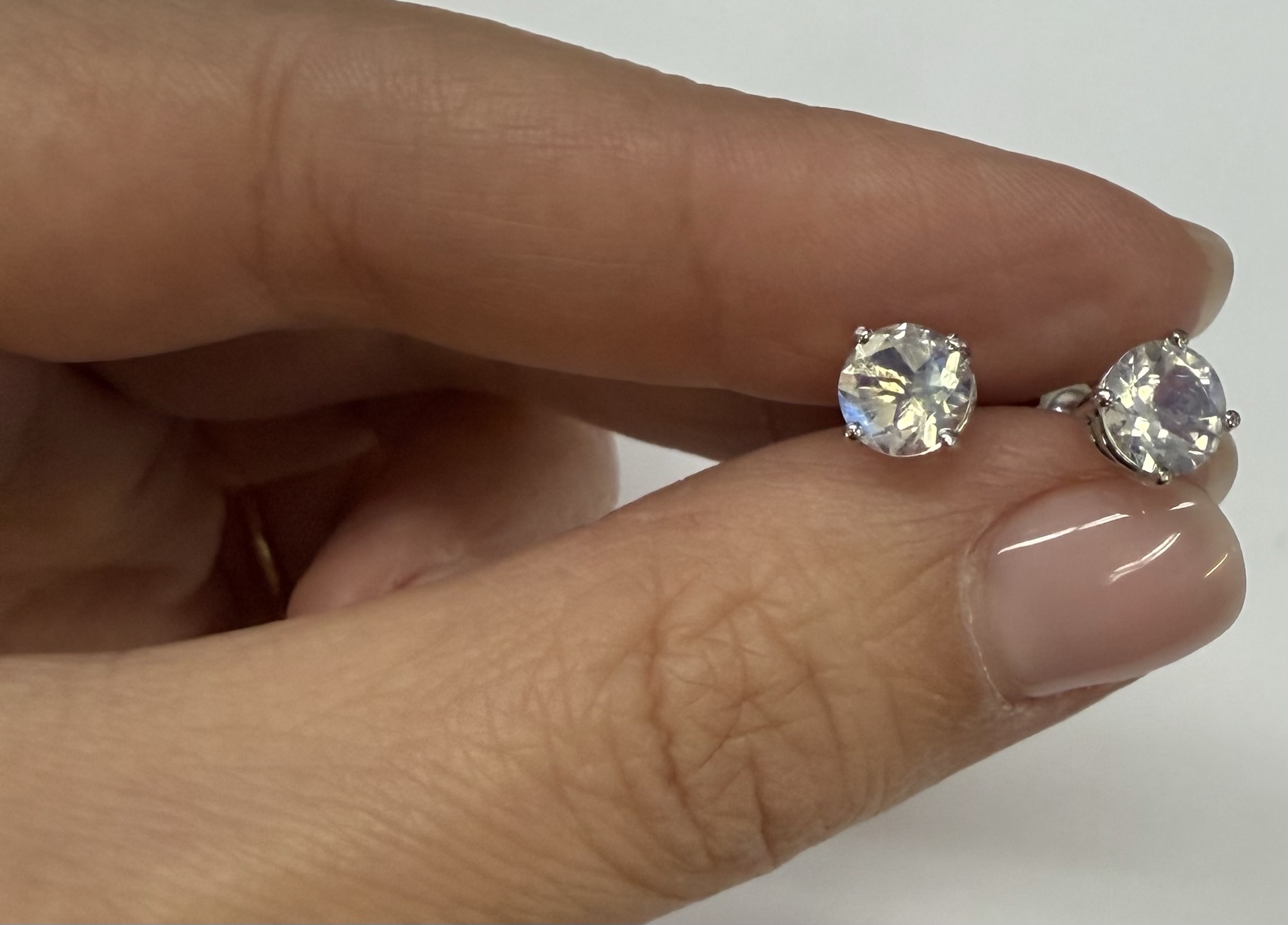 14k white gold round 6 mm AAA quality faceted genuine Moonstone basket set stud earrings. These earrings have an entire weight of grams.