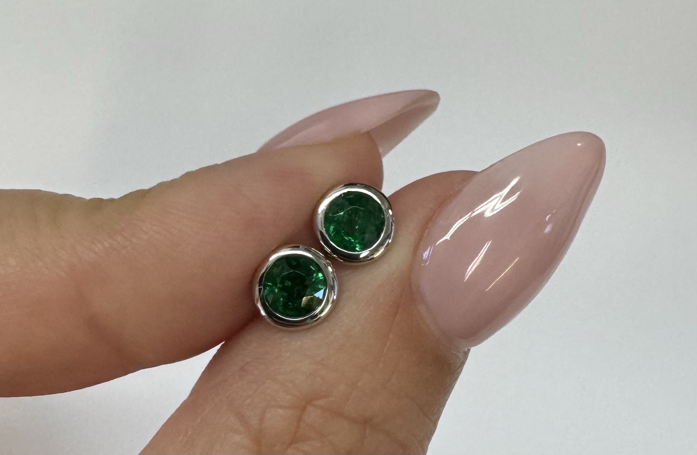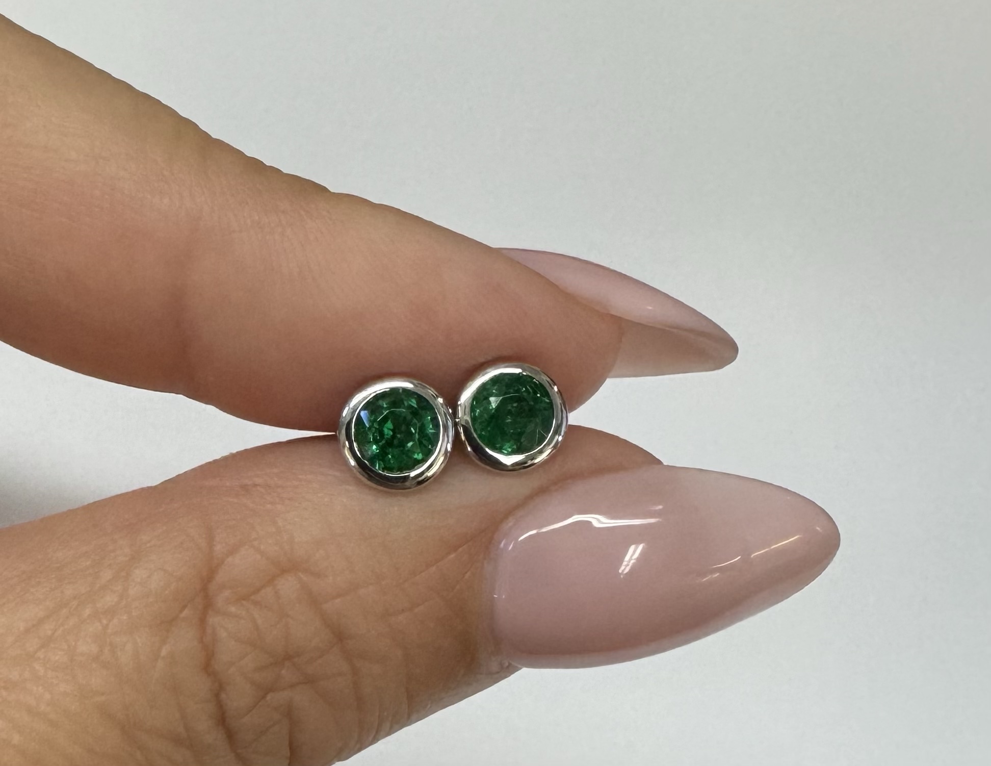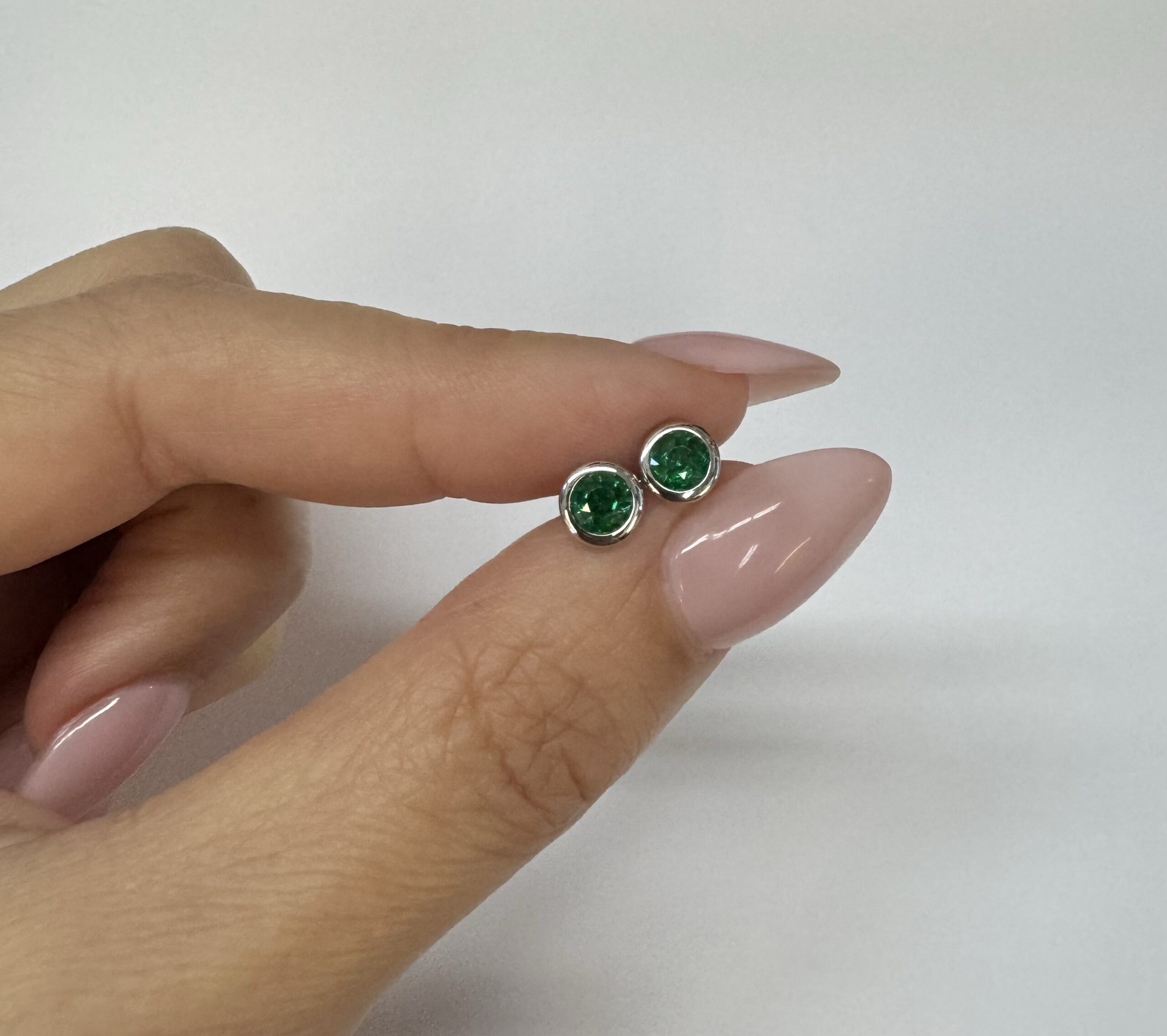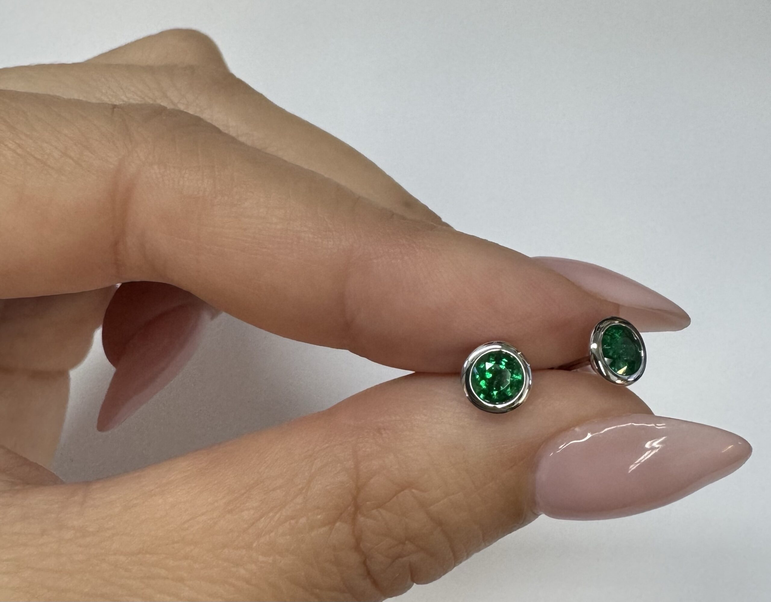 14k yellow gold genuine round, faceted .62 cttw Emerald (May birthstone) delicate bezel set stud earrings. These earrings have an entire weight of 1.1 grams.