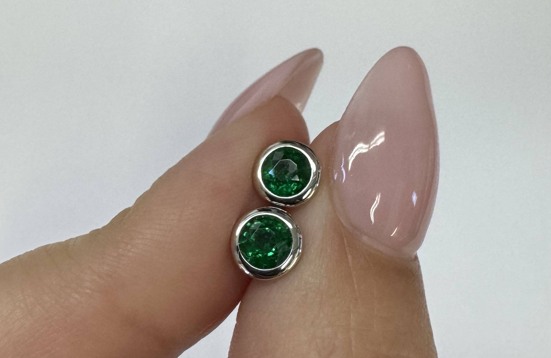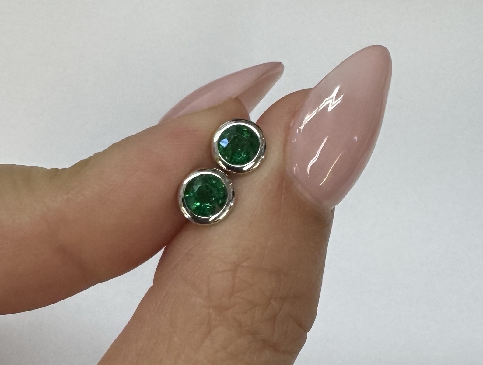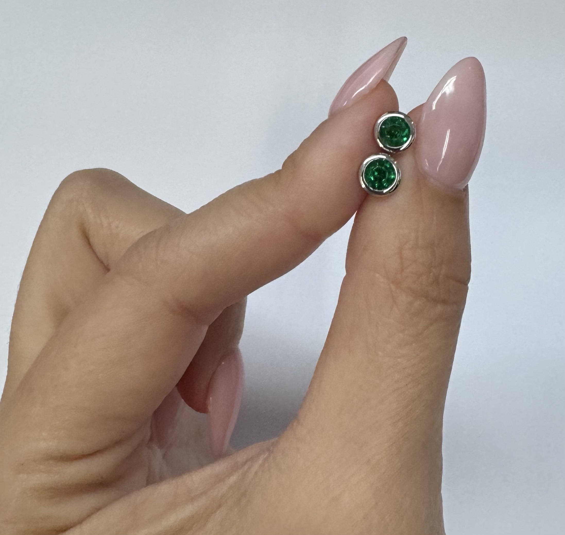 14k yellow gold genuine round, faceted .62 cttw Emerald (May birthstone) delicate bezel set stud earrings. These earrings have an entire weight of 1.1 grams.