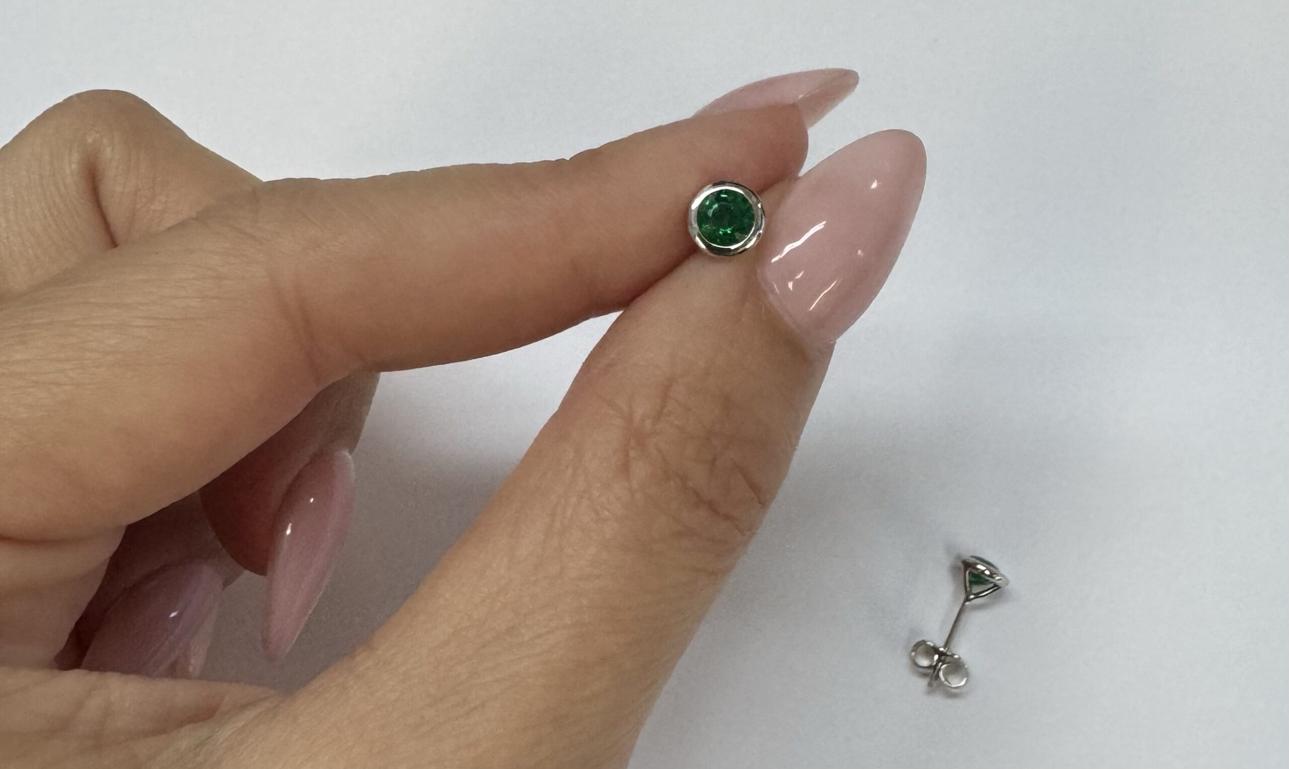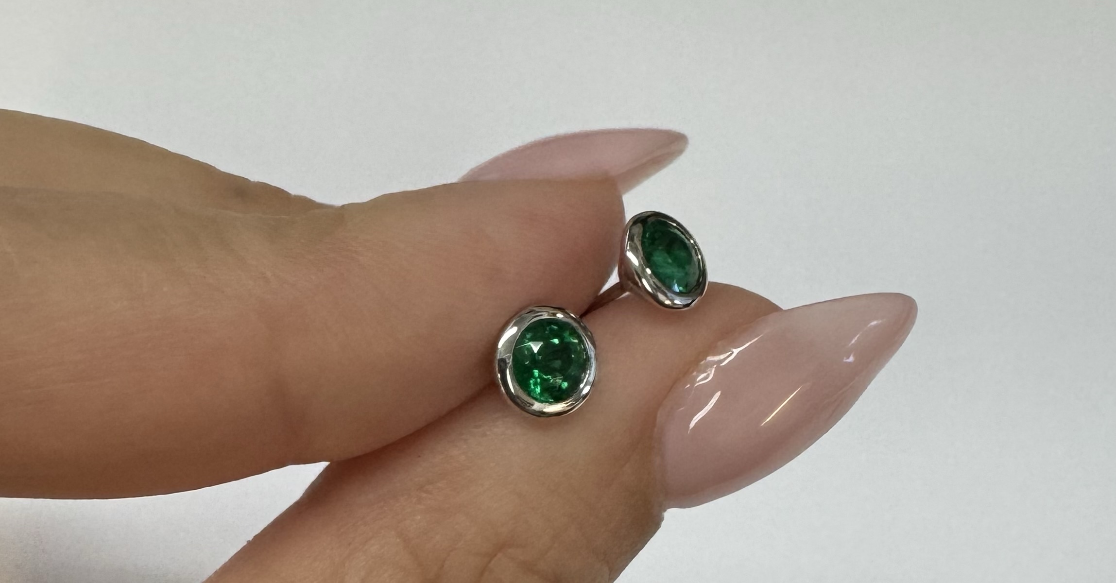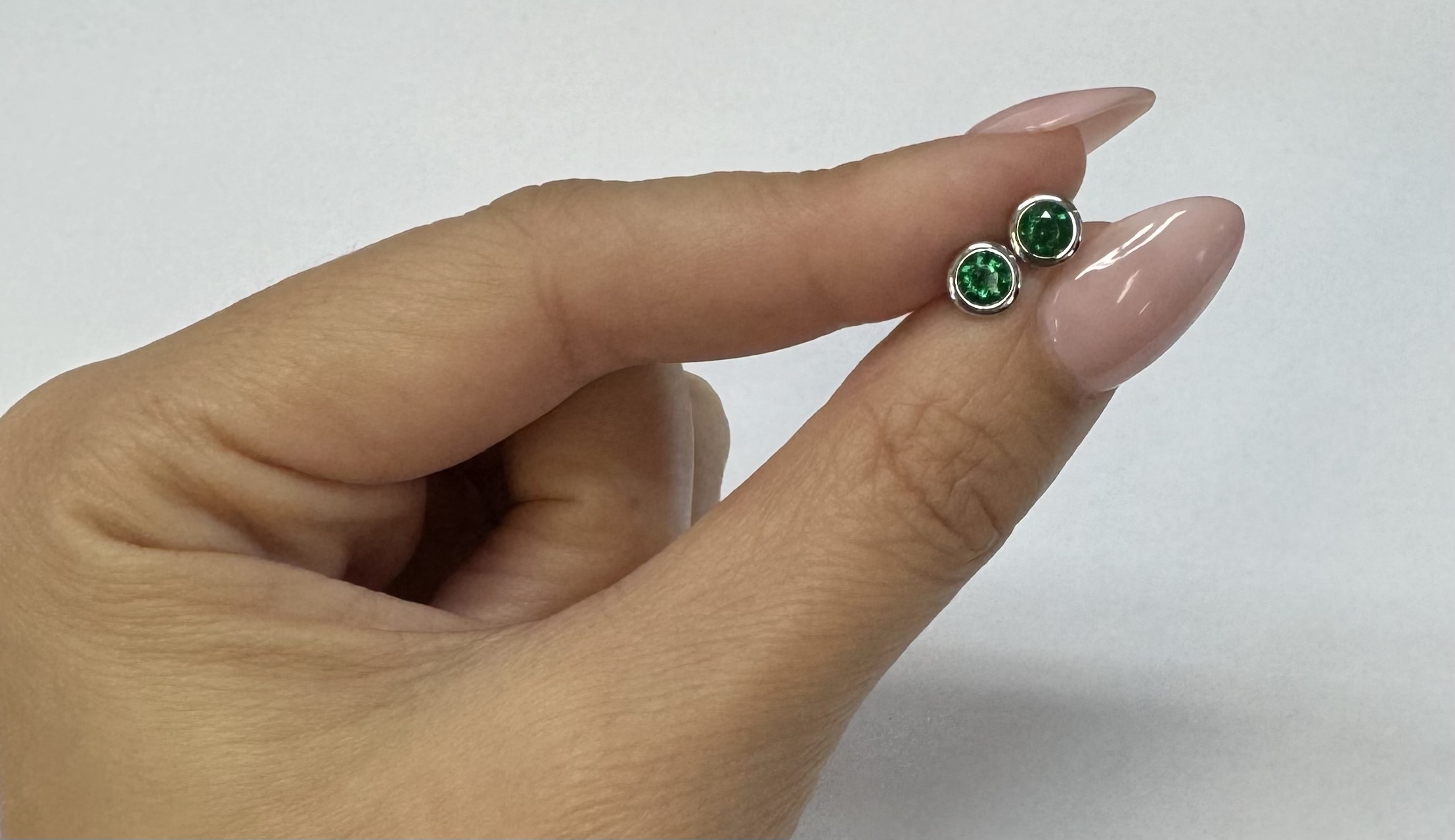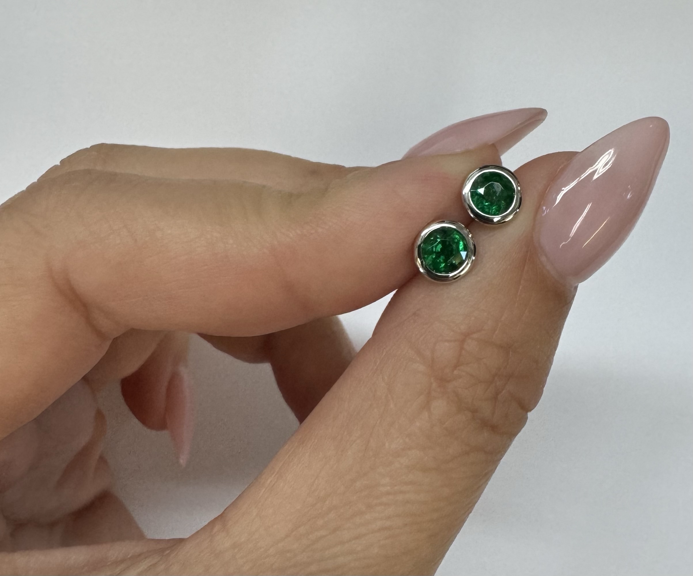 14k yellow gold genuine round, faceted .62 cttw Emerald (May birthstone) delicate bezel set stud earrings. These earrings have an entire weight of 1.1 grams.