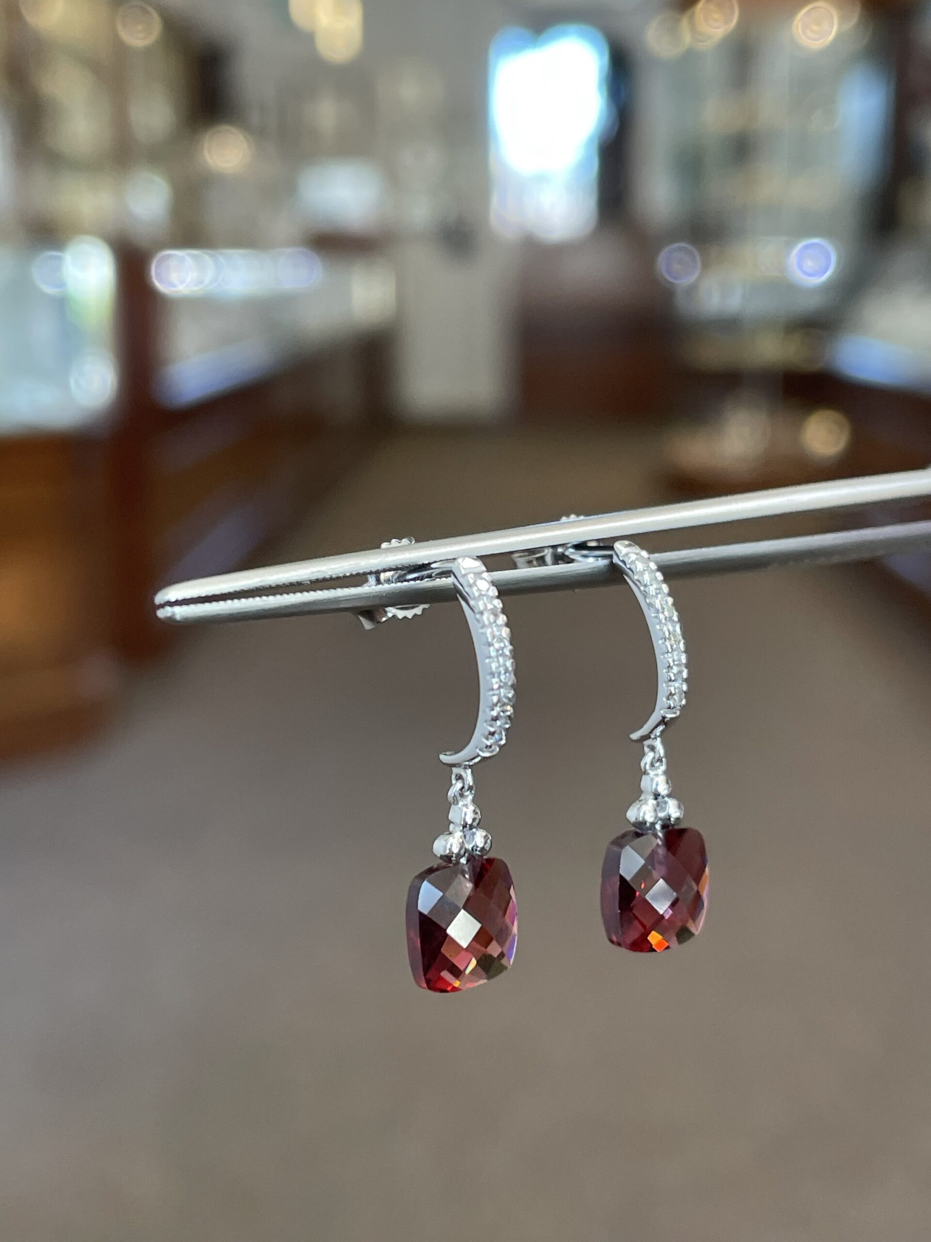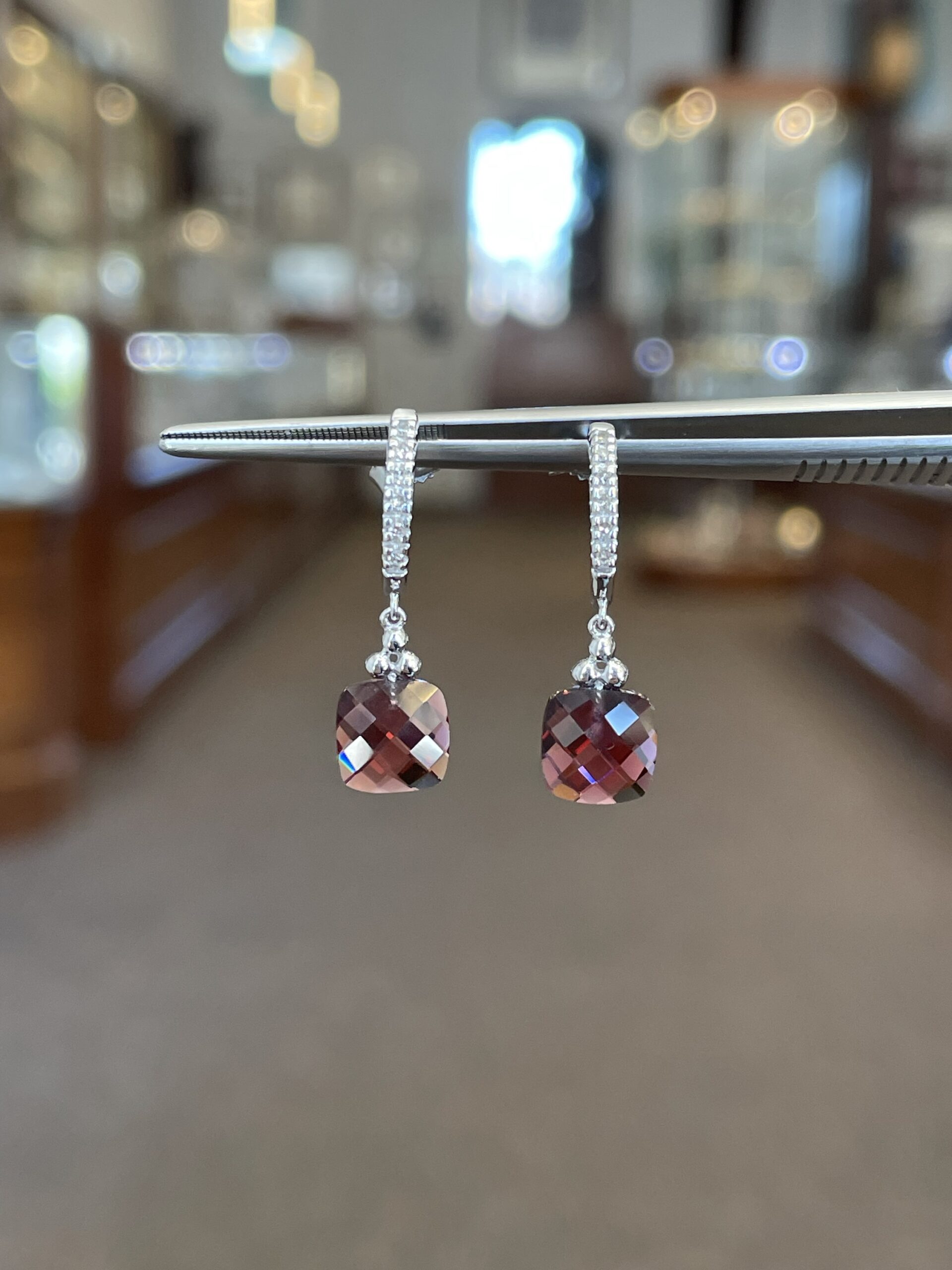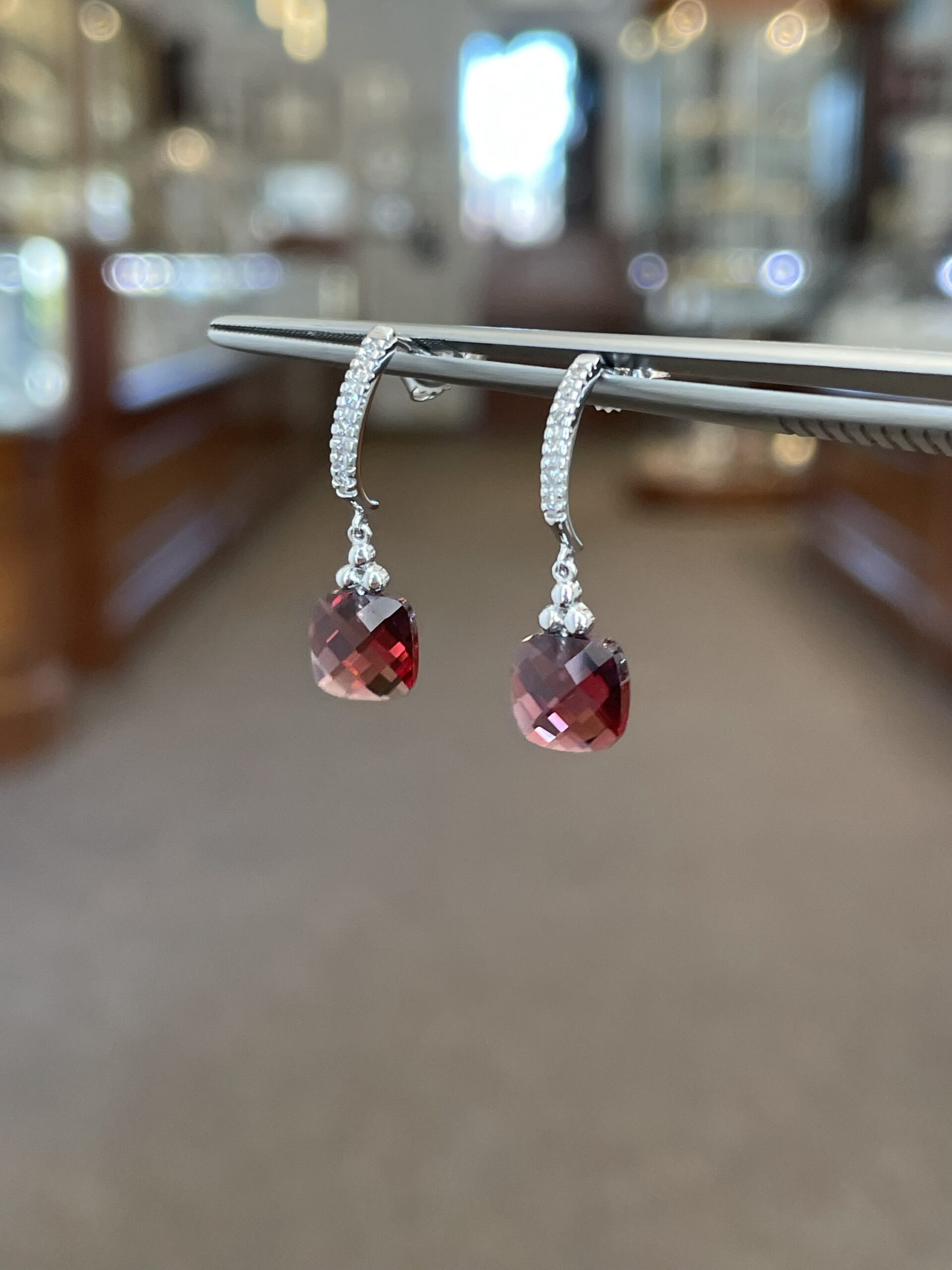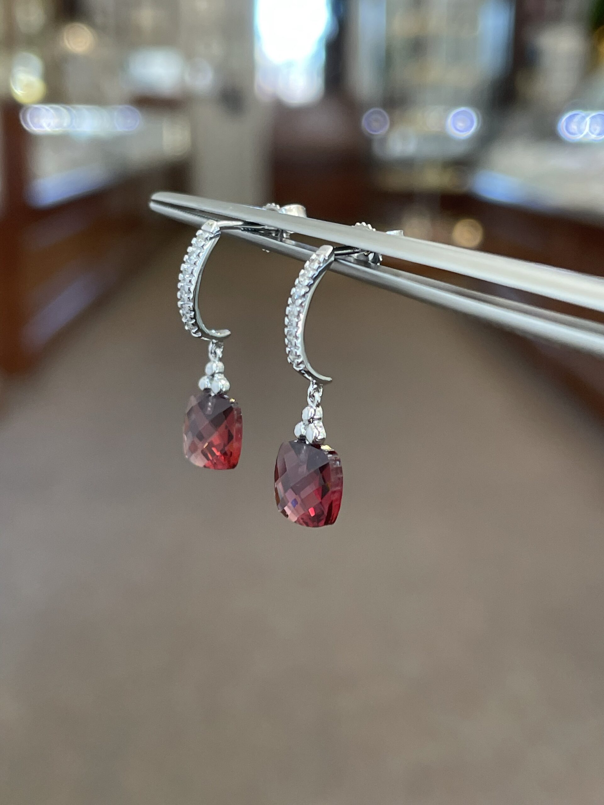 14k white gold genuine cushion shaped 7 mm Pineapple Cut garnet J hoop style stud dangle earrings, enhanced by .05 Cttw of genuine Single Cut diamonds. These diamonds average H in color, and SI in clarity.