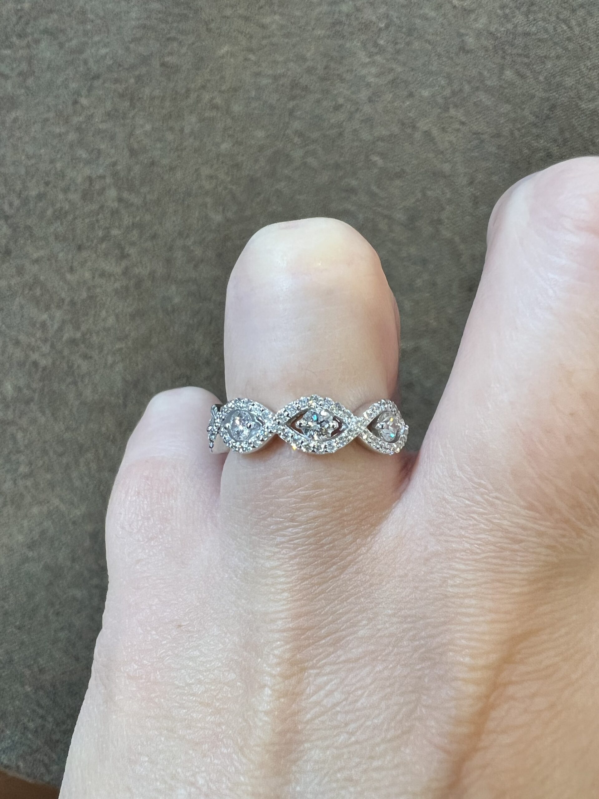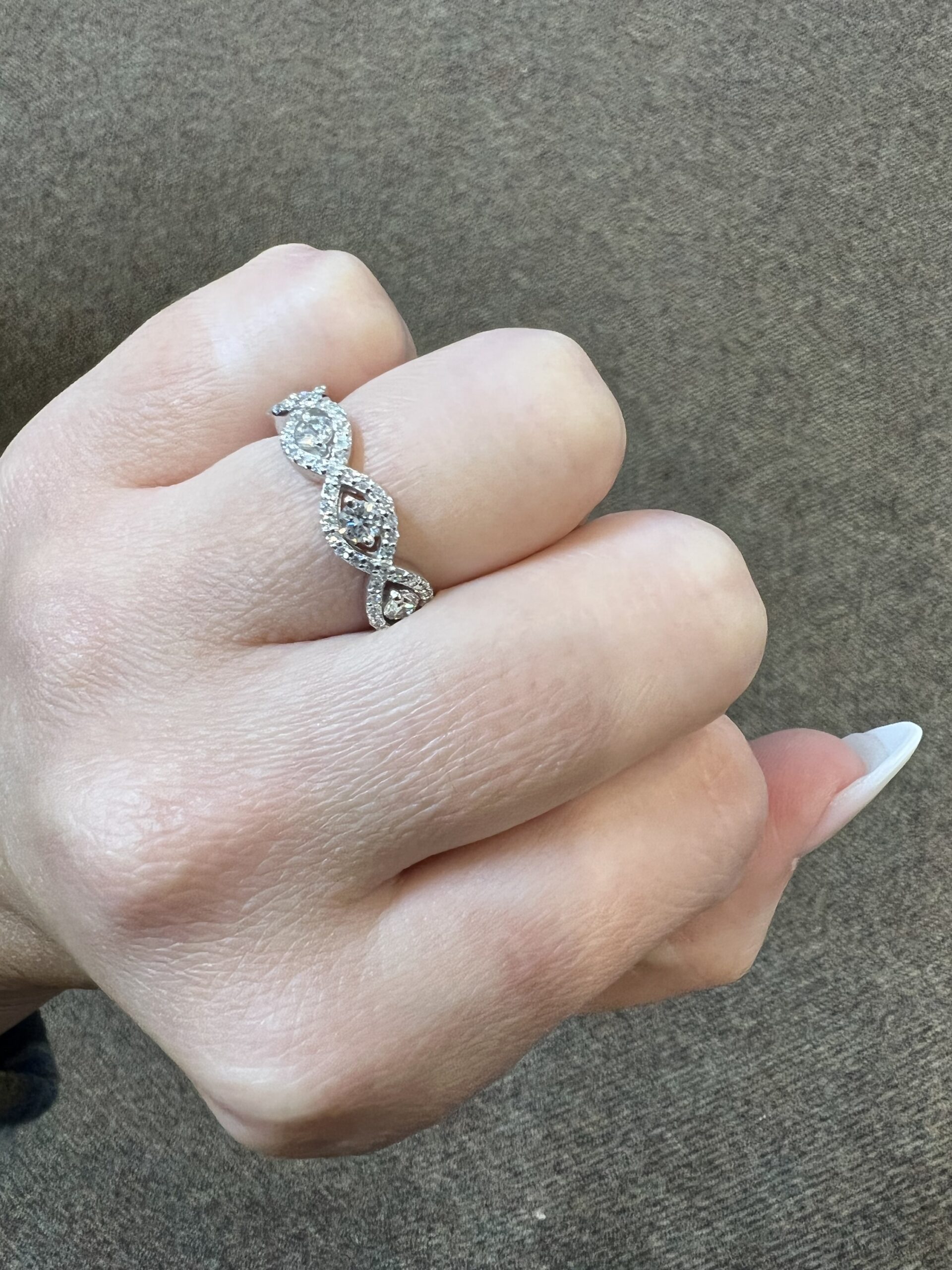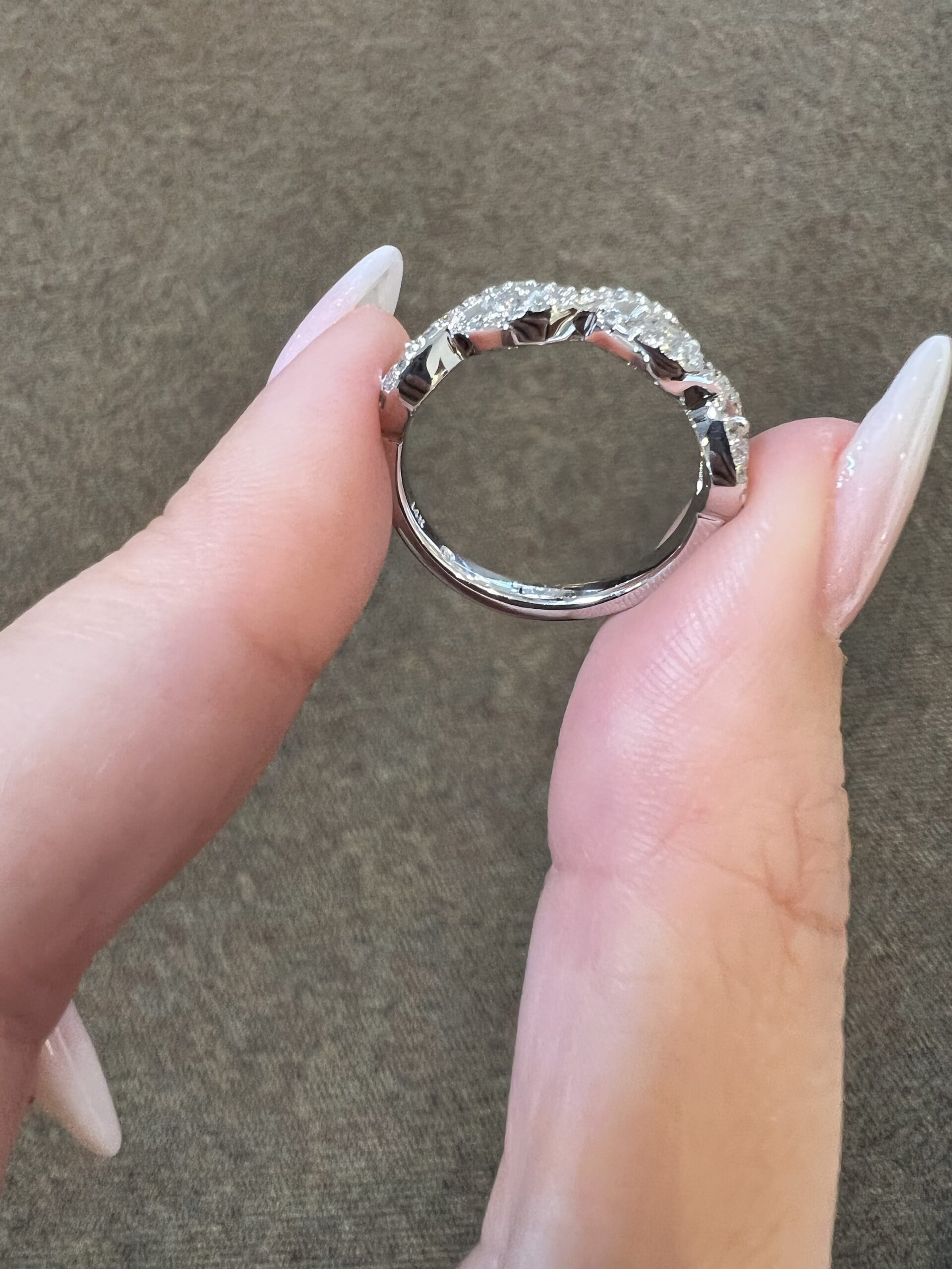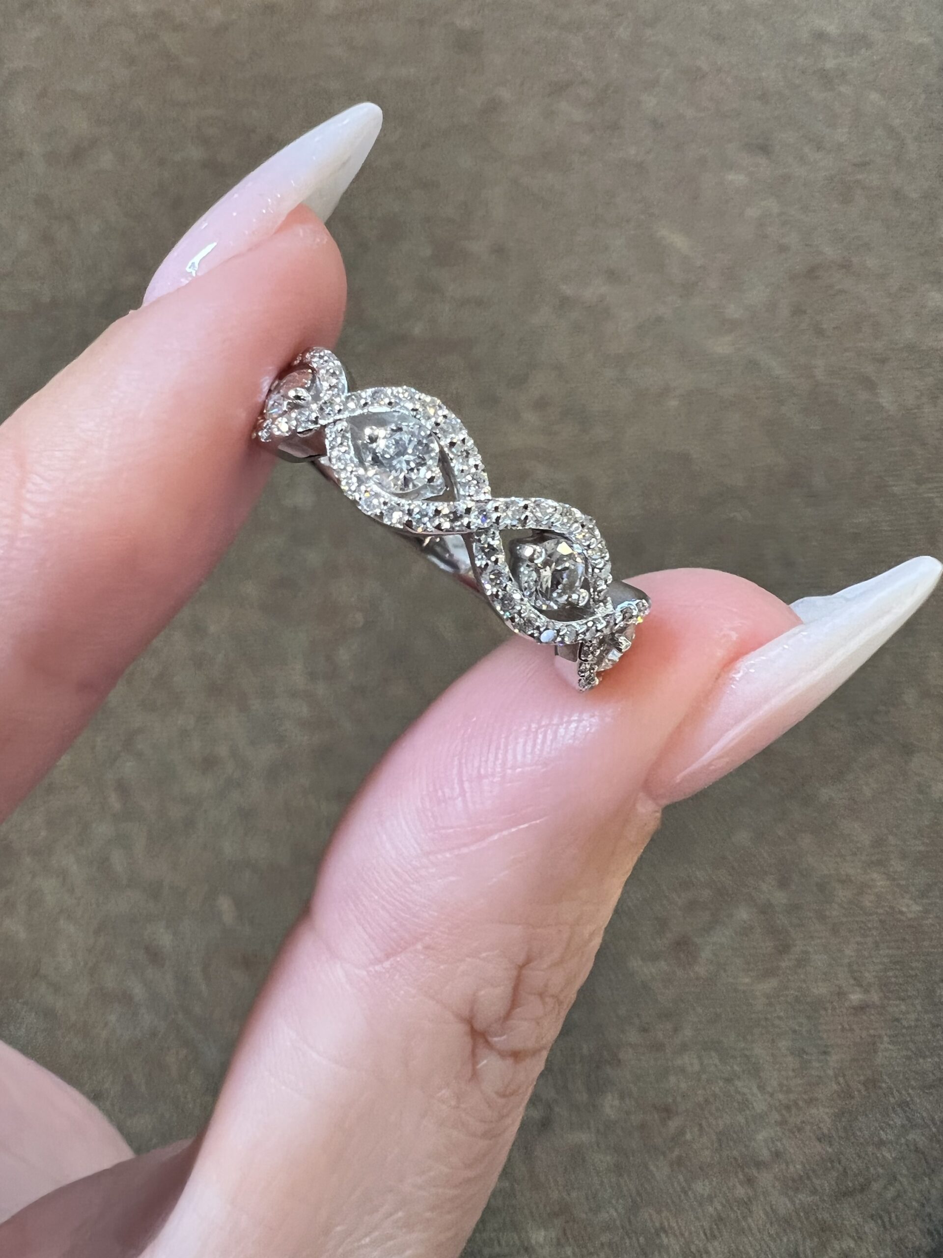 14k white gold genuine 63 stone genuine .74 cttw Round Brilliant Cut diamond swirl band. These diamonds average G-H in color and SI1 in clarity. These diamonds are nicely proportioned and well finished. This ring is a finger size 6 3/4, but it can be reasonably sized. Please make note of the size preference in the comments section at checkout.