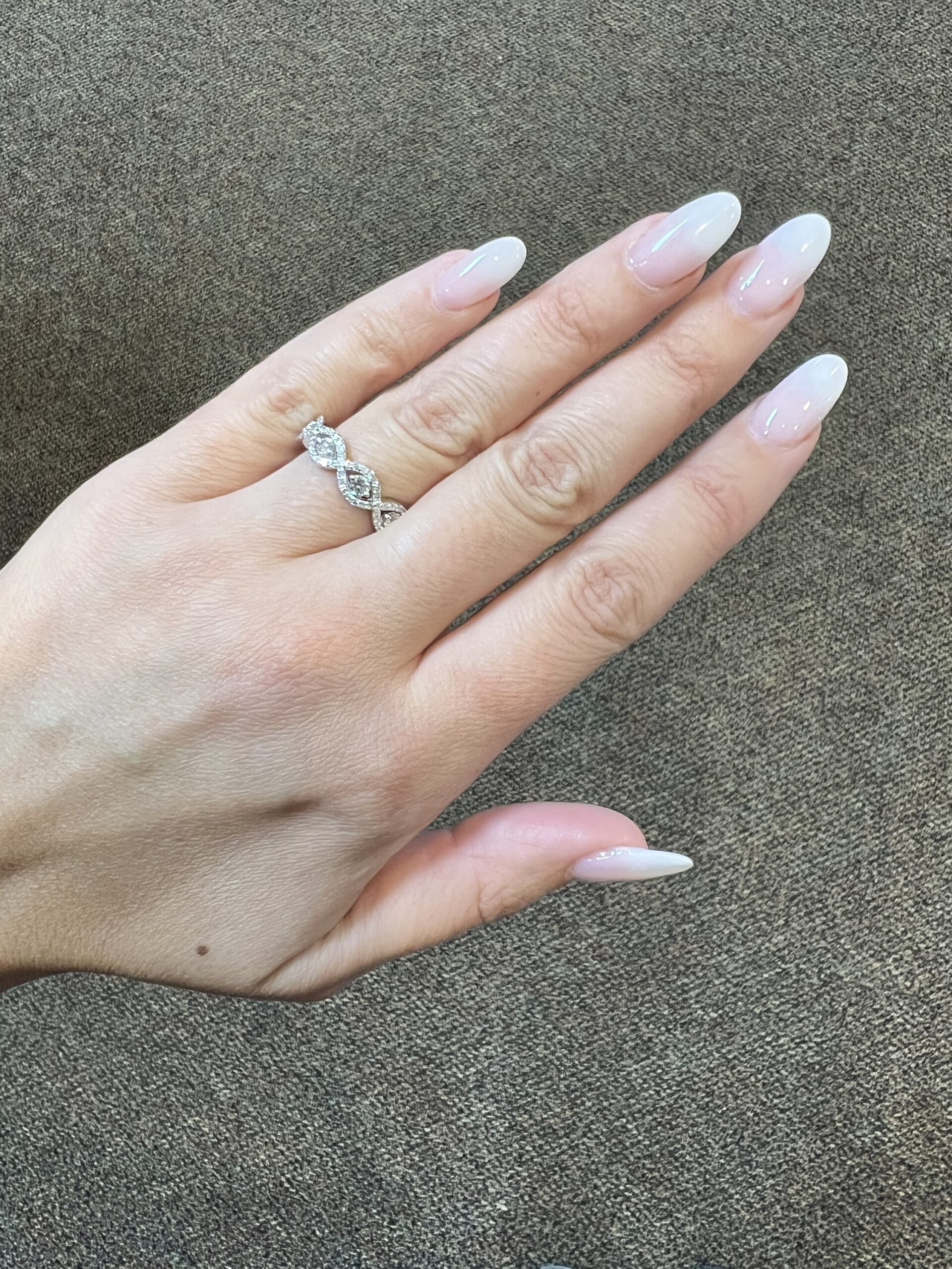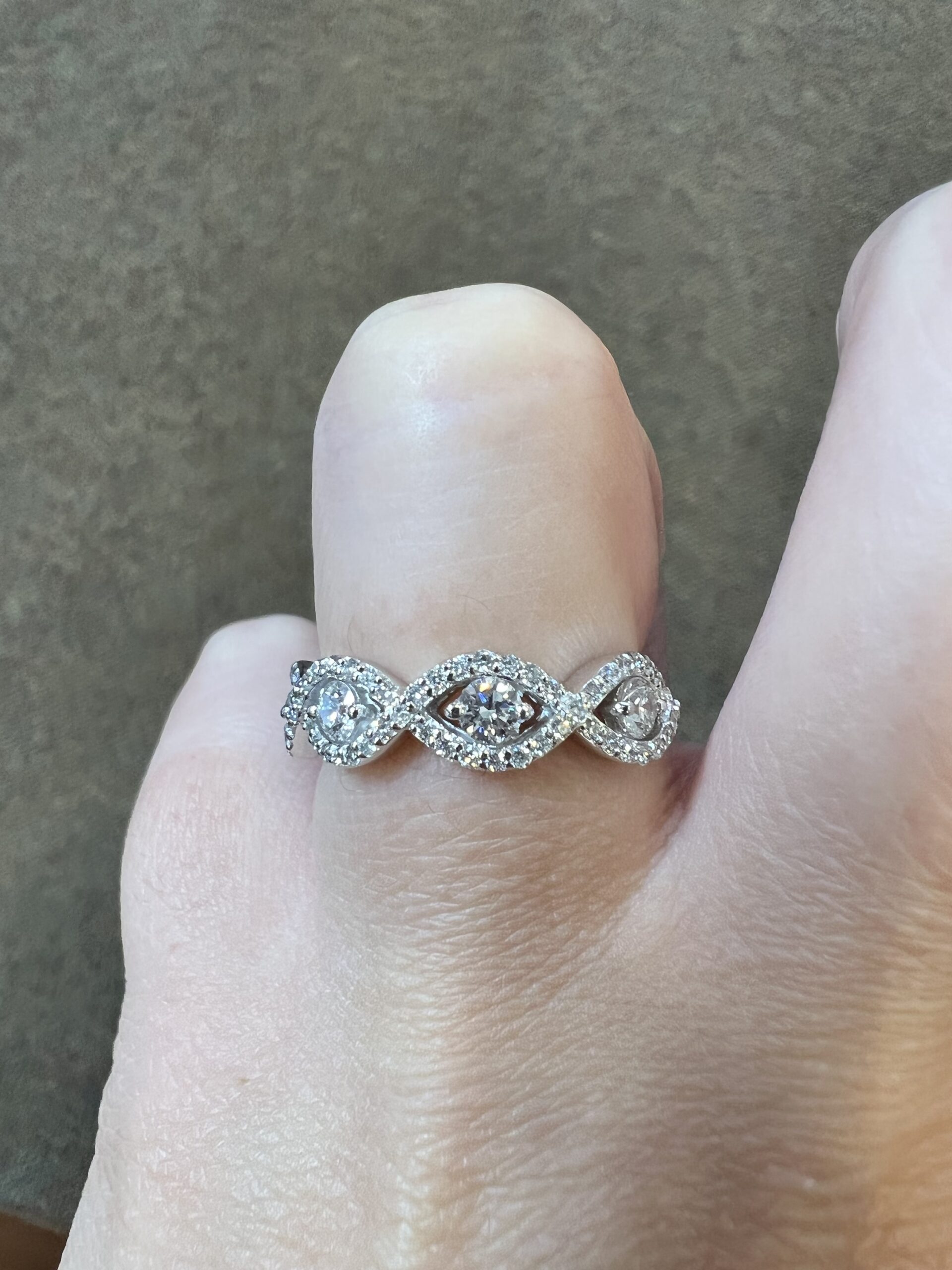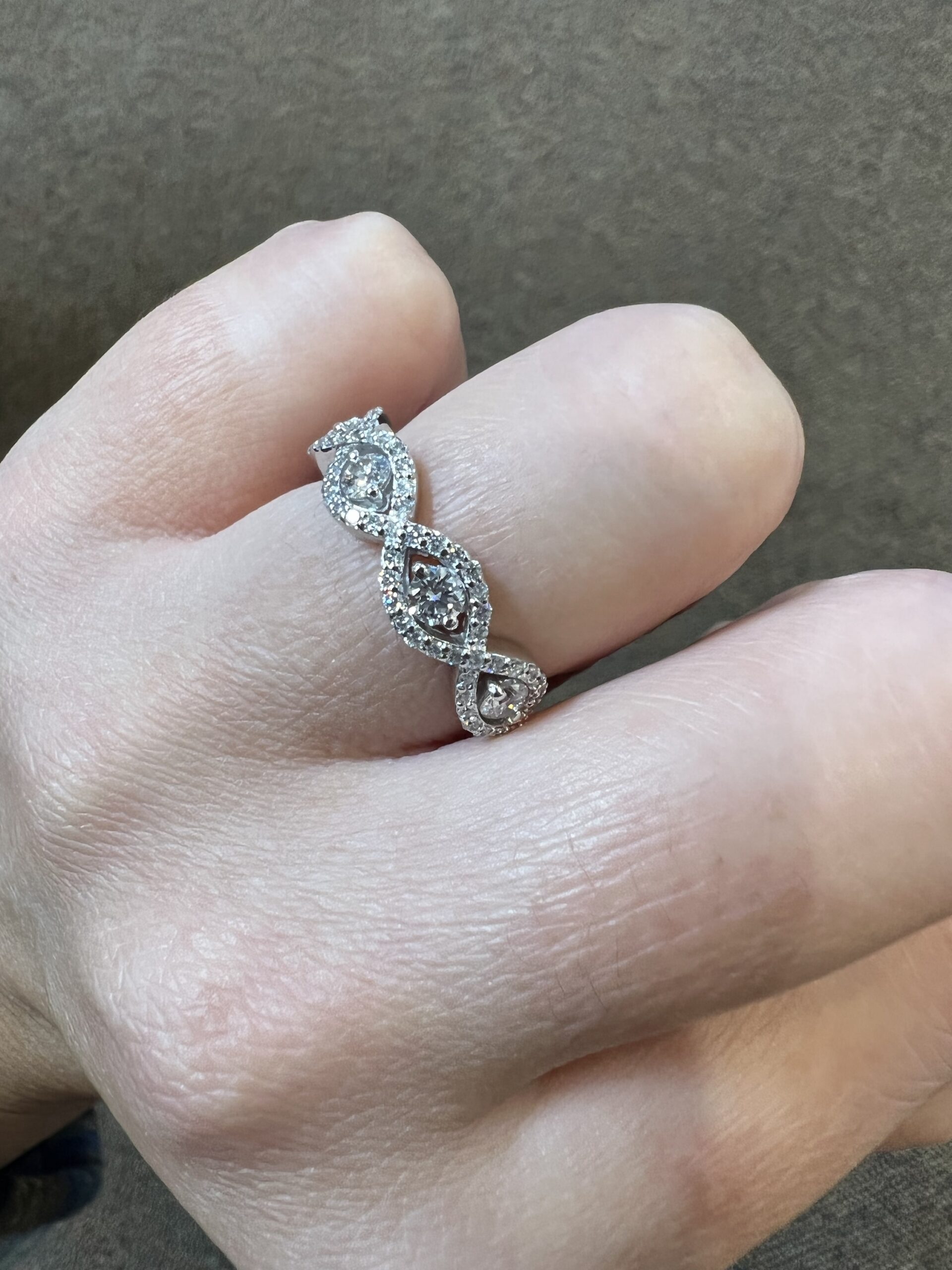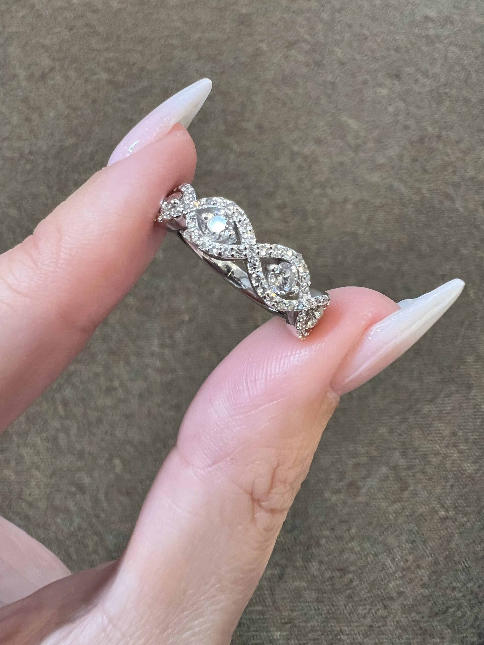 14k white gold genuine 63 stone genuine .74 cttw Round Brilliant Cut diamond swirl band. These diamonds average G-H in color and SI1 in clarity. These diamonds are nicely proportioned and well finished. This ring is a finger size 6 3/4, but it can be reasonably sized. Please make note of the size preference in the comments section at checkout.